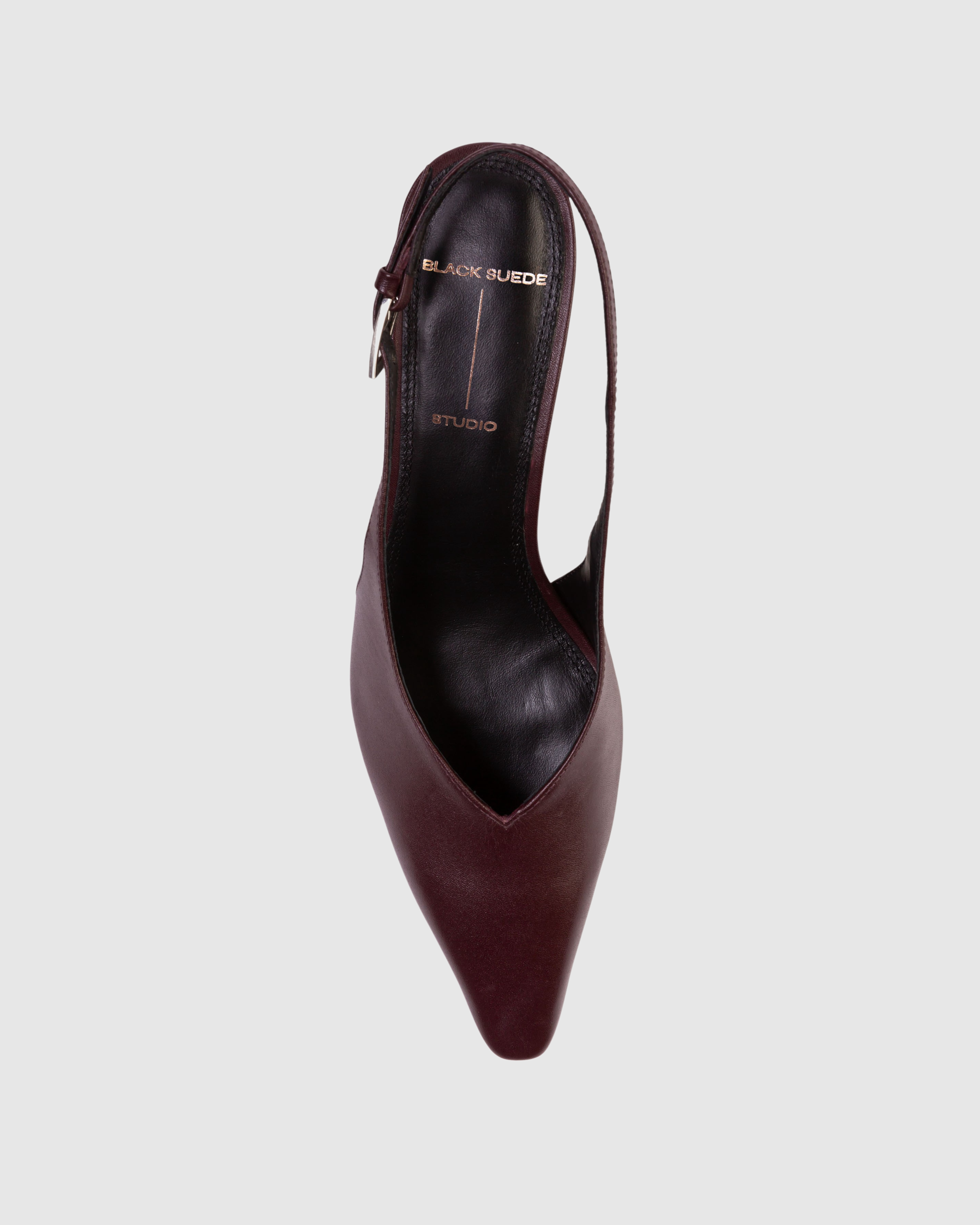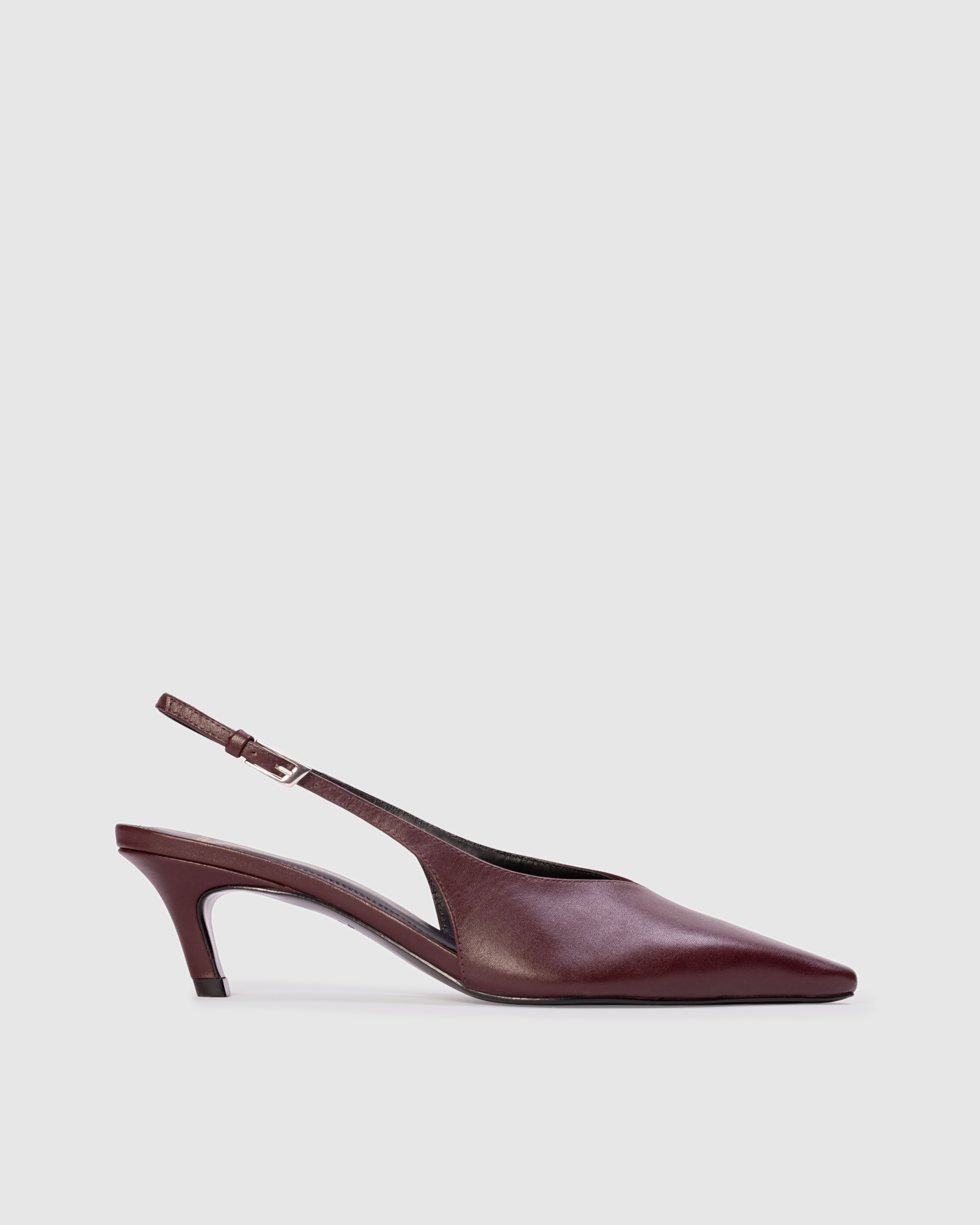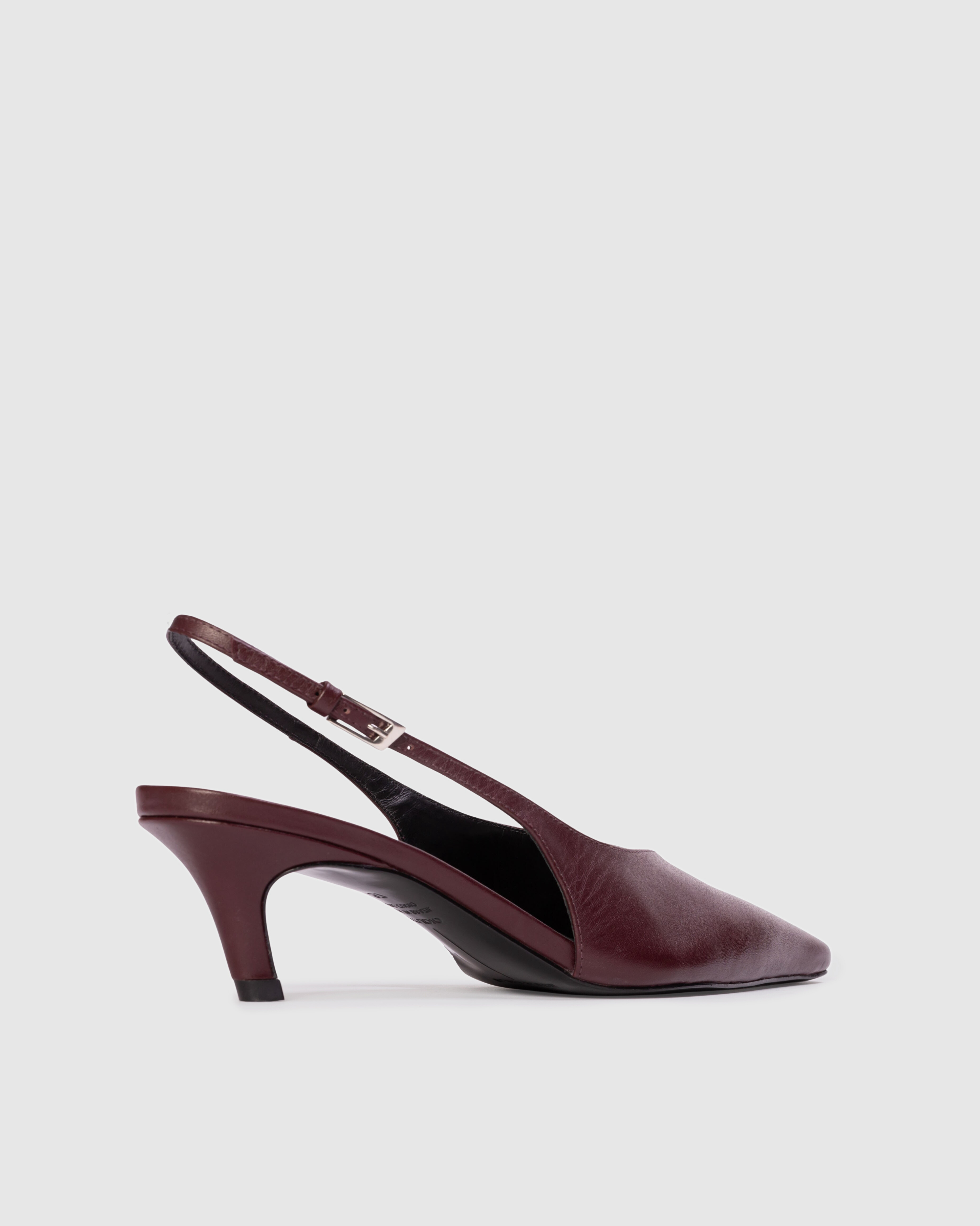Snipped toe slingback pump, set on an angled kitten heel. Made with smooth buffed leather.