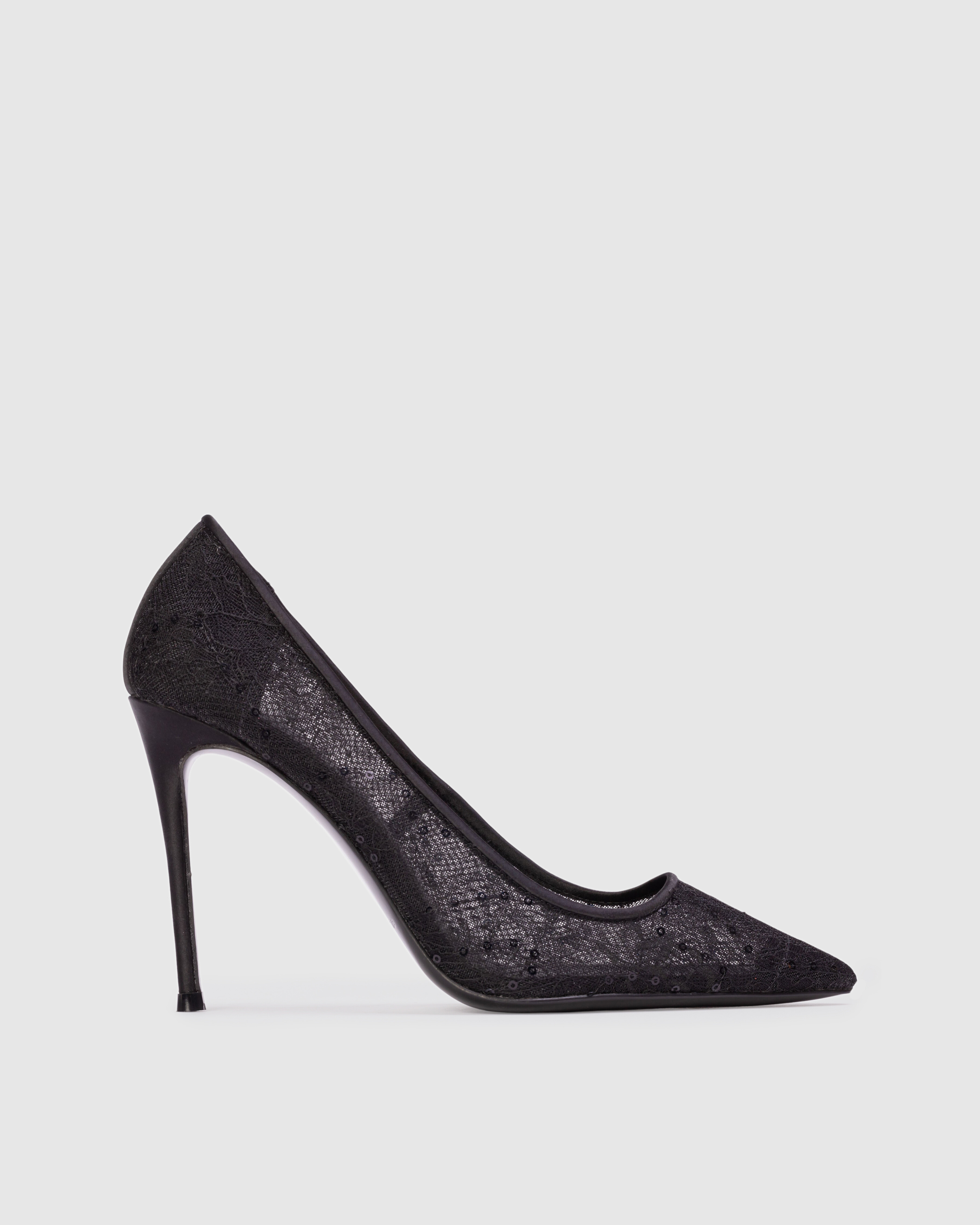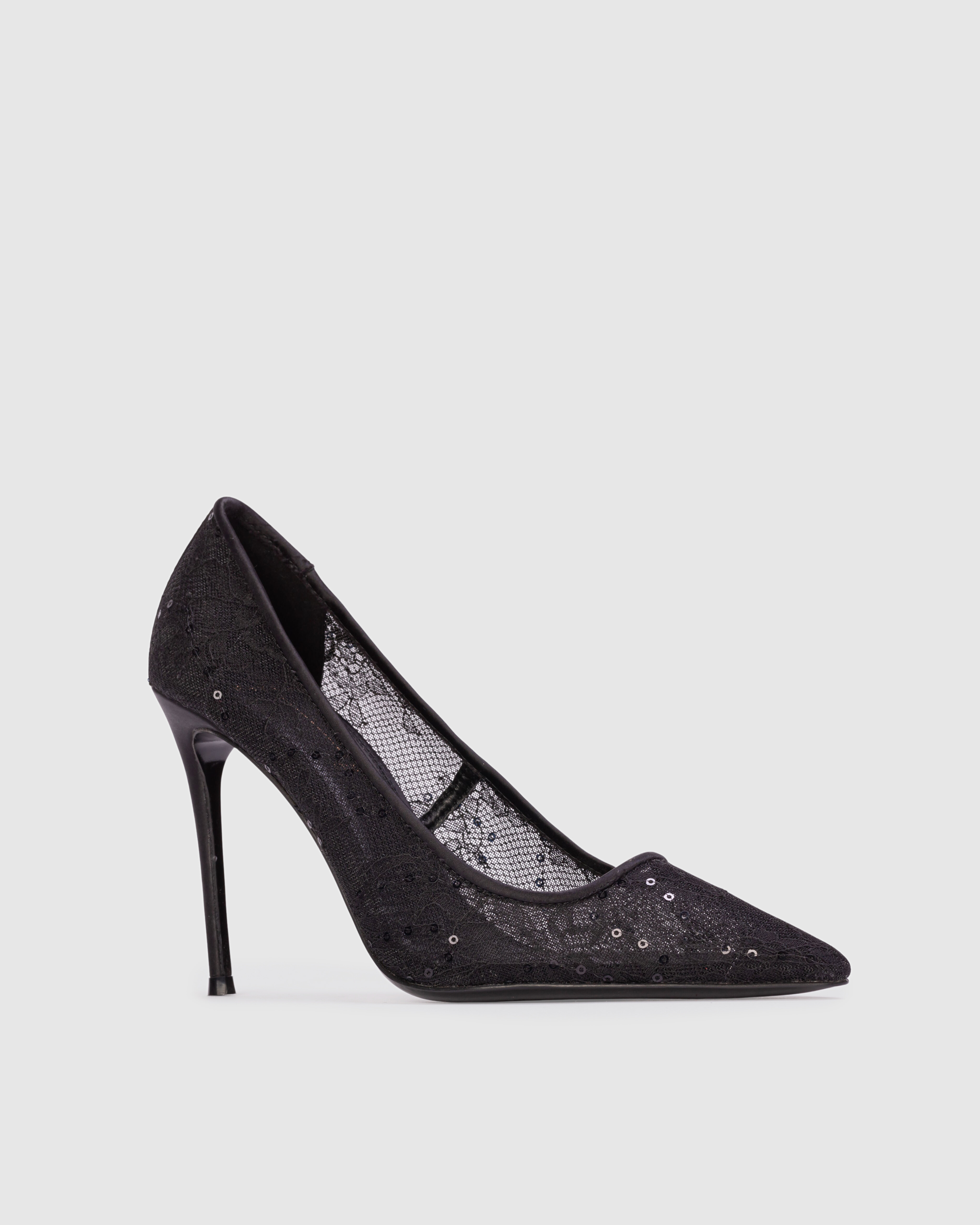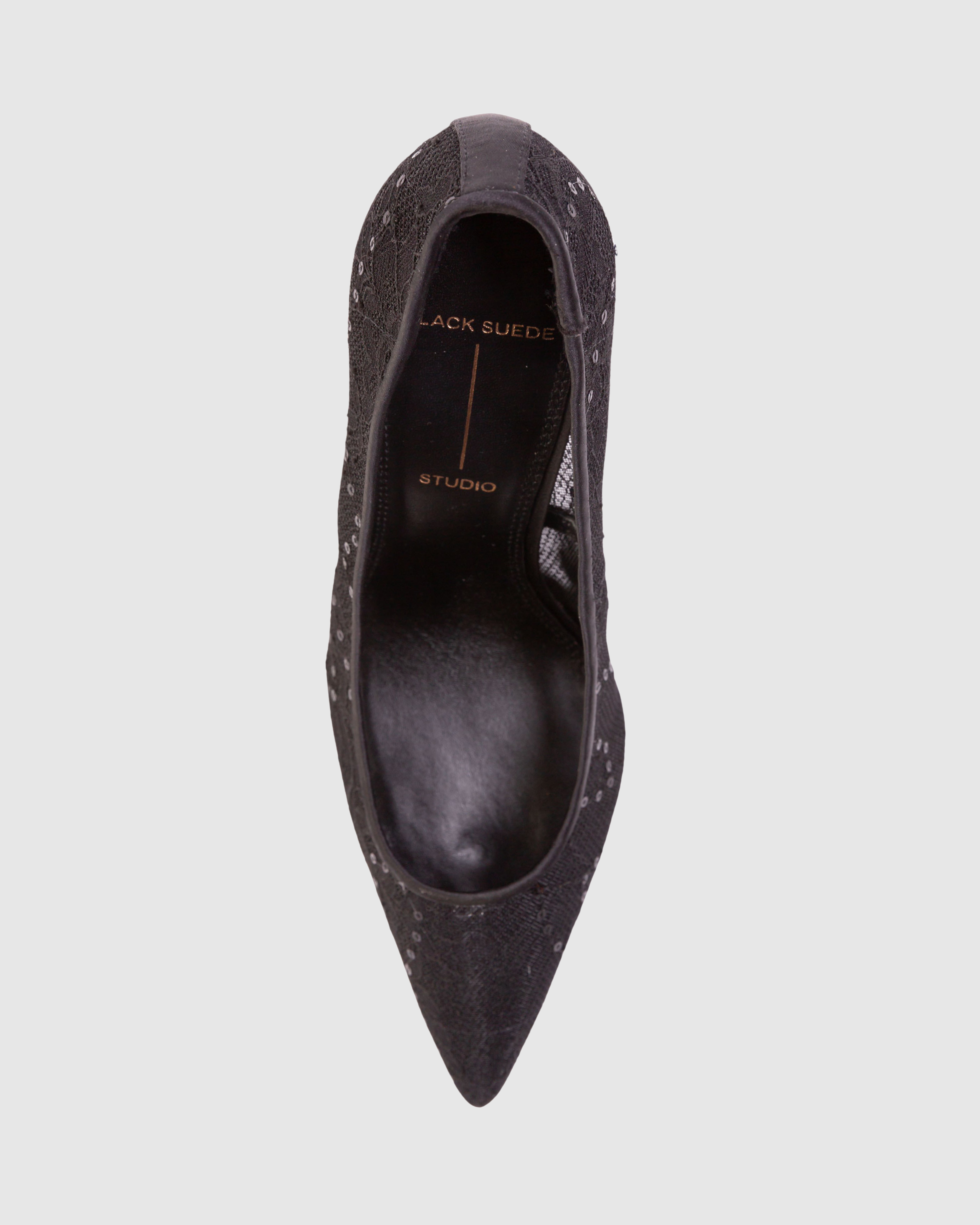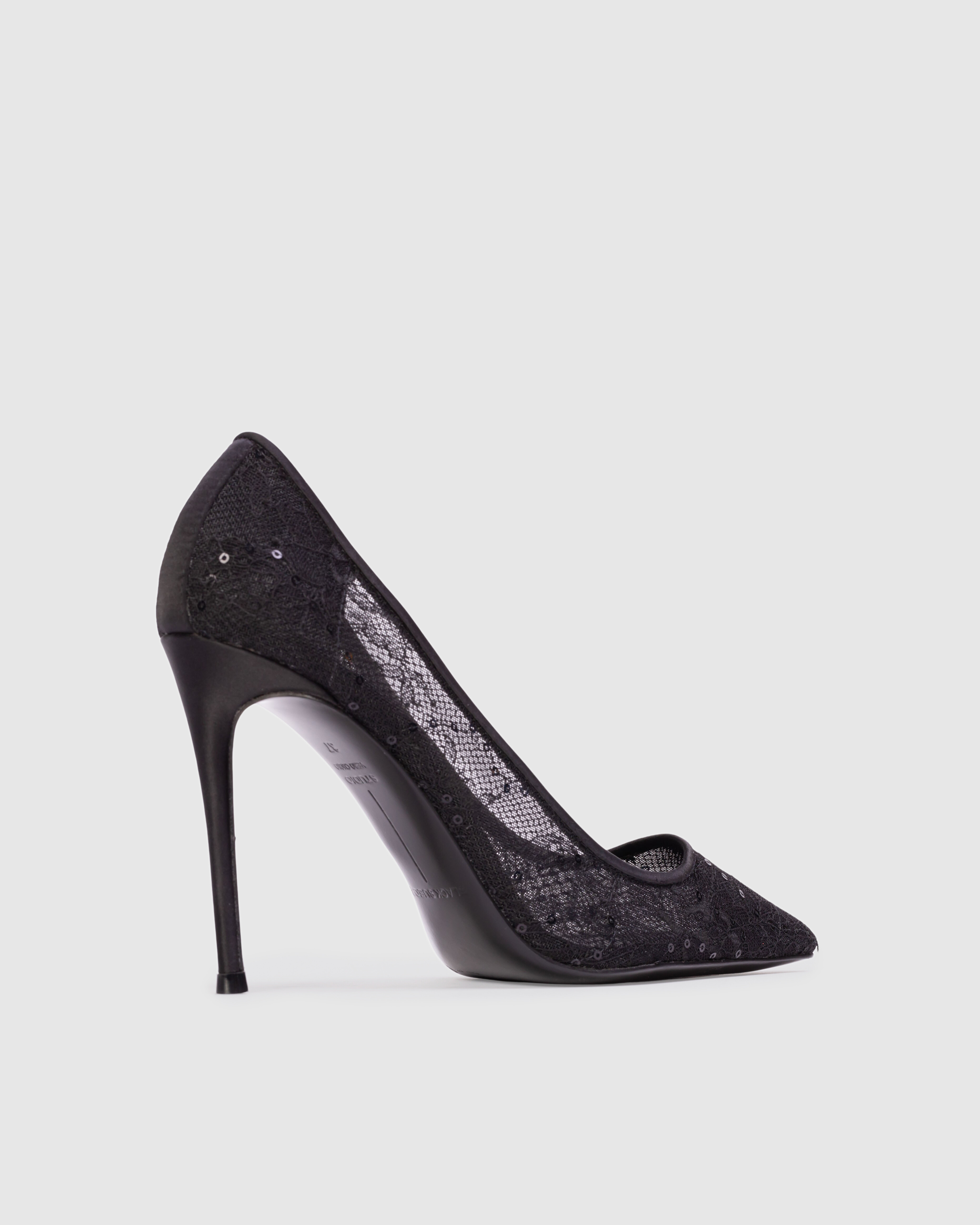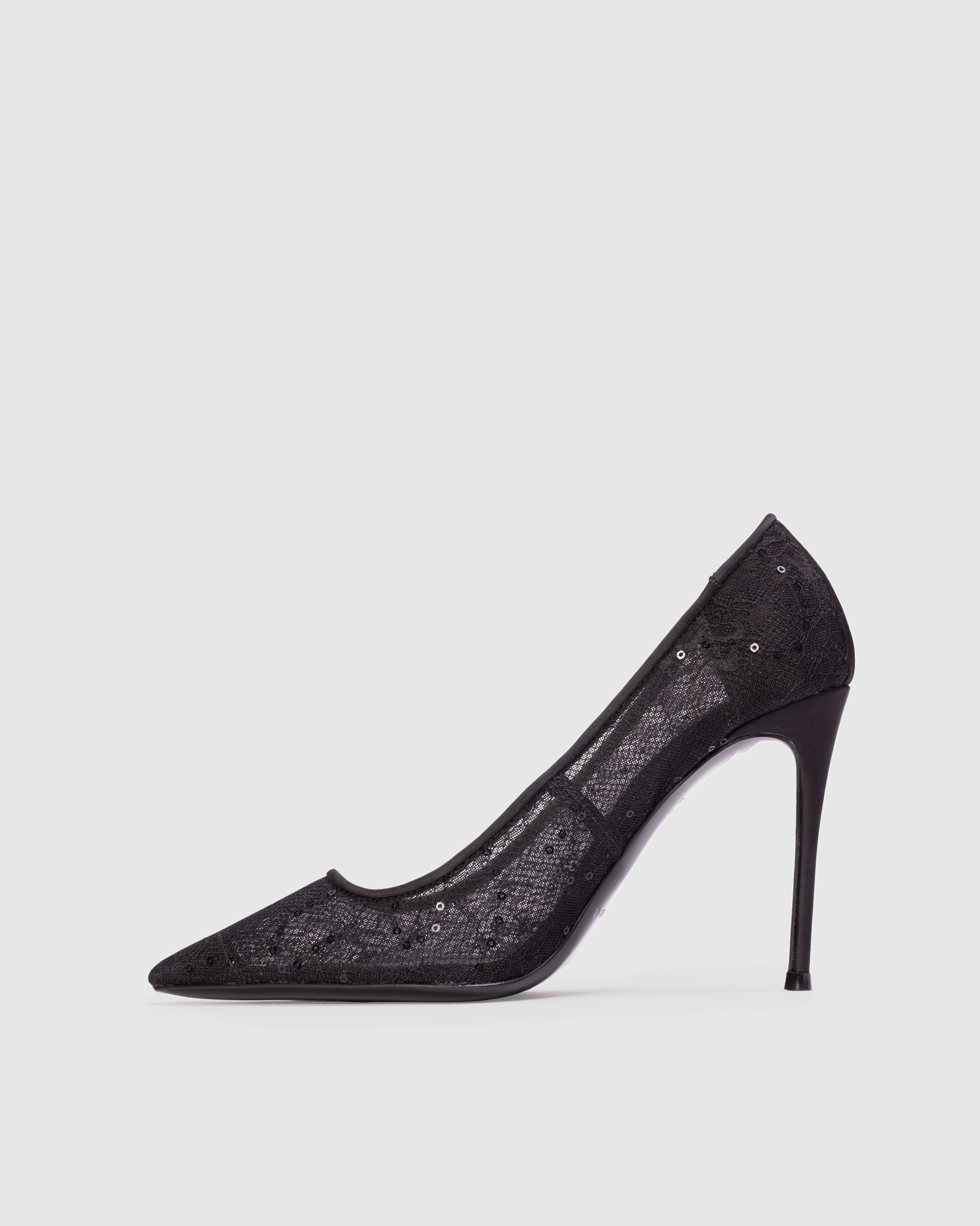 Pointy toe lace pump set on a stiletto pin heel. Made with crepe satin and sequin lace.