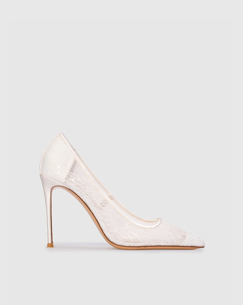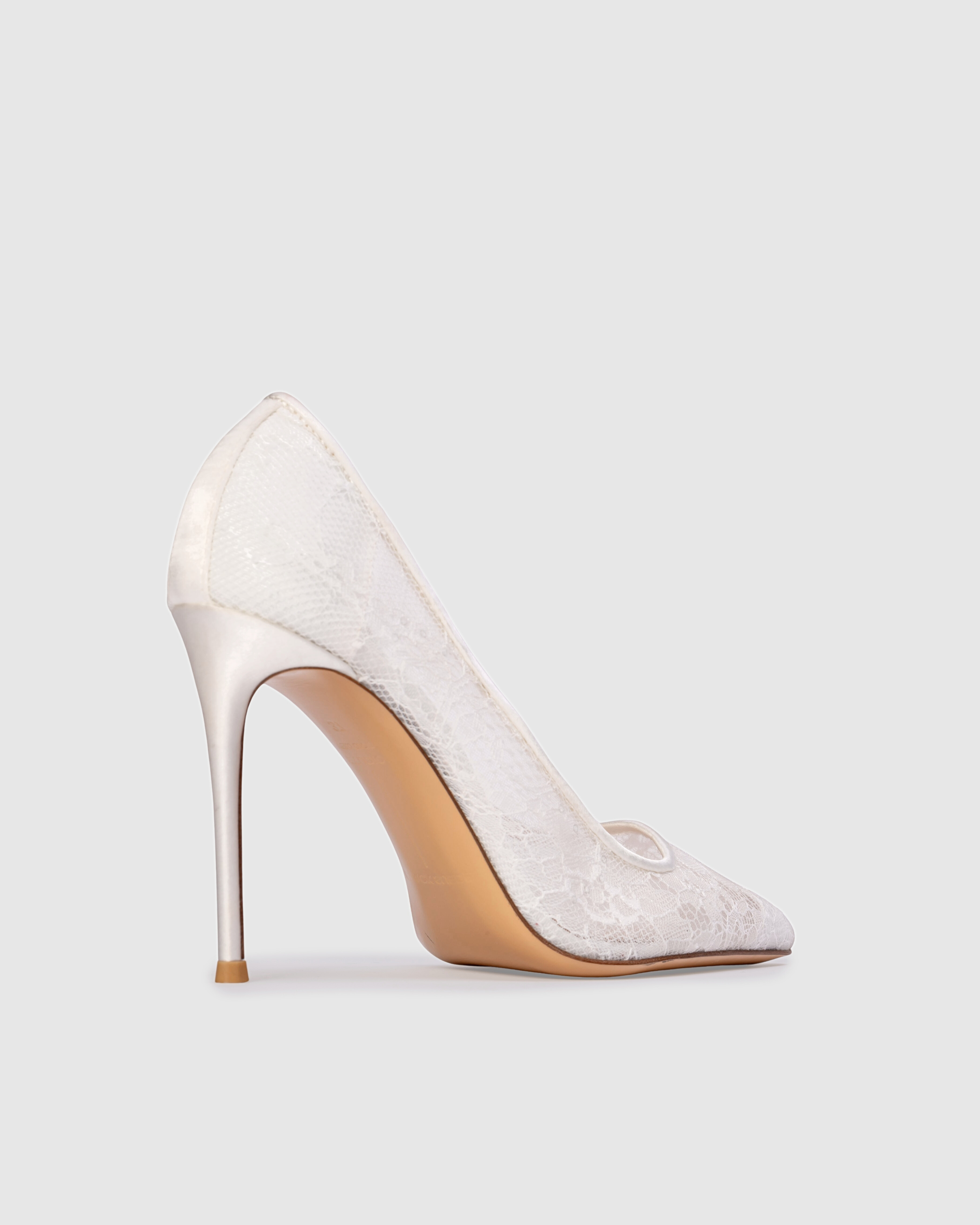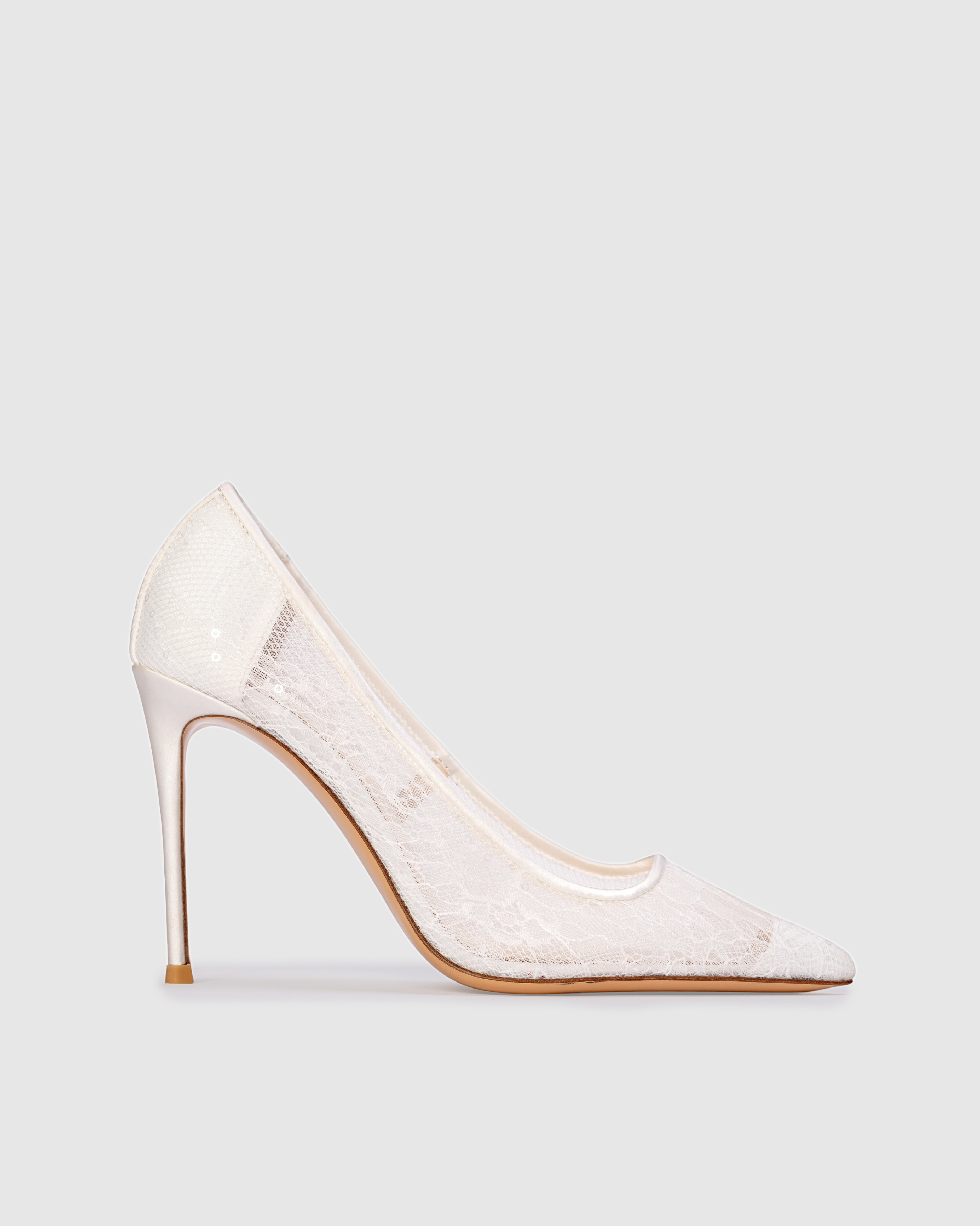 Pointy toe lace pump set on a stiletto pin heel. Made with crepe satin and sequin lace.