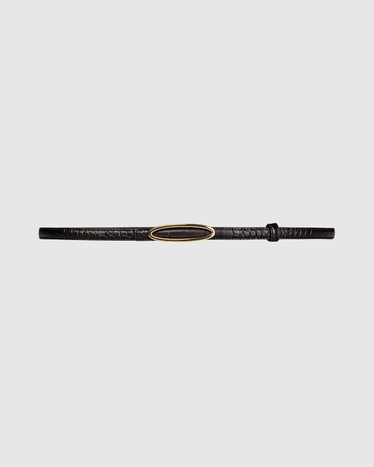 gold plated brass slim oval shaped buckle. Secured on a premium croc printed leather.