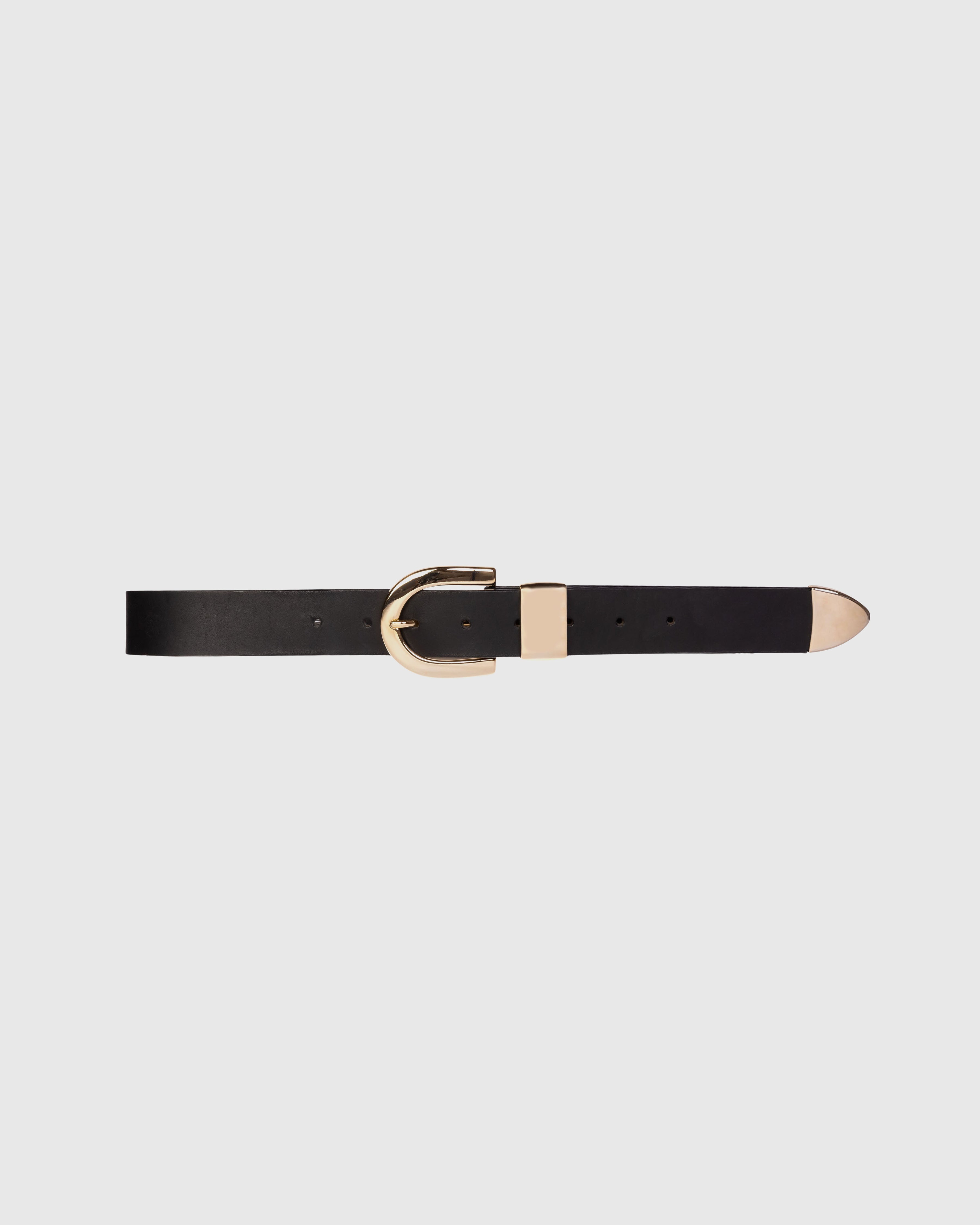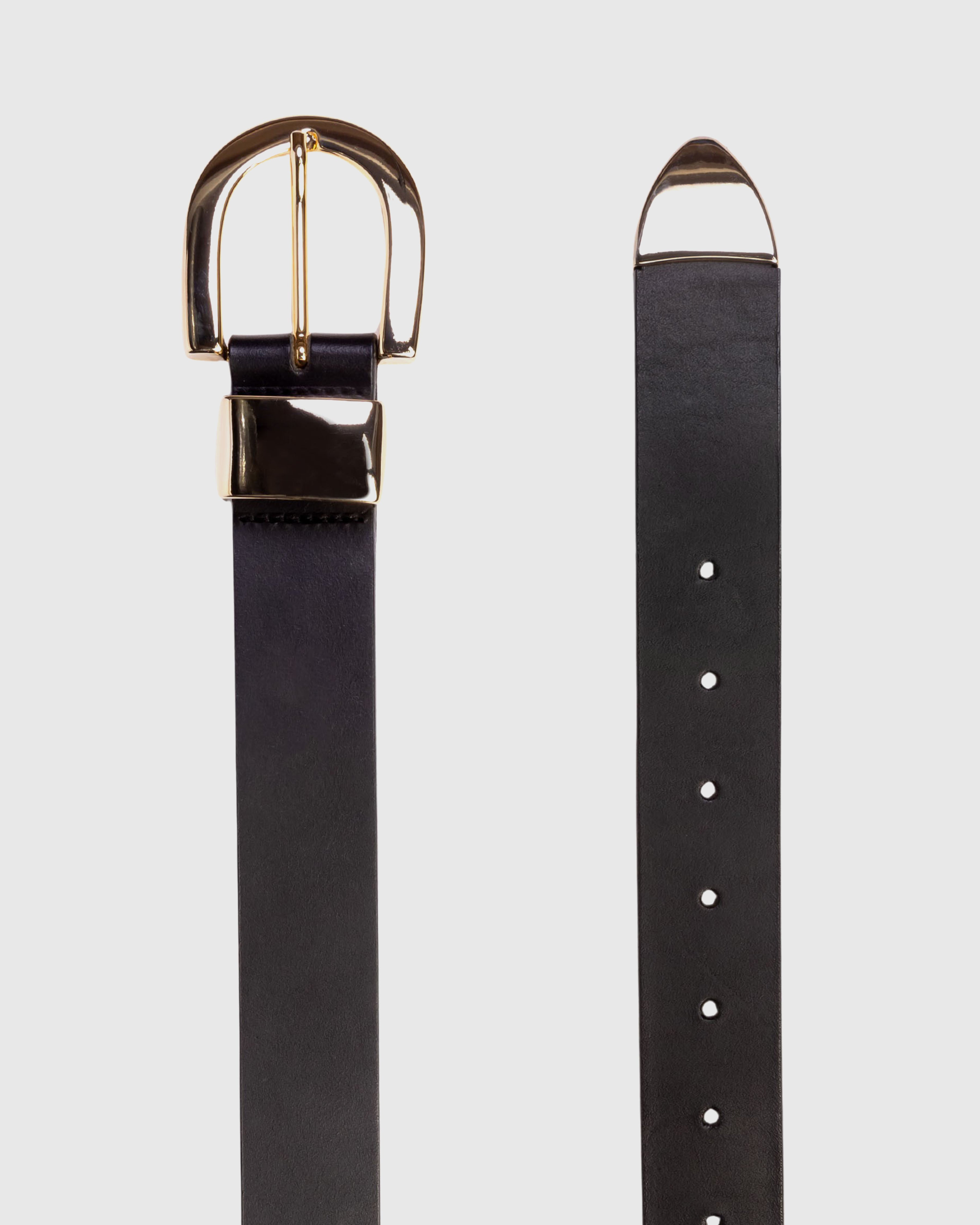 18k gold plated brass irregular shaped buckle and detailed tip. Secured on a smooth buffed leather strap.