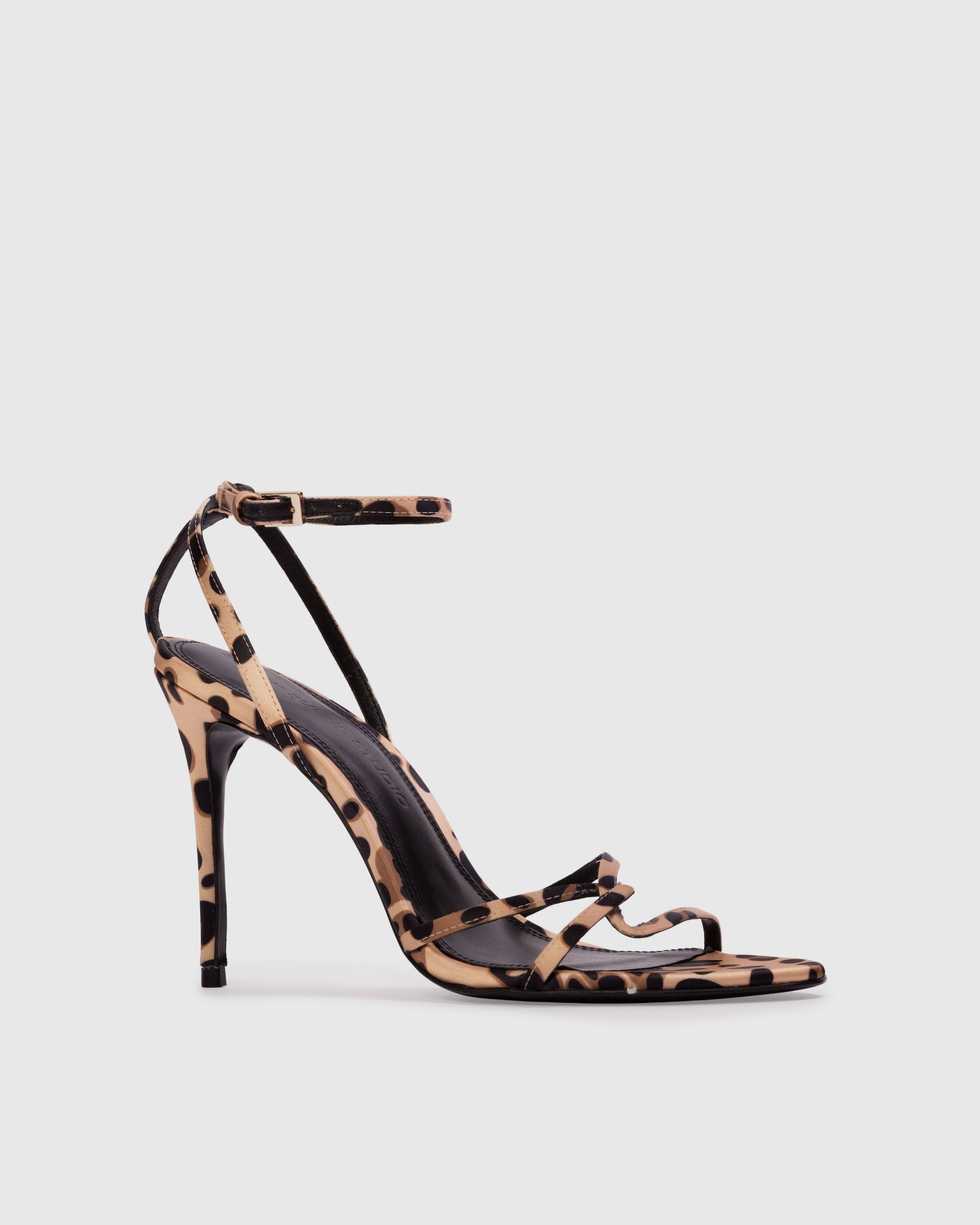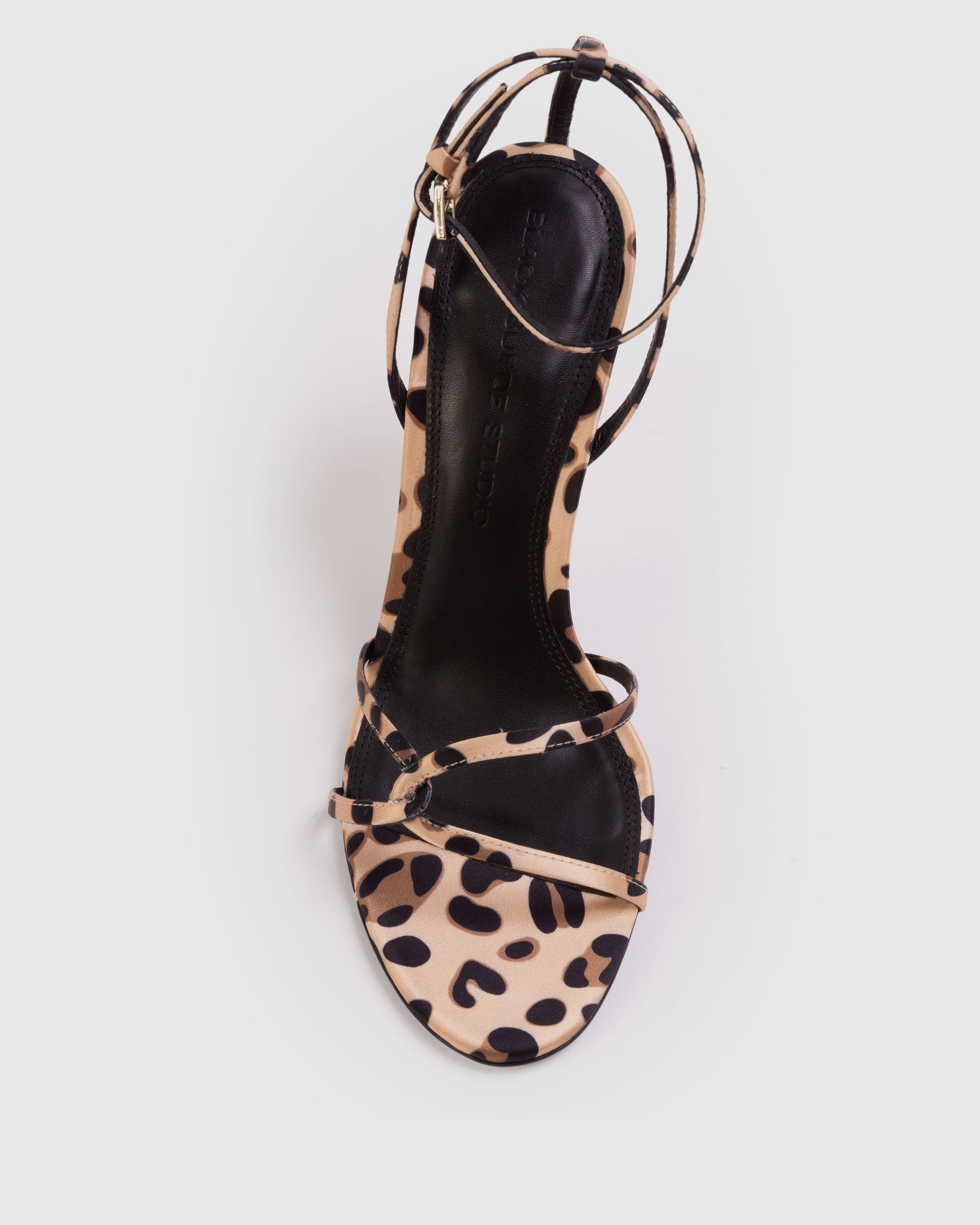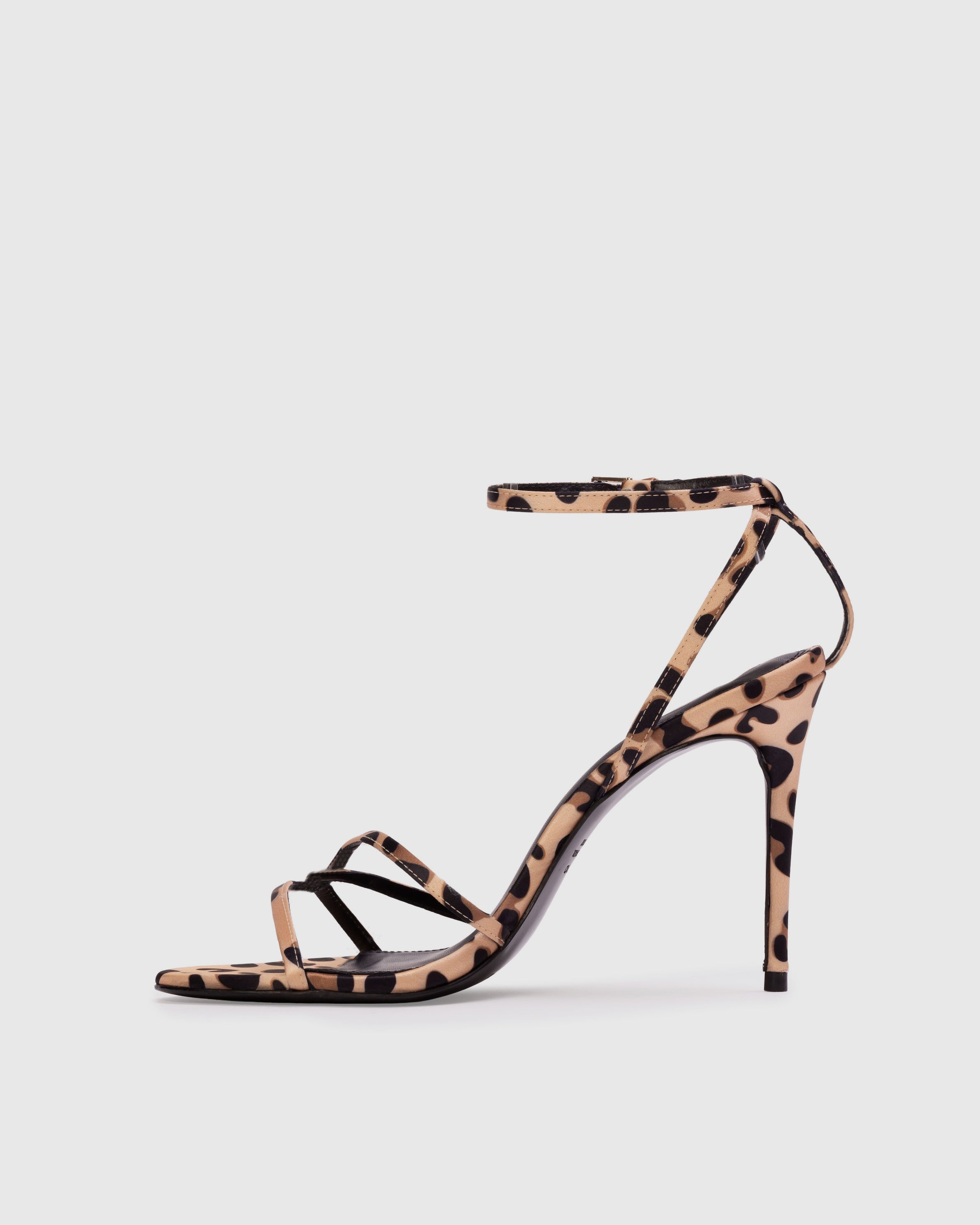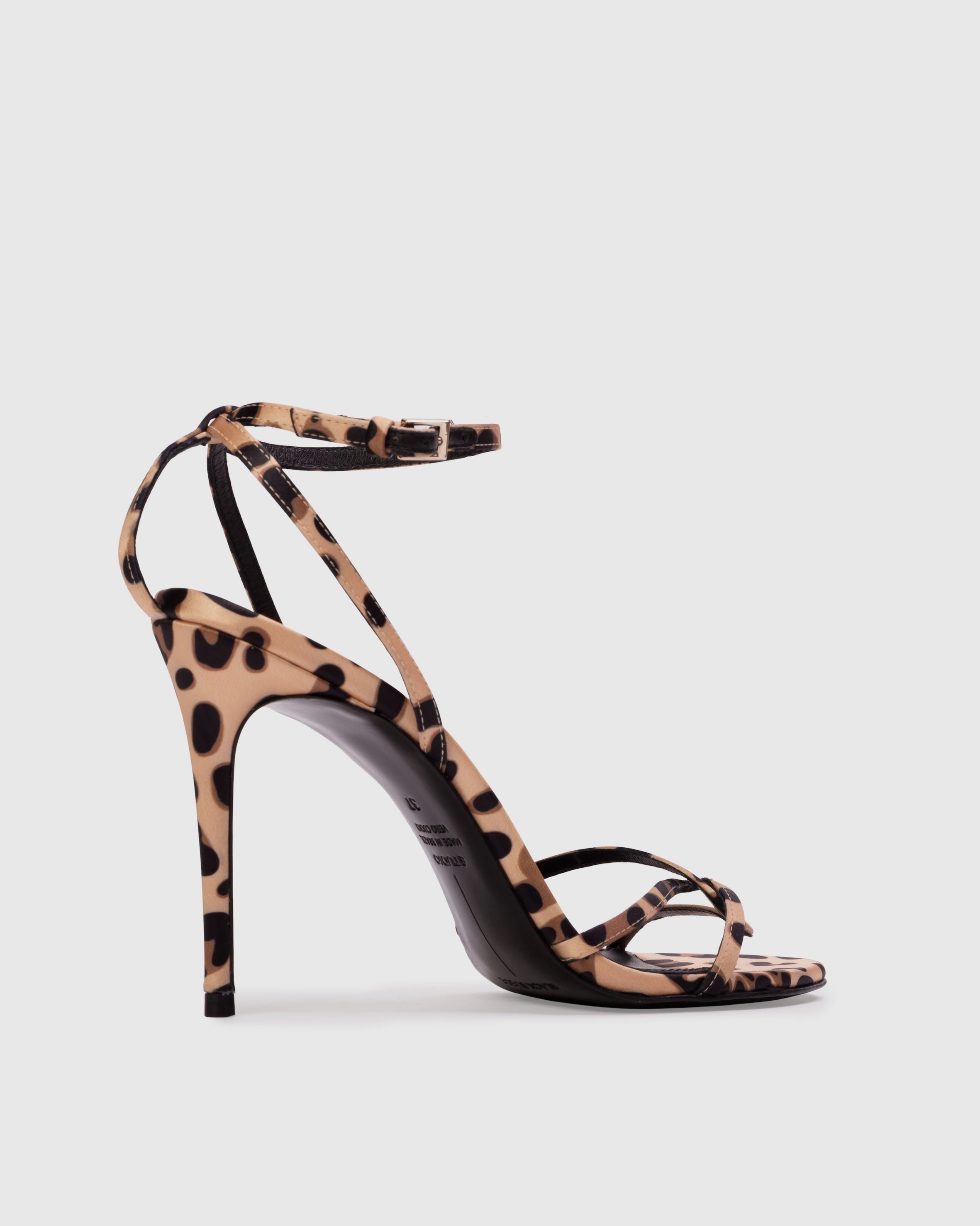 Round toe multi-strap sandal, set on a pin stiletto heel. made with satin crepe.