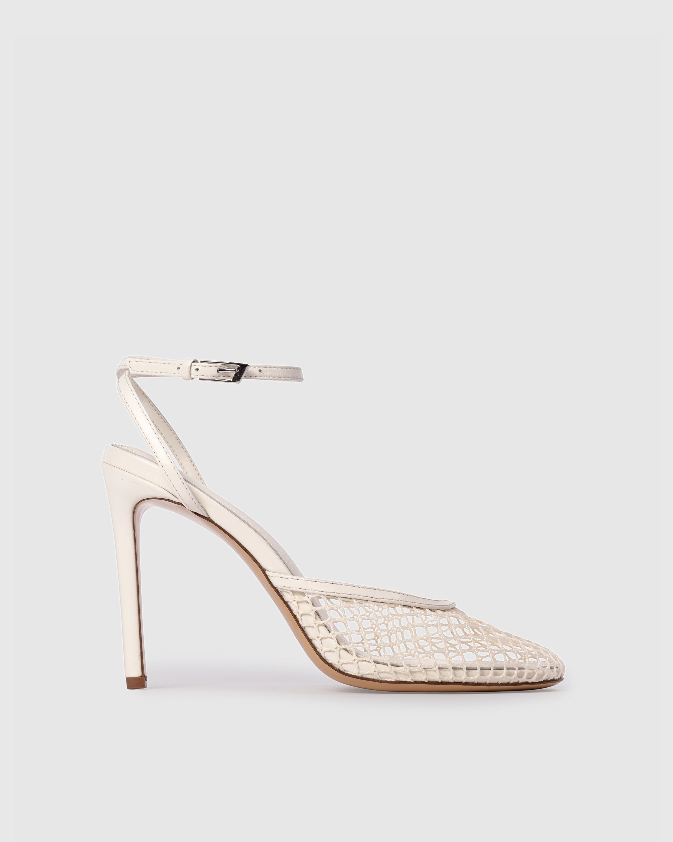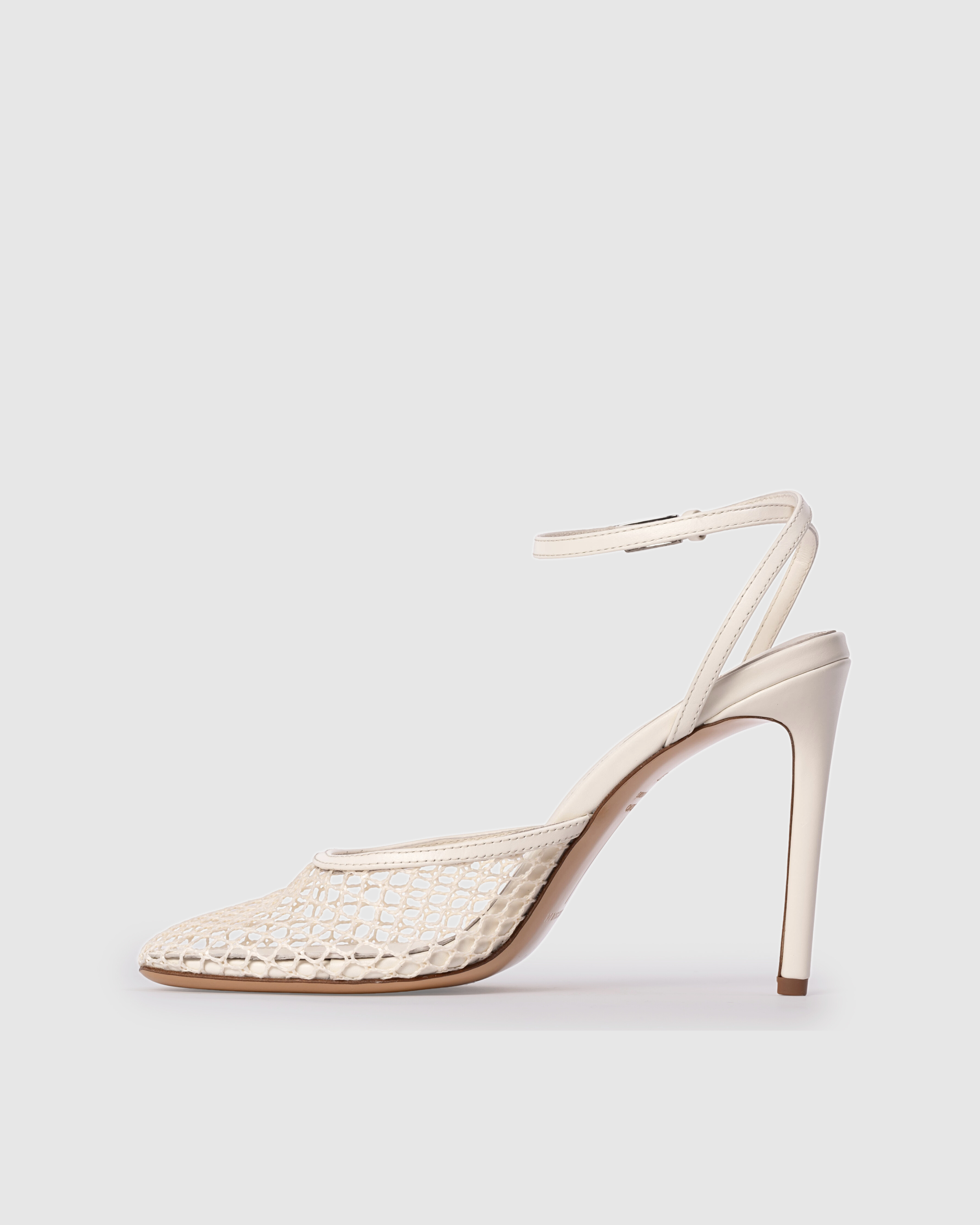 round toe mesh sandal, set on an asymmetrical stiletto heel. Made with woven mesh and smooth buffed leather.