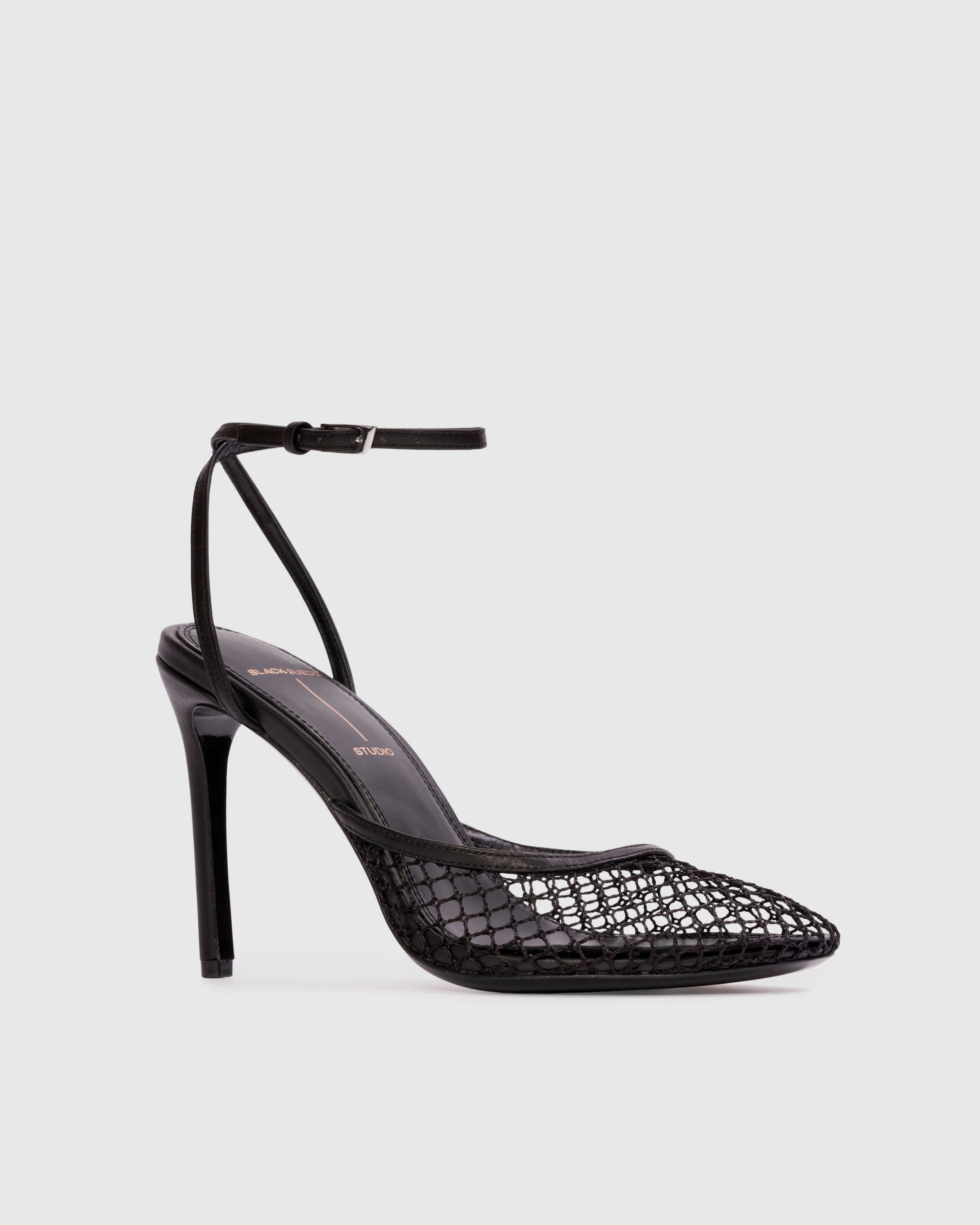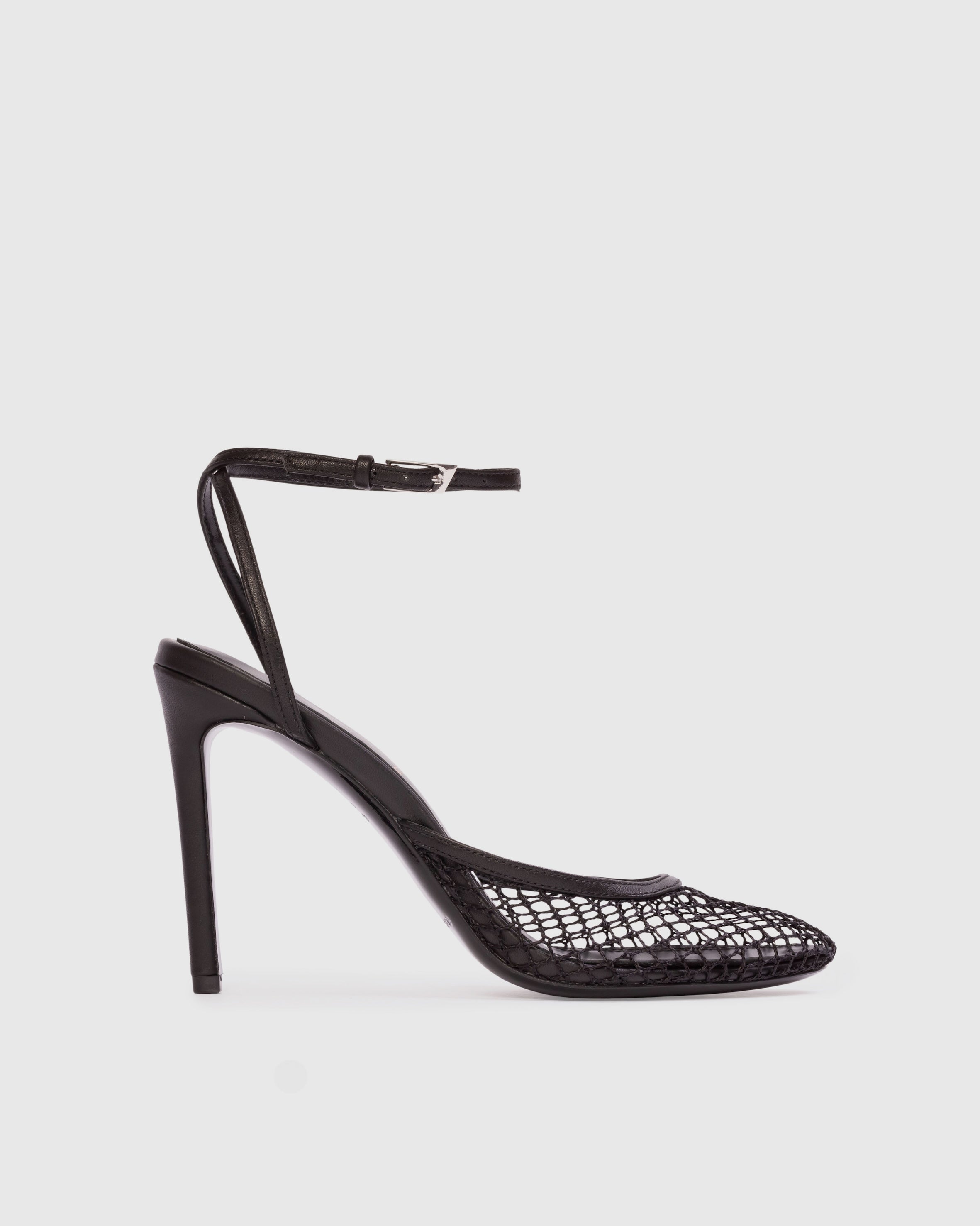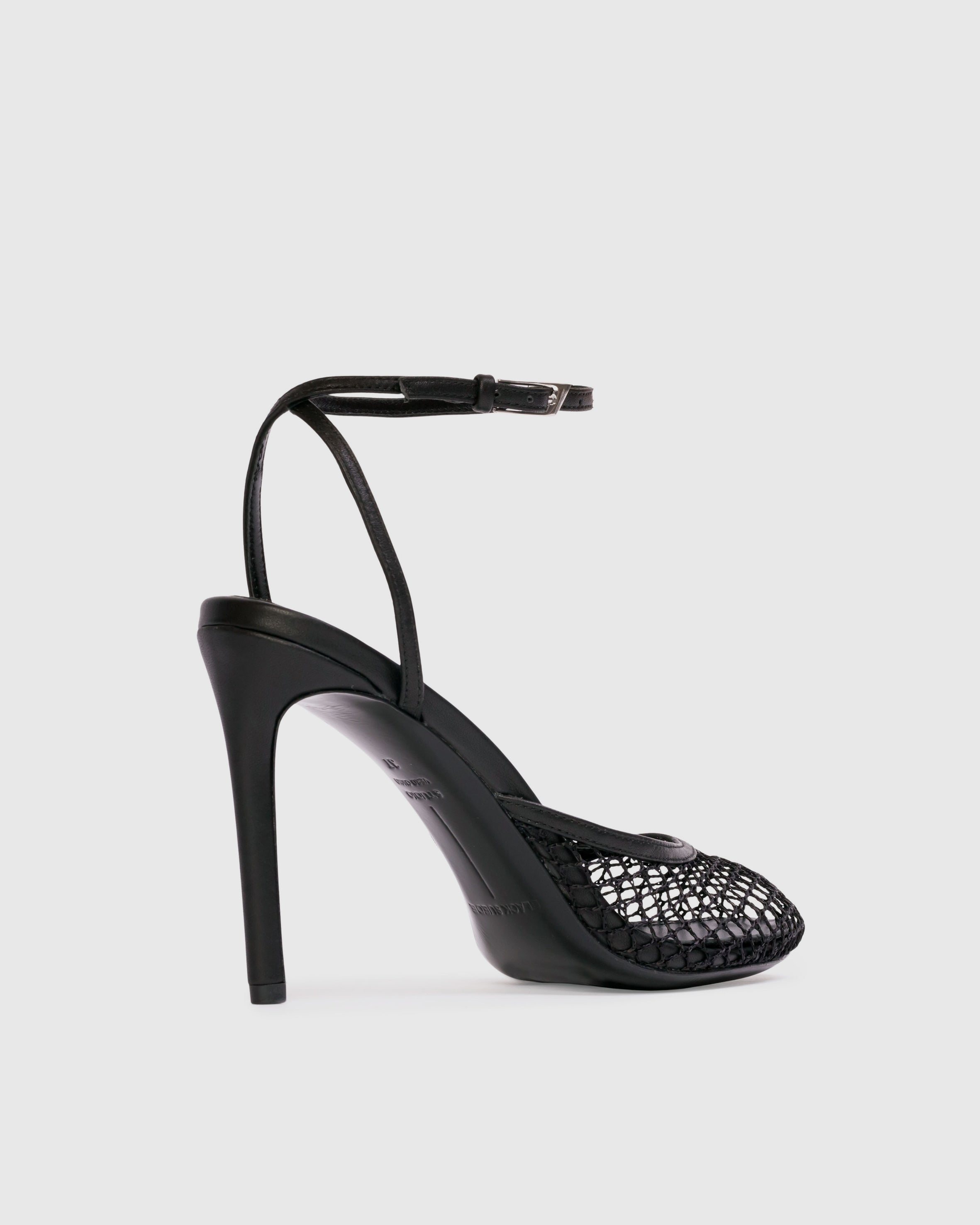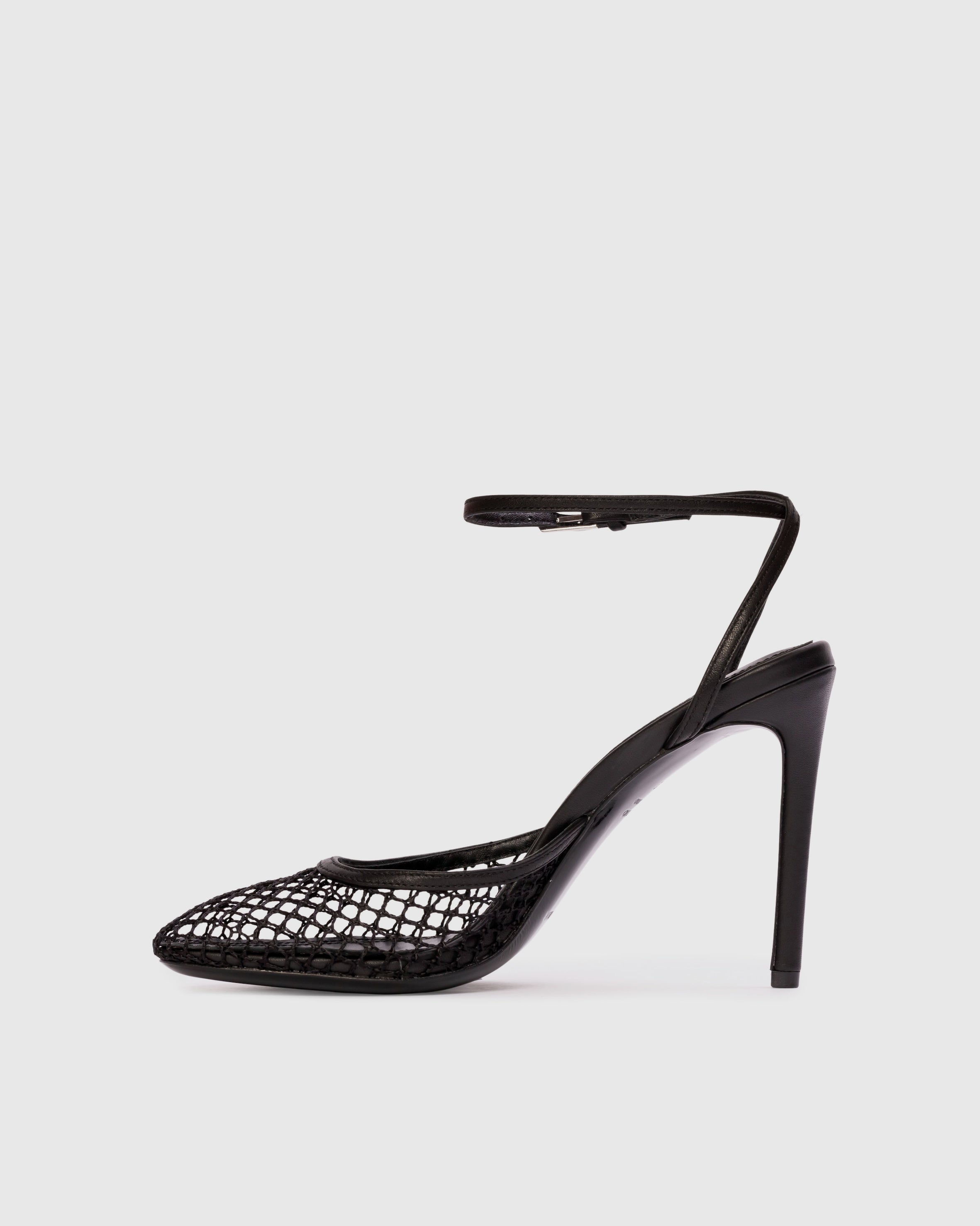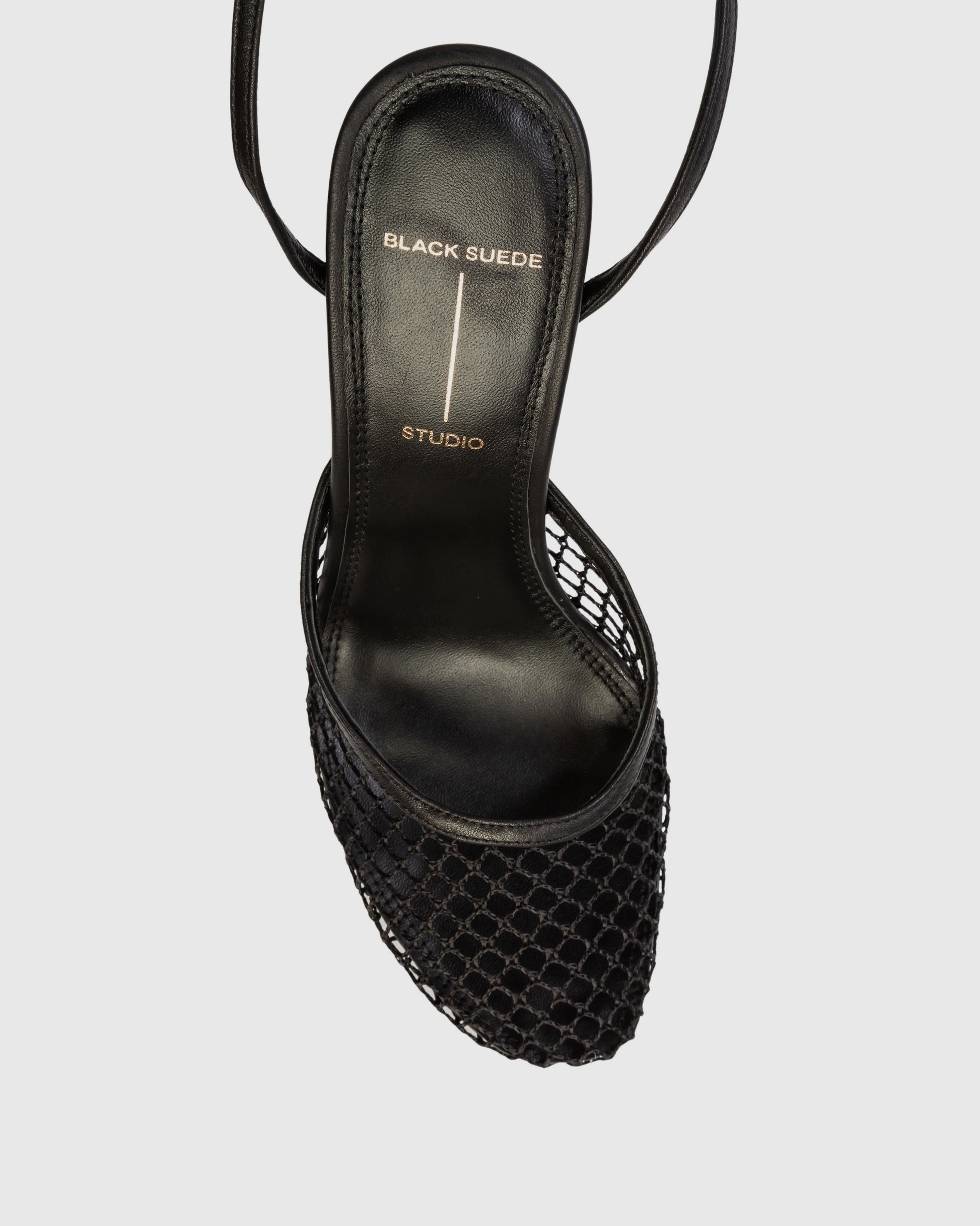 round toe mesh sandal, set on an asymmetrical stiletto heel. Made with woven mesh and smooth buffed leather.