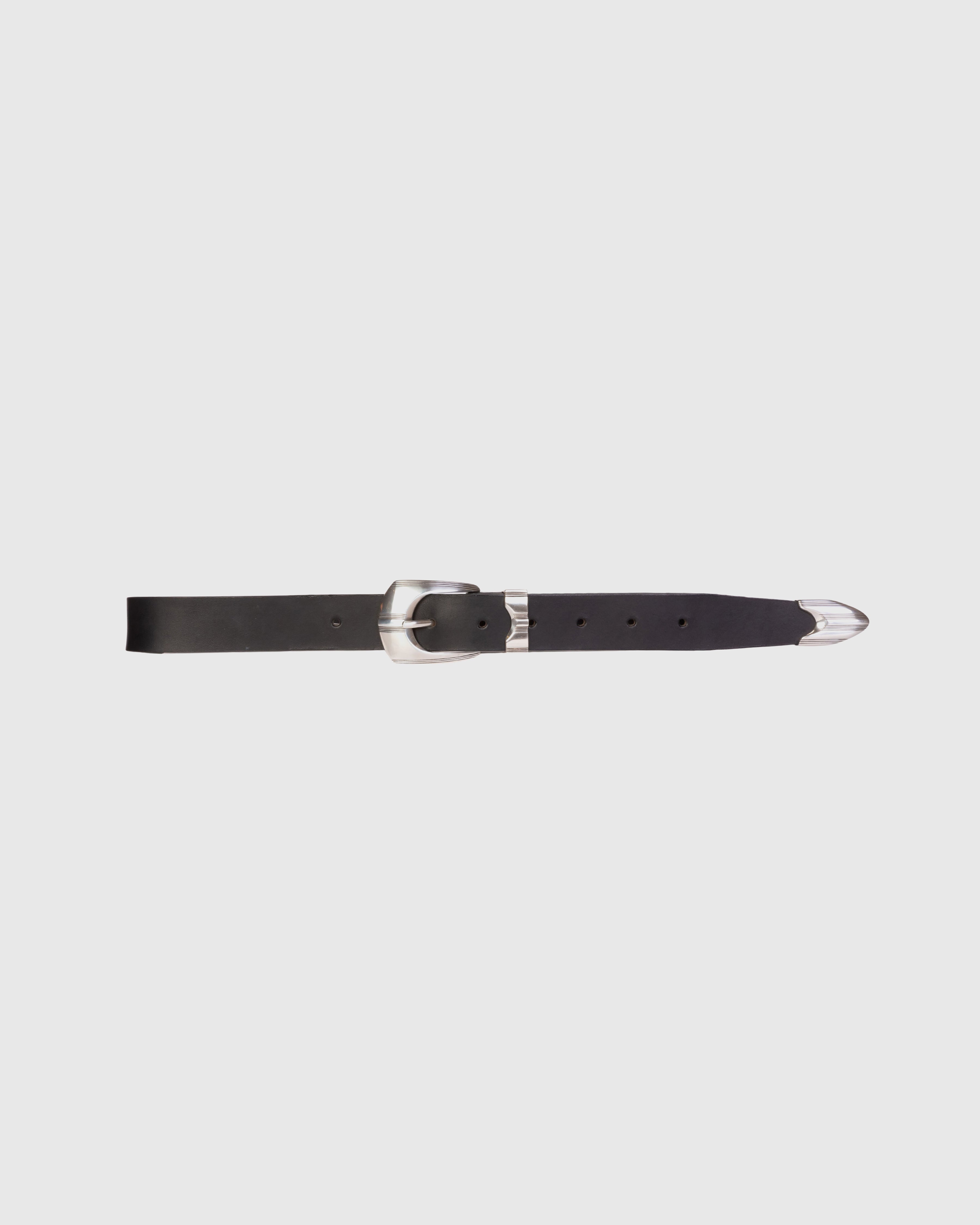 Silver plated brass with western 3 piece shaped buckle. Secured on a smooth buffed leather strap.