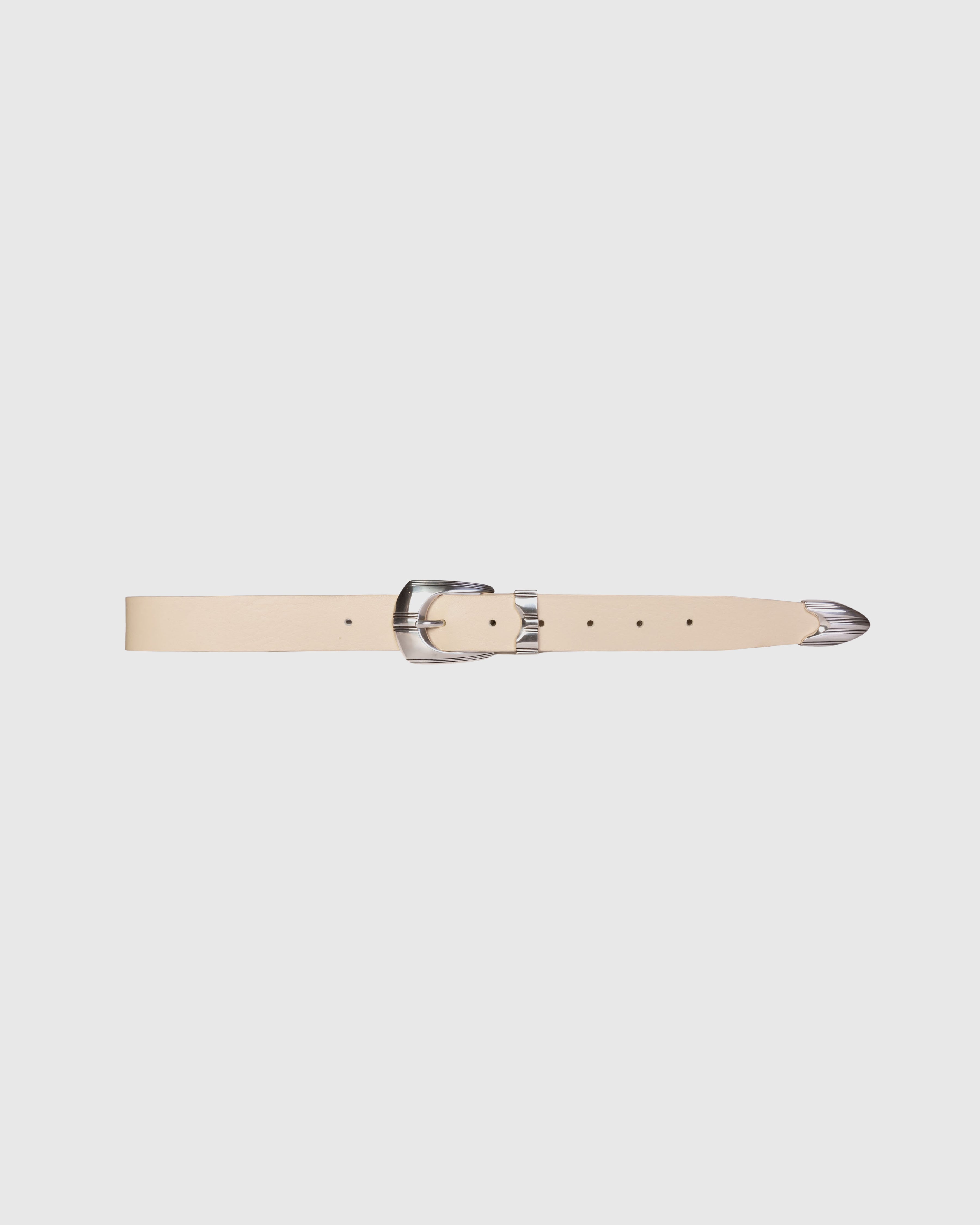 Silver plated brass with western 3 piece shaped buckle. Secured on a smooth buffed leather strap.