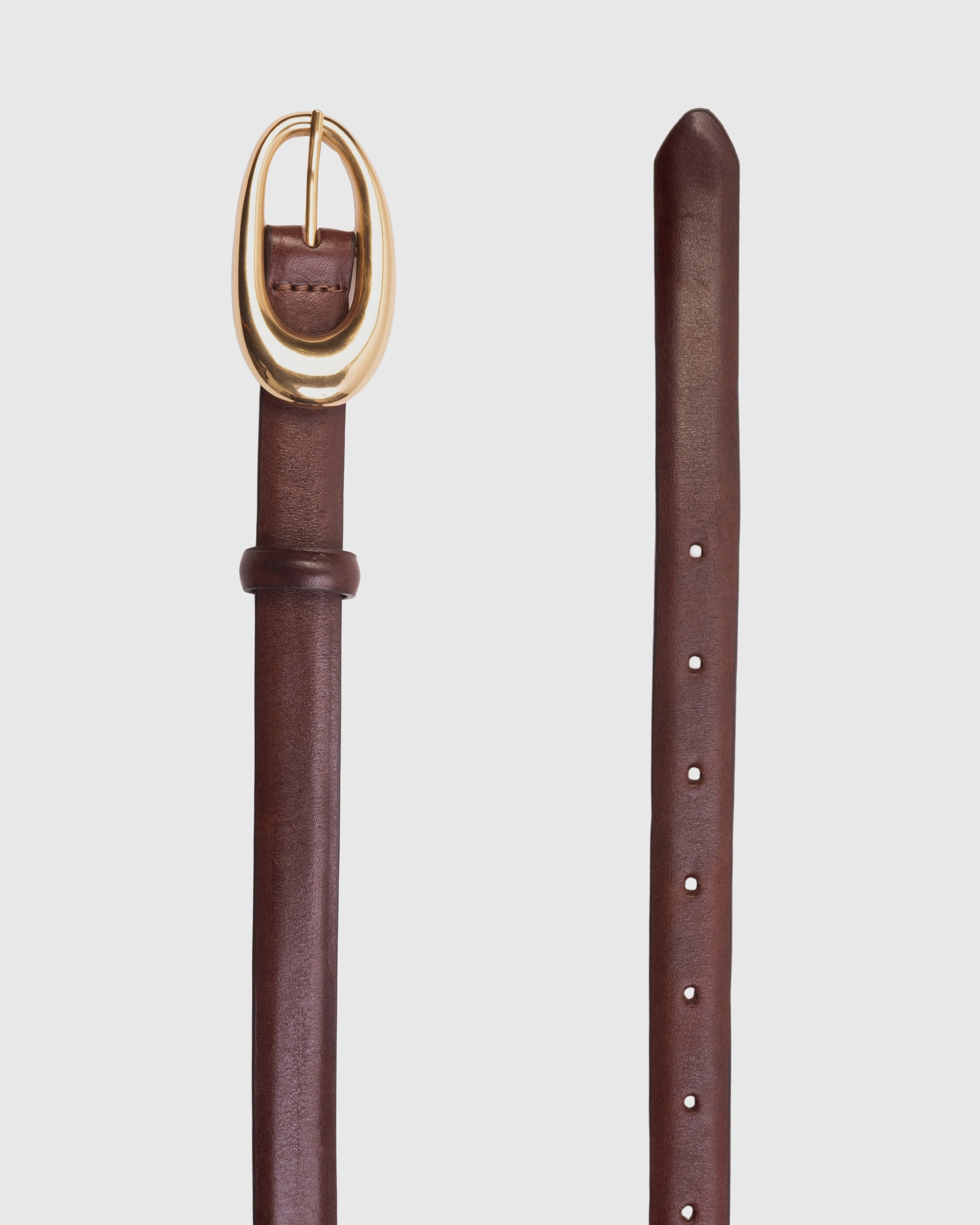 Gold plated brass oval shaped buckle. Secured on a smooth buffed leather strap.