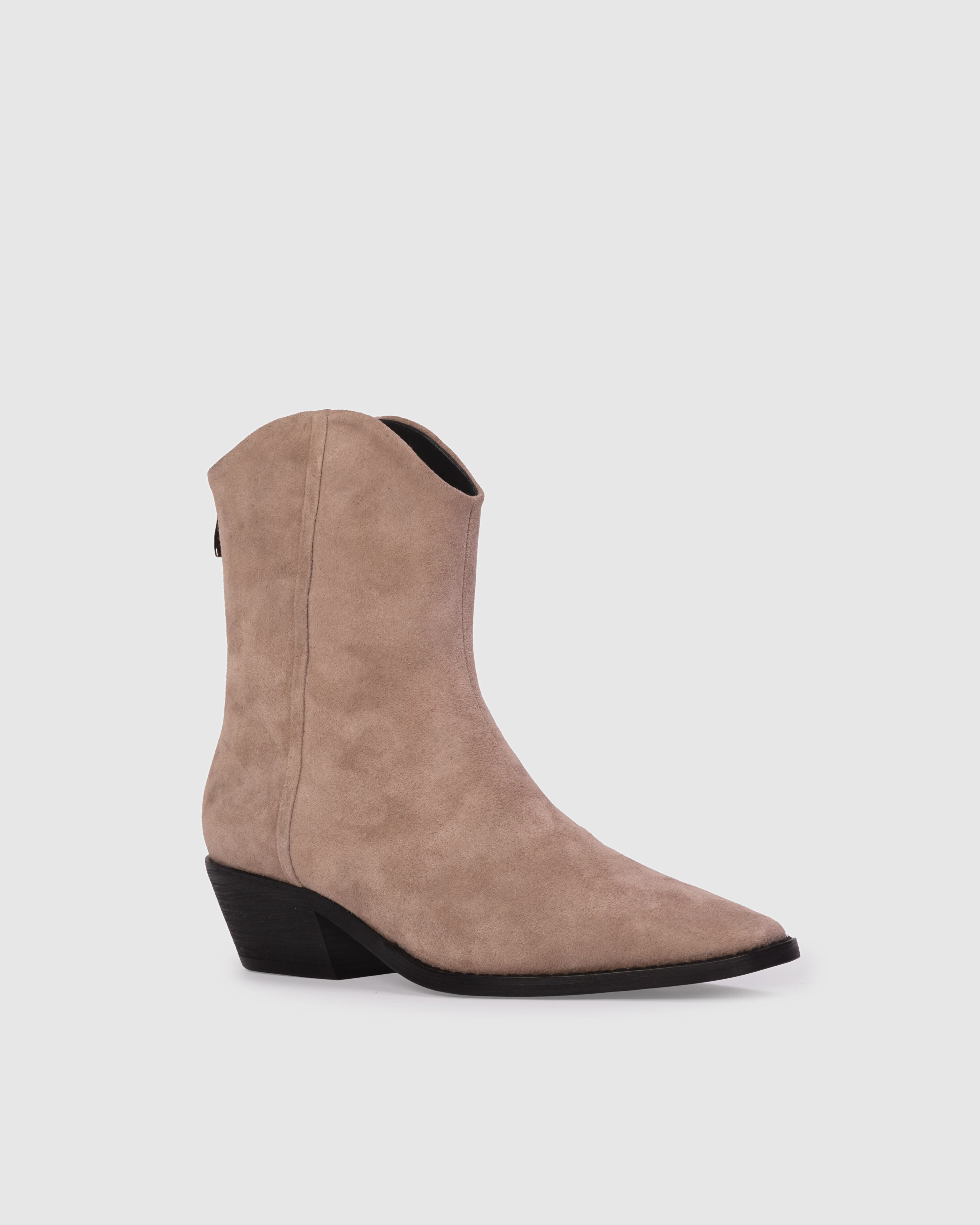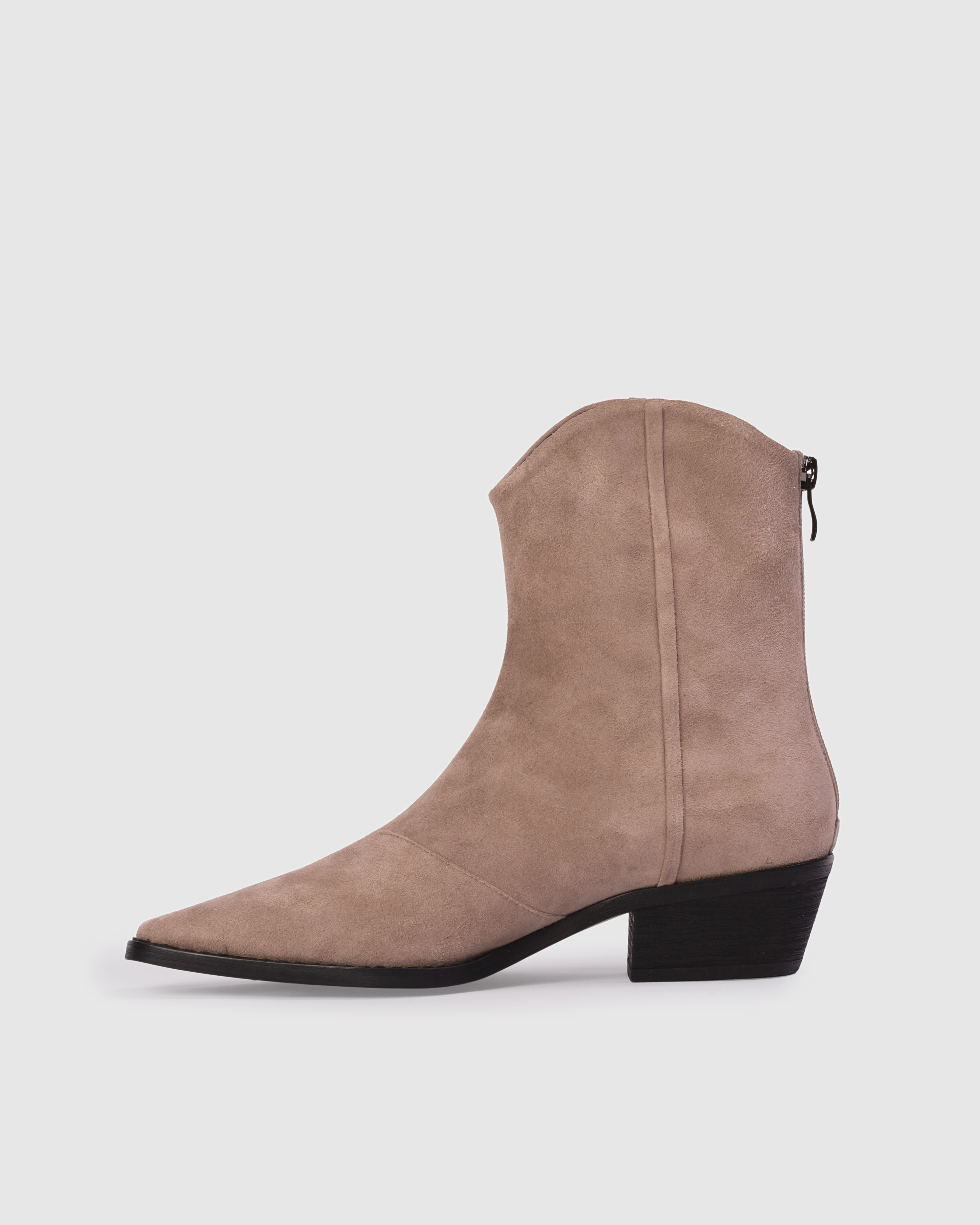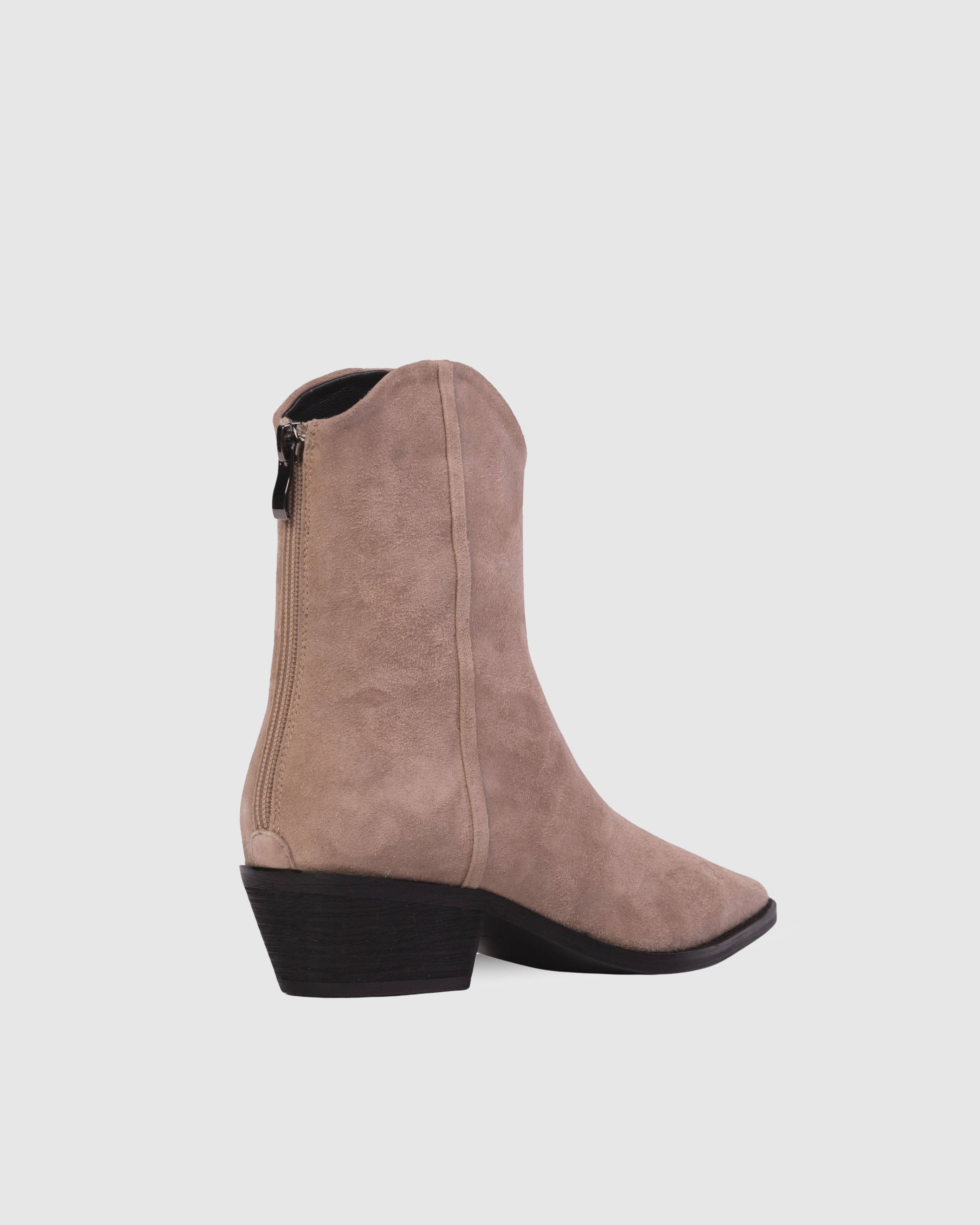 Snipped toe classic chelsea boot, set on a stacked angled heel. Made with brushed kid suede.