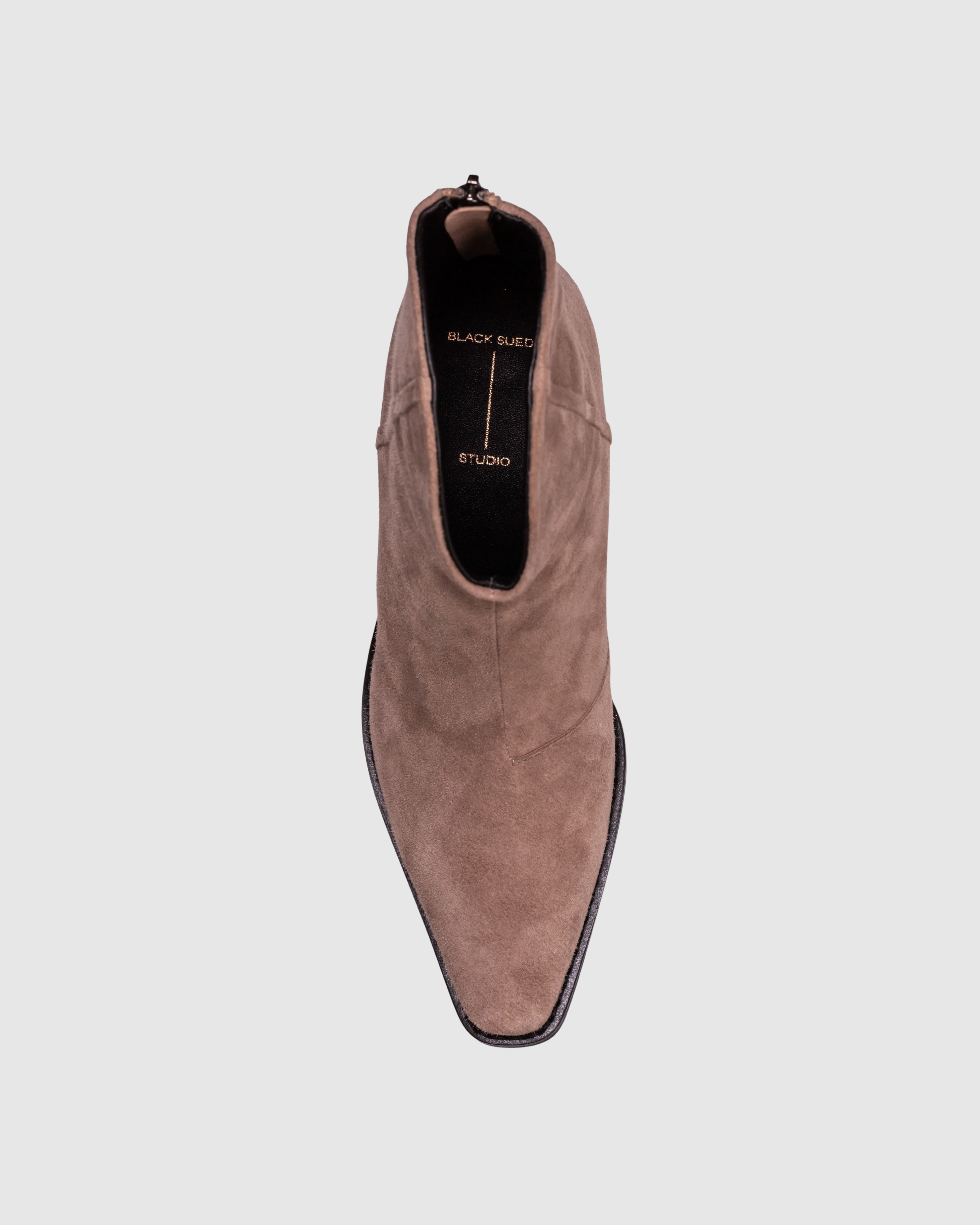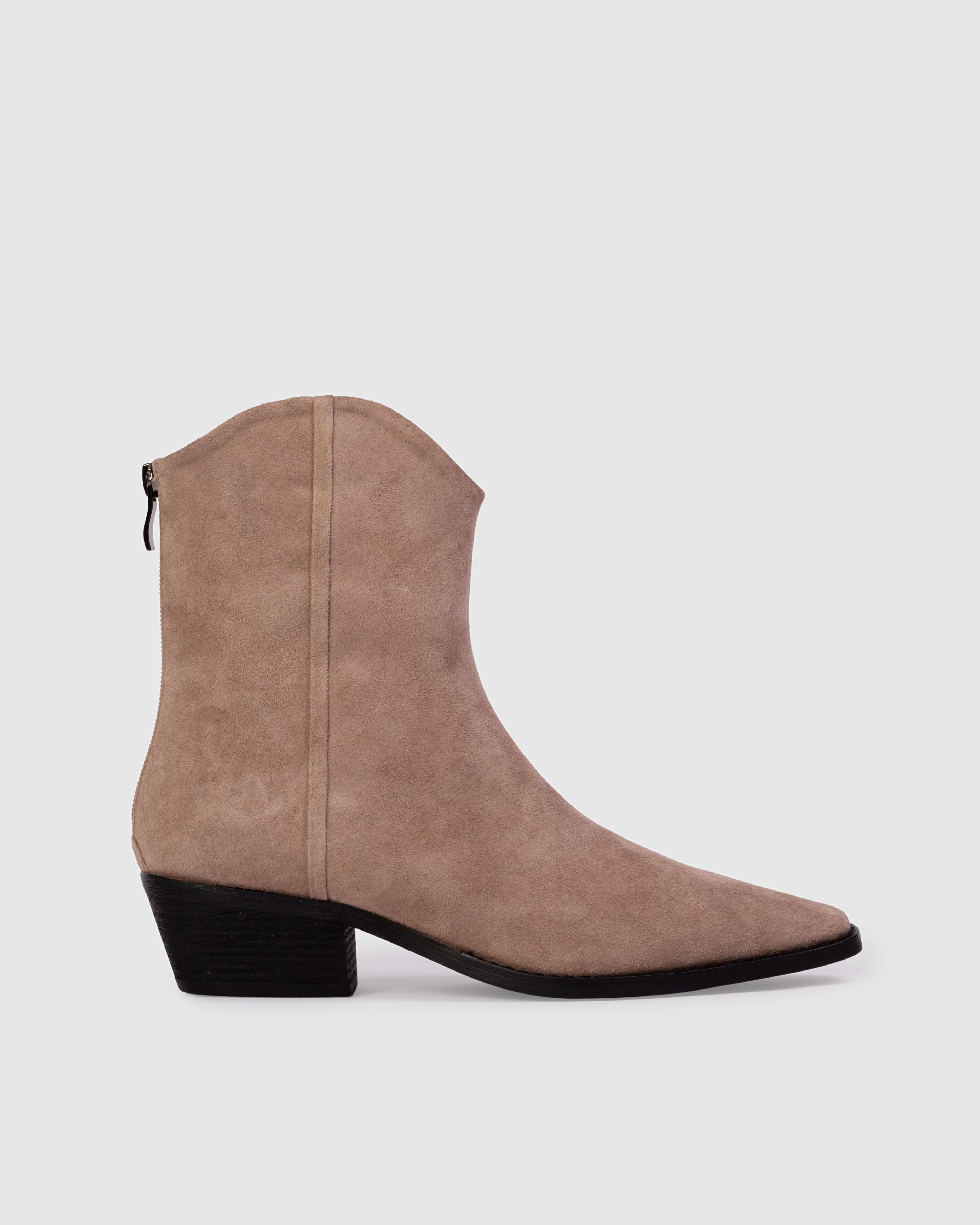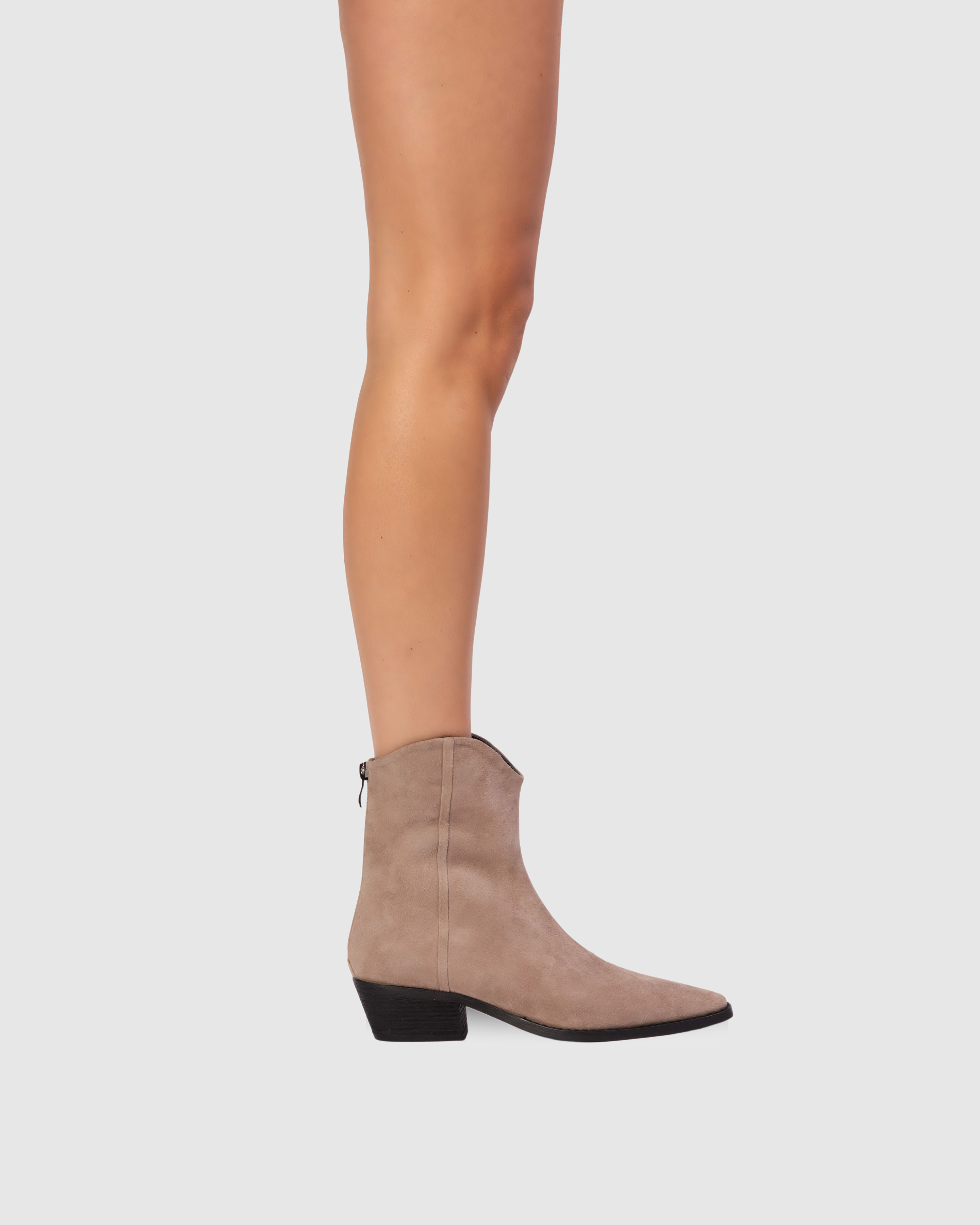 Snipped toe classic chelsea boot, set on a stacked angled heel. Made with brushed kid suede.
