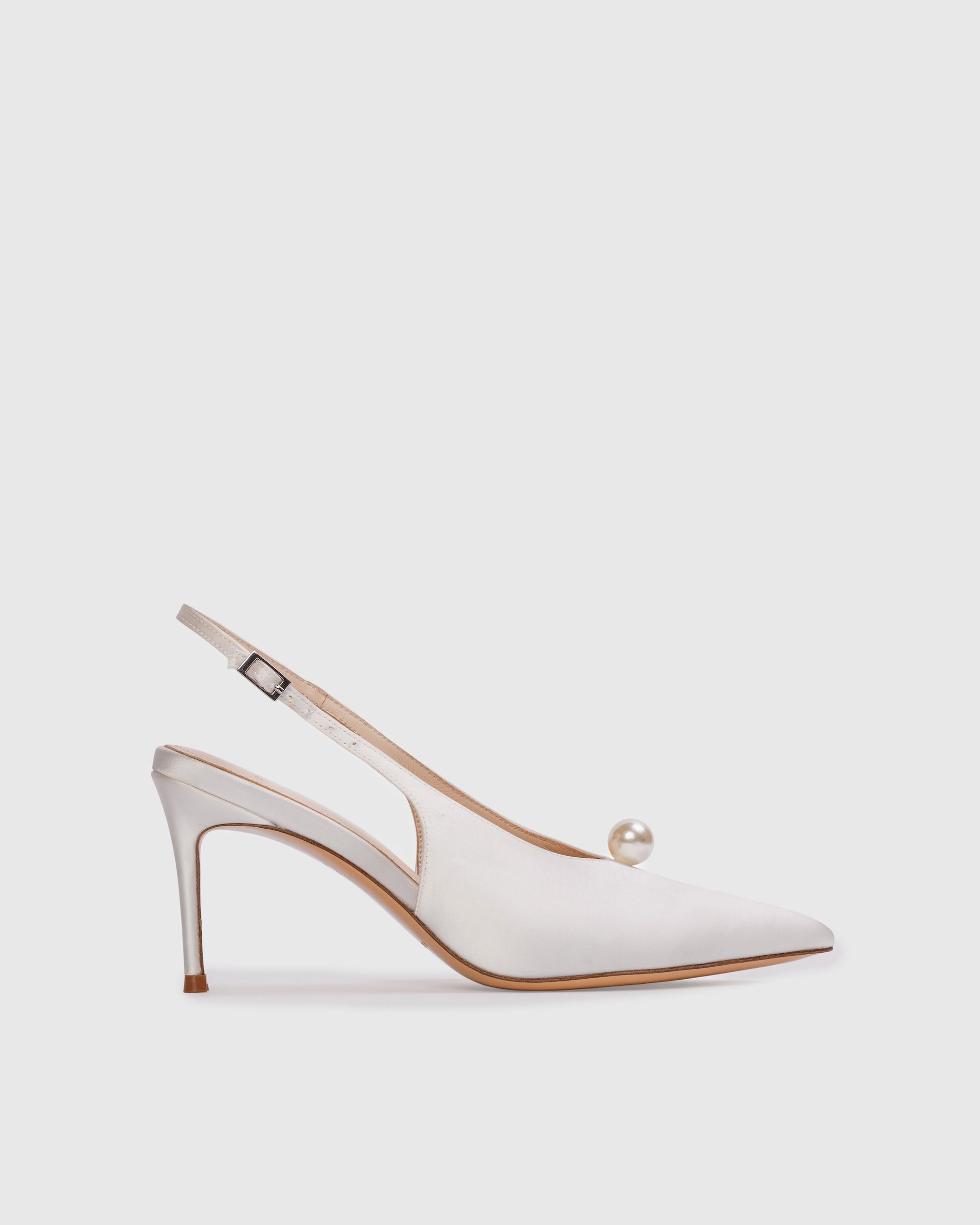 Pointy toe slingback pump with pearl detailing, set on a high pin heel. Made with satin crepe.