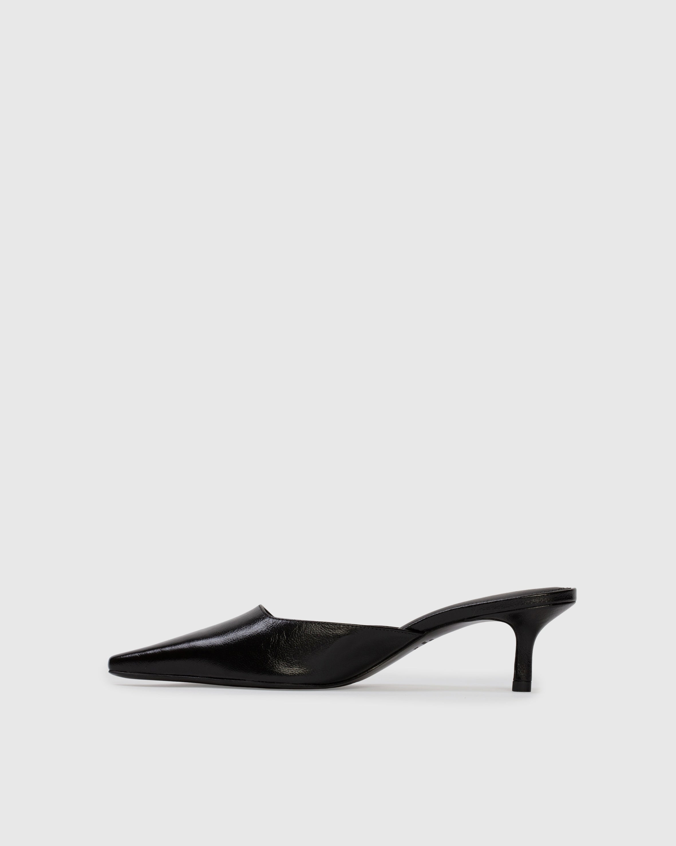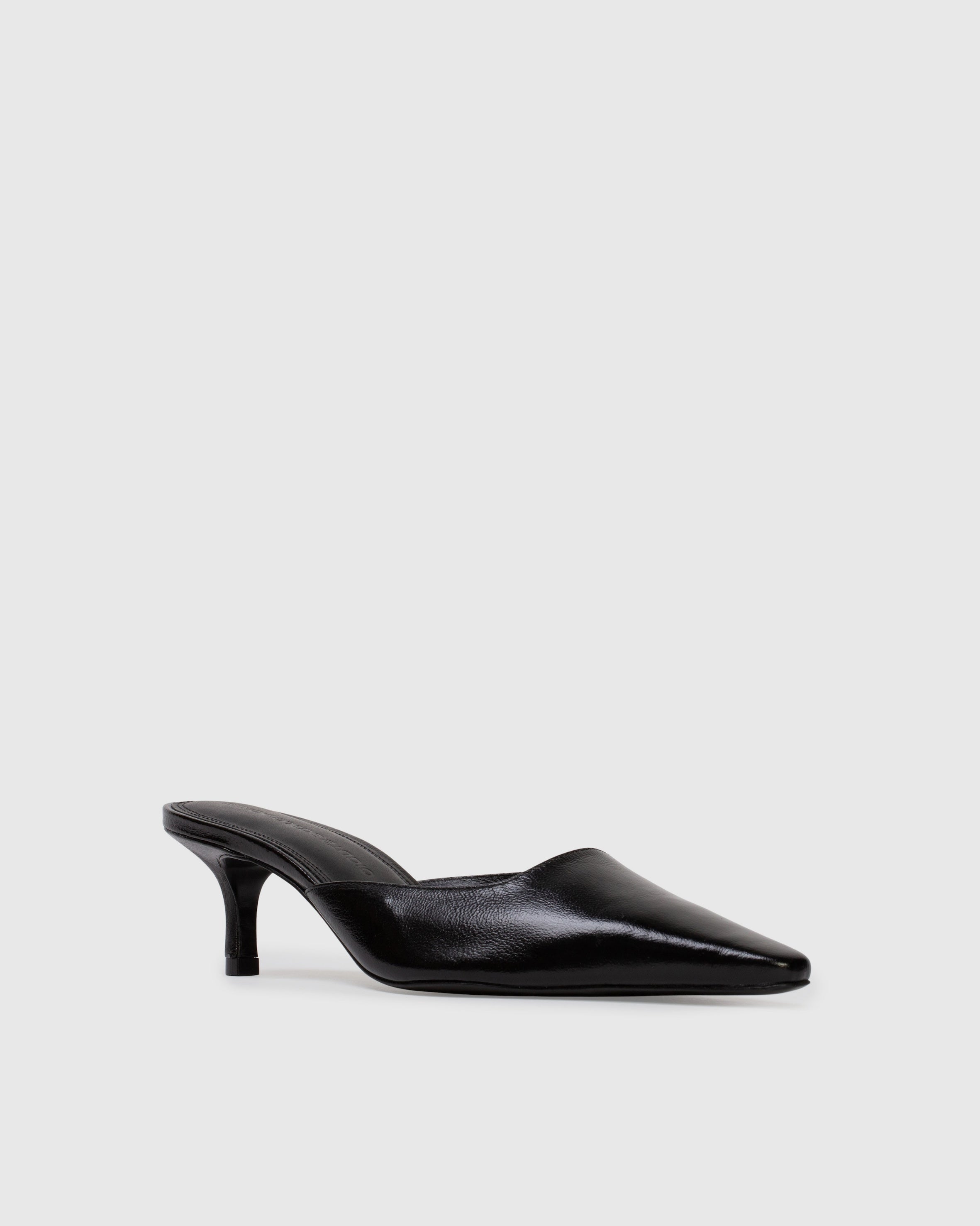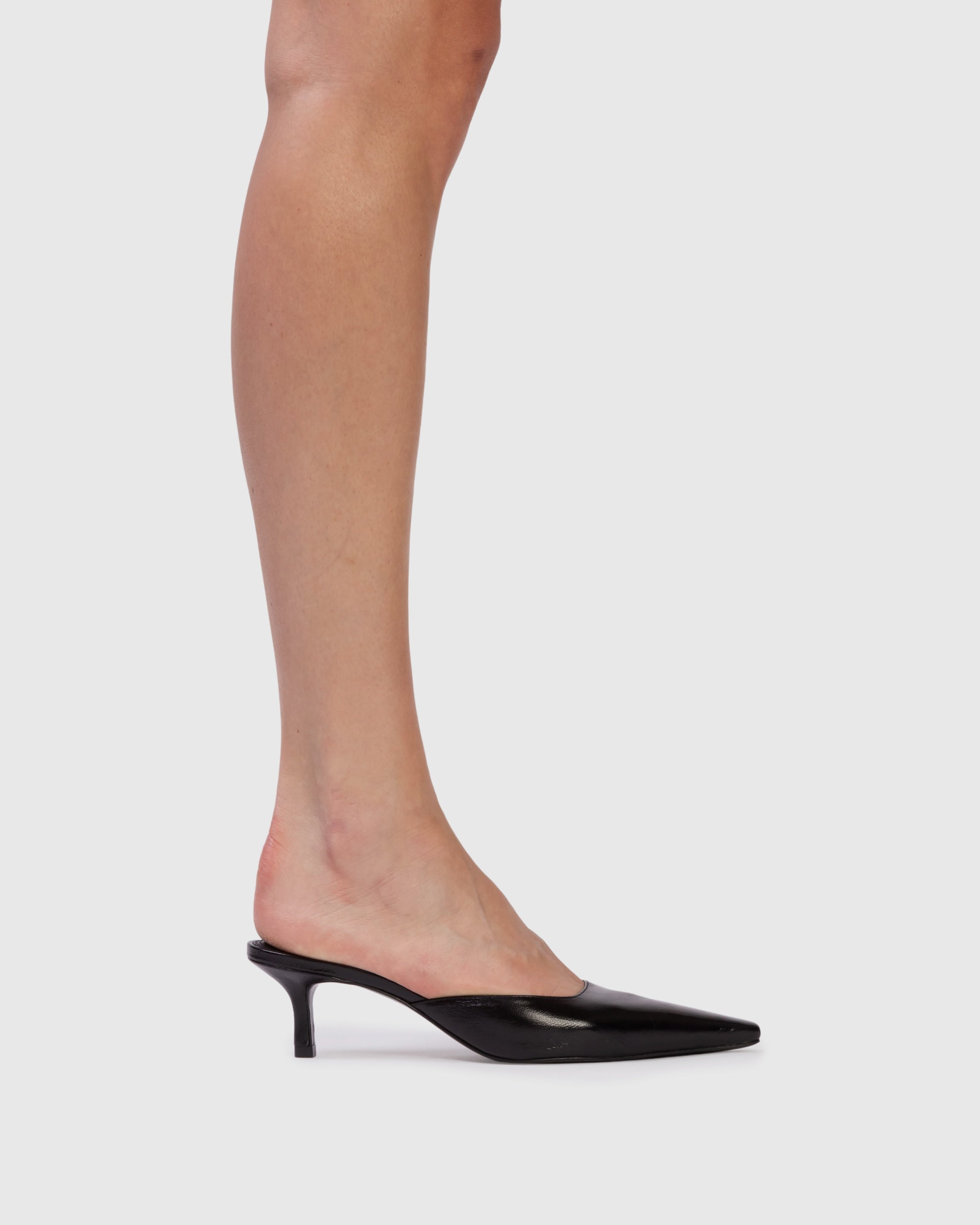 snipped toe slipper mule, set on an angled low kitten heel. made with goat leather.