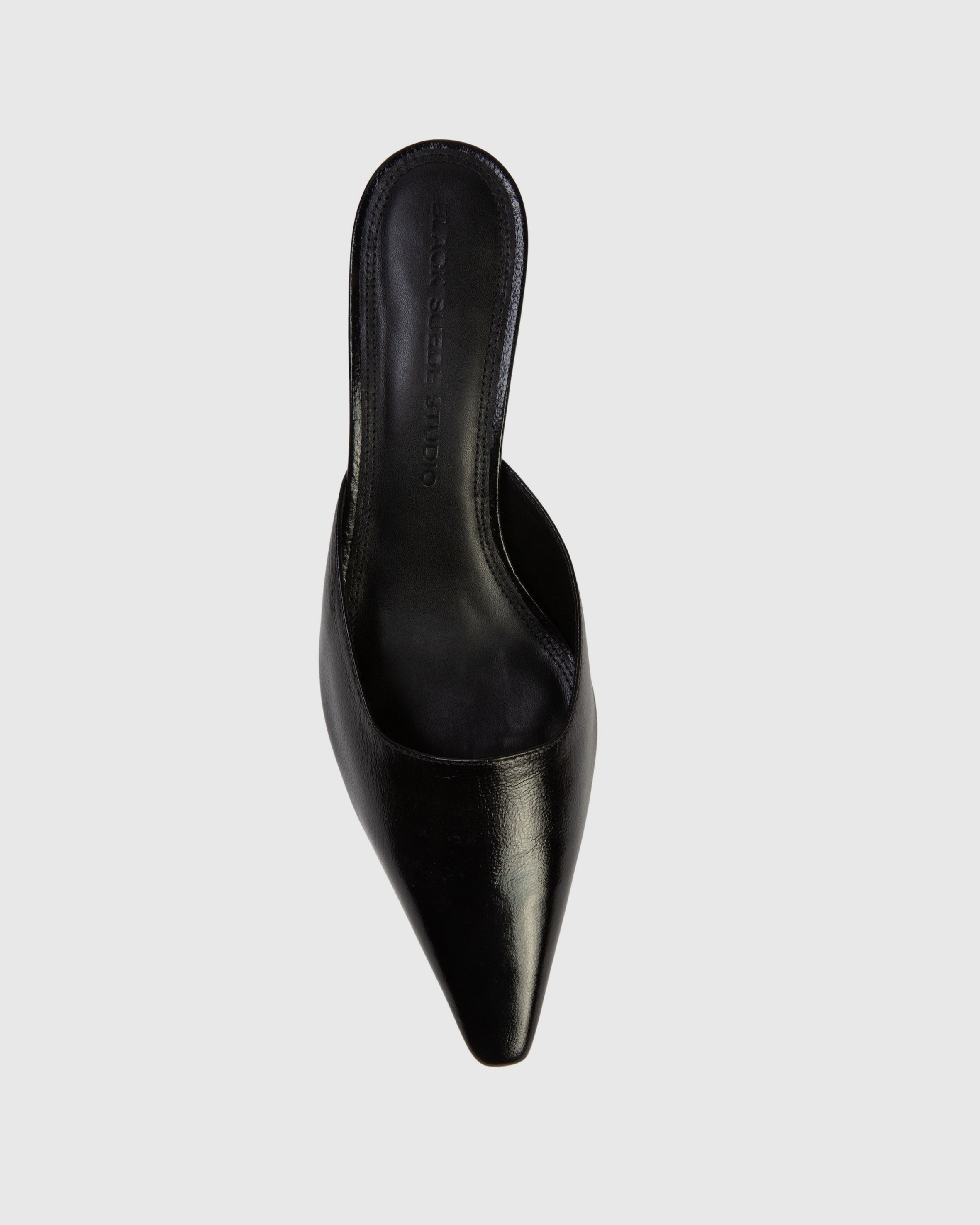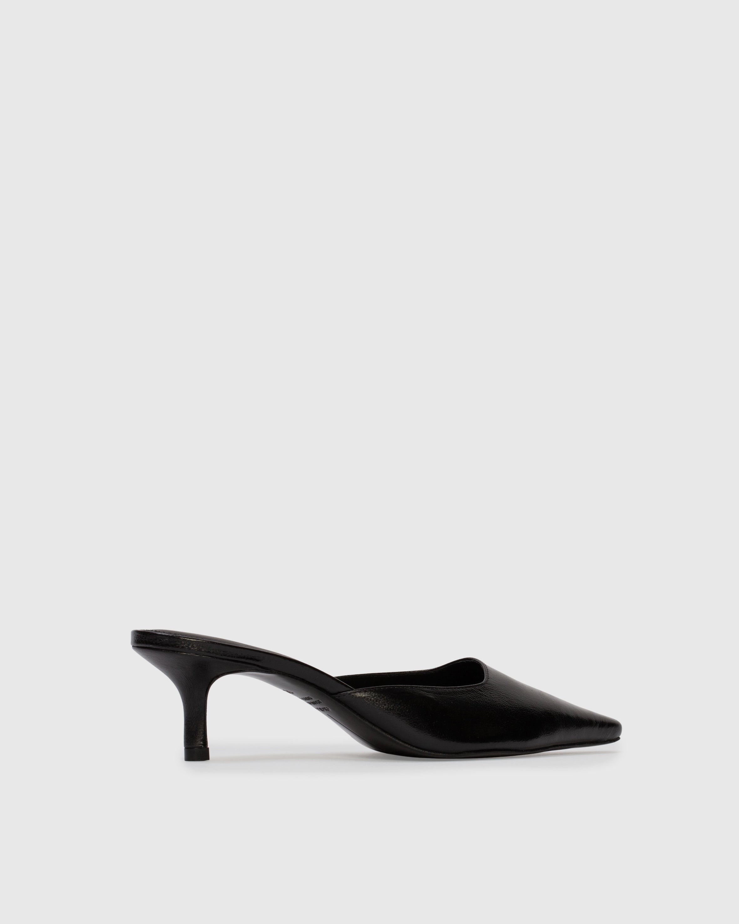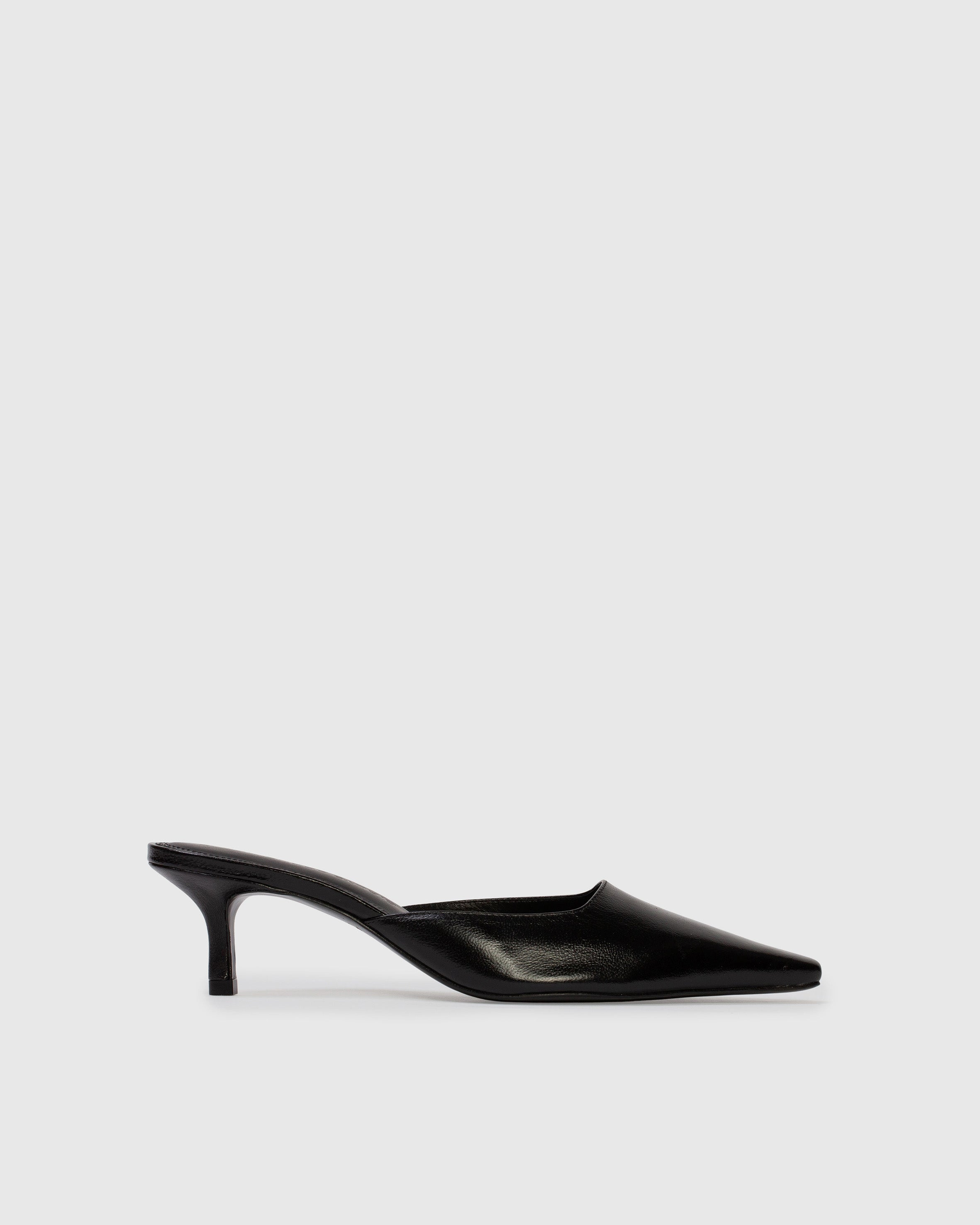 snipped toe slipper mule, set on an angled low kitten heel. made with goat leather.