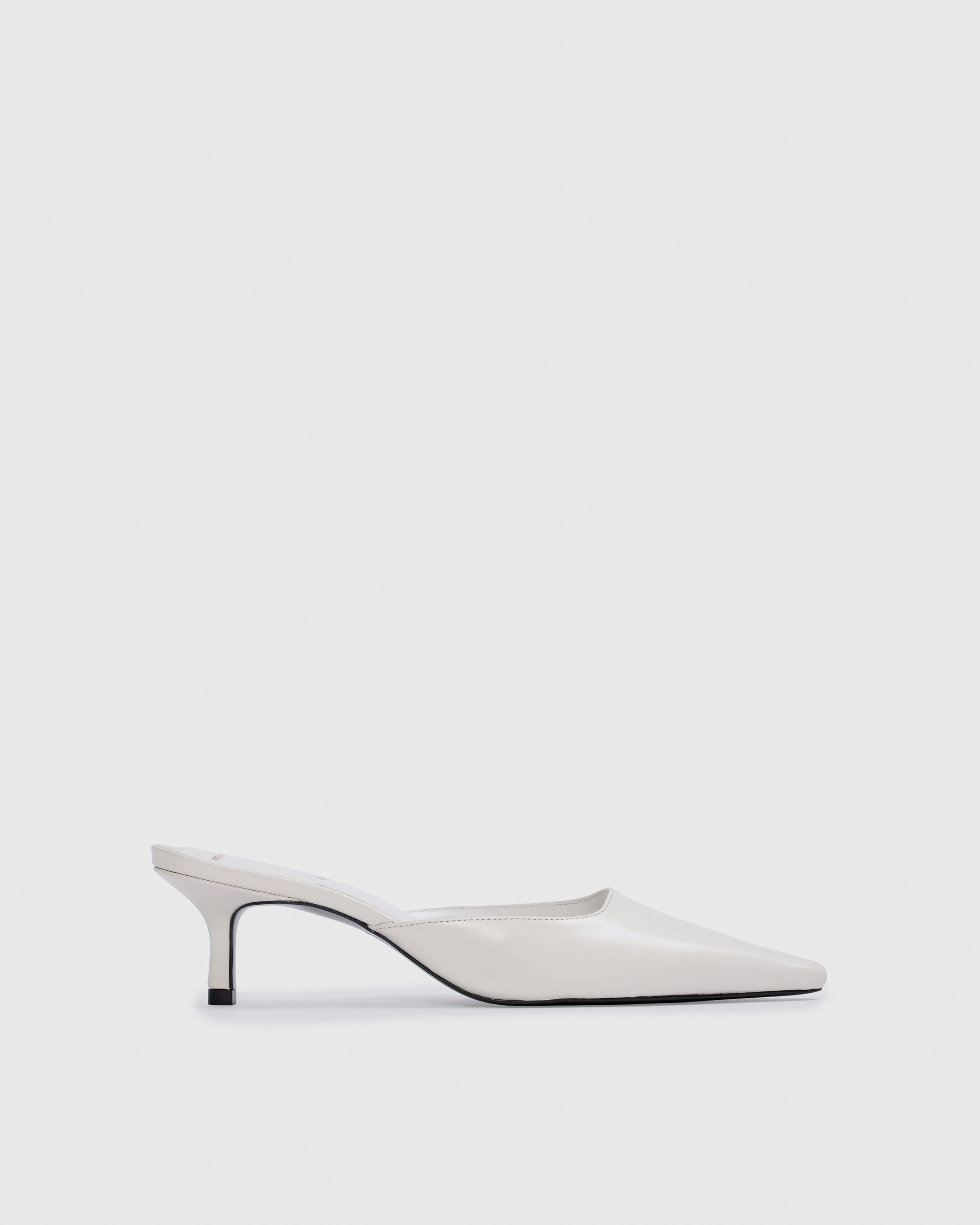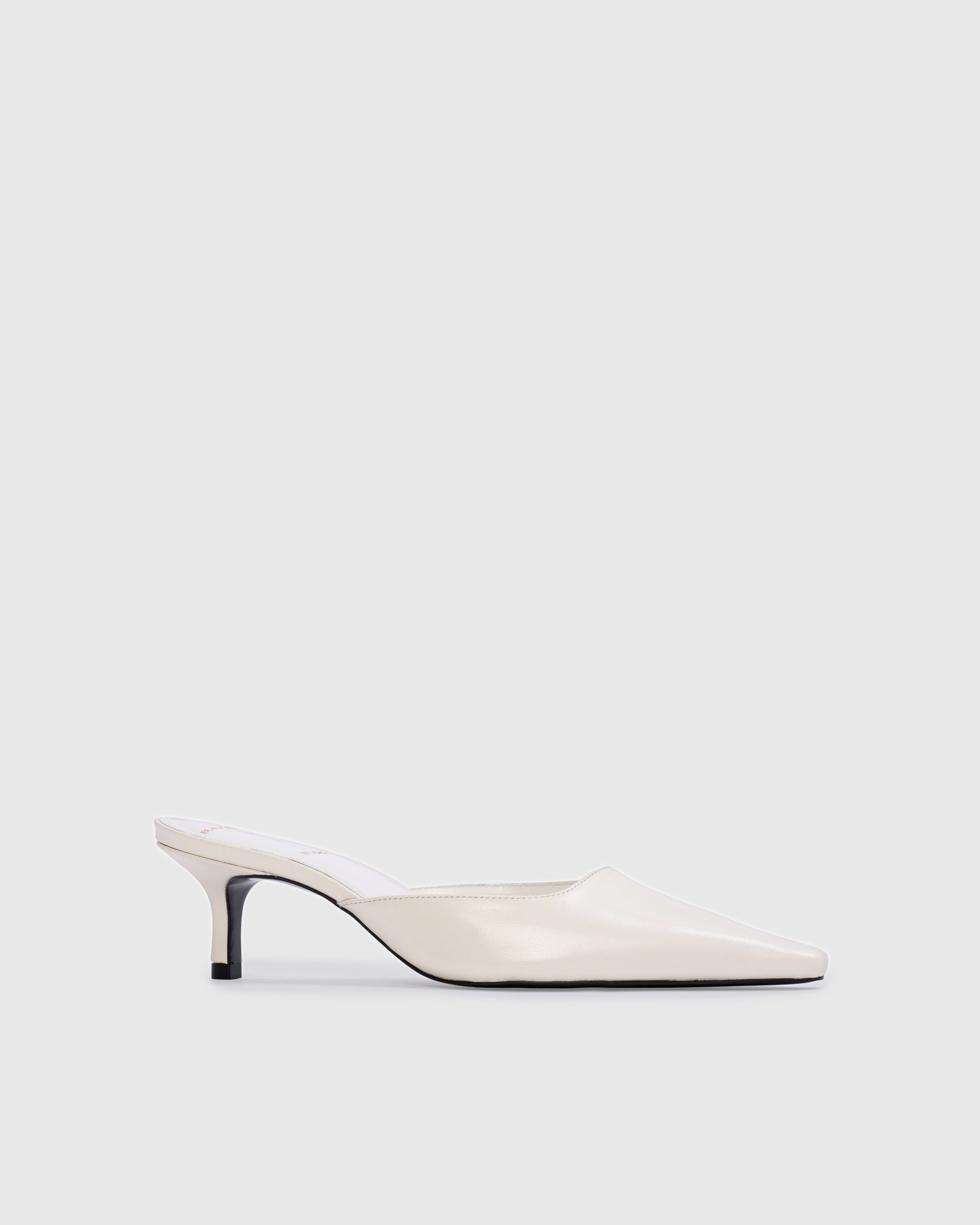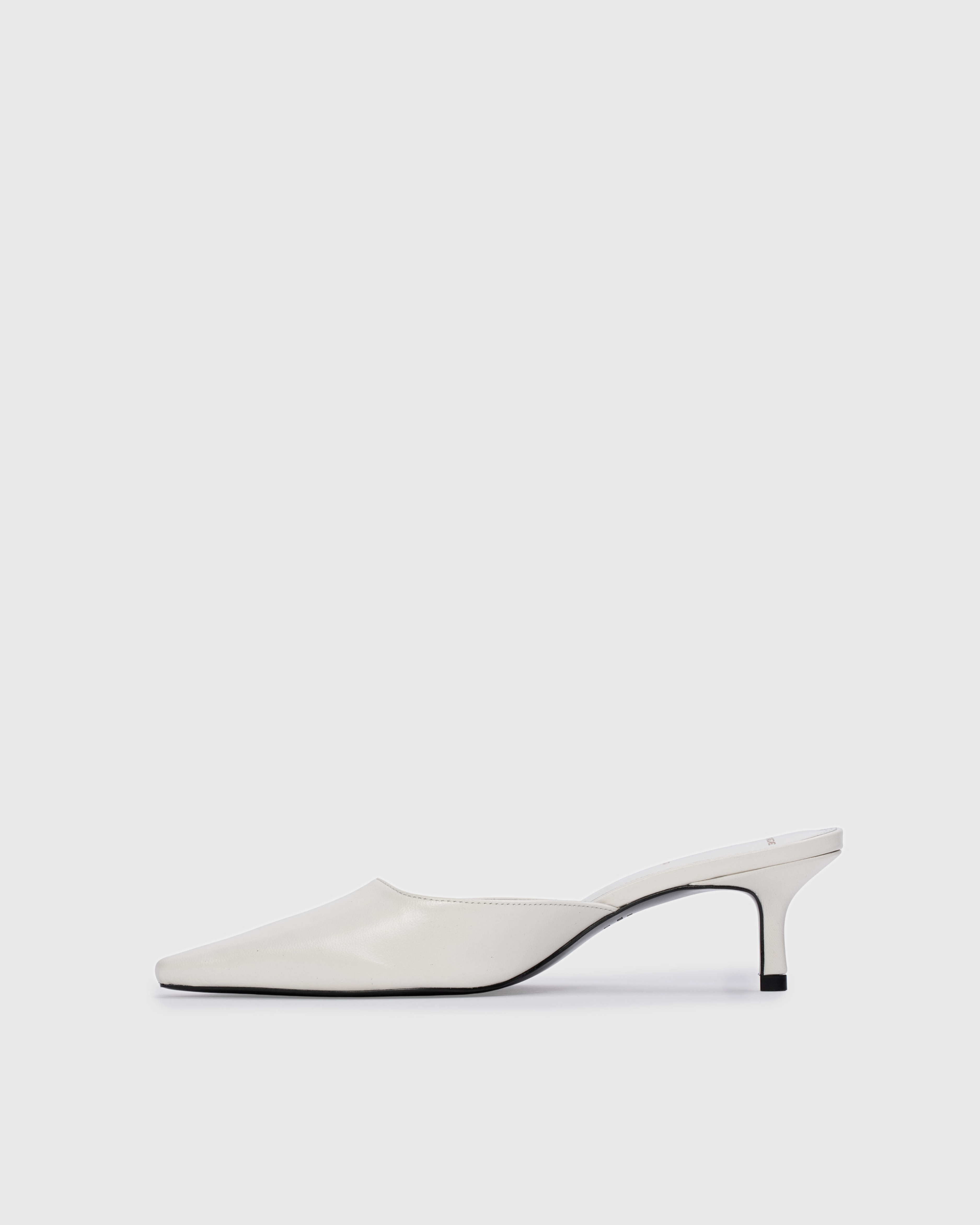snipped toe slipper mule, set on an angled low kitten heel. made with goat leather.