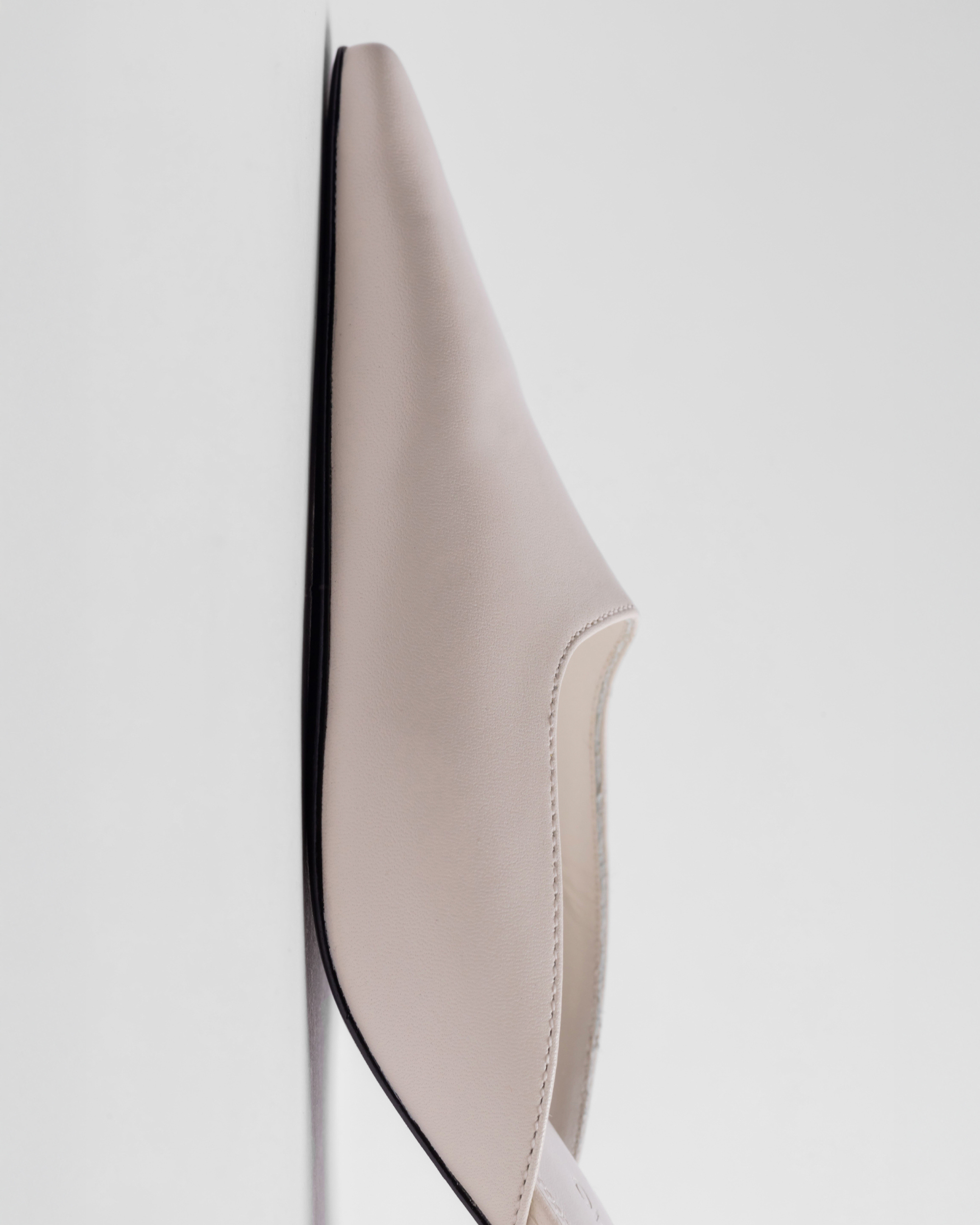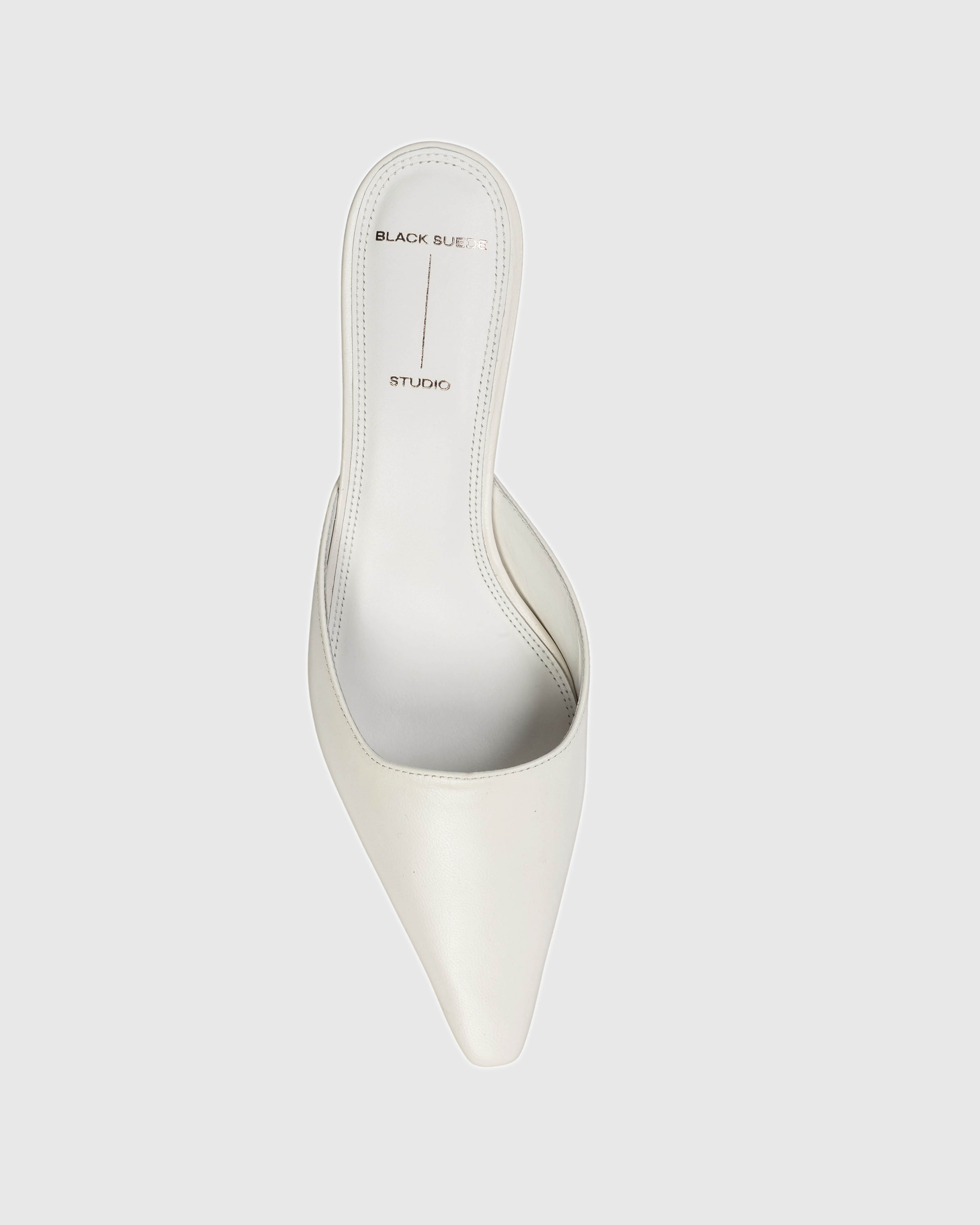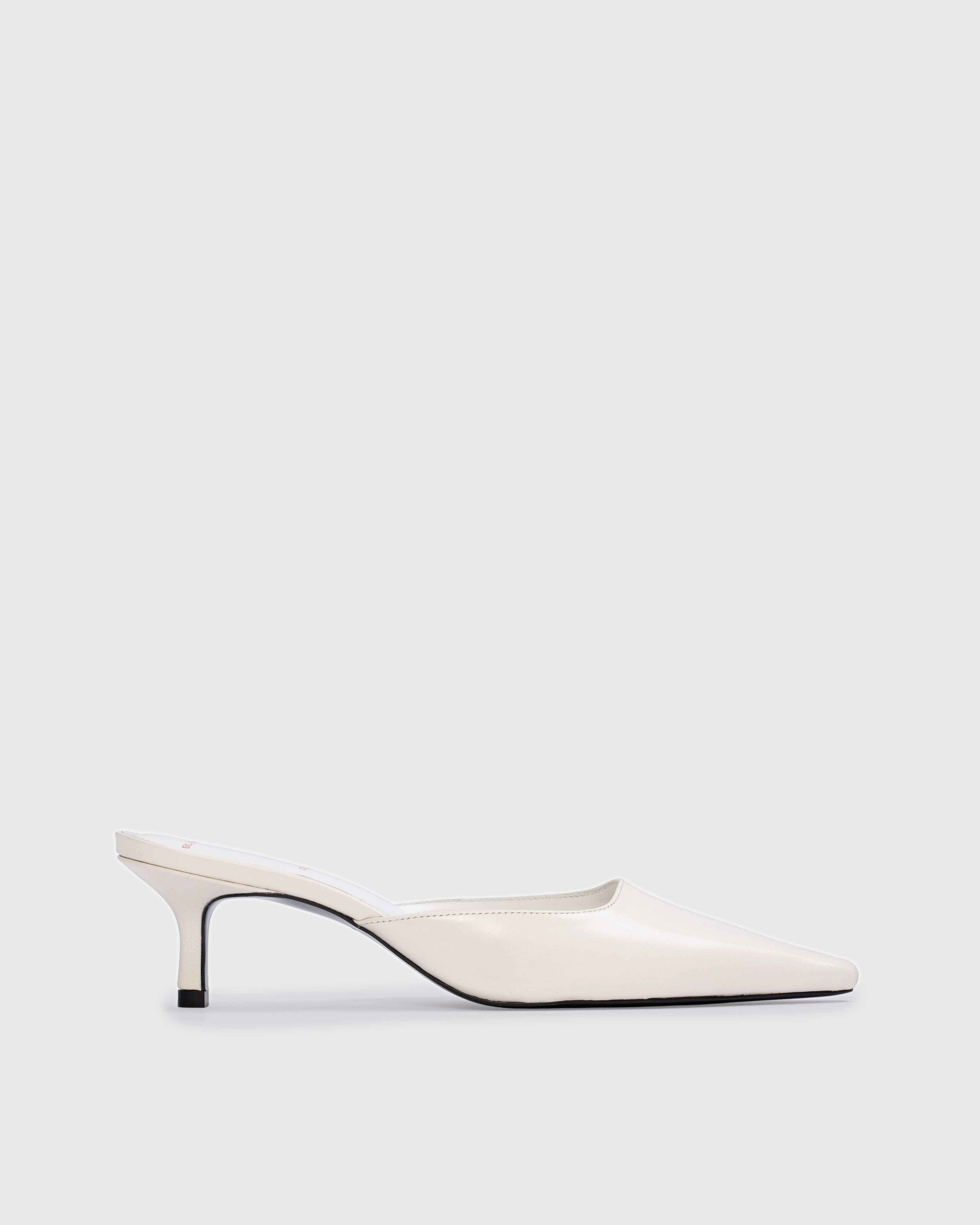snipped toe slipper mule, set on an angled low kitten heel. made with goat leather.