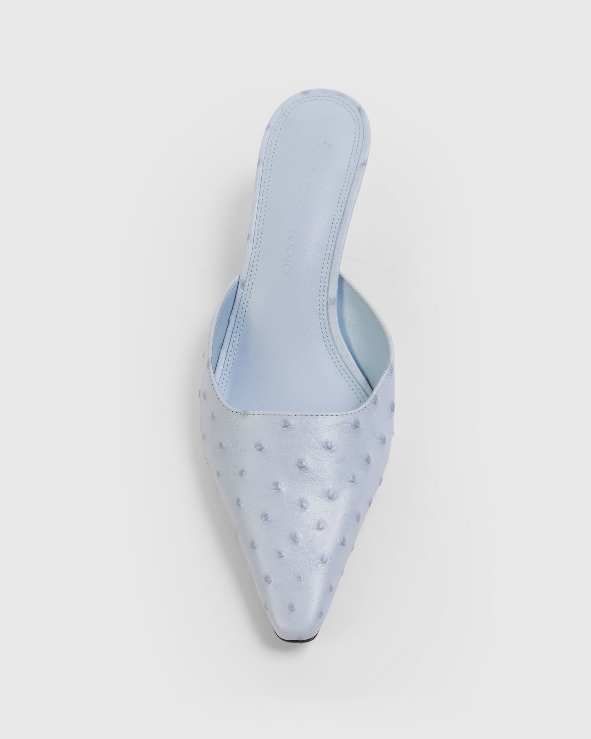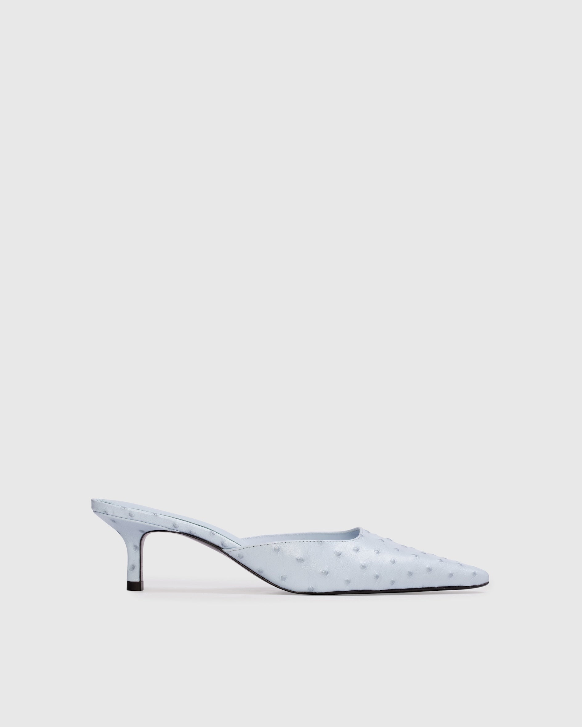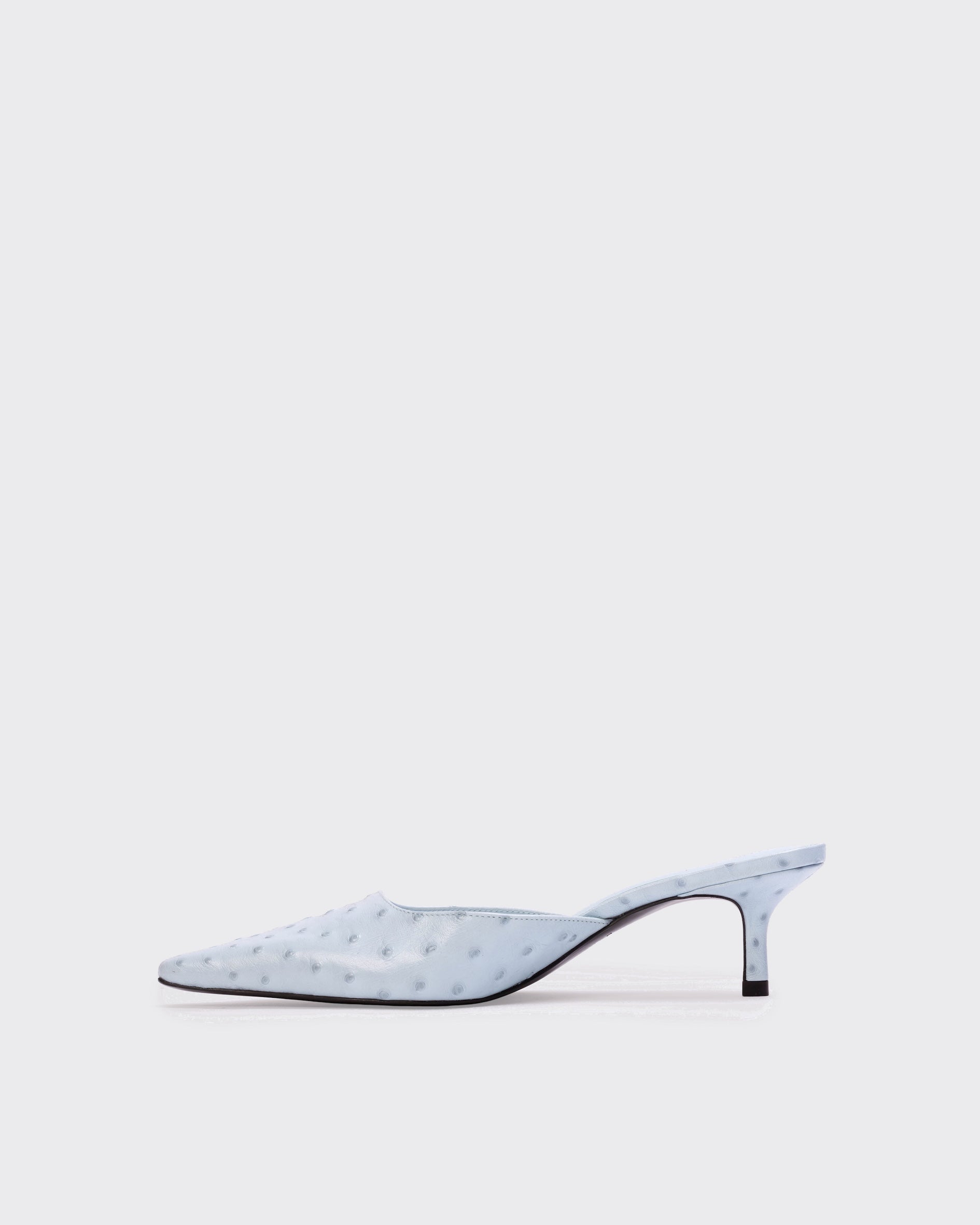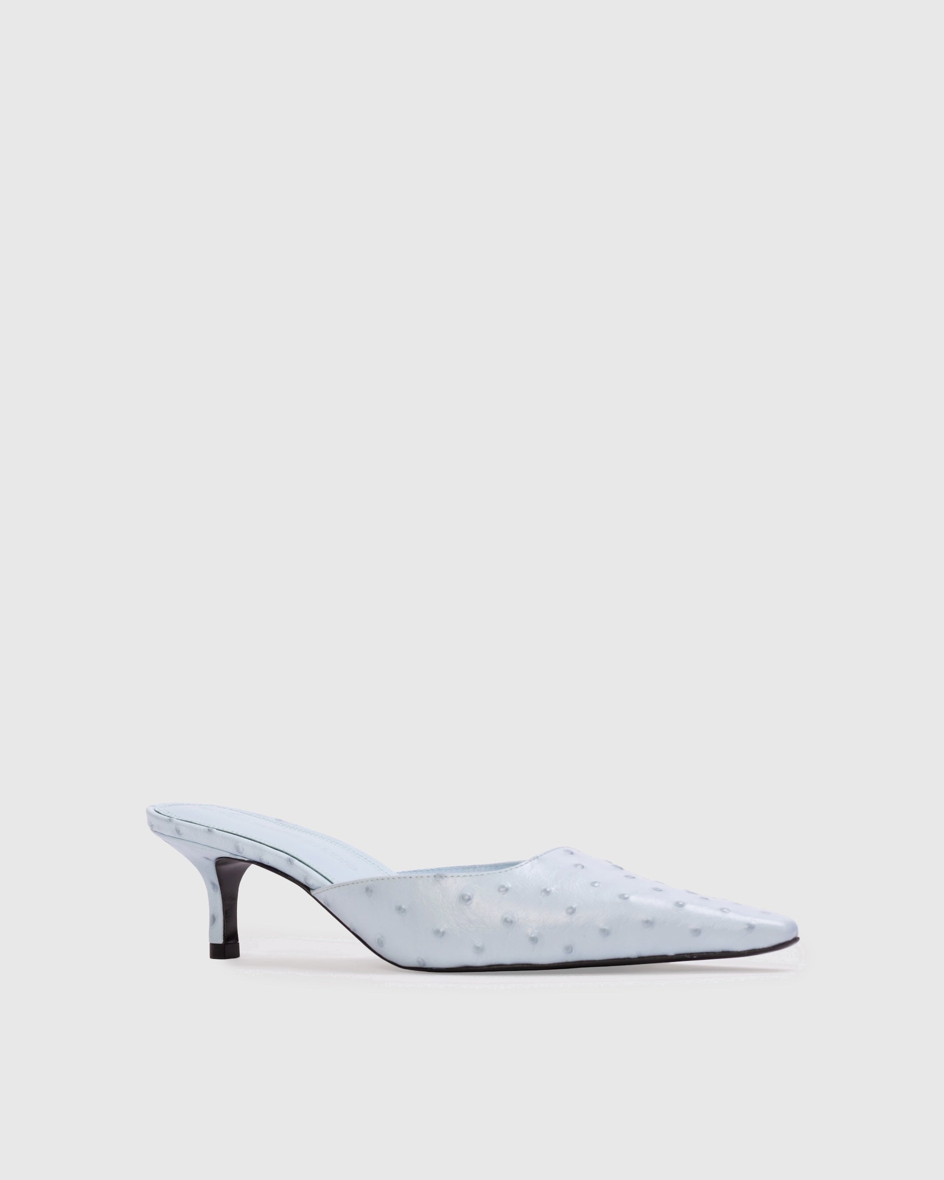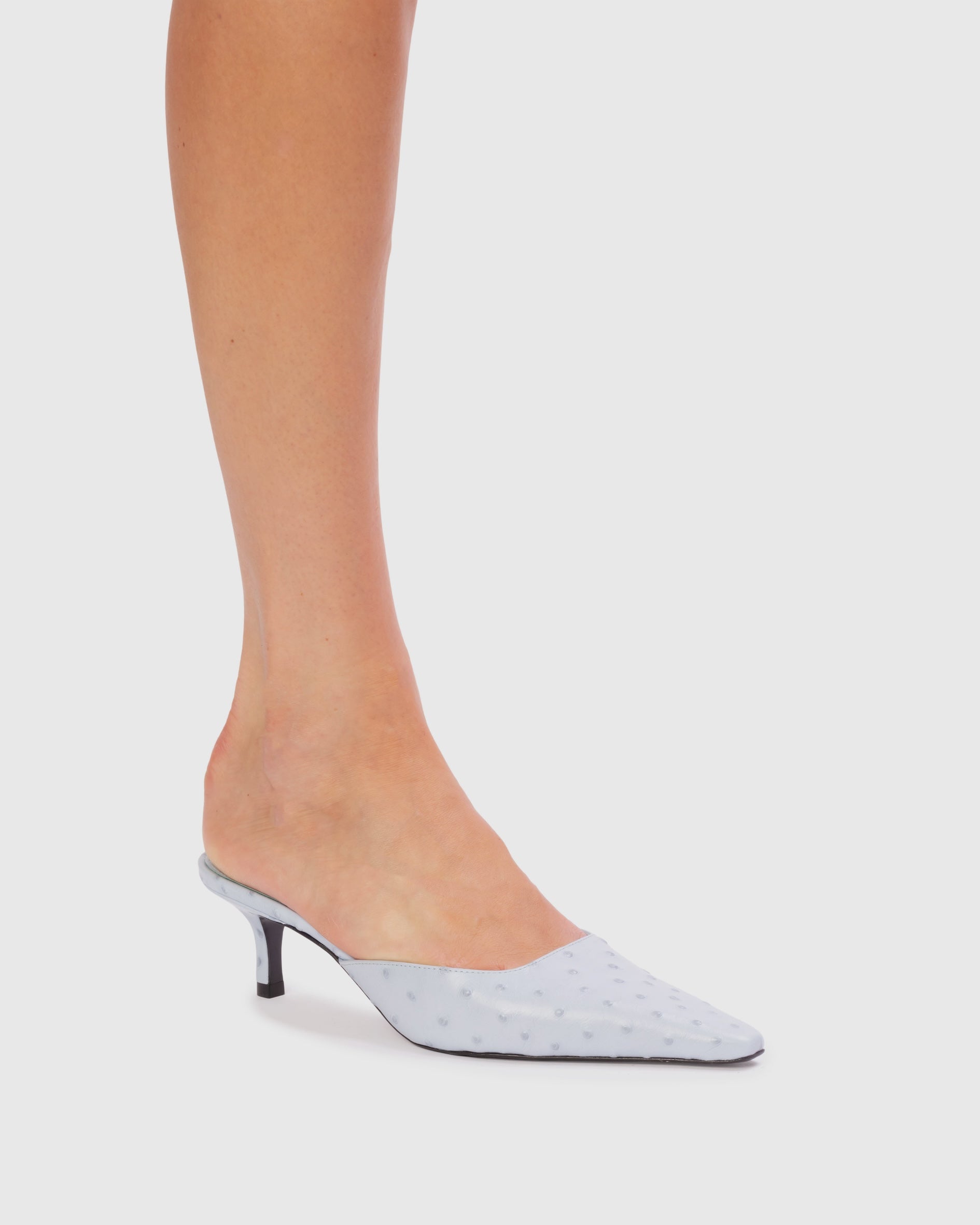 snipped toe slipper mule, set on an angled low kitten heel. made with ostrich print leather.