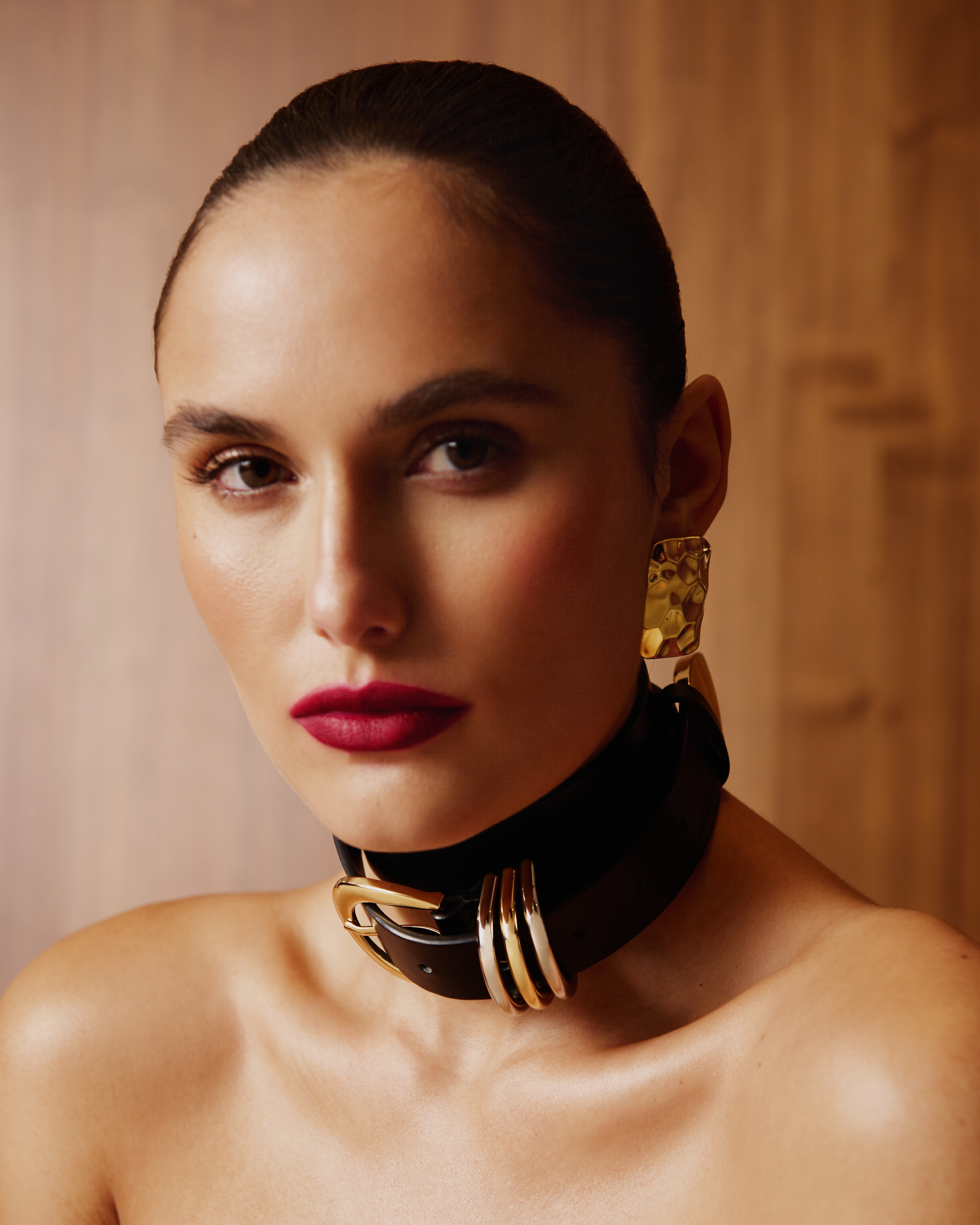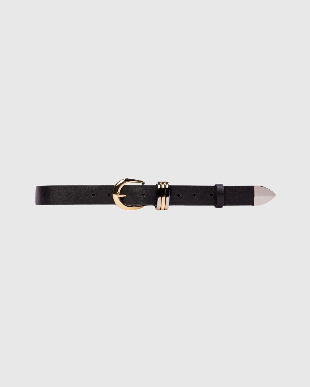 Color + Material: black smooth buffed leather with silver and gold plated brass hardware.
