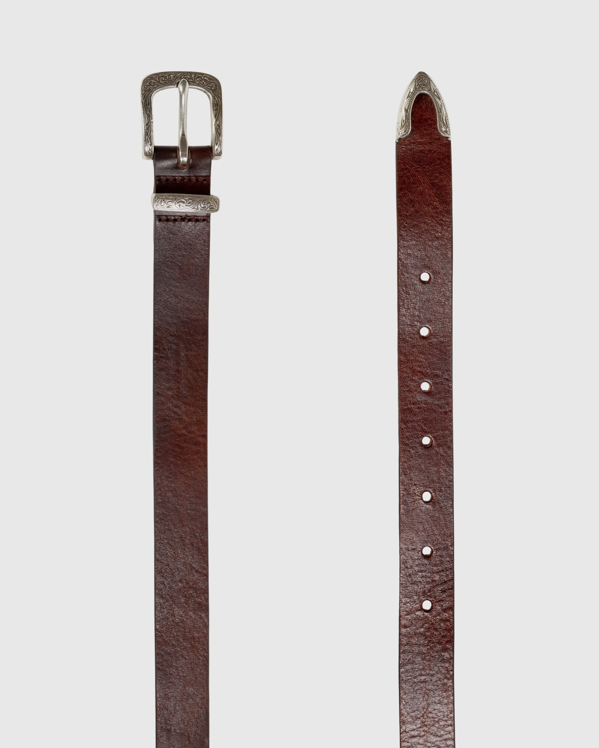 Silver plated brass with an engraved western 3 piece shaped buckle. Secured on an extra long smooth buffed leather strap.