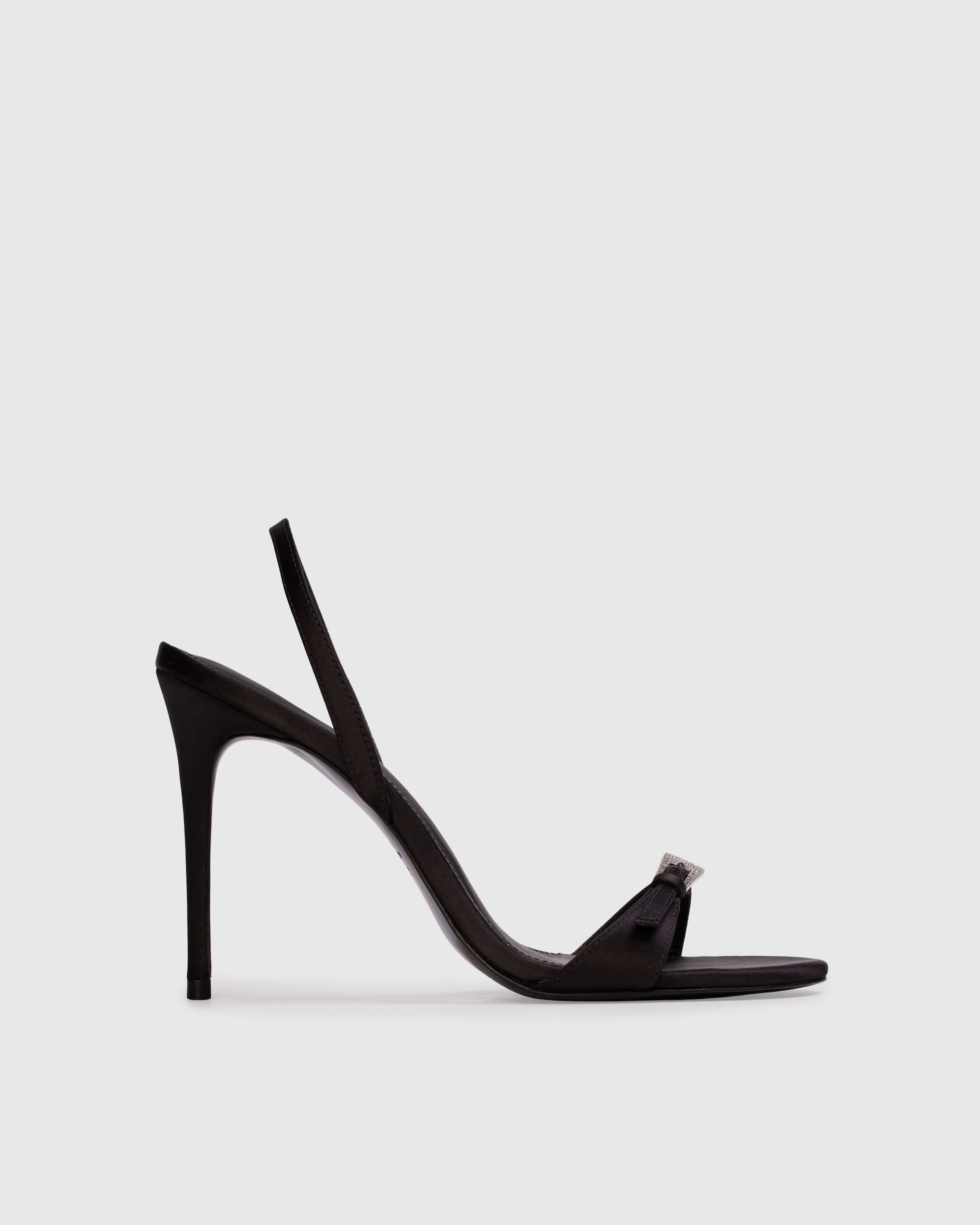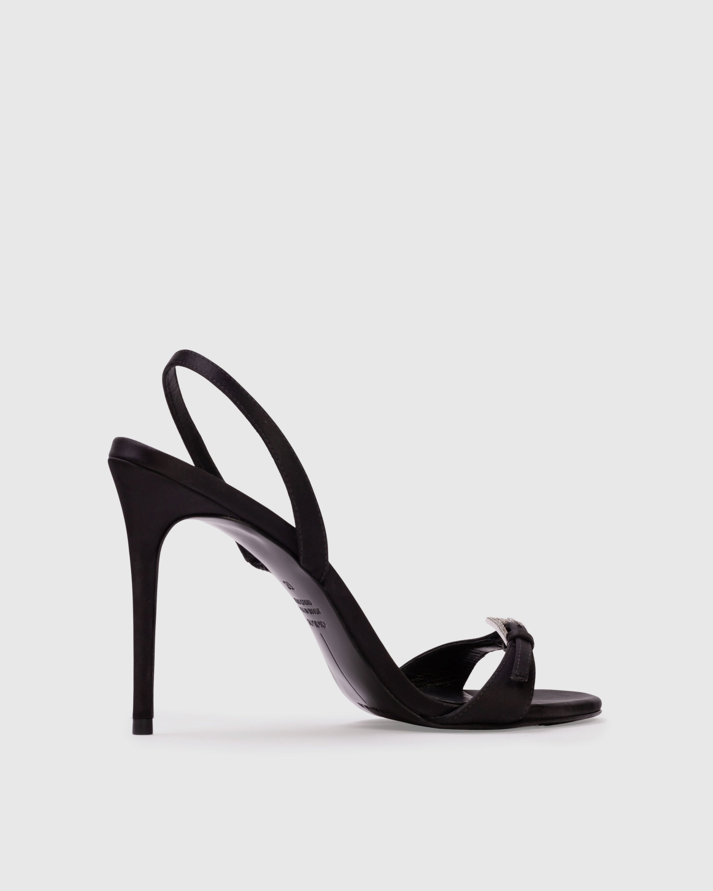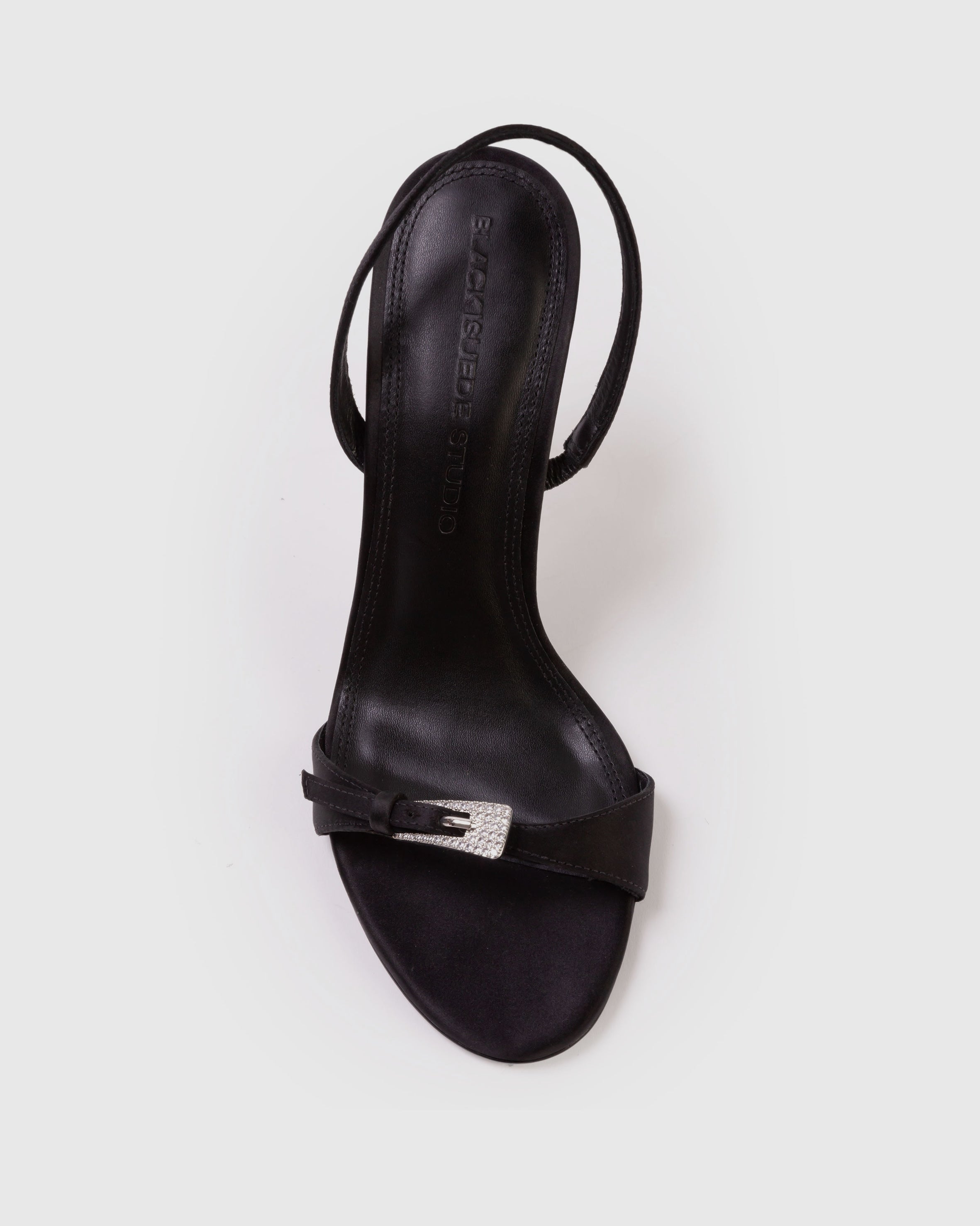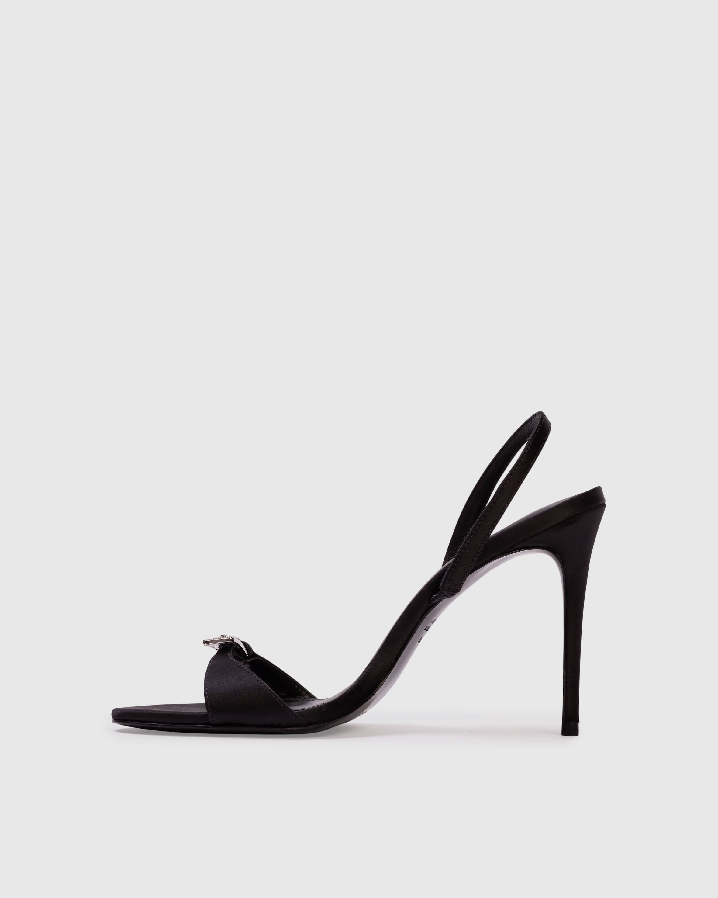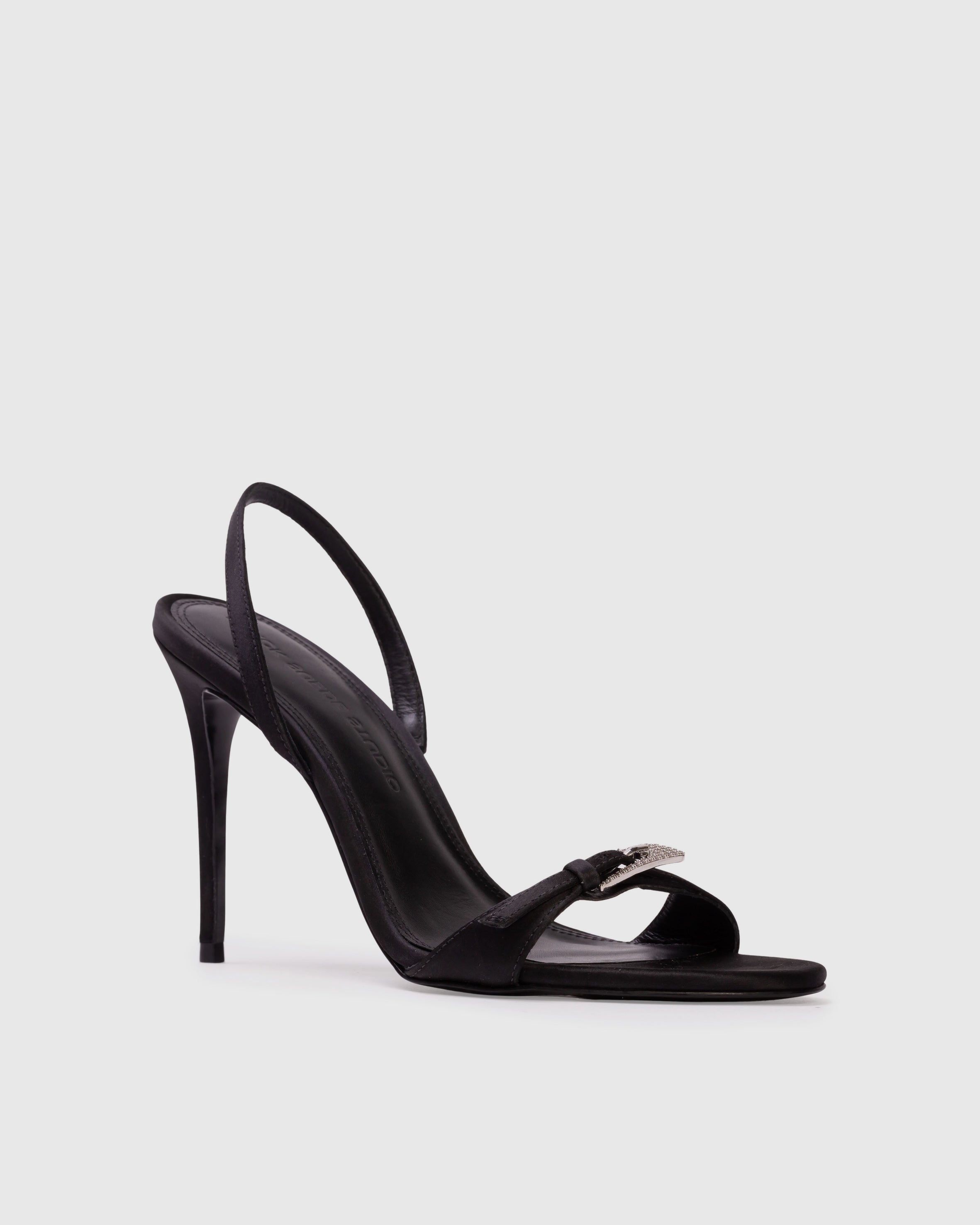 Round toe slingback sandal with embellished buckle detail, set on a pin stiletto heel. Made with satin crepe.