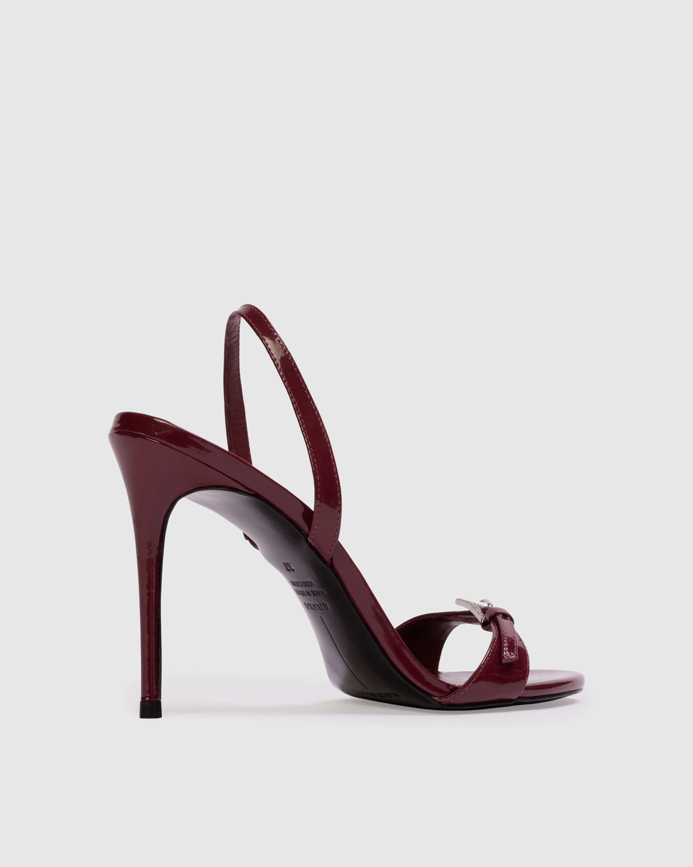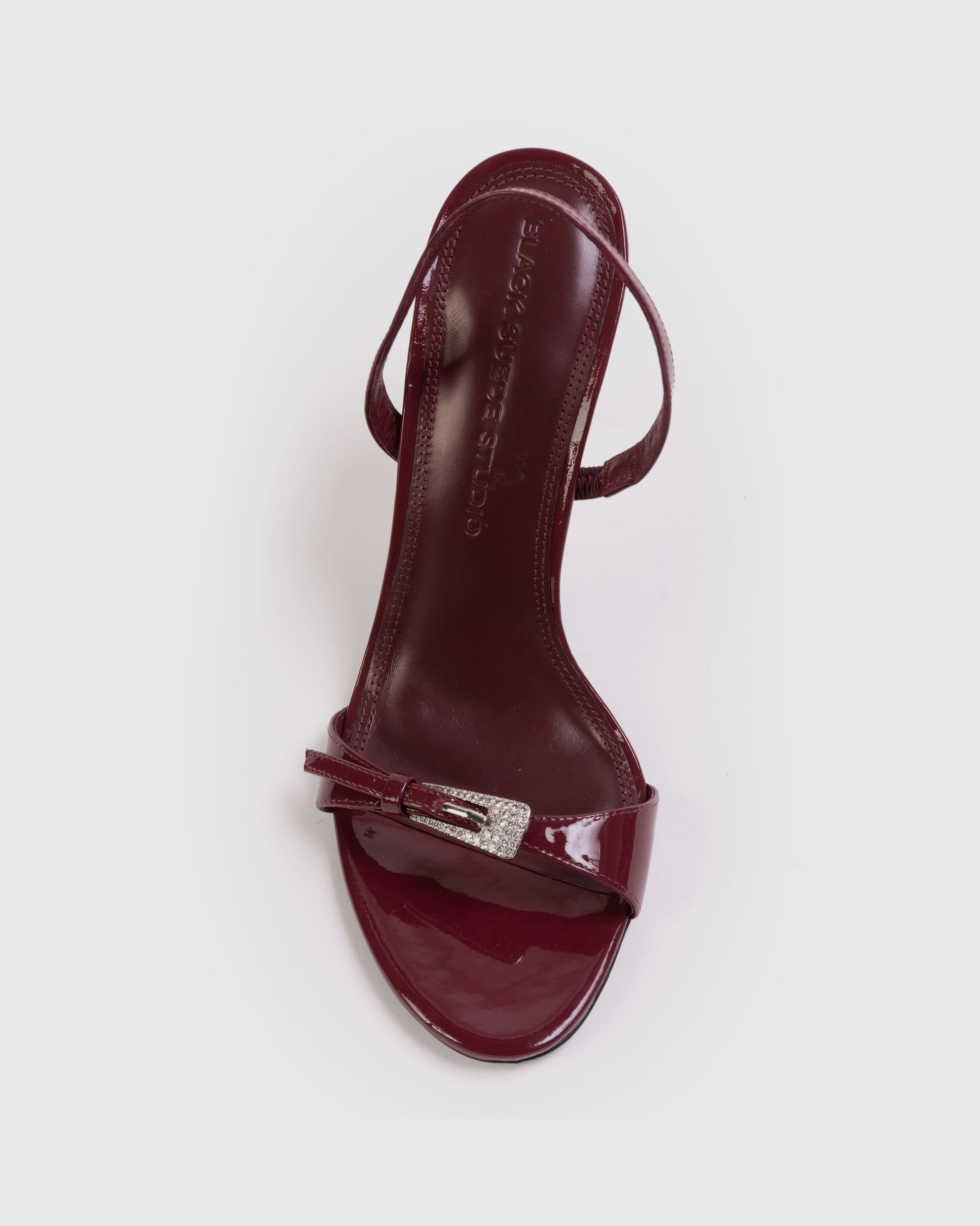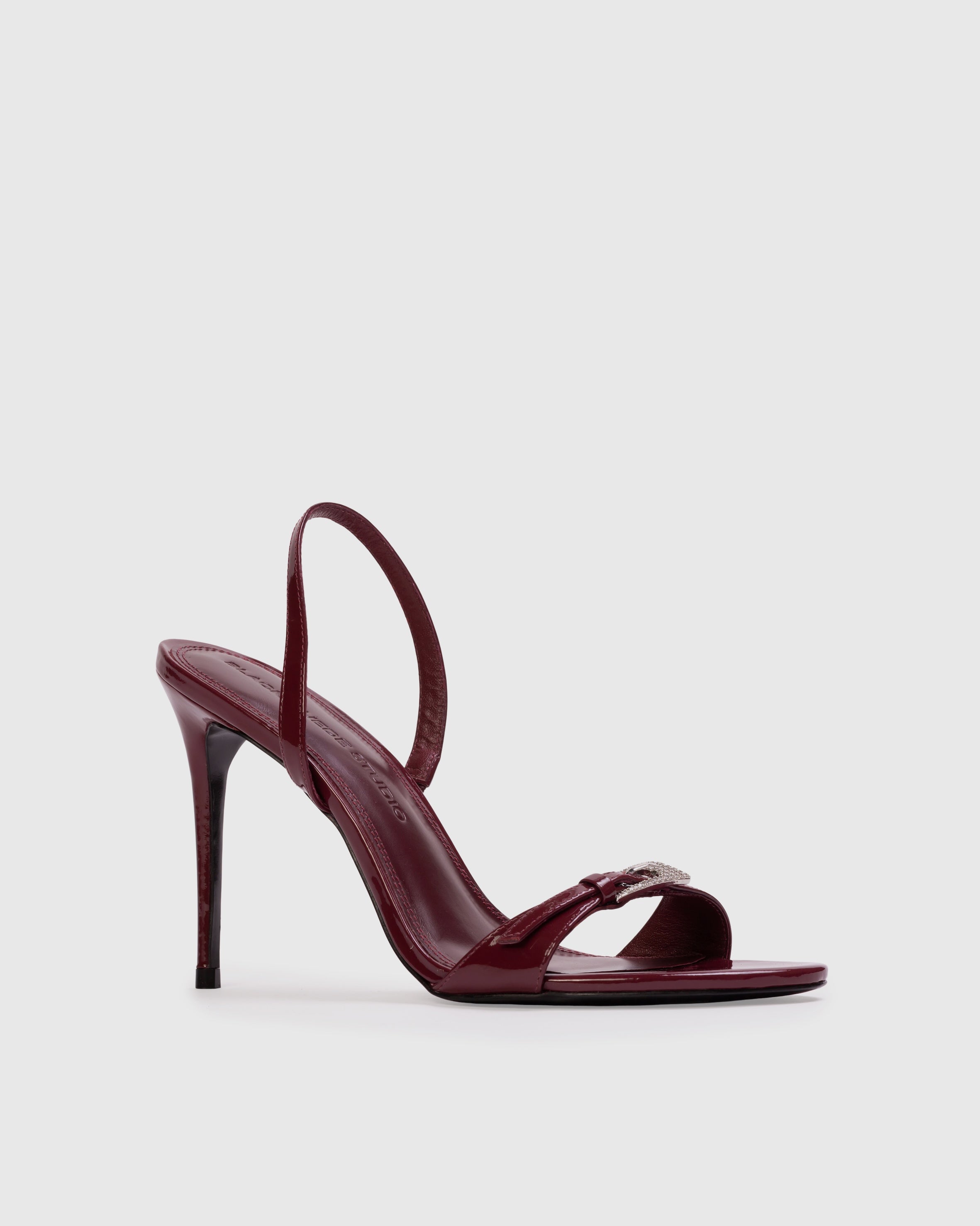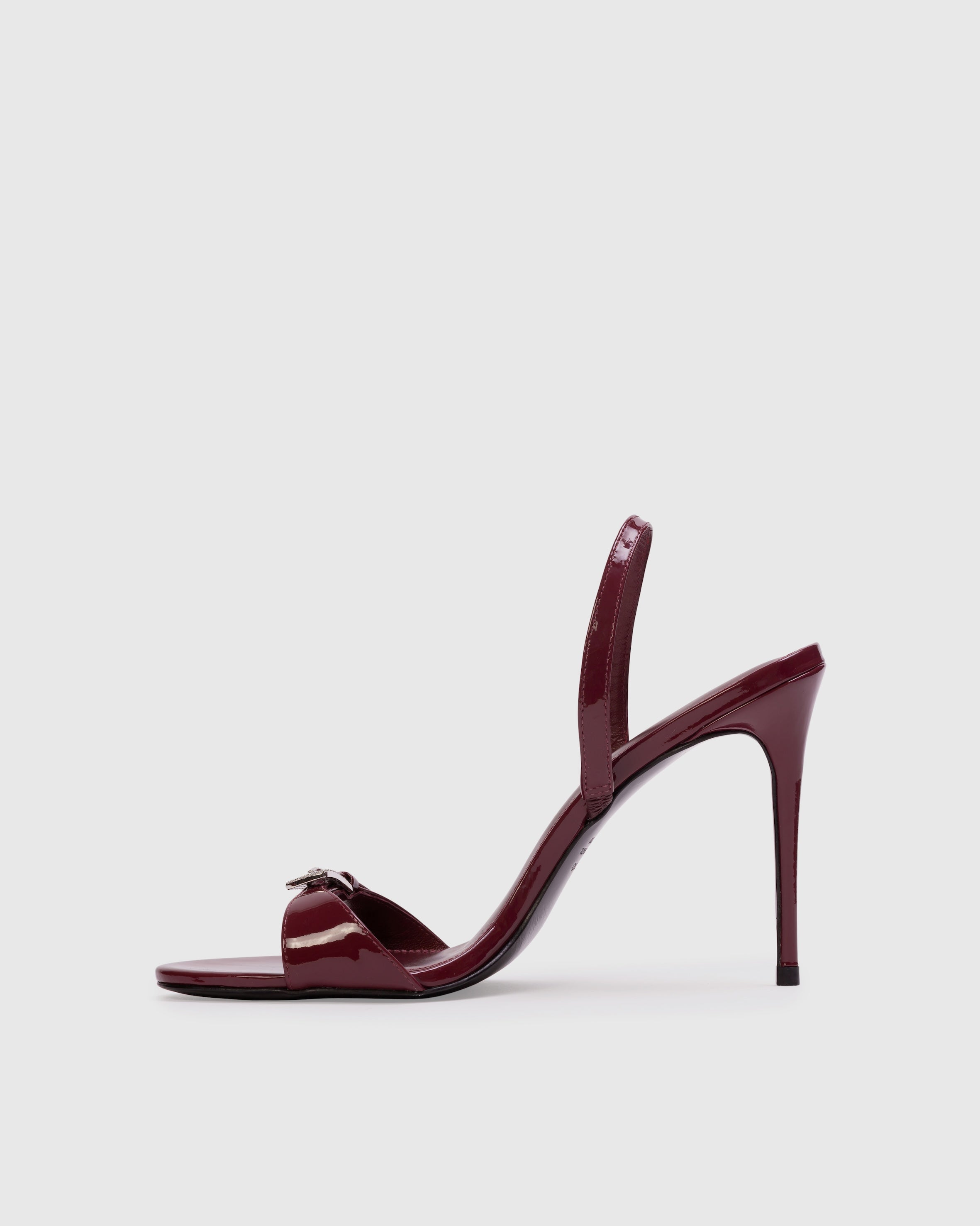 Round toe slingback sandal with embellished buckle detail, set on a pin stiletto heel. Made with smooth patent leather.