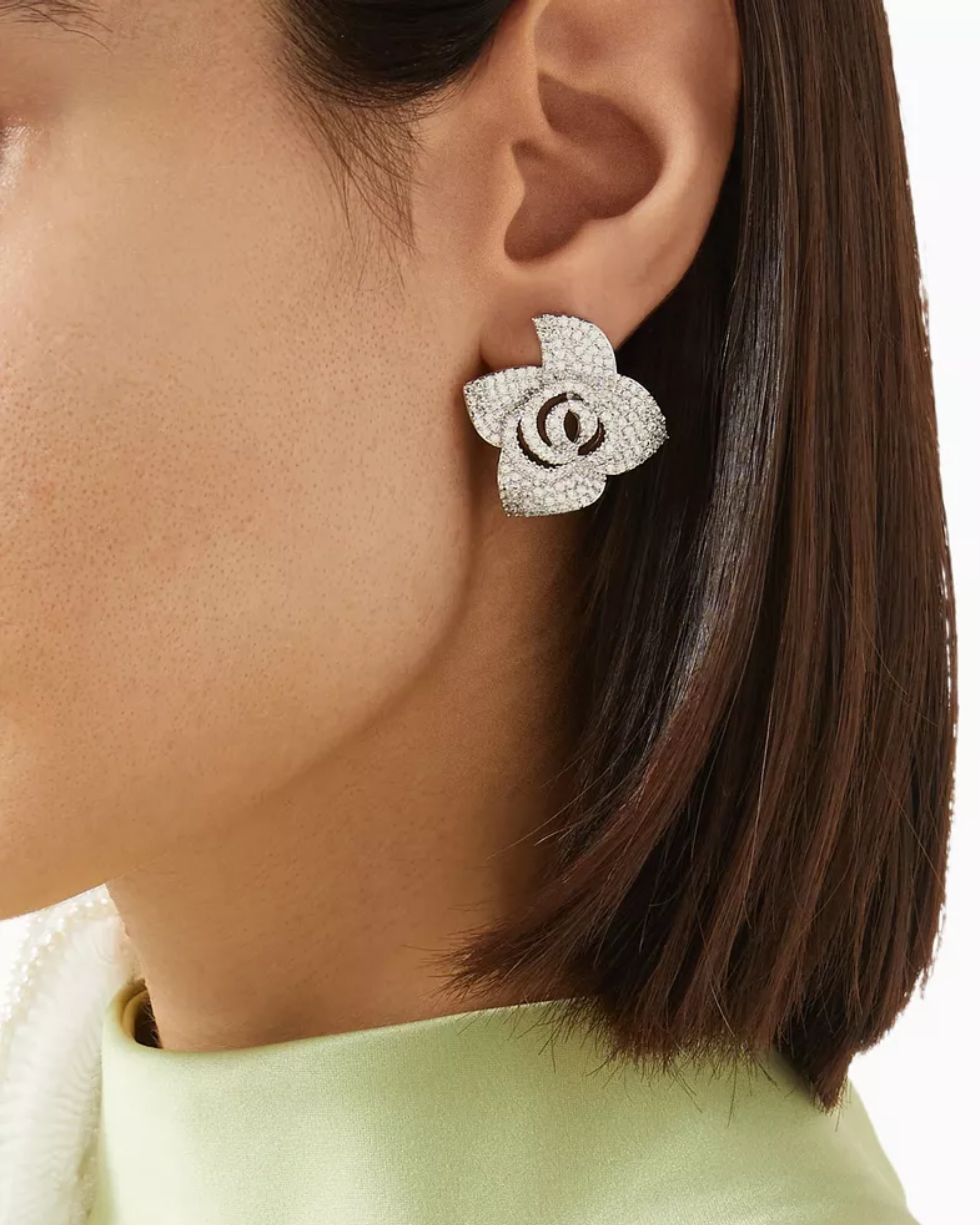 Set of rose shaped earrings with crystal stones. Made with premium rhodium plated brass.