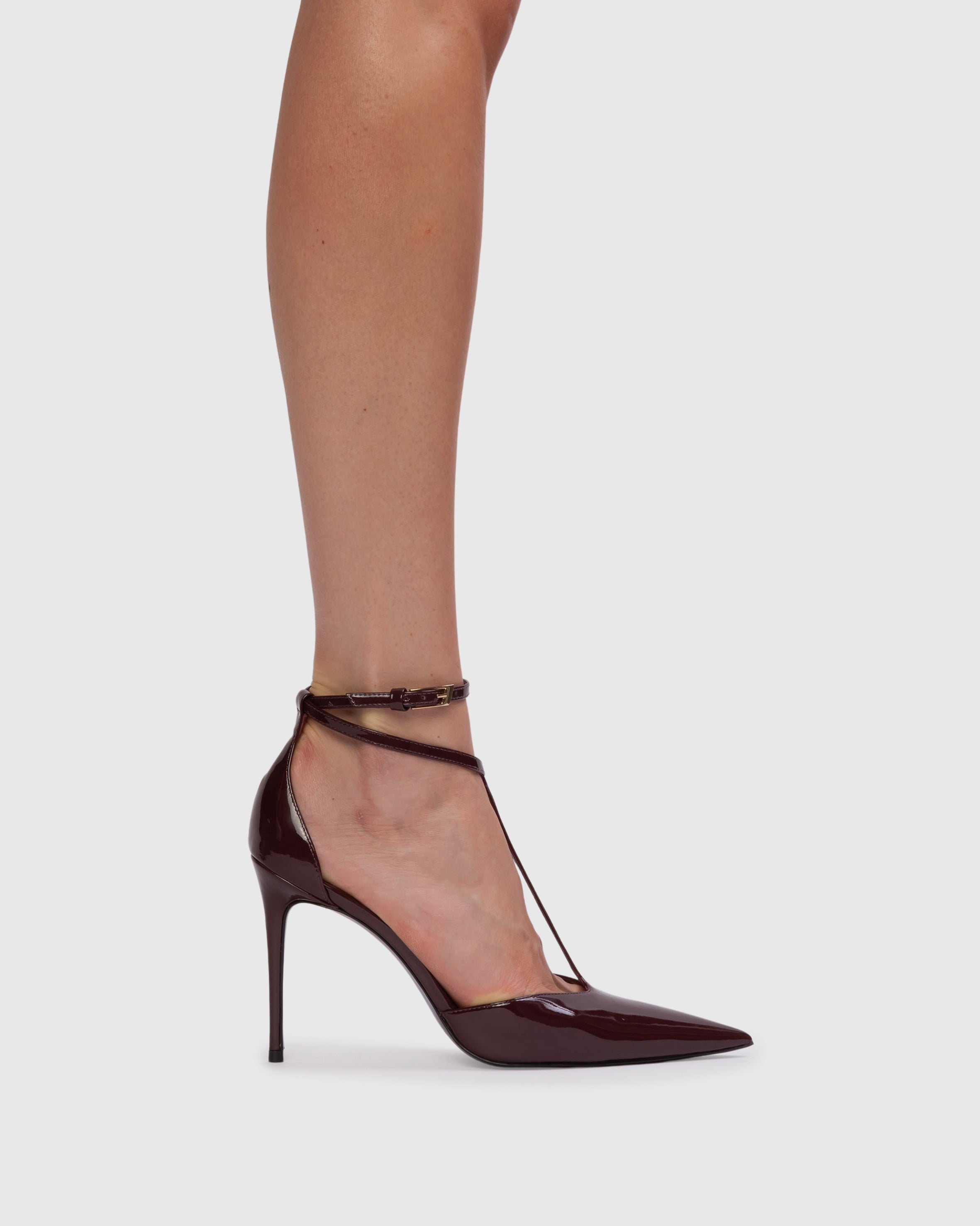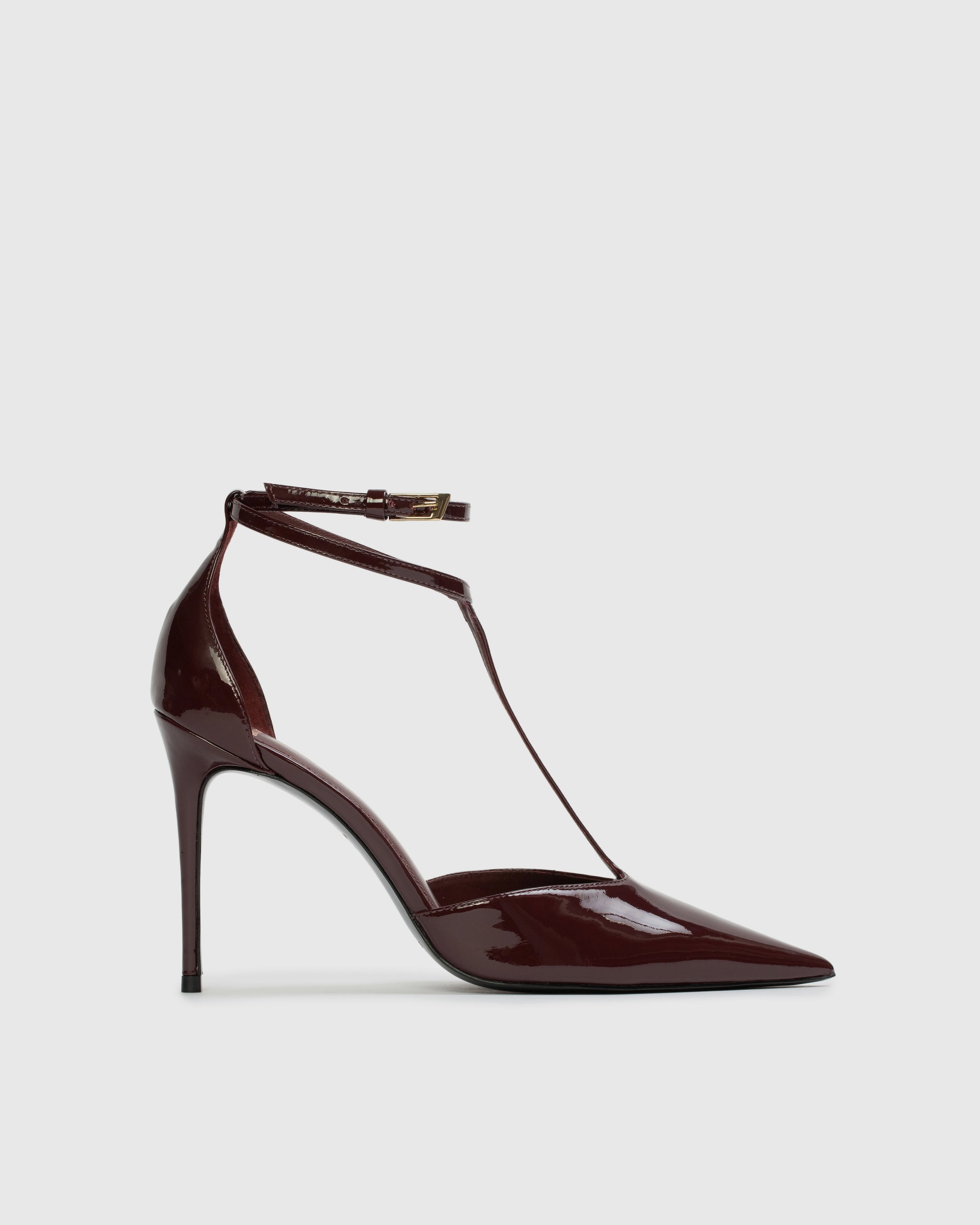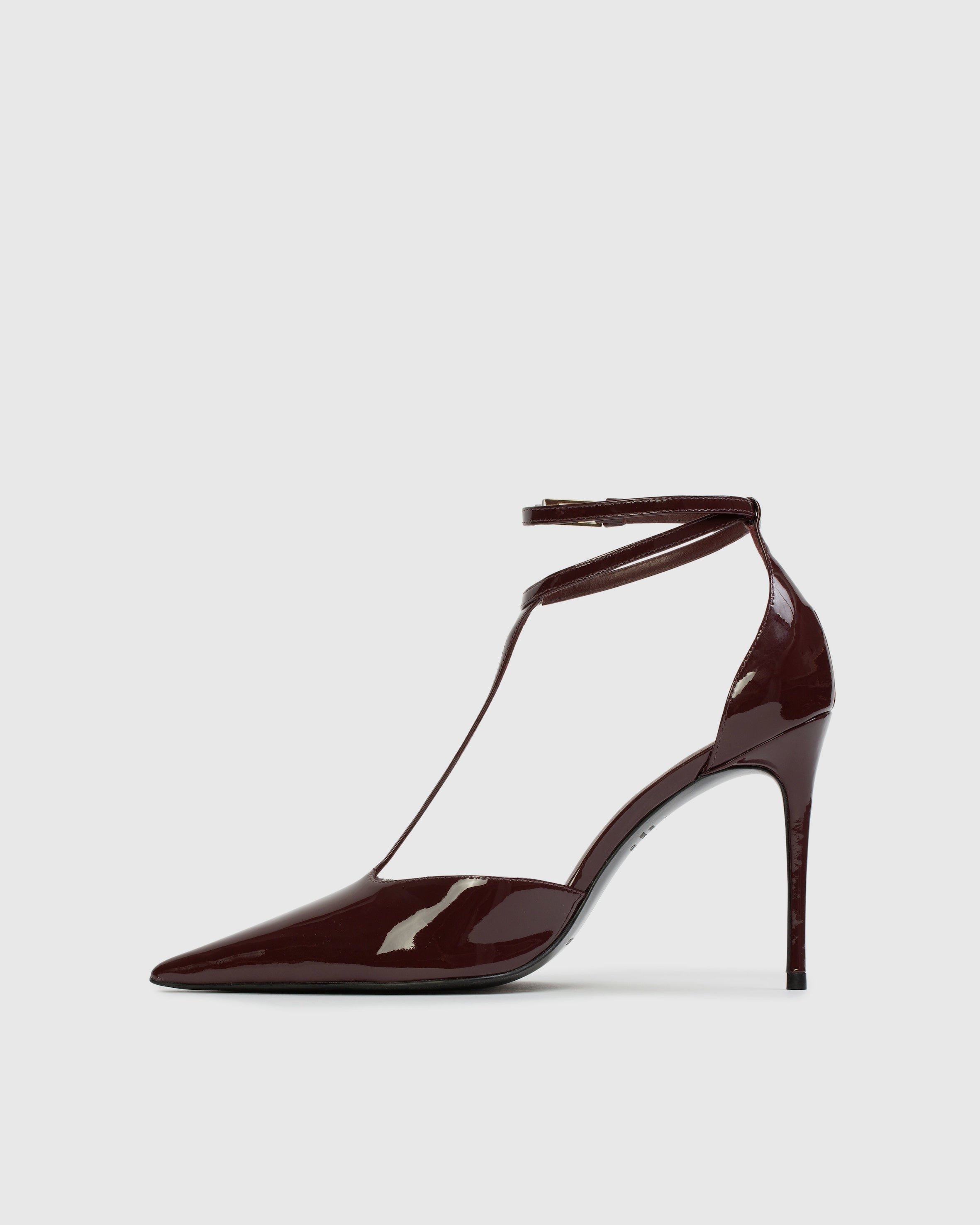 pointy toe t-strap pump, set on a pin stiletto heel. made with smooth patent leather.