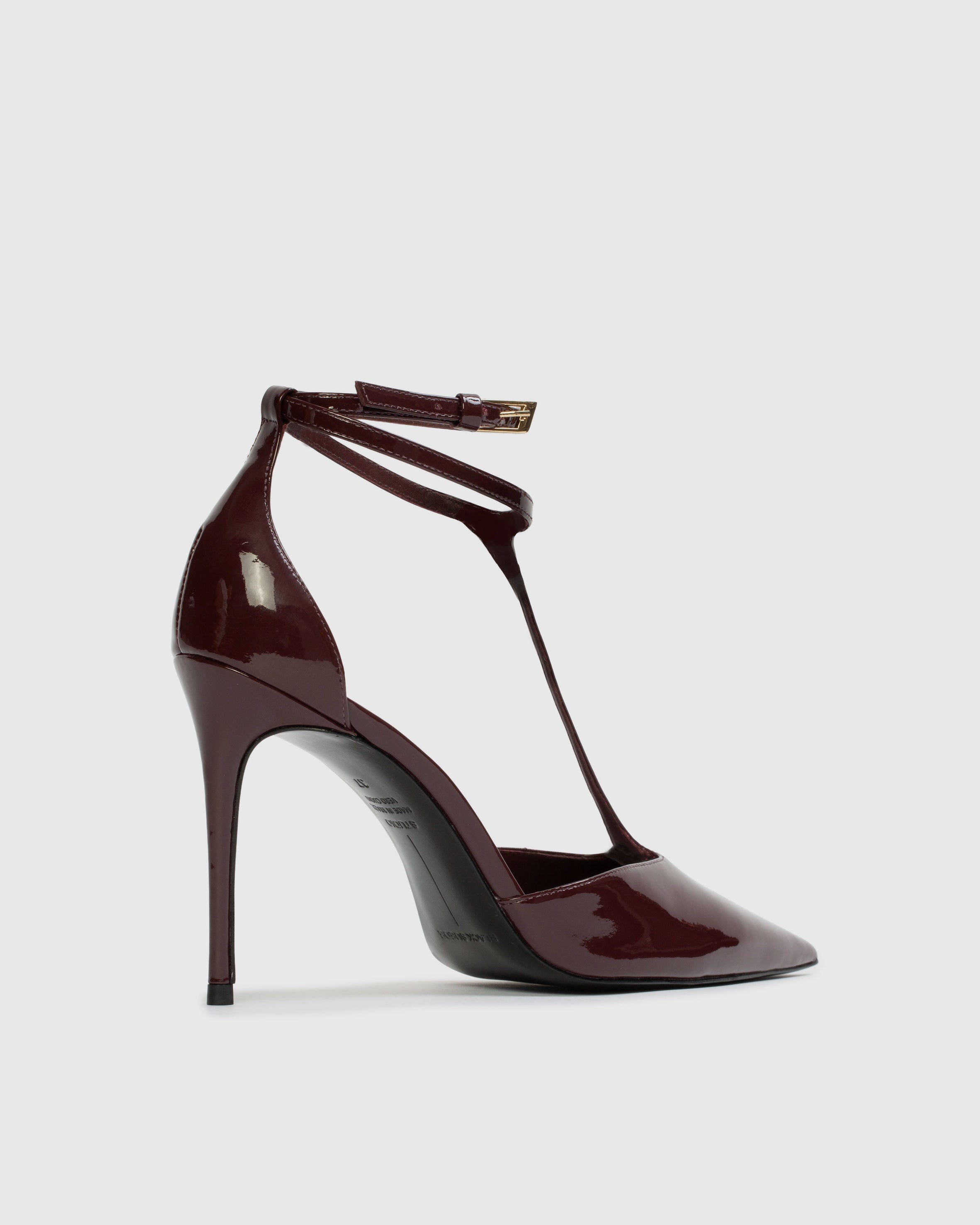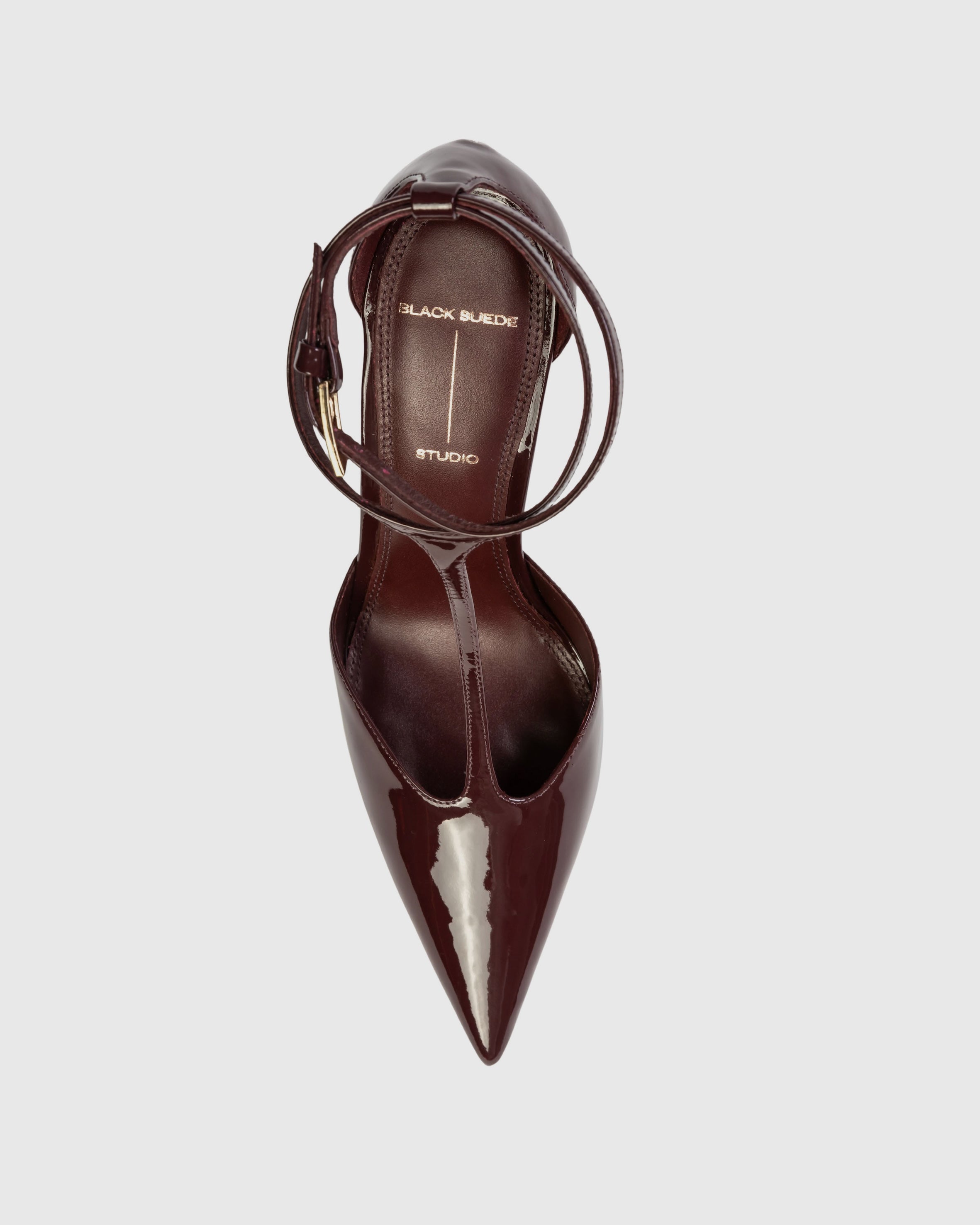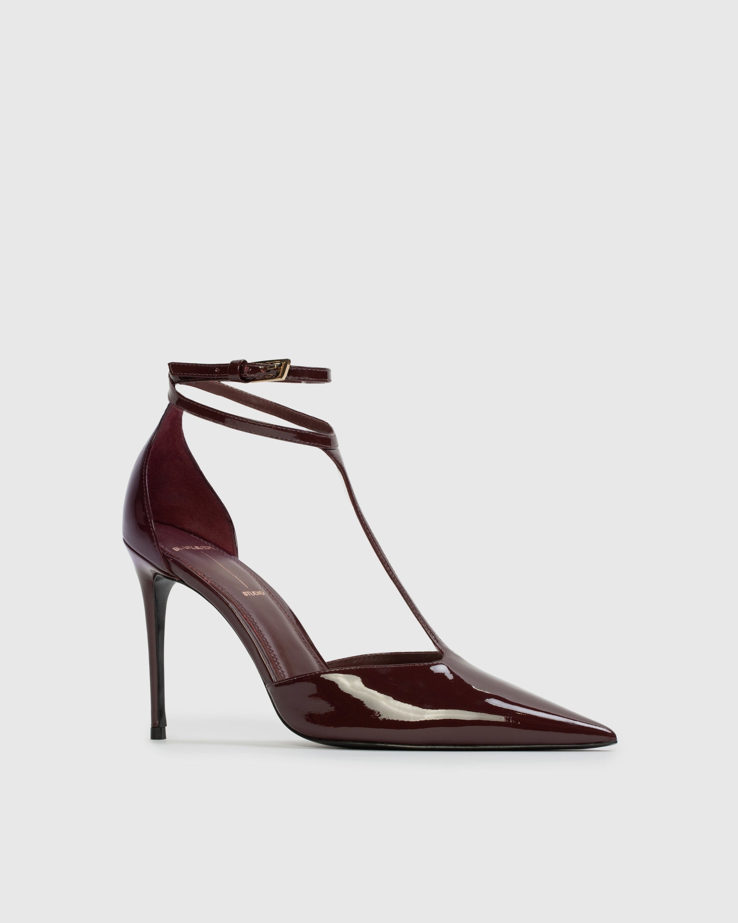 pointy toe t-strap pump, set on a pin stiletto heel. made with smooth patent leather.