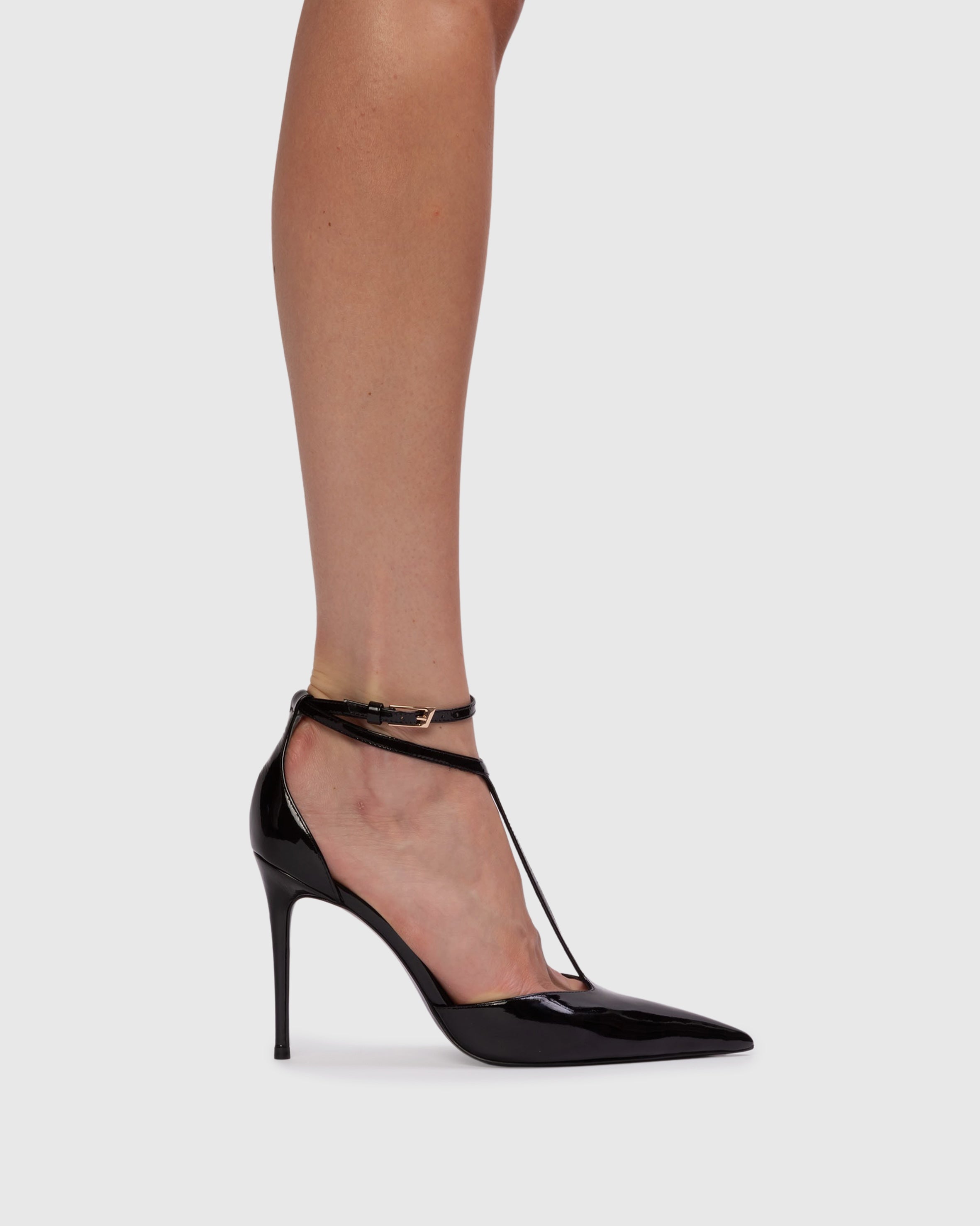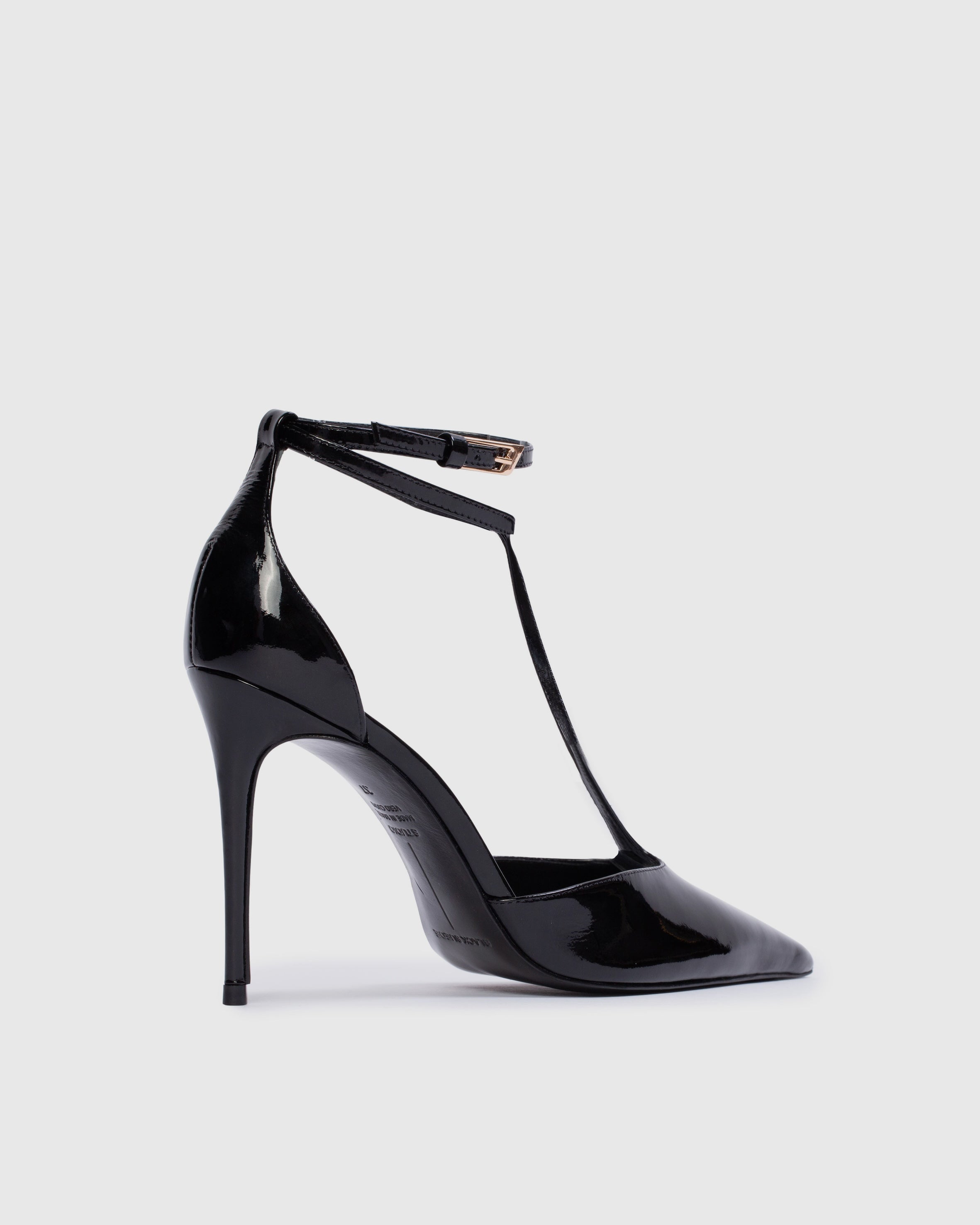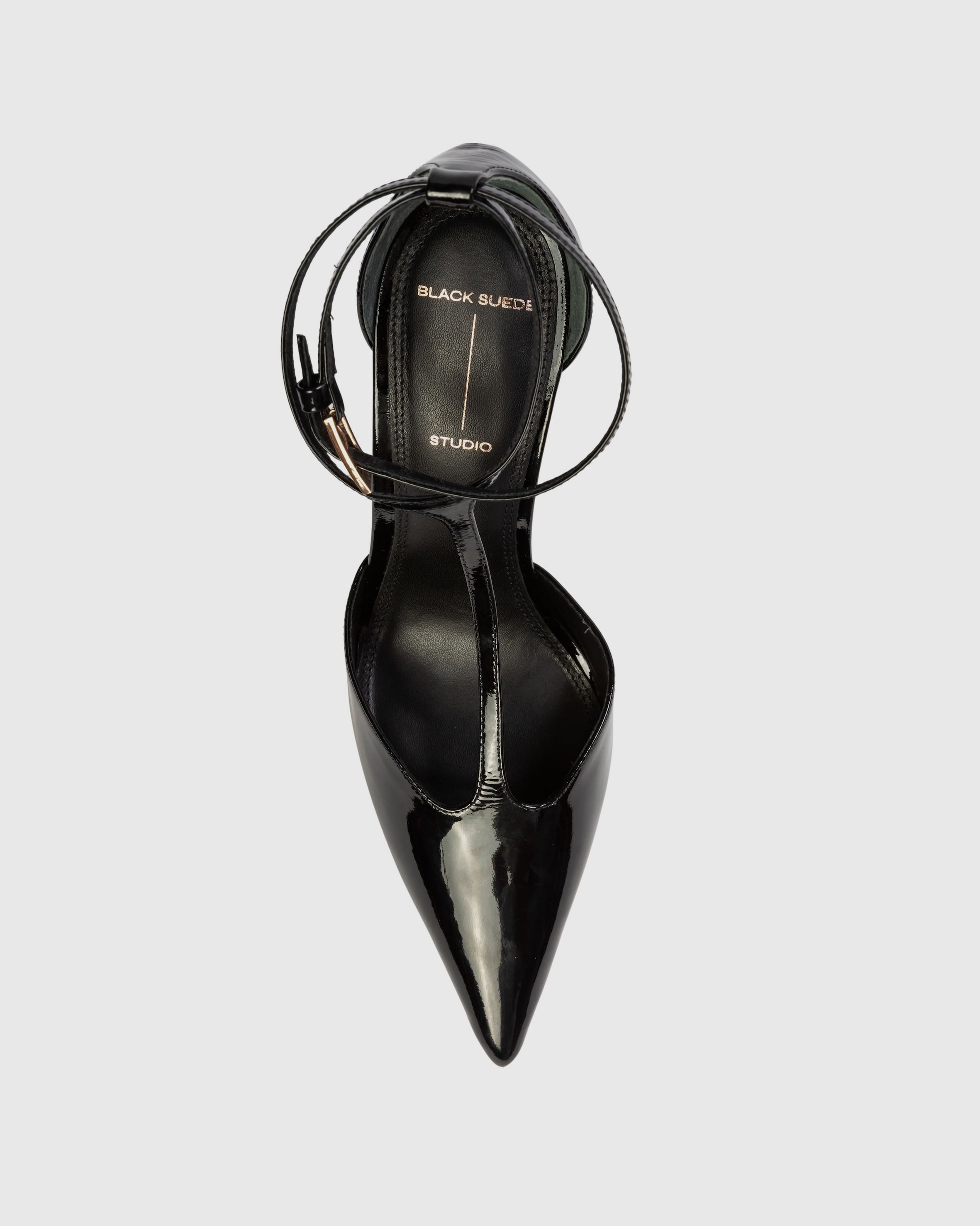 pointy toe t-strap pump, set on a pin stiletto heel. Made with smooth patent leather.