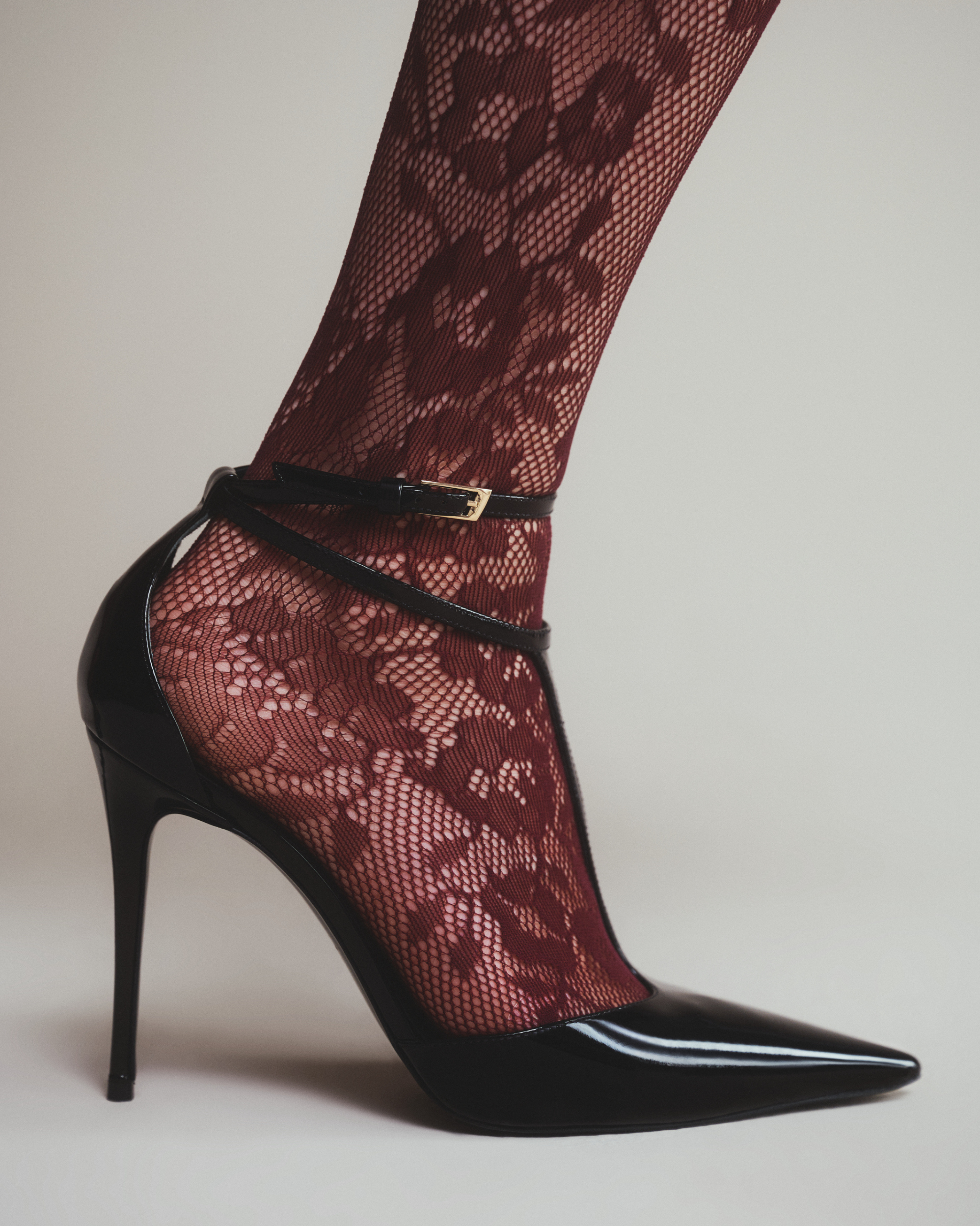pointy toe t-strap pump, set on a pin stiletto heel.