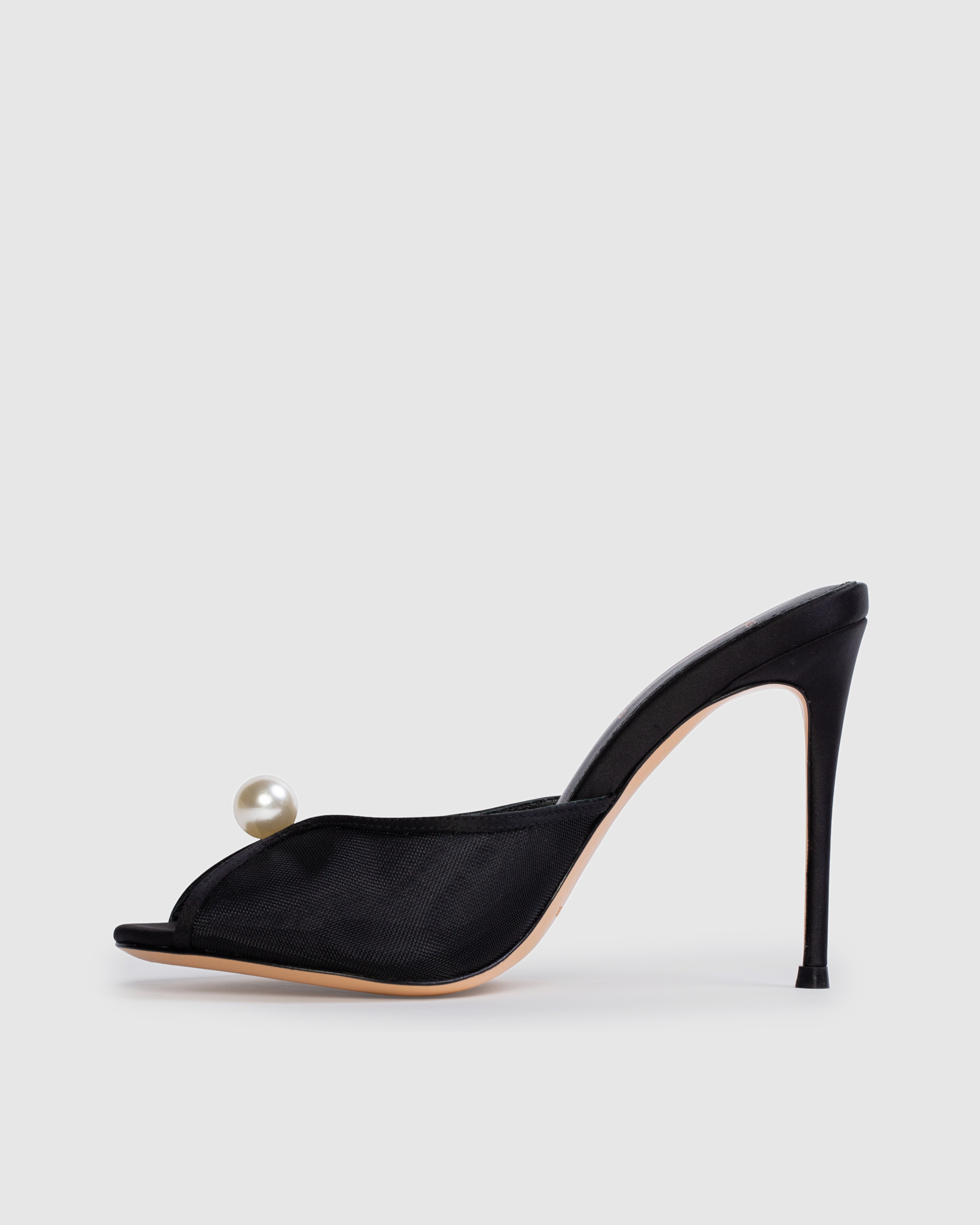 Round toe slipper mule with mesh and pearl ornament detailing, set on a straight stiletto heel. Made with satin crepe.