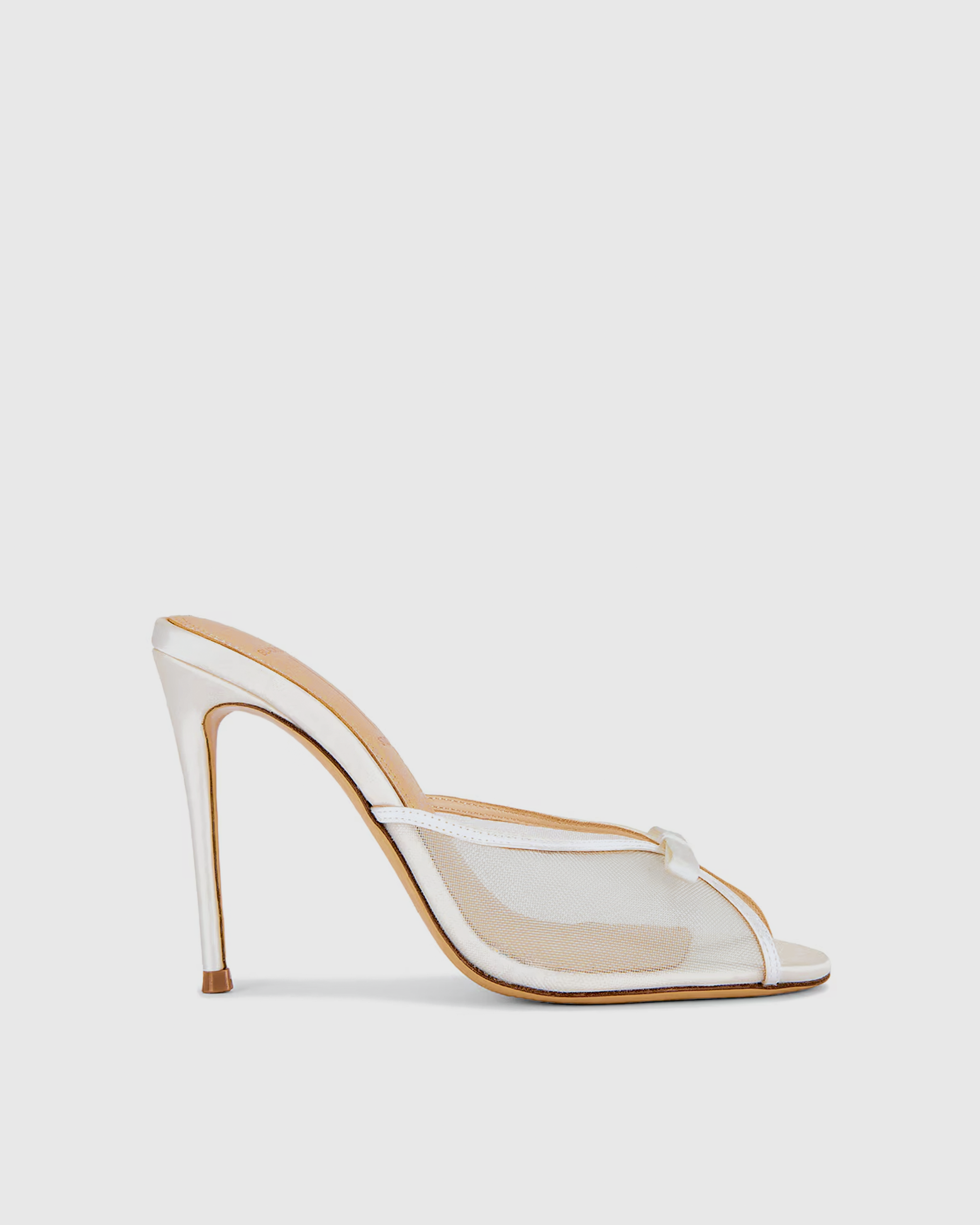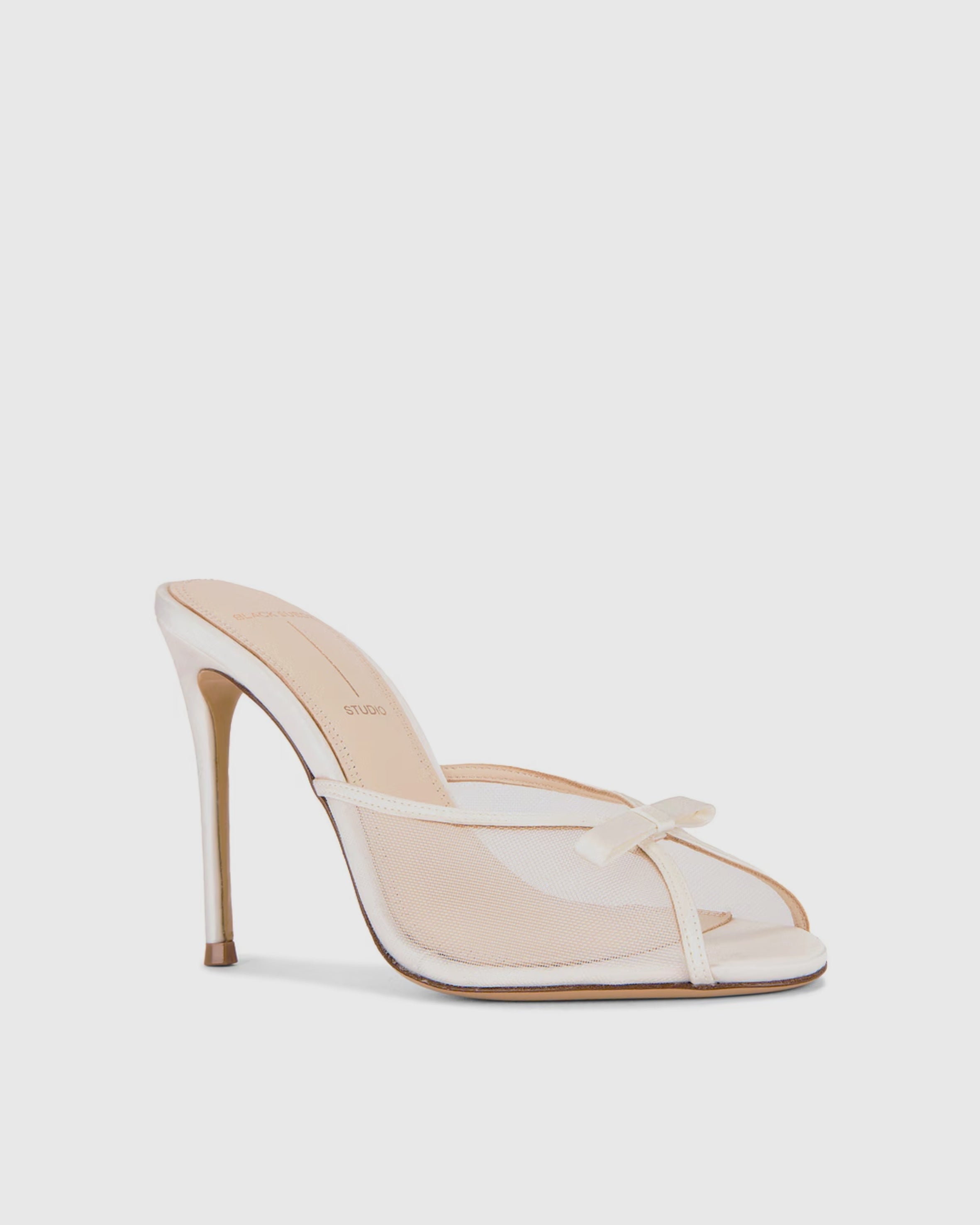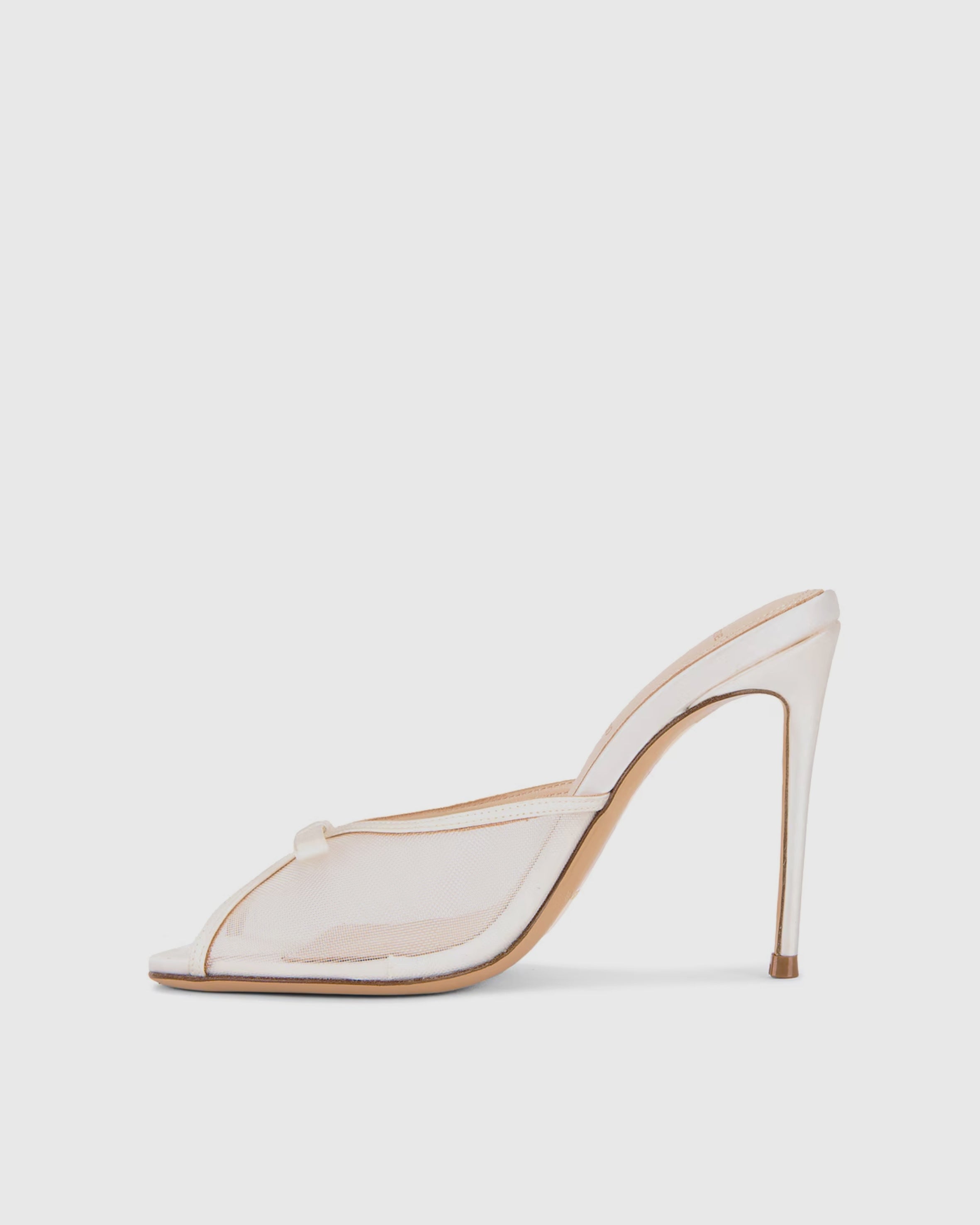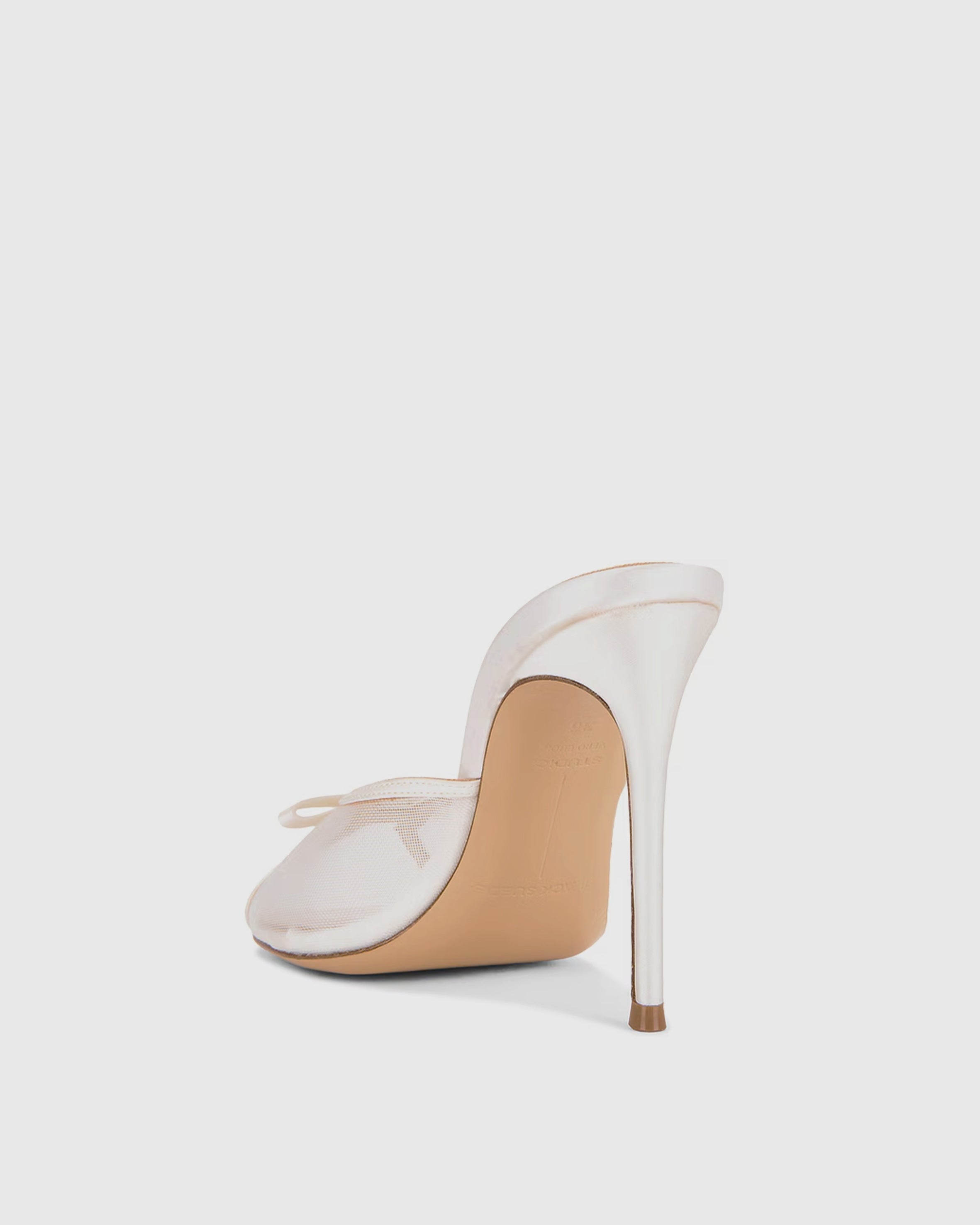 Round toe slipper mule with mesh and bow detail on upper, set on a straight stiletto heel. Made with satin crepe.