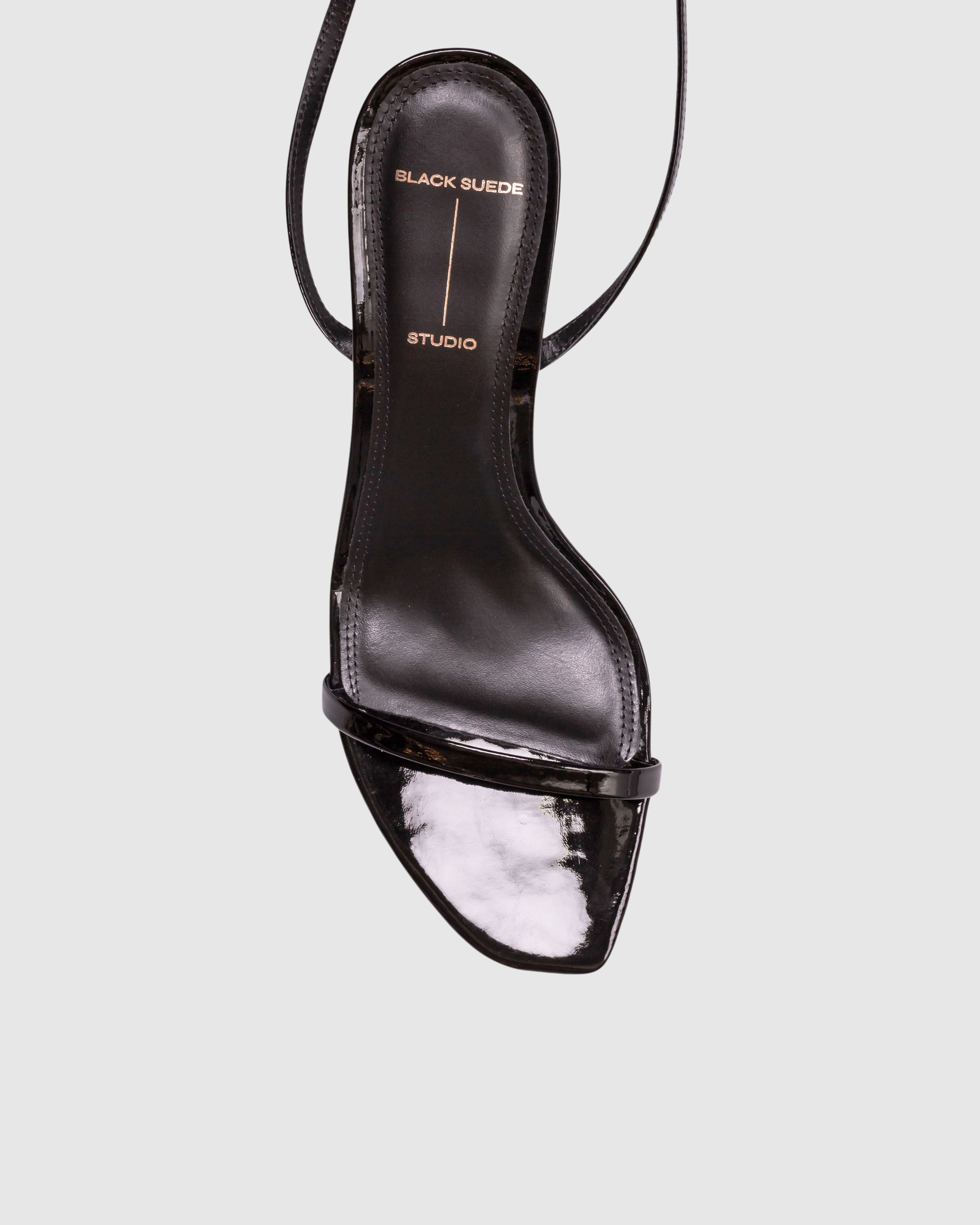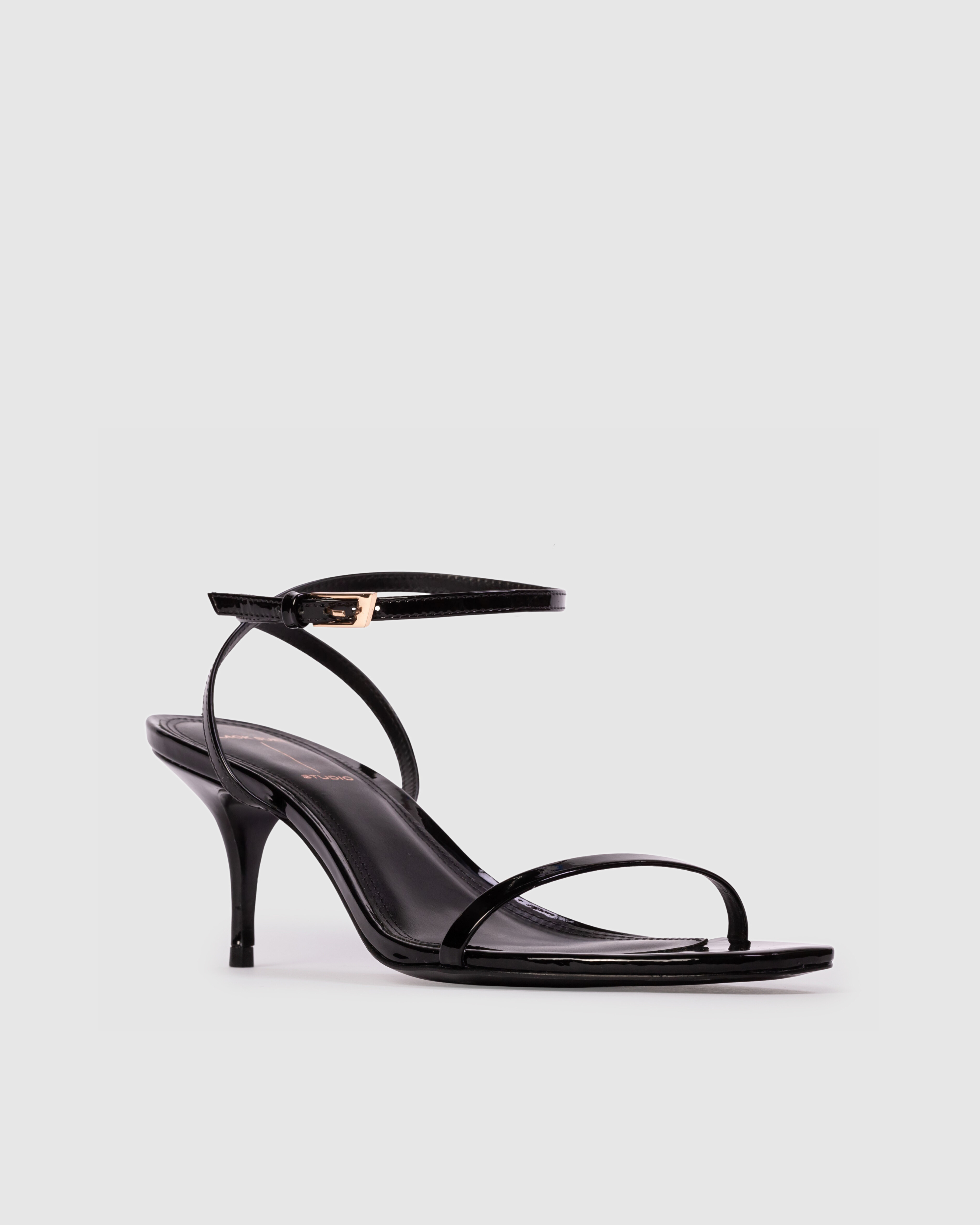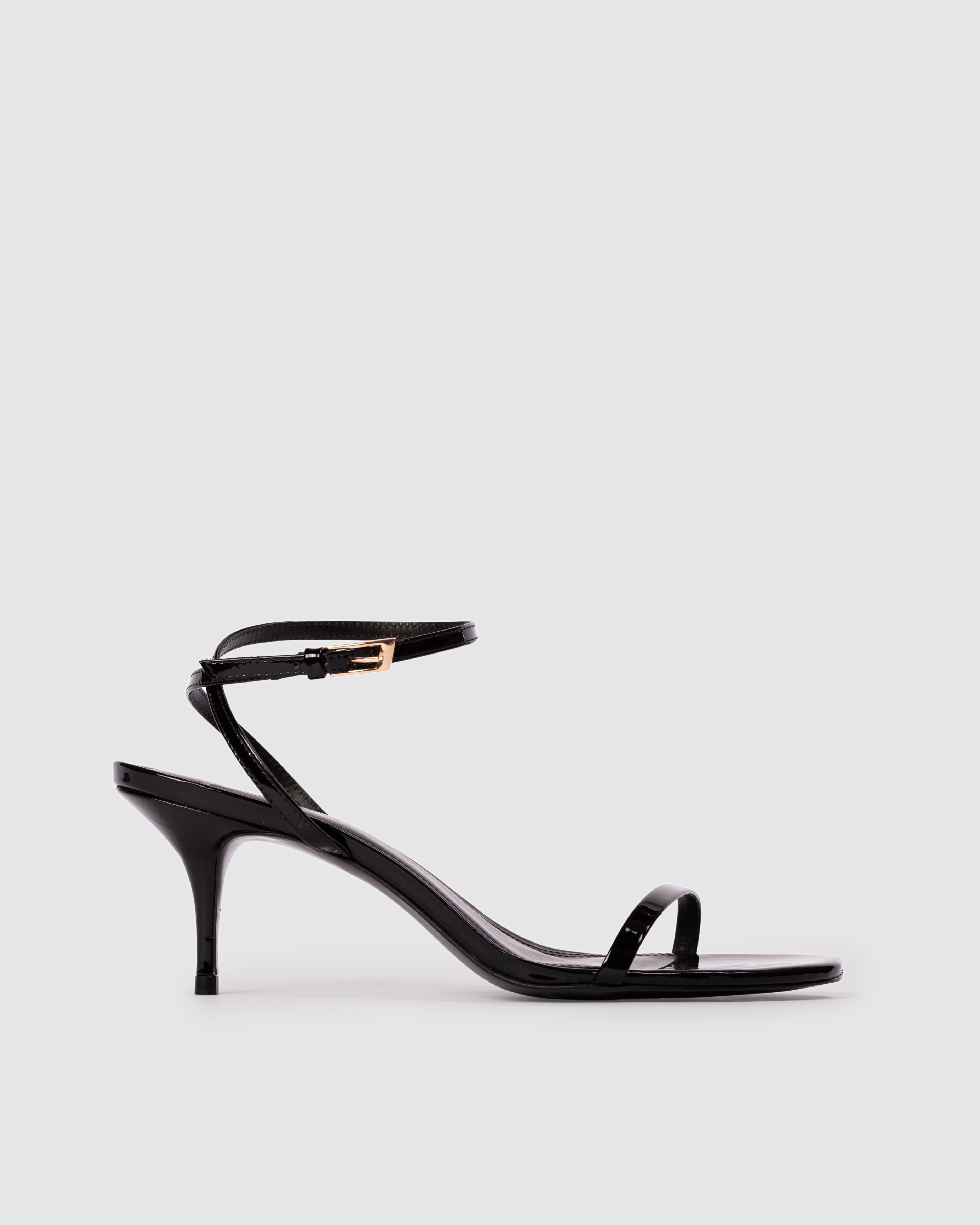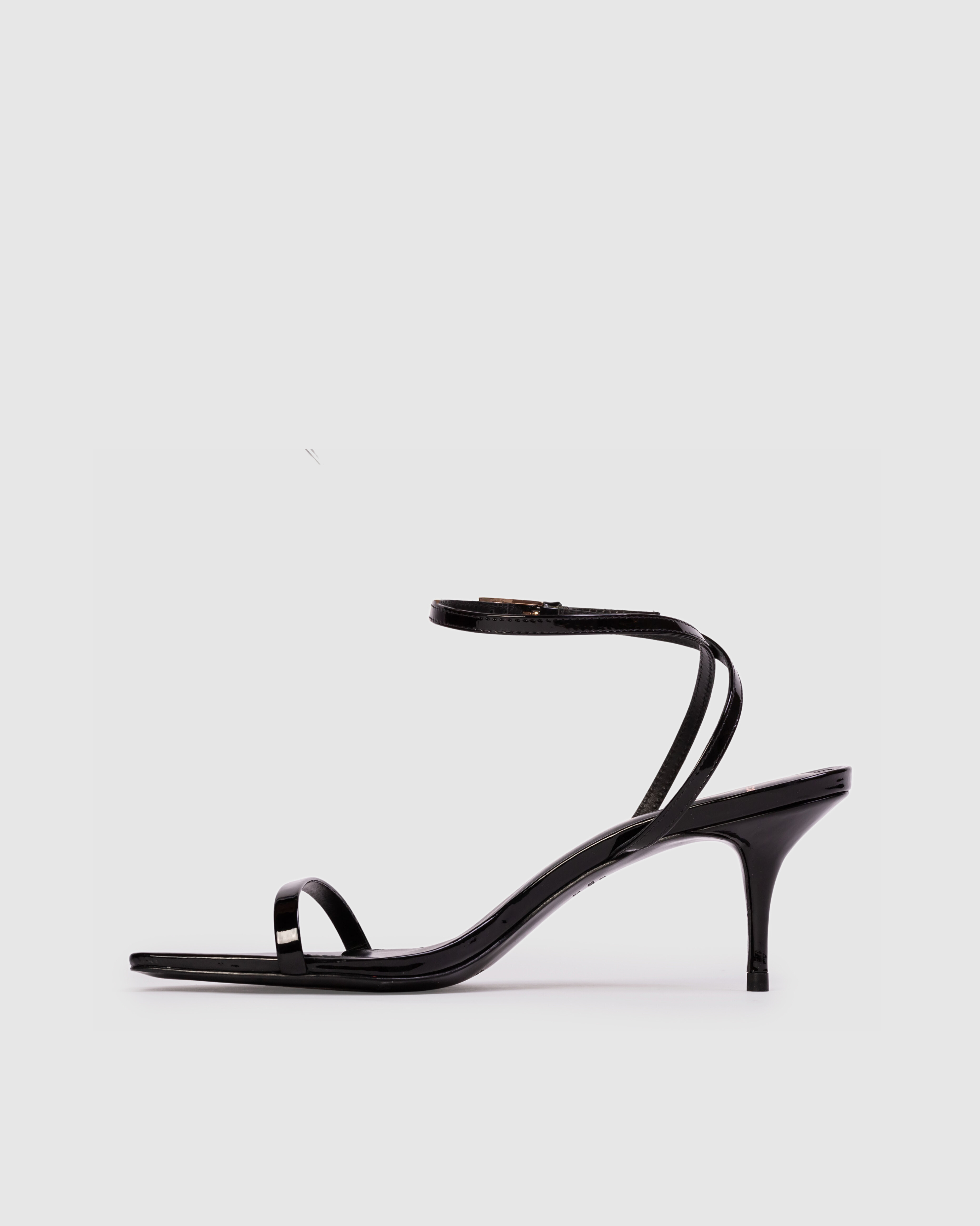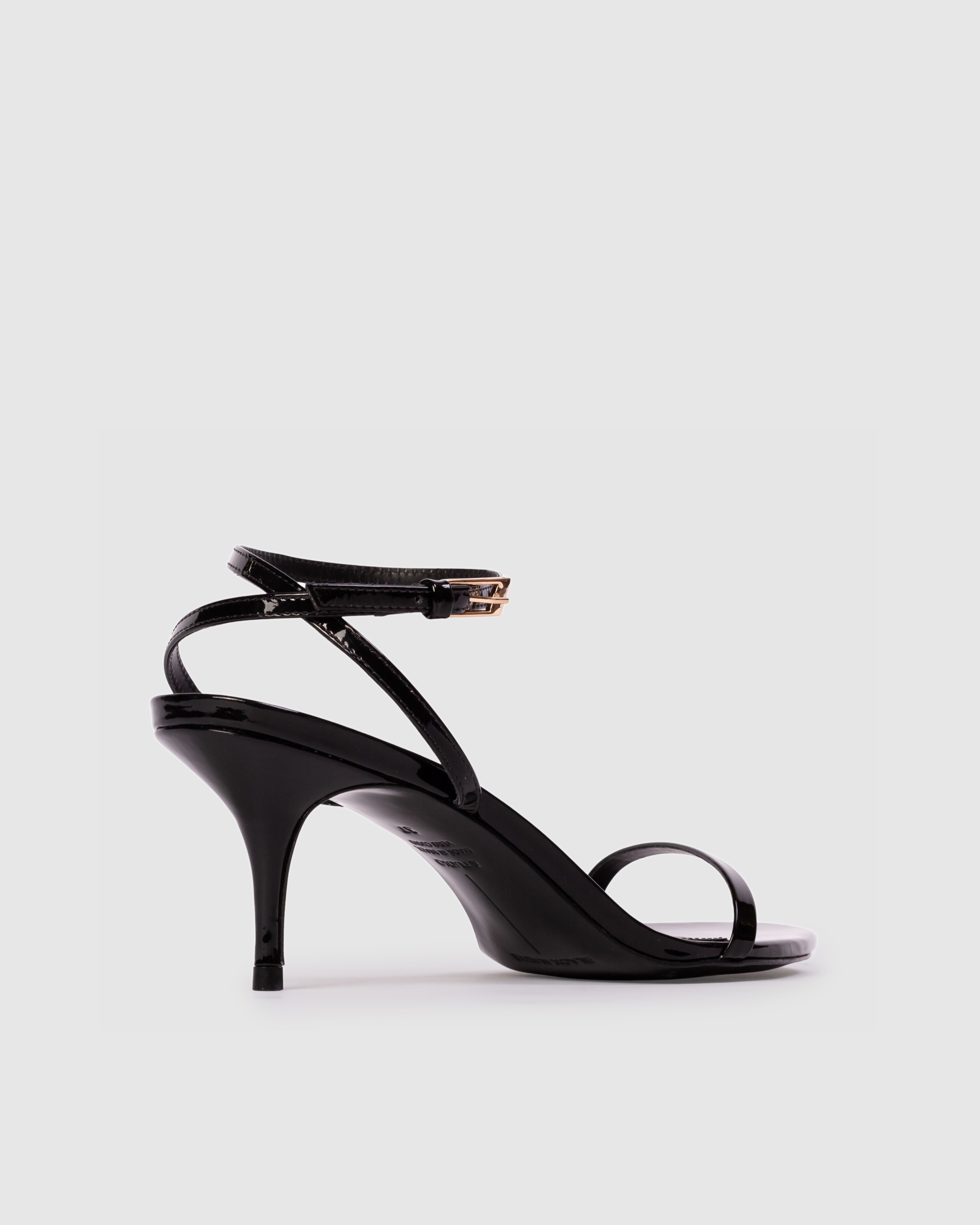 Angled snipped toe strappy sandal, set on a curved mid heel. Made with smooth patent leather.