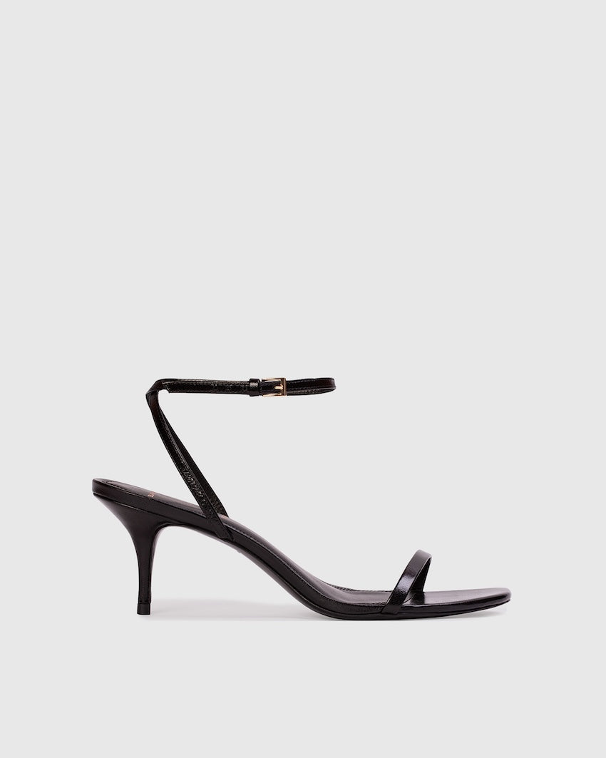 Angled snipped toe strappy sandal, set on a curved mid heel. Made with smooth goat leather.