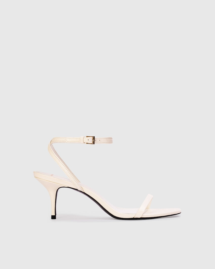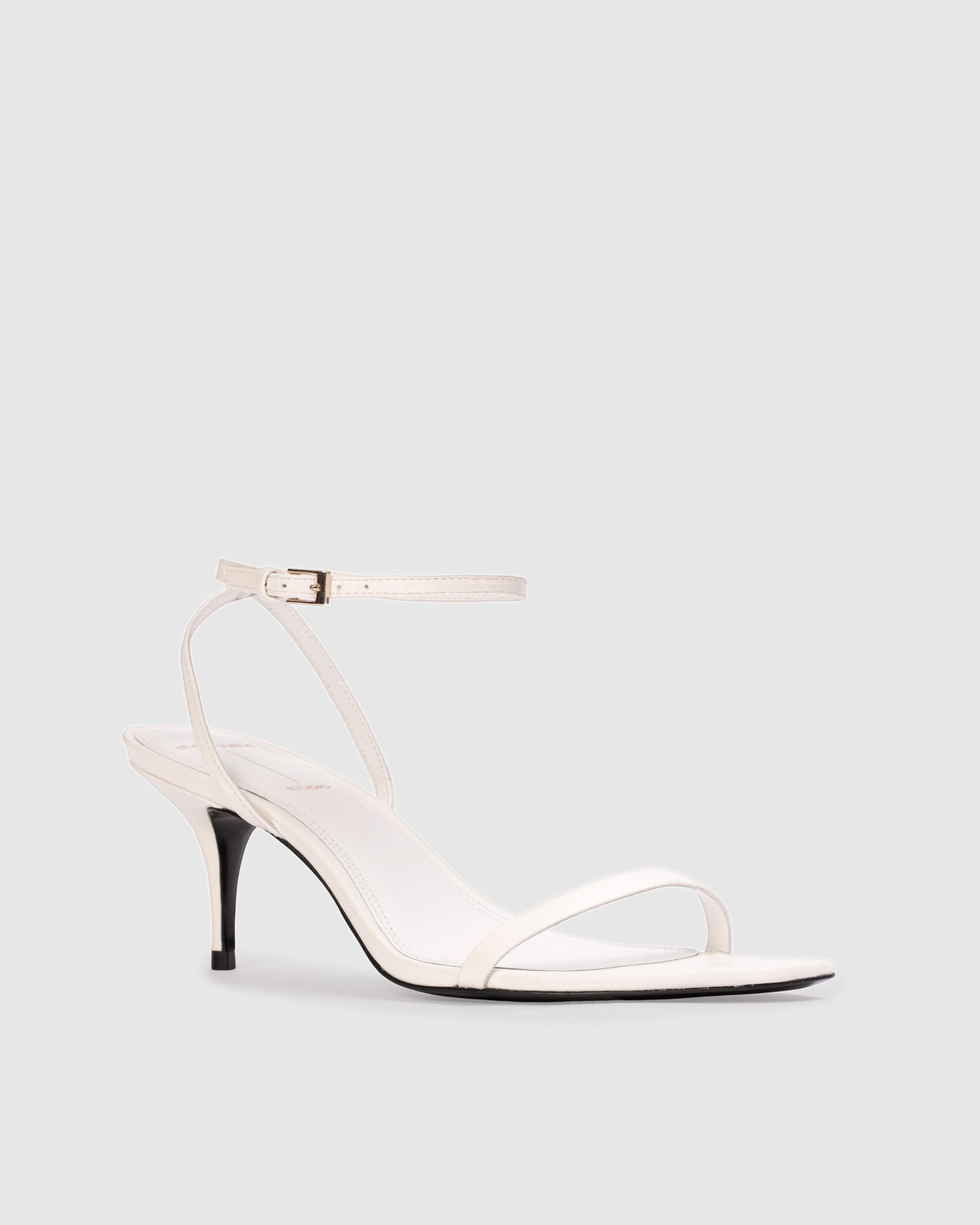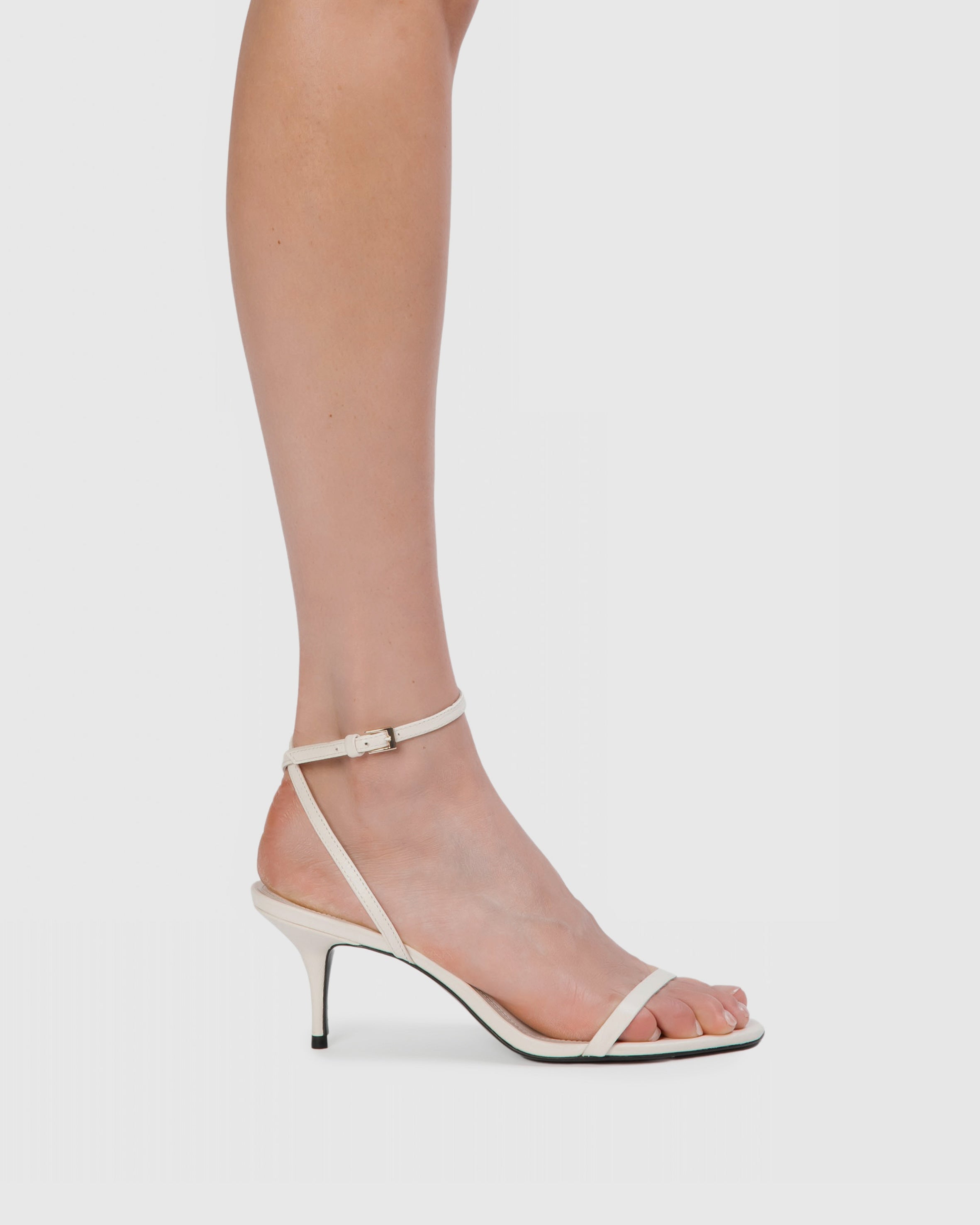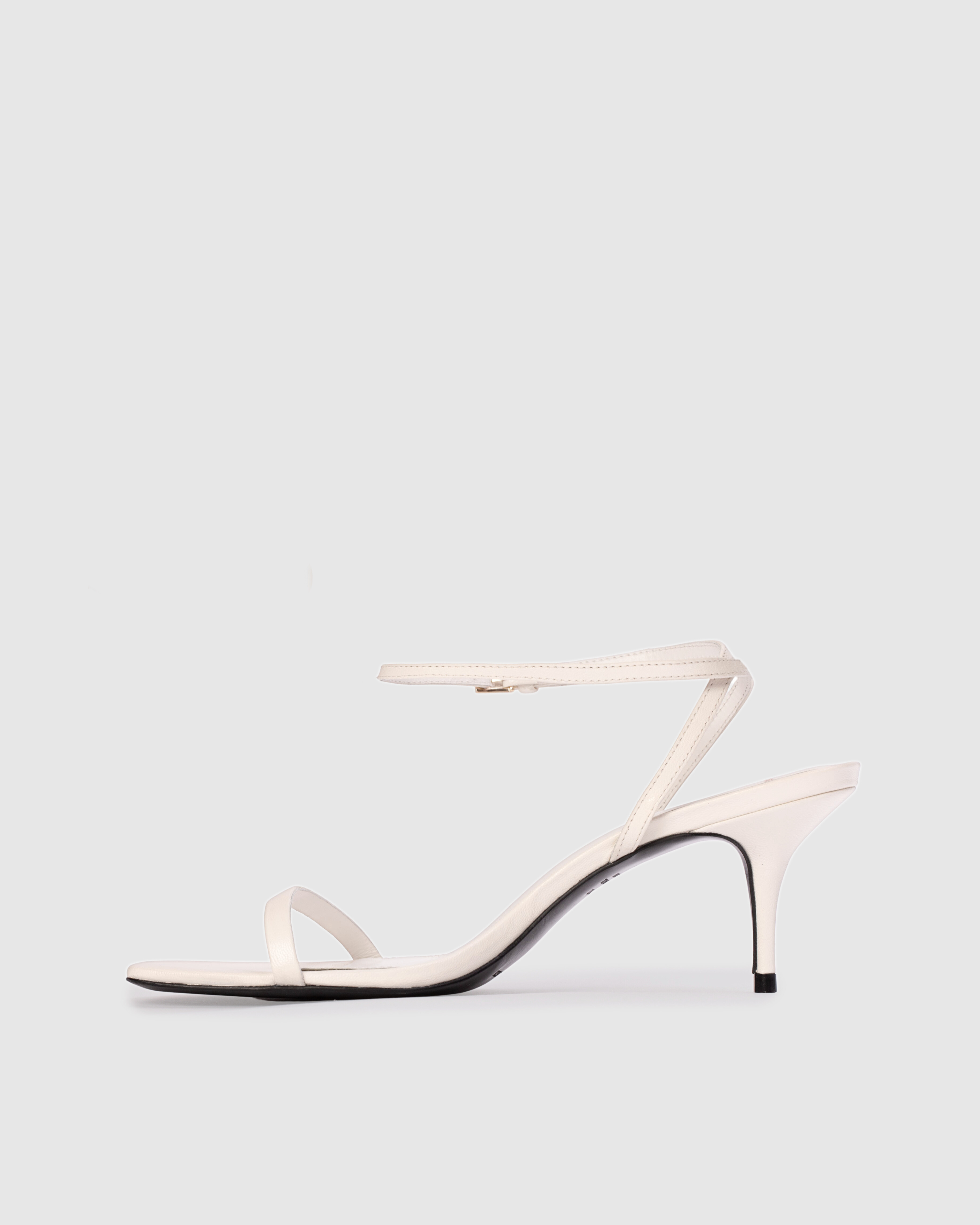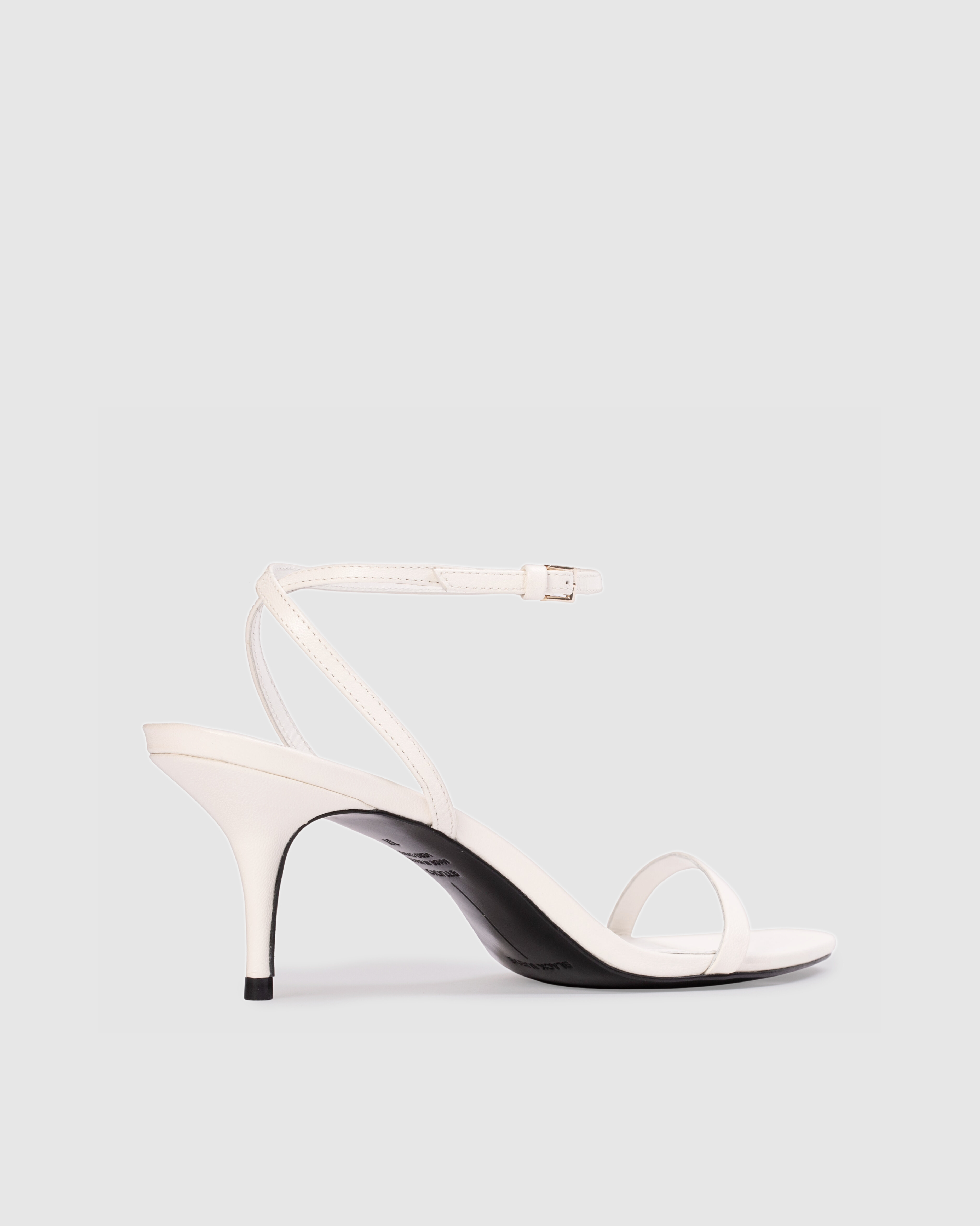 Angled snipped toe strappy sandal, set on a curved mid heel. Made with smooth goat leather.