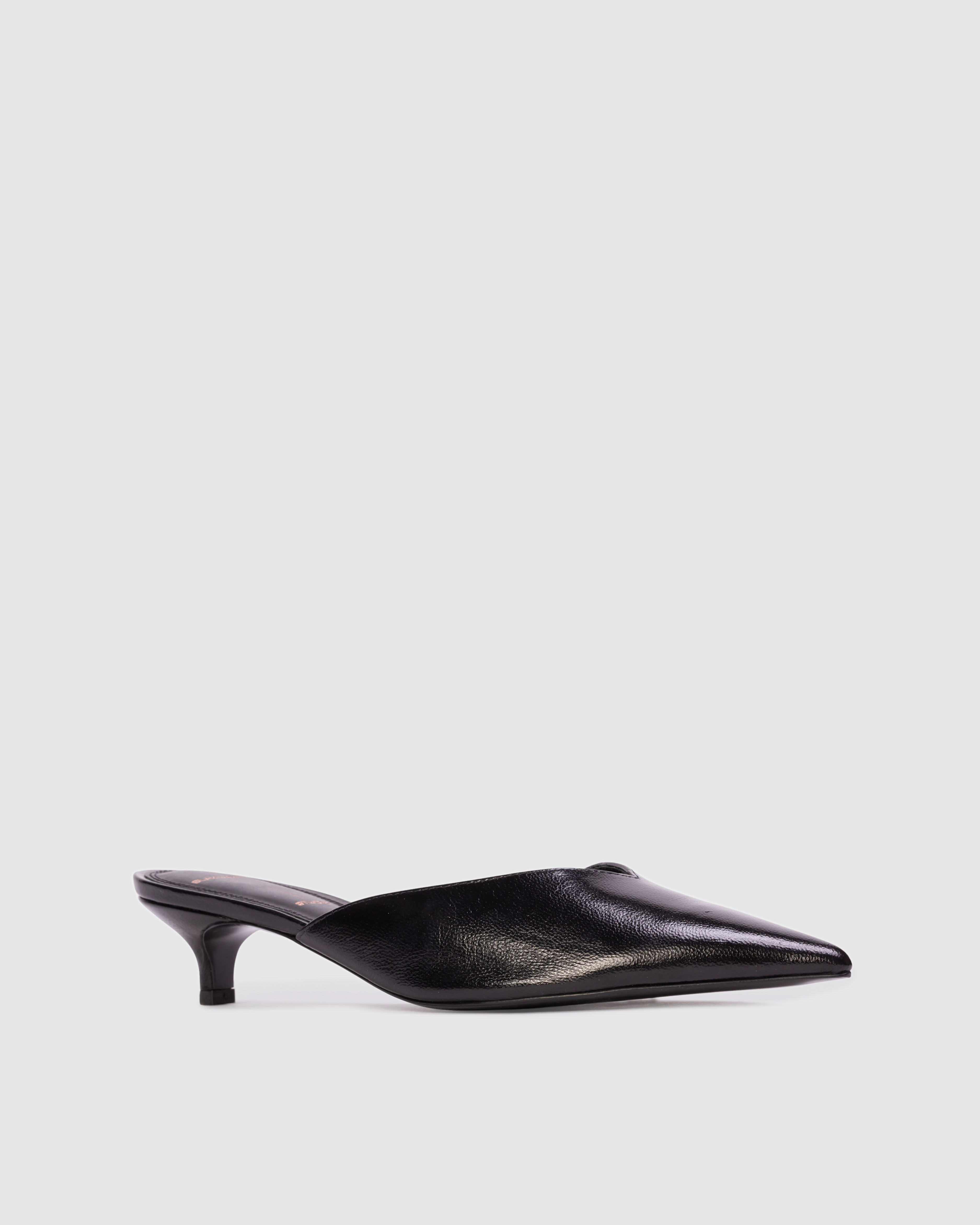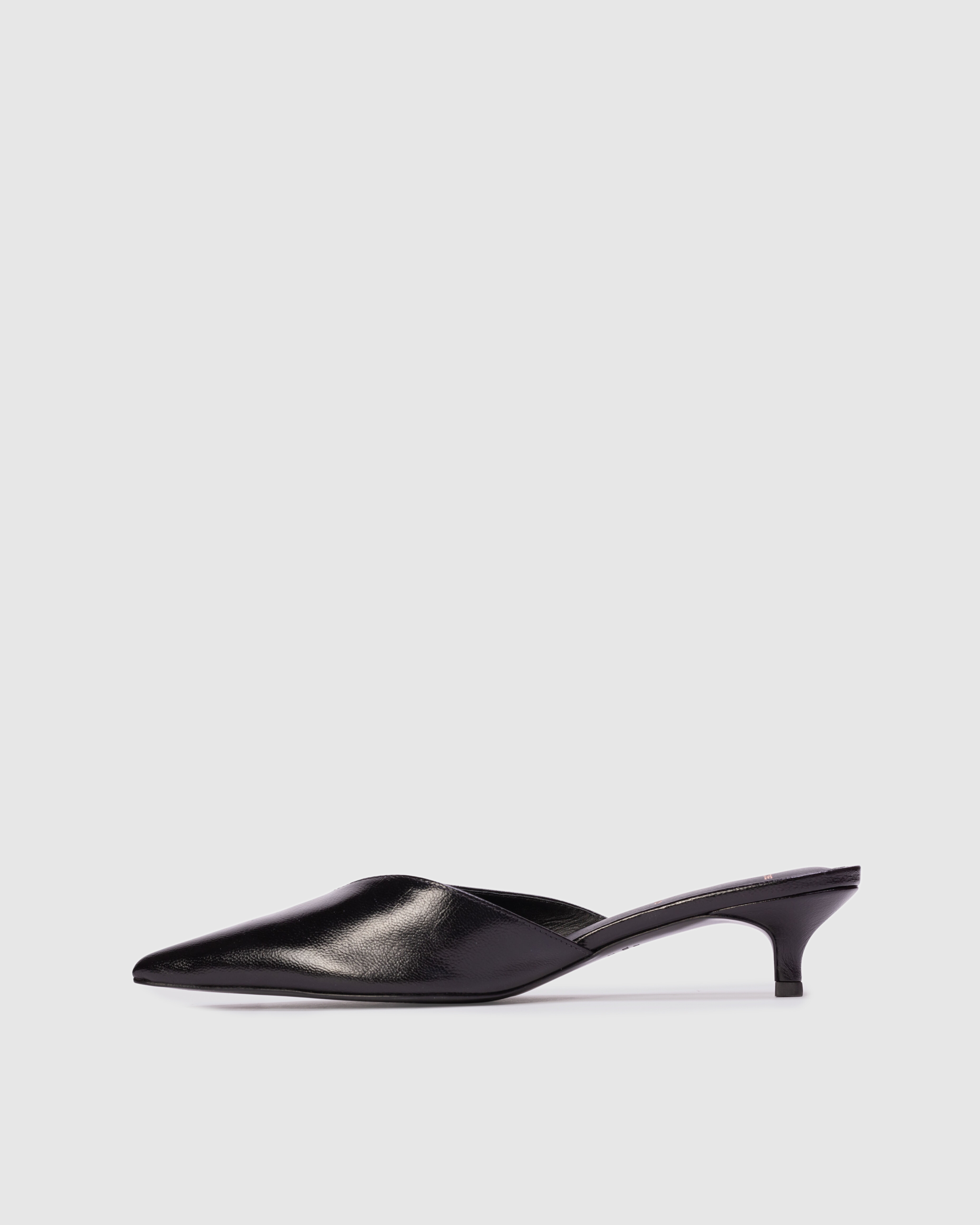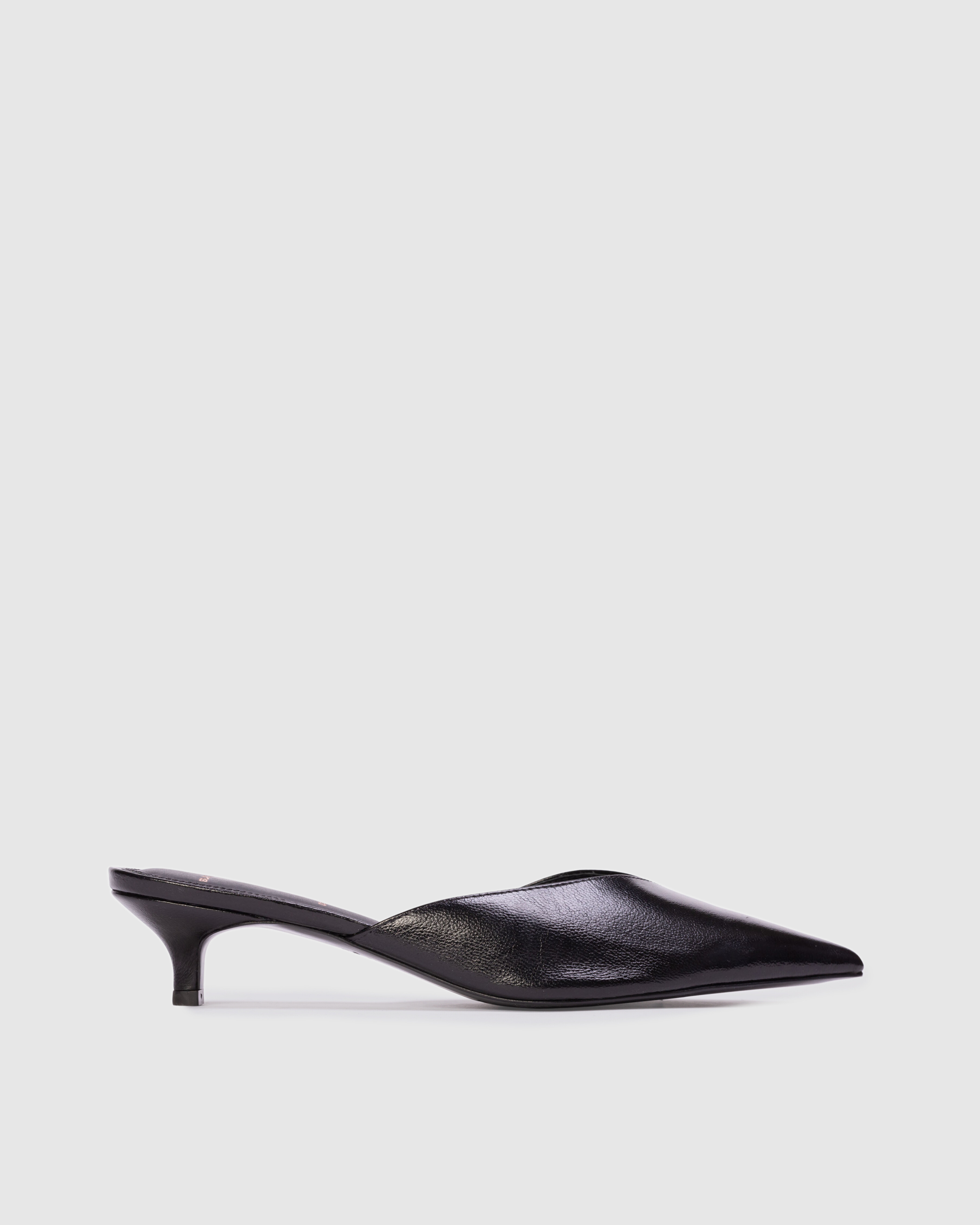 Pointy toe slipper mule, set on a cone kitten heel. Made with smooth goat leather.