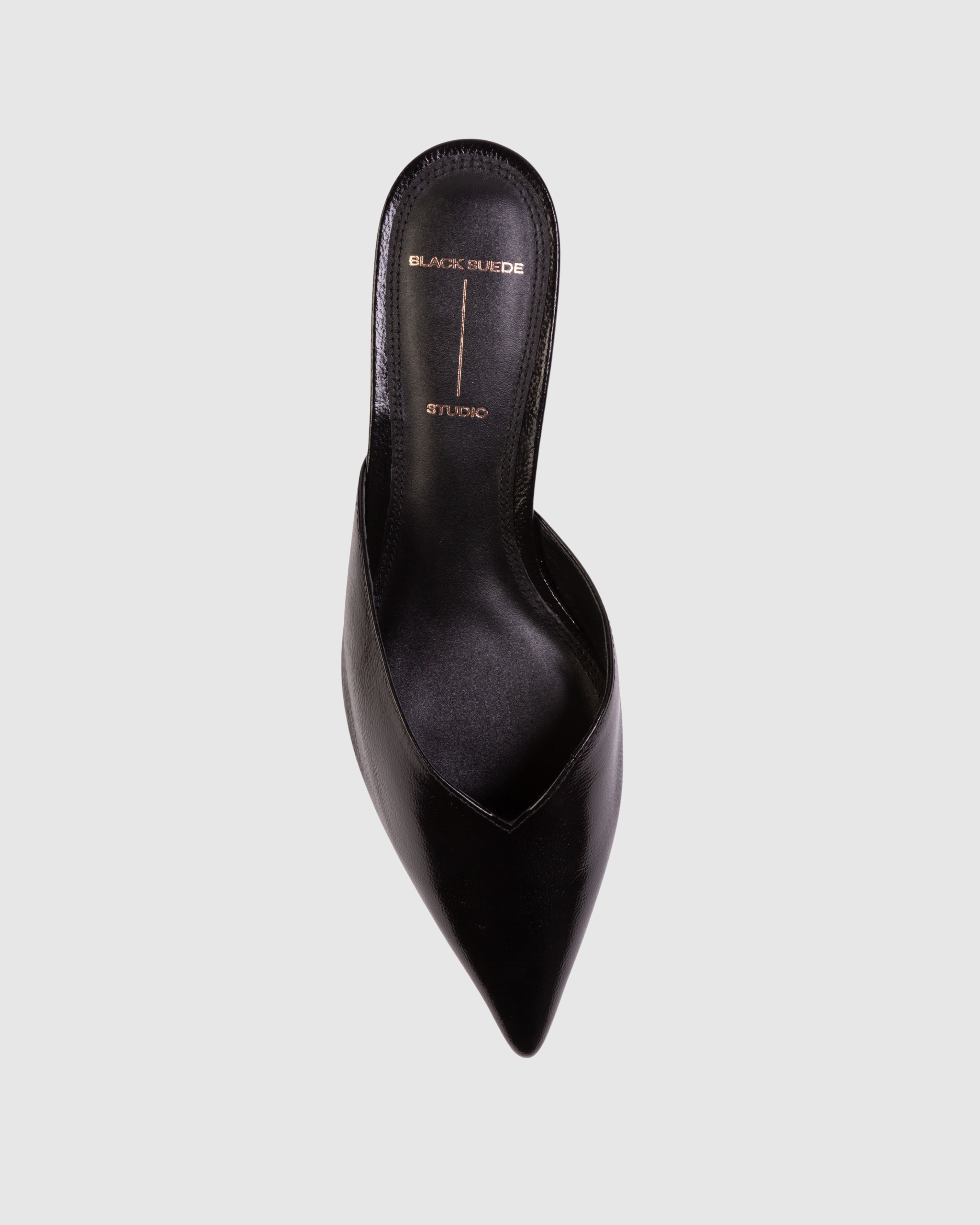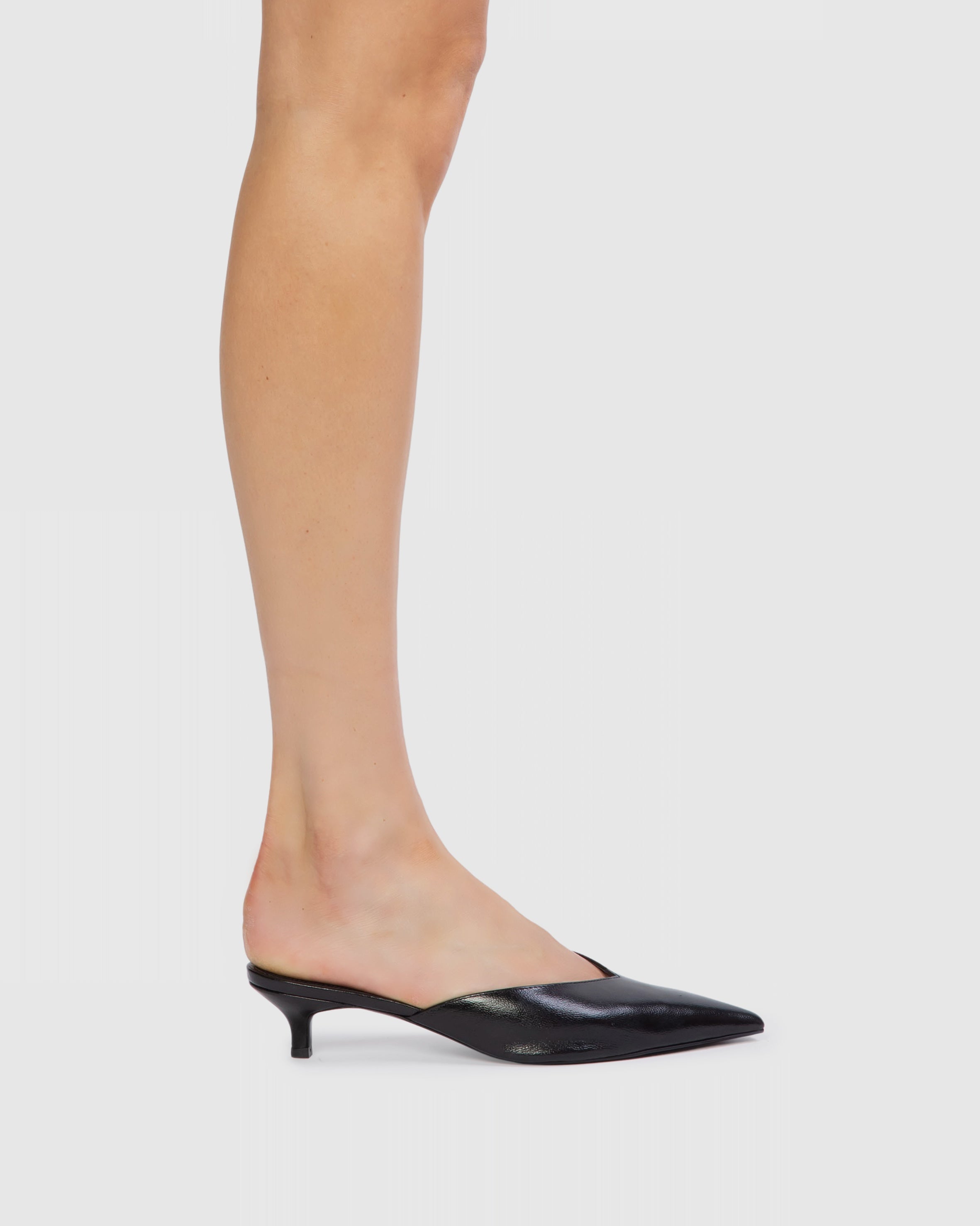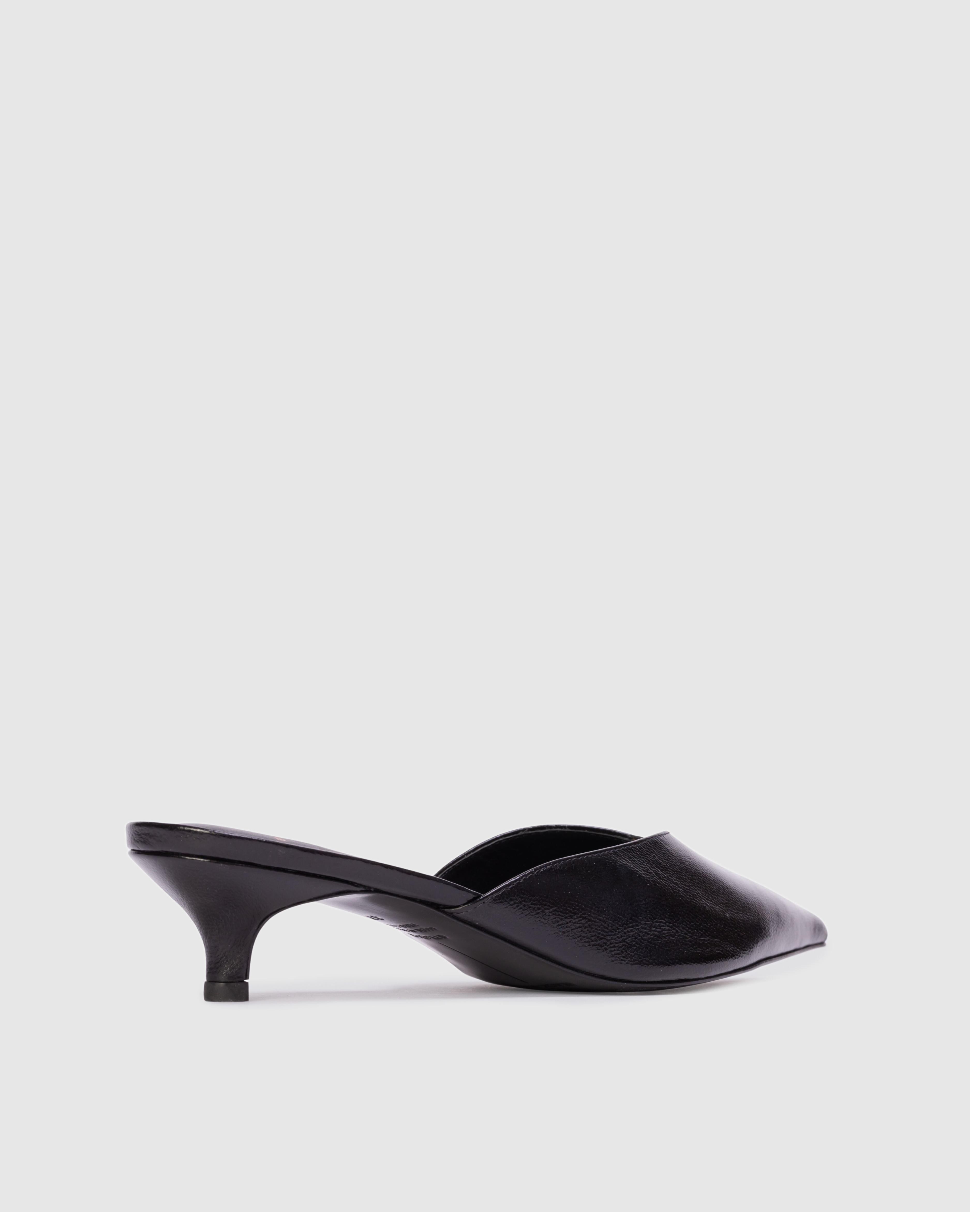 Pointy toe slipper mule, set on a cone kitten heel. Made with smooth goat leather.