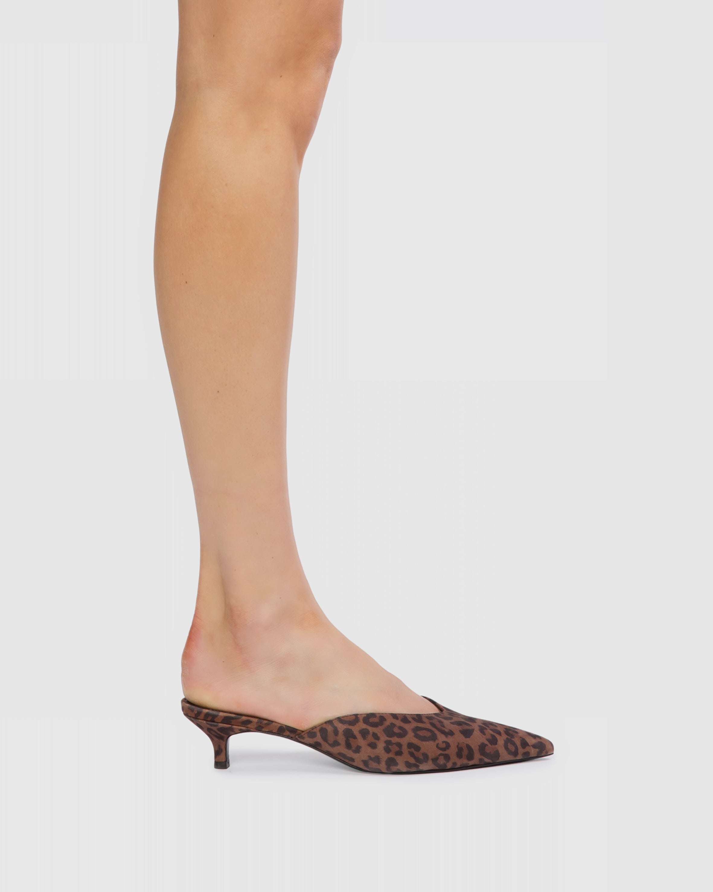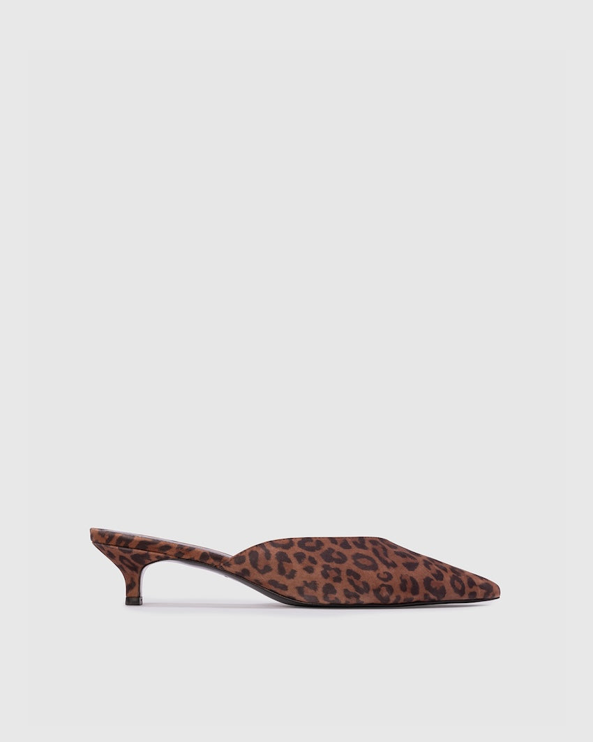 Pointy toe slipper mule, set on a cone kitten heel. Made with nubuck.
