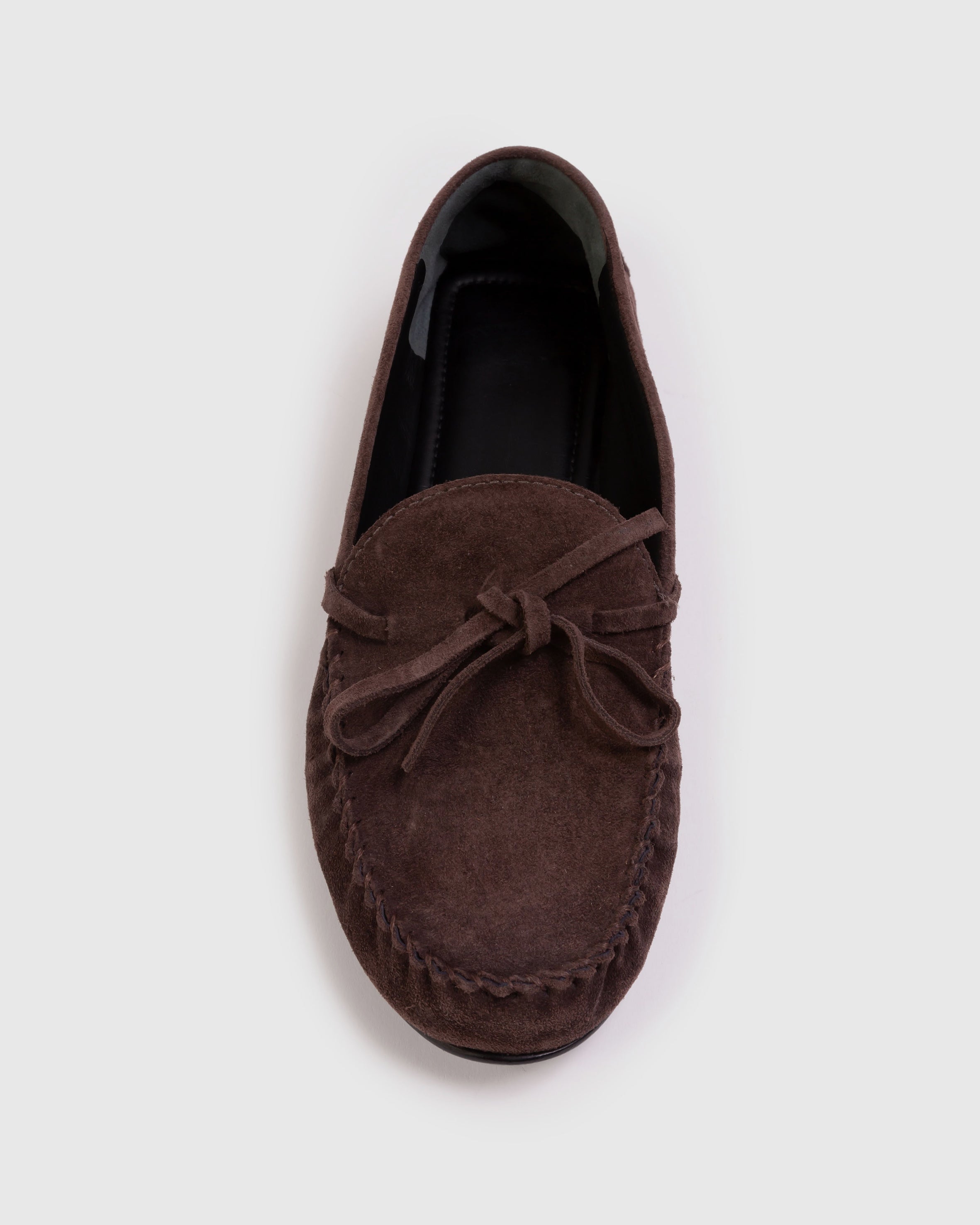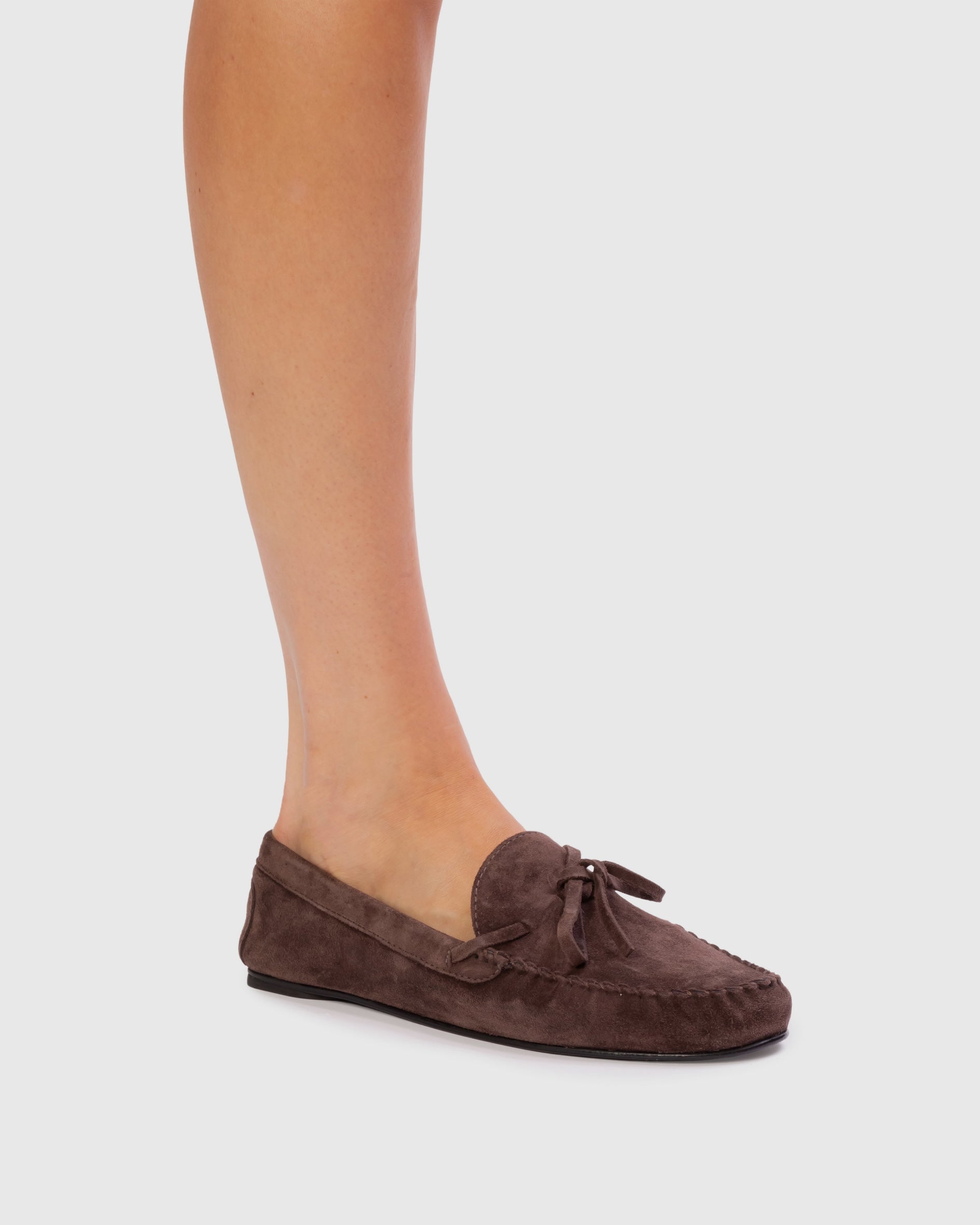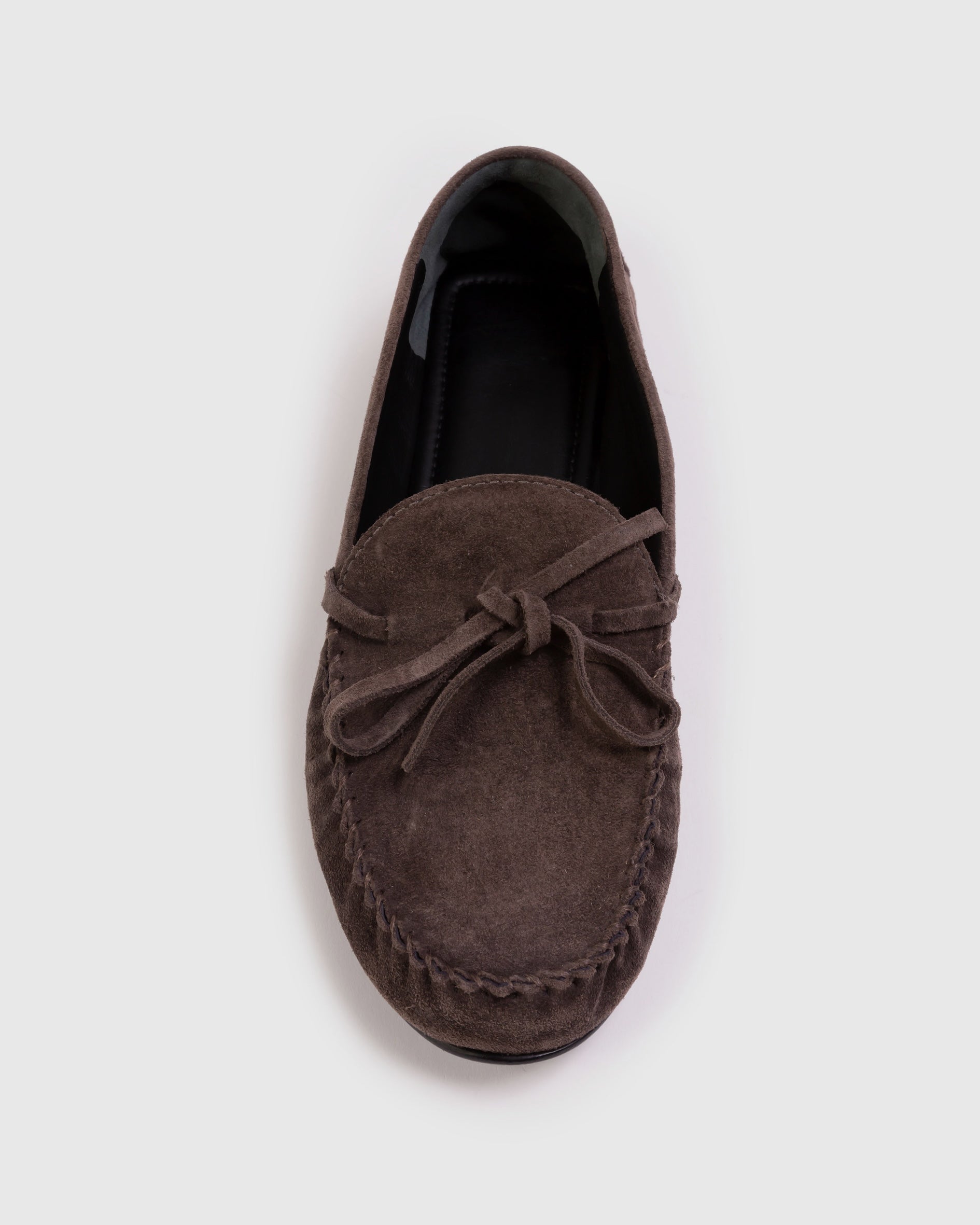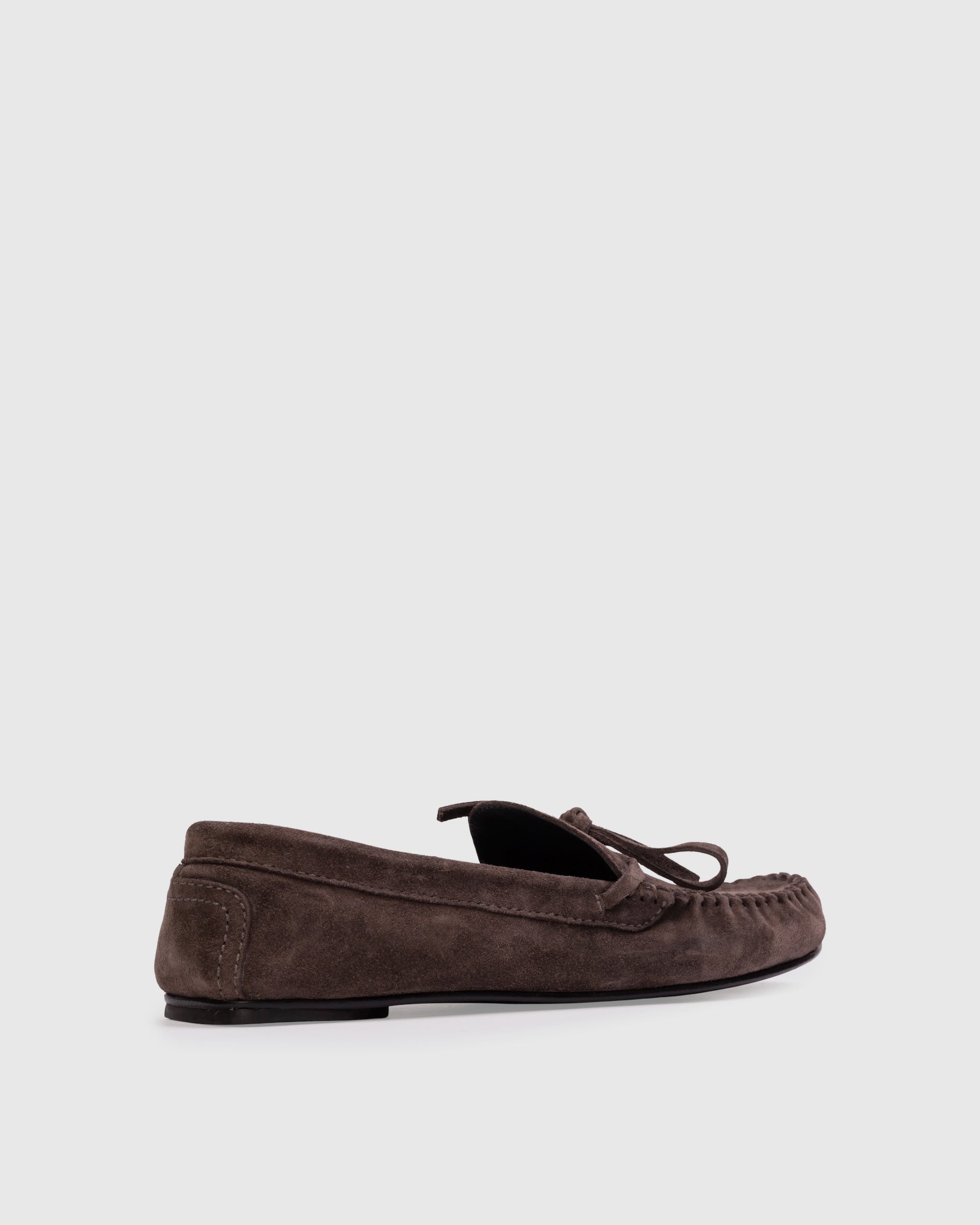 Round toe moccasin flat with bow and ruching detail. Made with brushed kid suede.