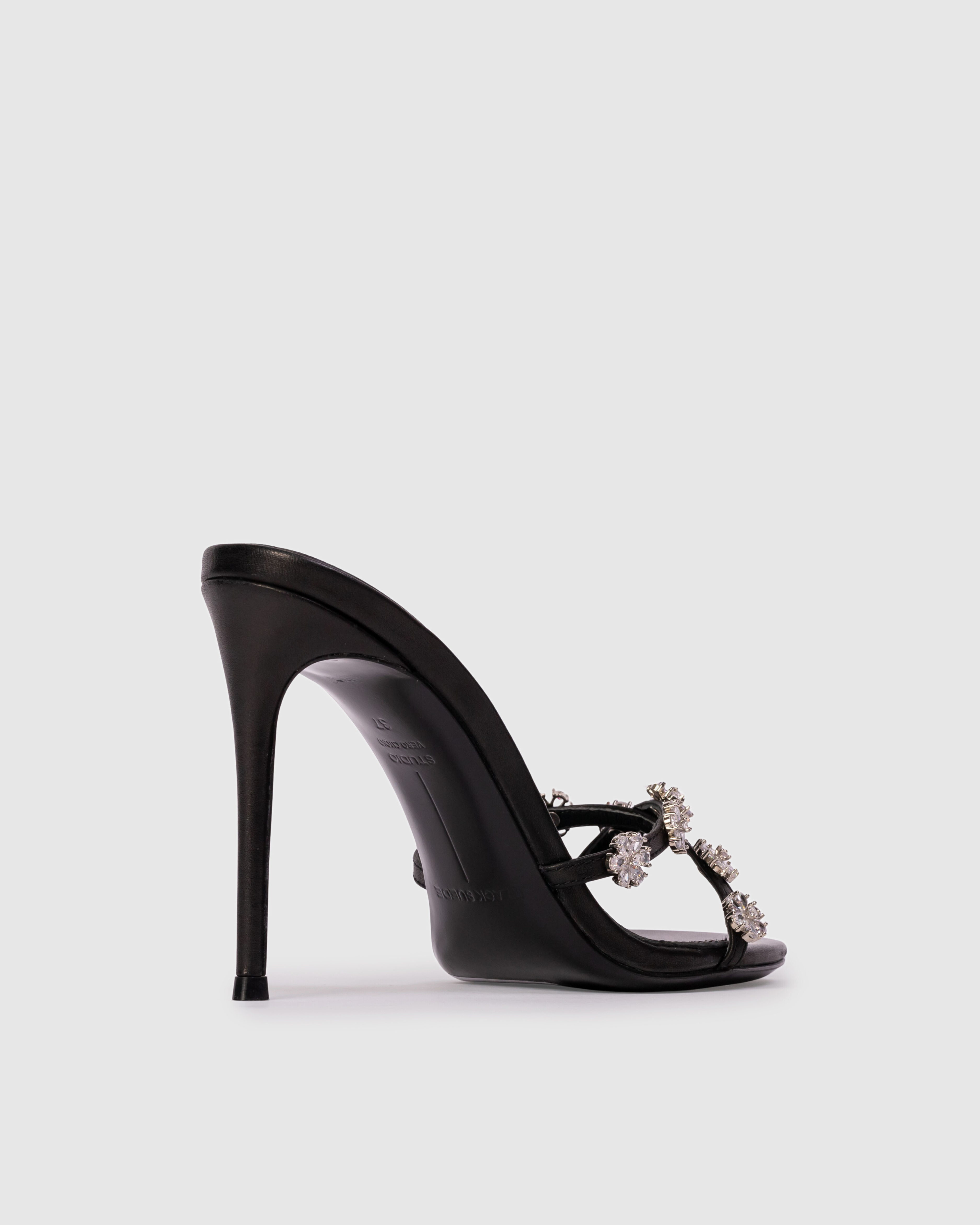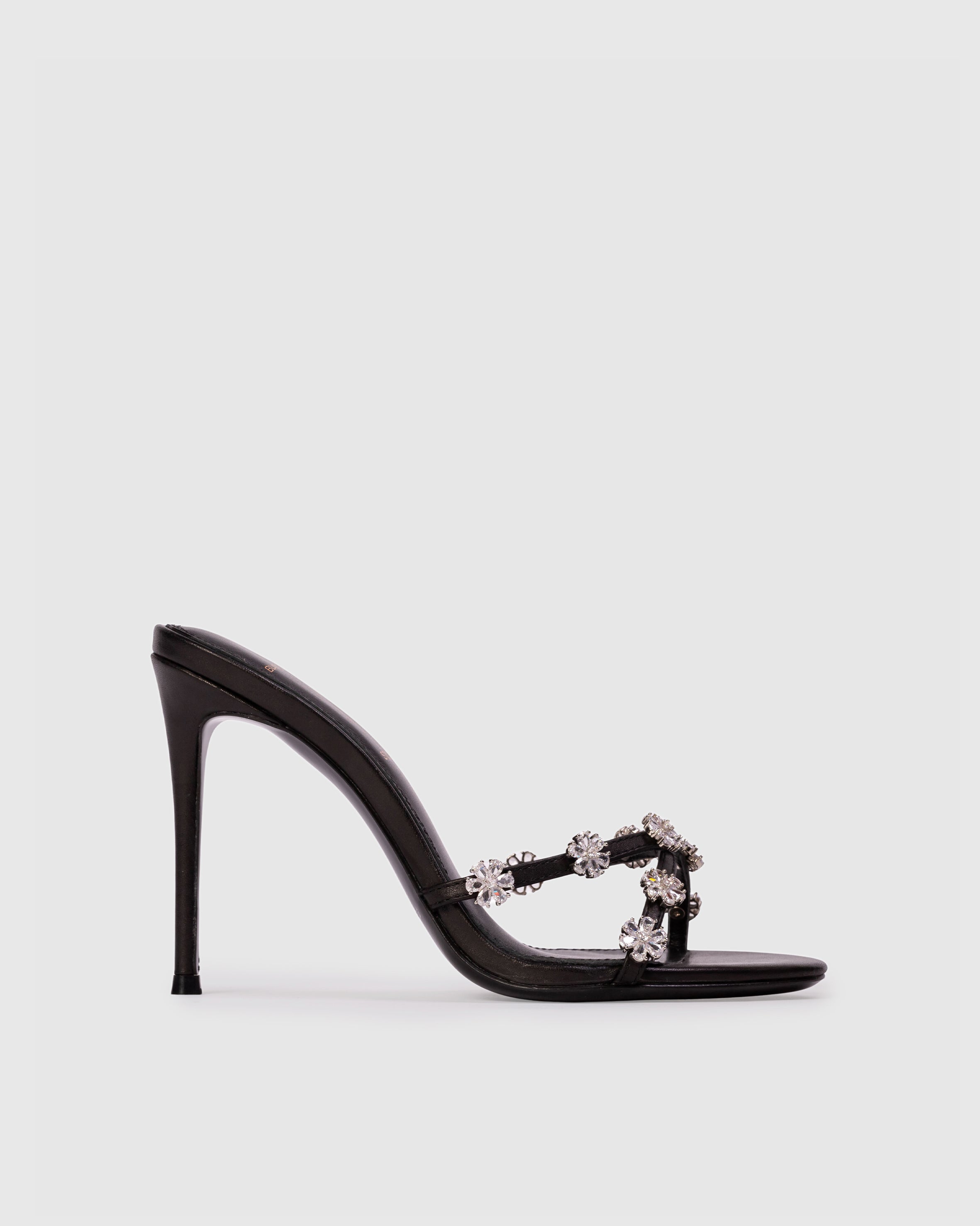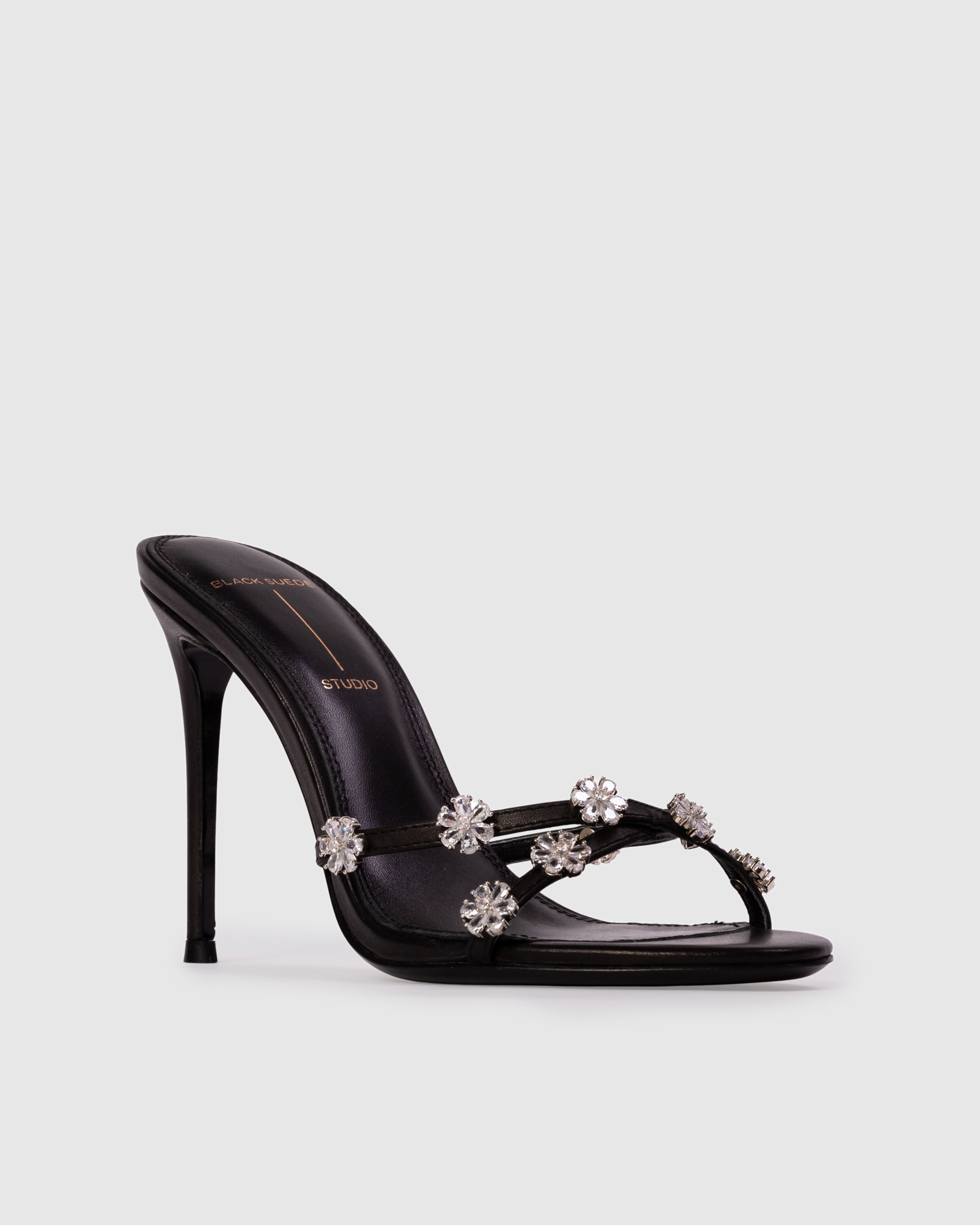 round toe sandal with daisy embellished ornaments, set on a straight stiletto heel. Made with smooth buffed leather.