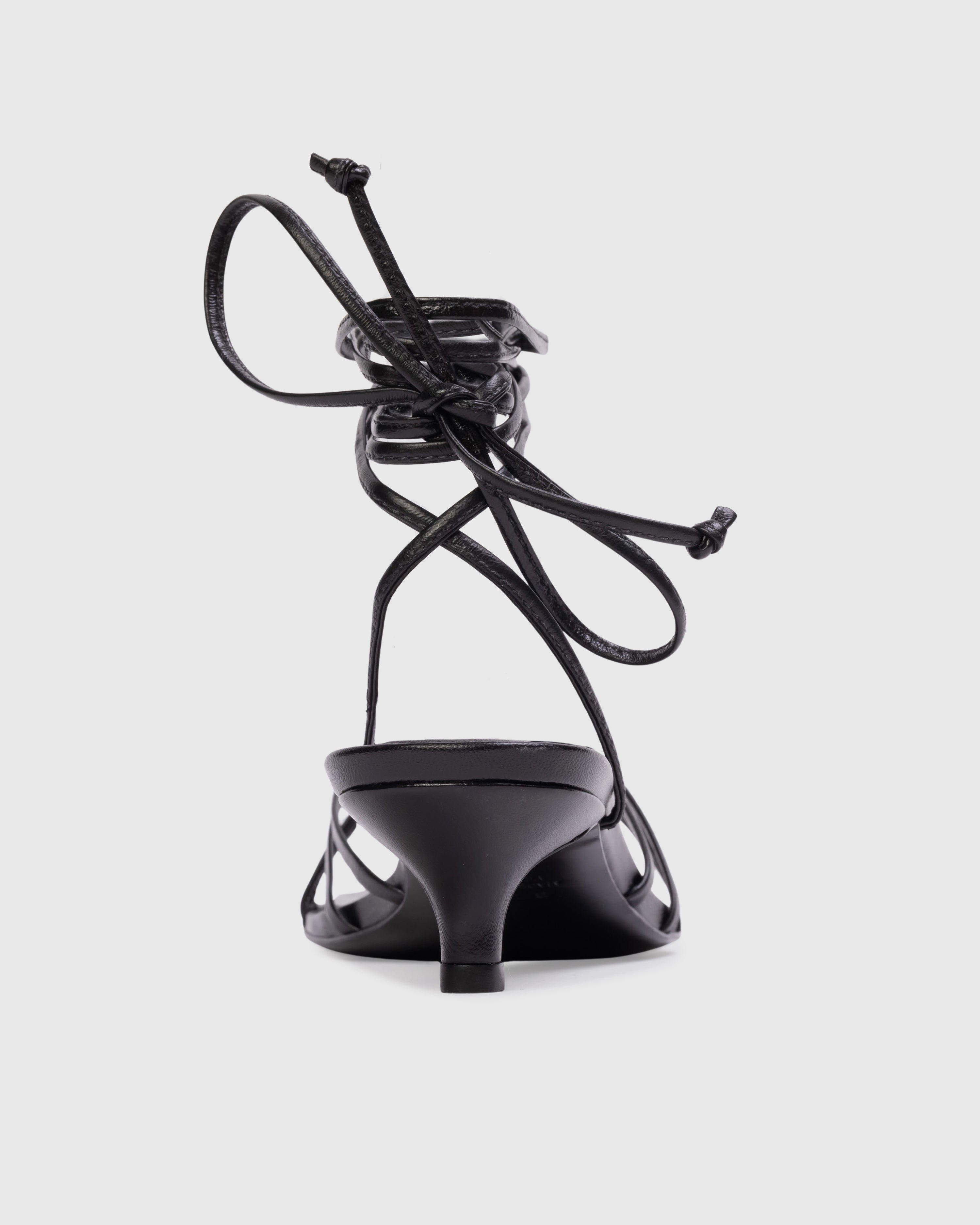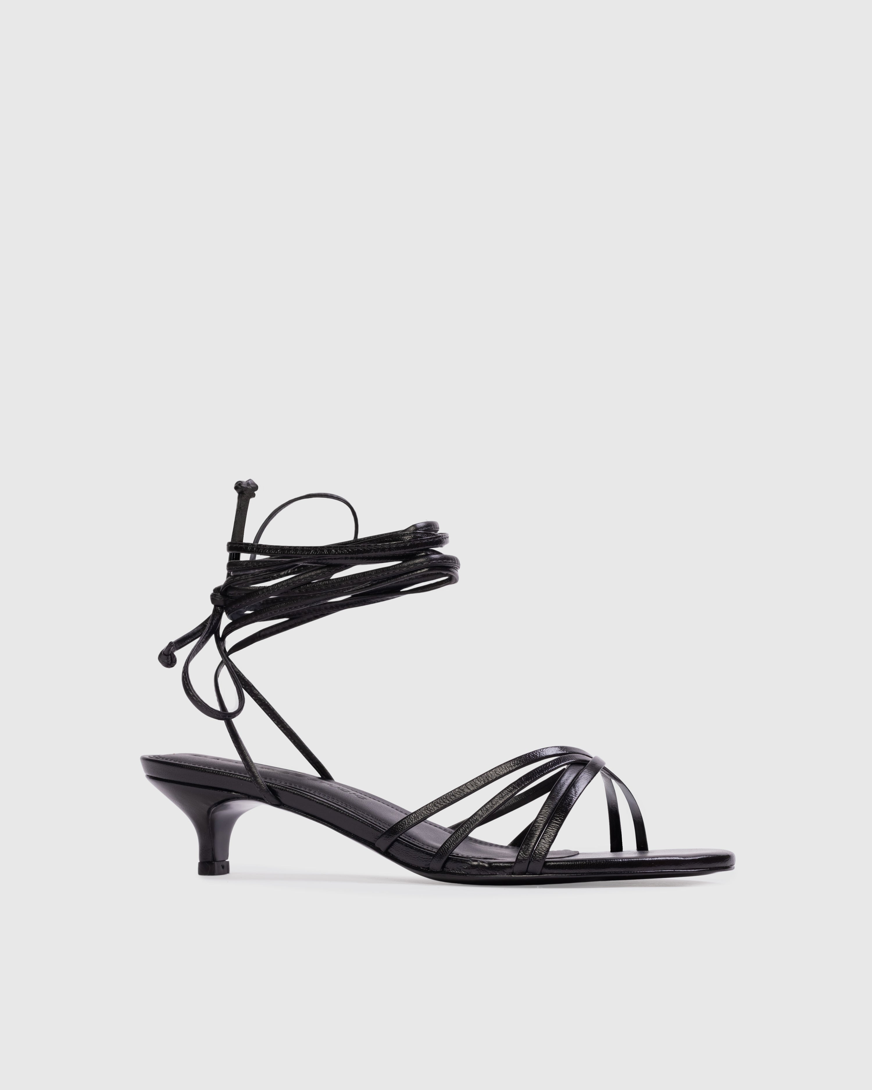 Round toe strappy sandal with wrap up laces, set on a kitten heel