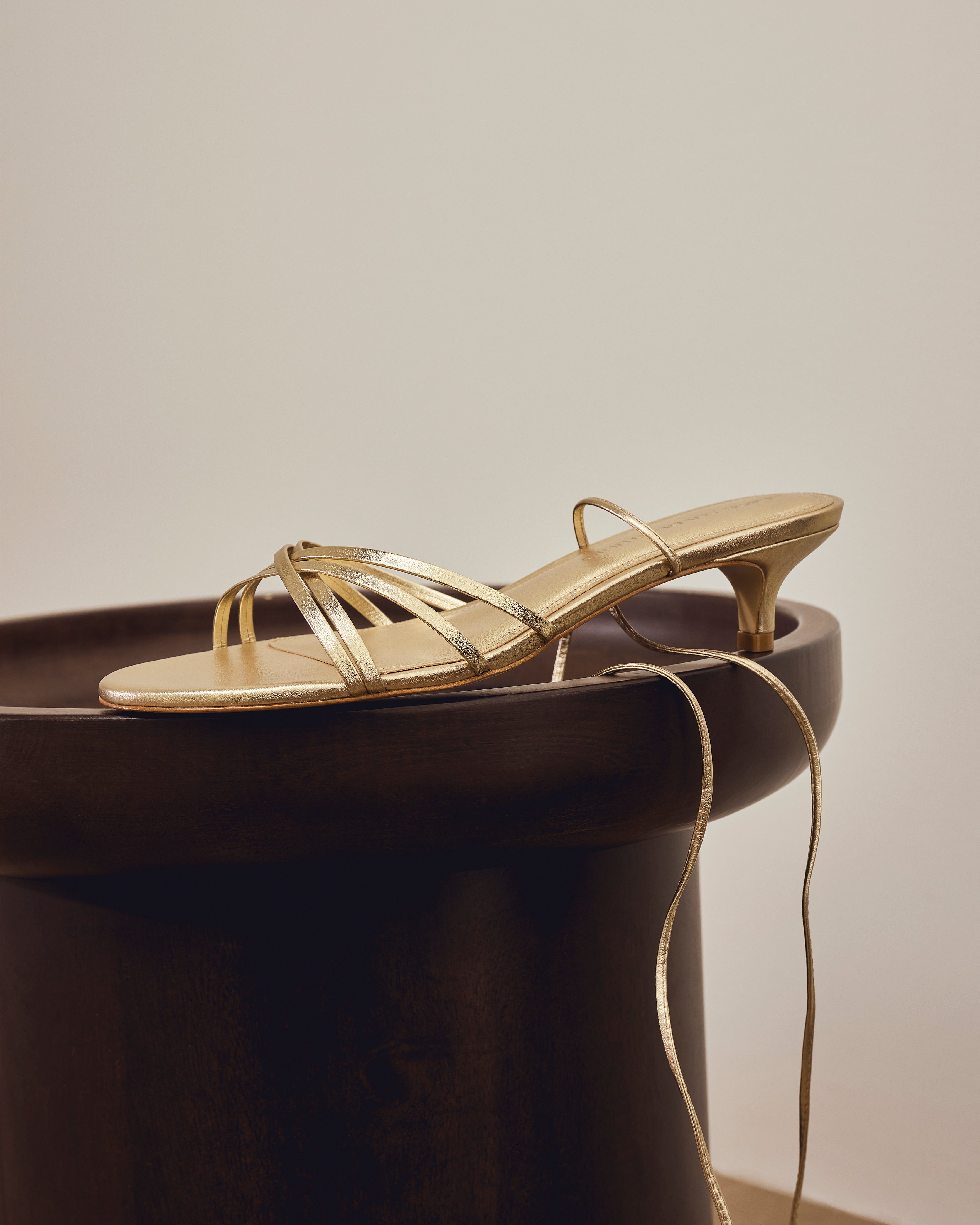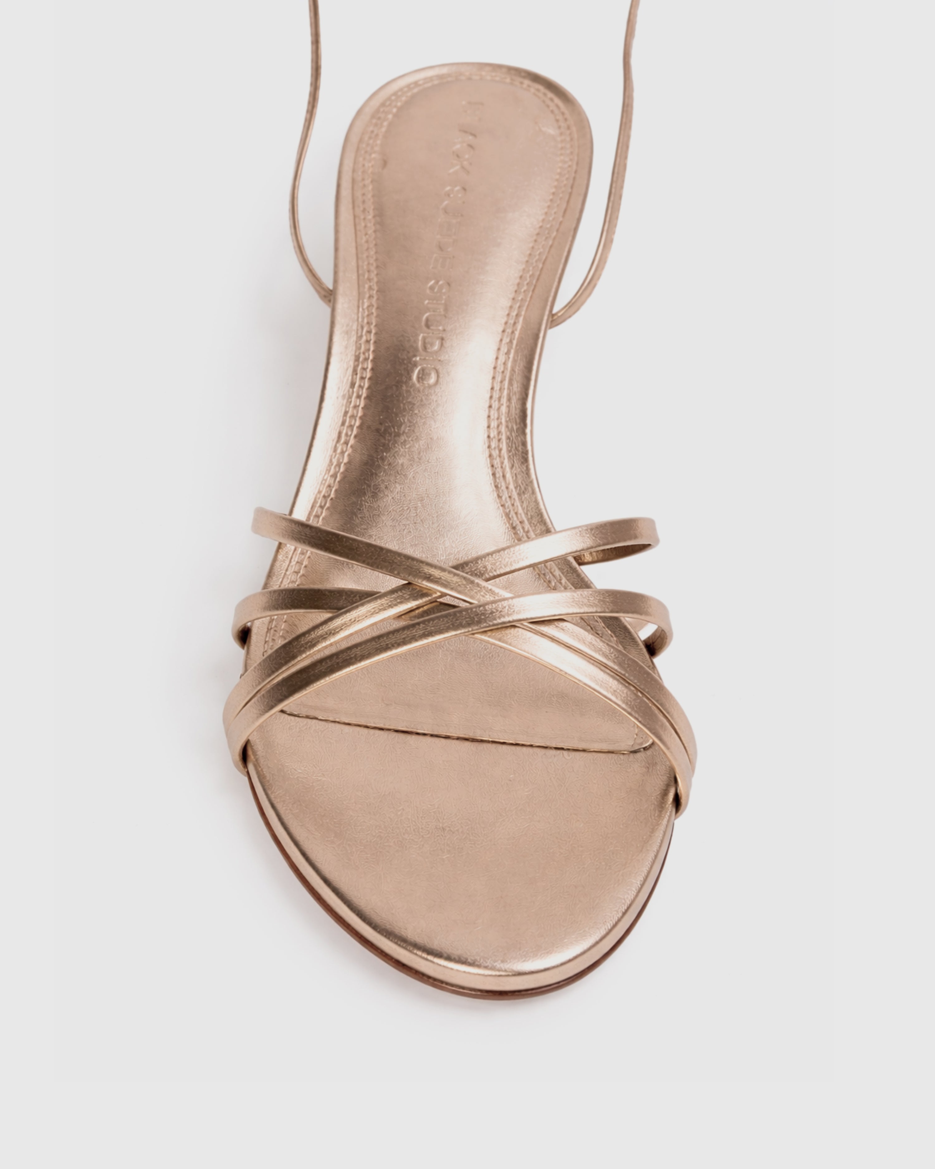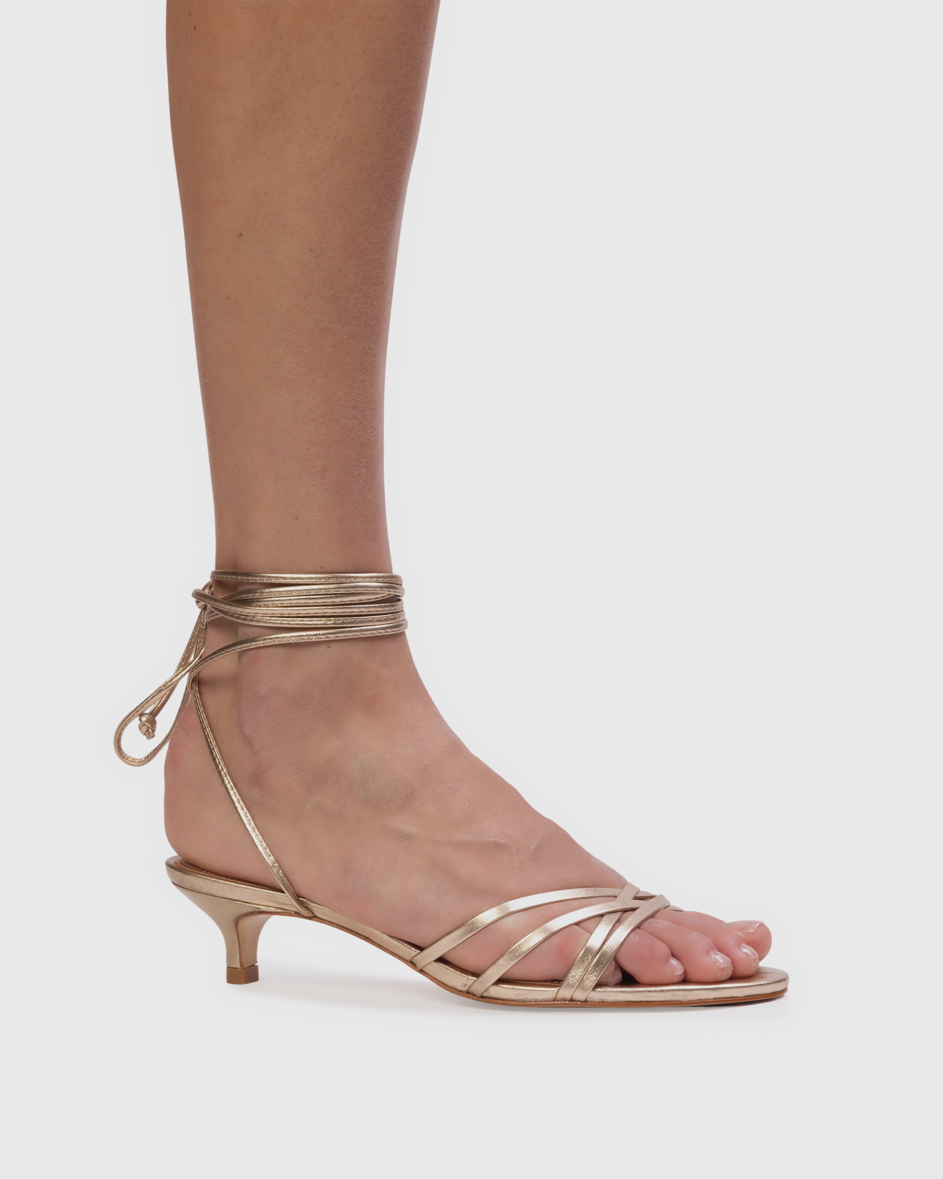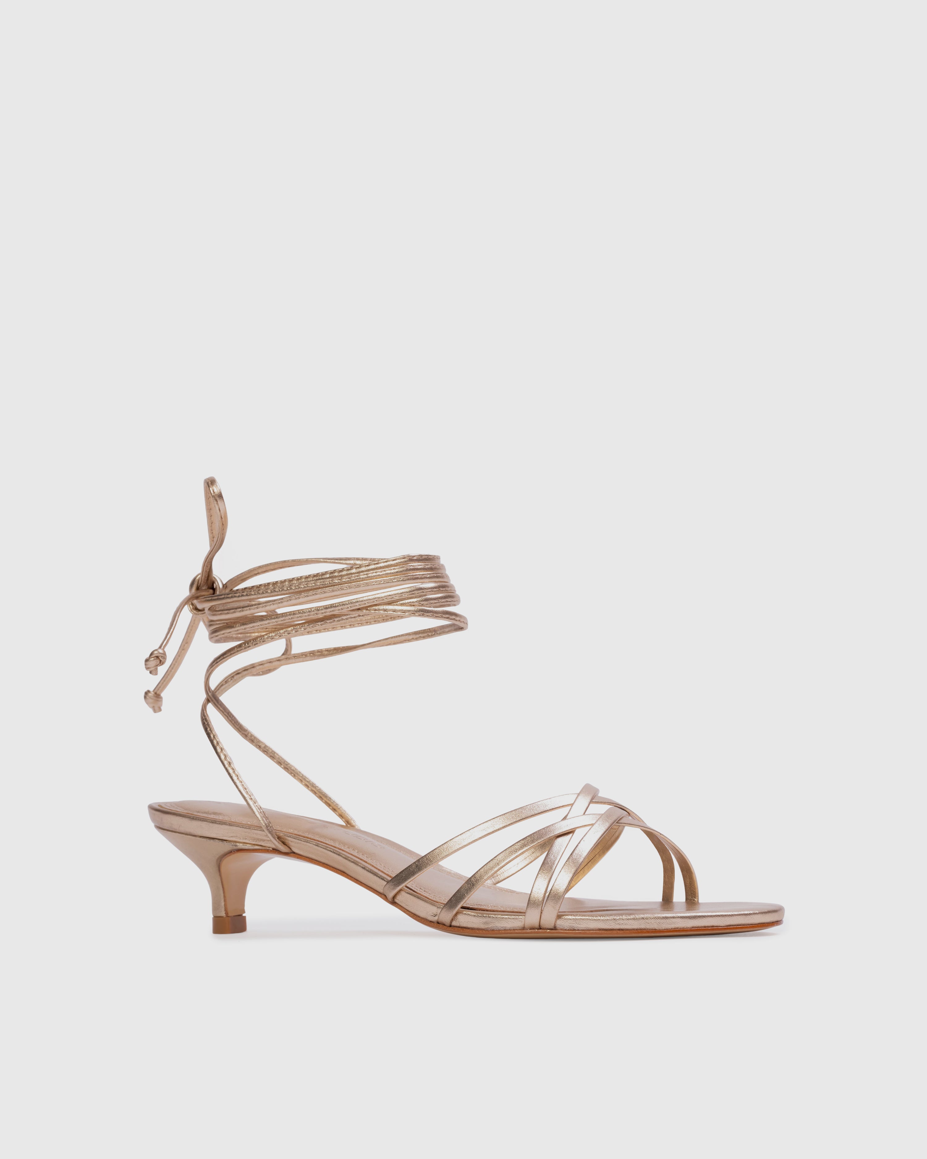 Round toe strappy sandal with wrap up laces, set on a kitten heel