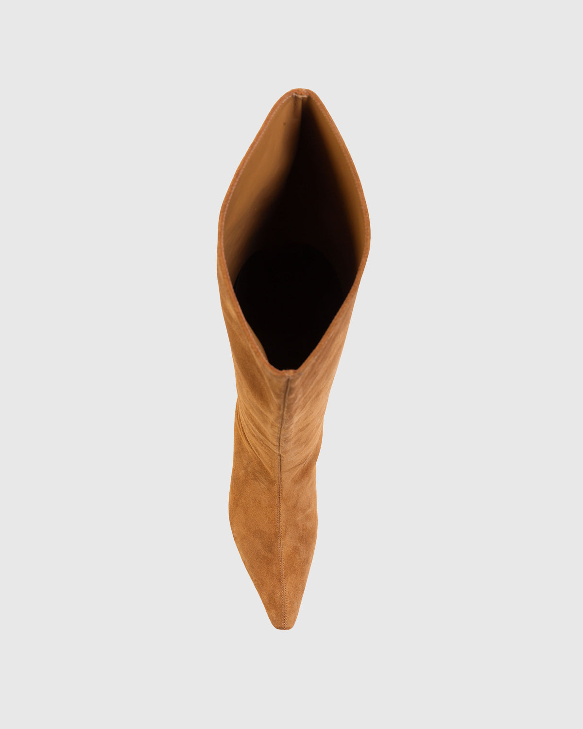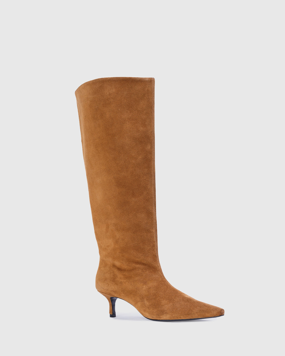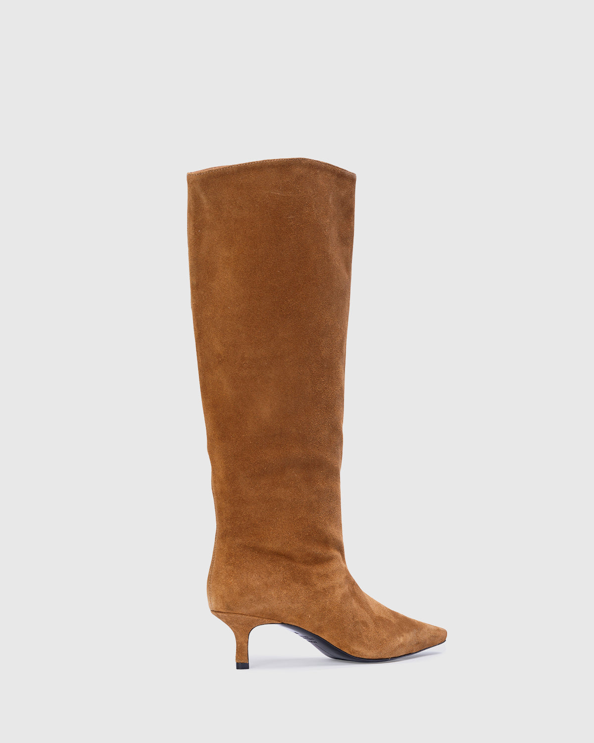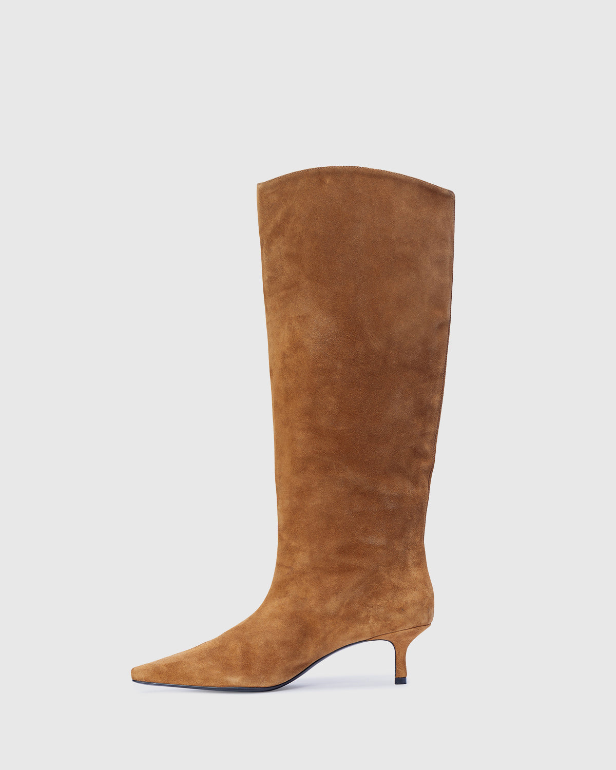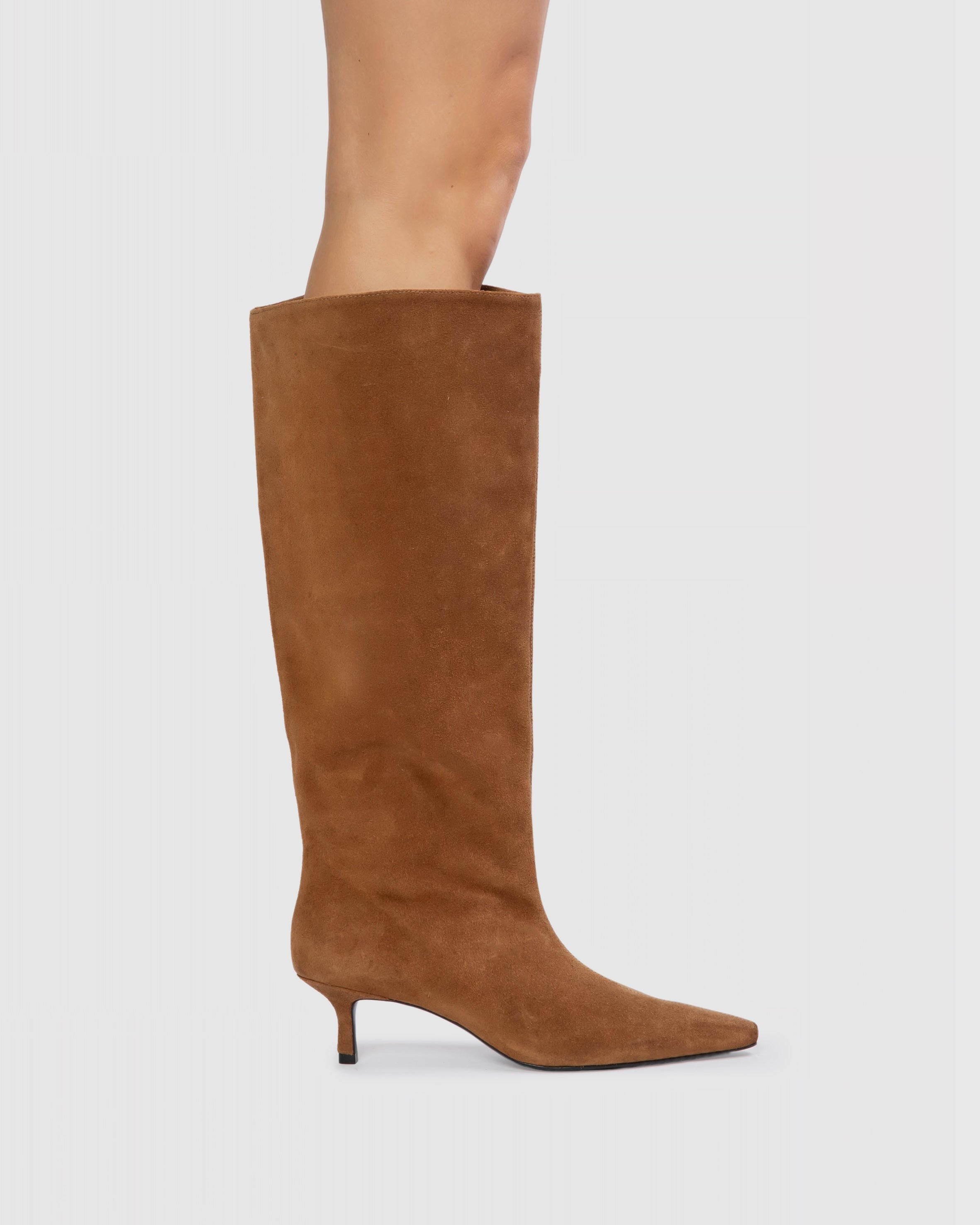 Pointy toe wide shaft below the knee boot, set on a curved low heel. Made with brushed viena calf suede.