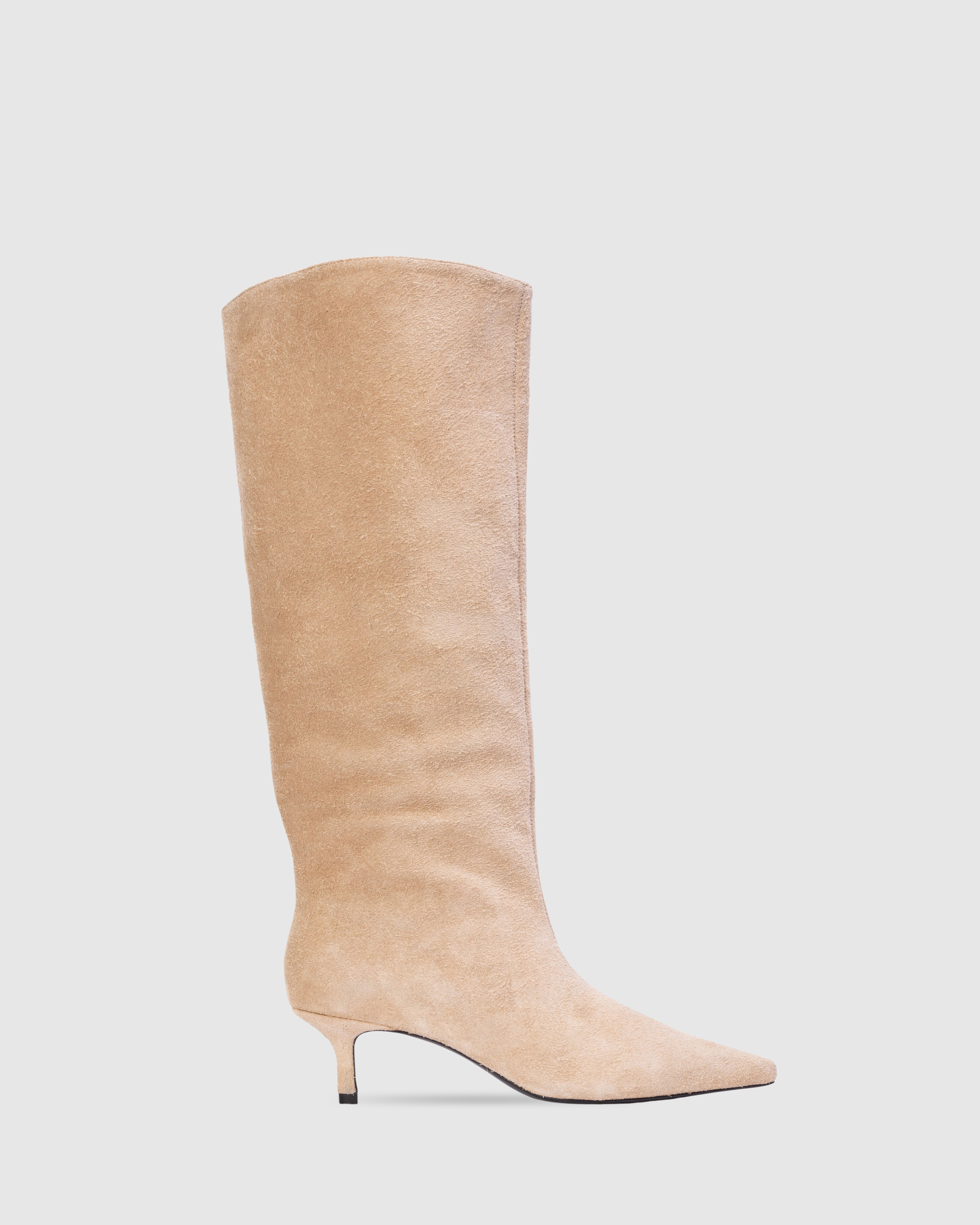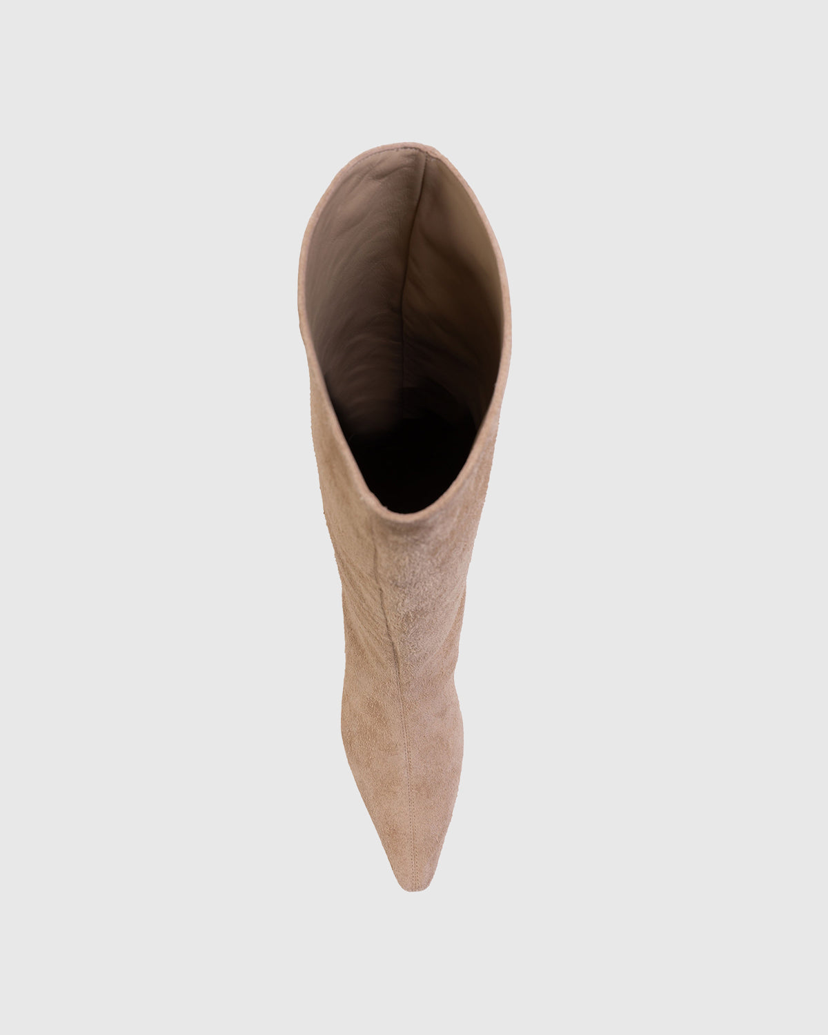 Pointy toe wide shaft below the knee boot, set on a curved low heel. Made with fuzzy pelego calf suede.