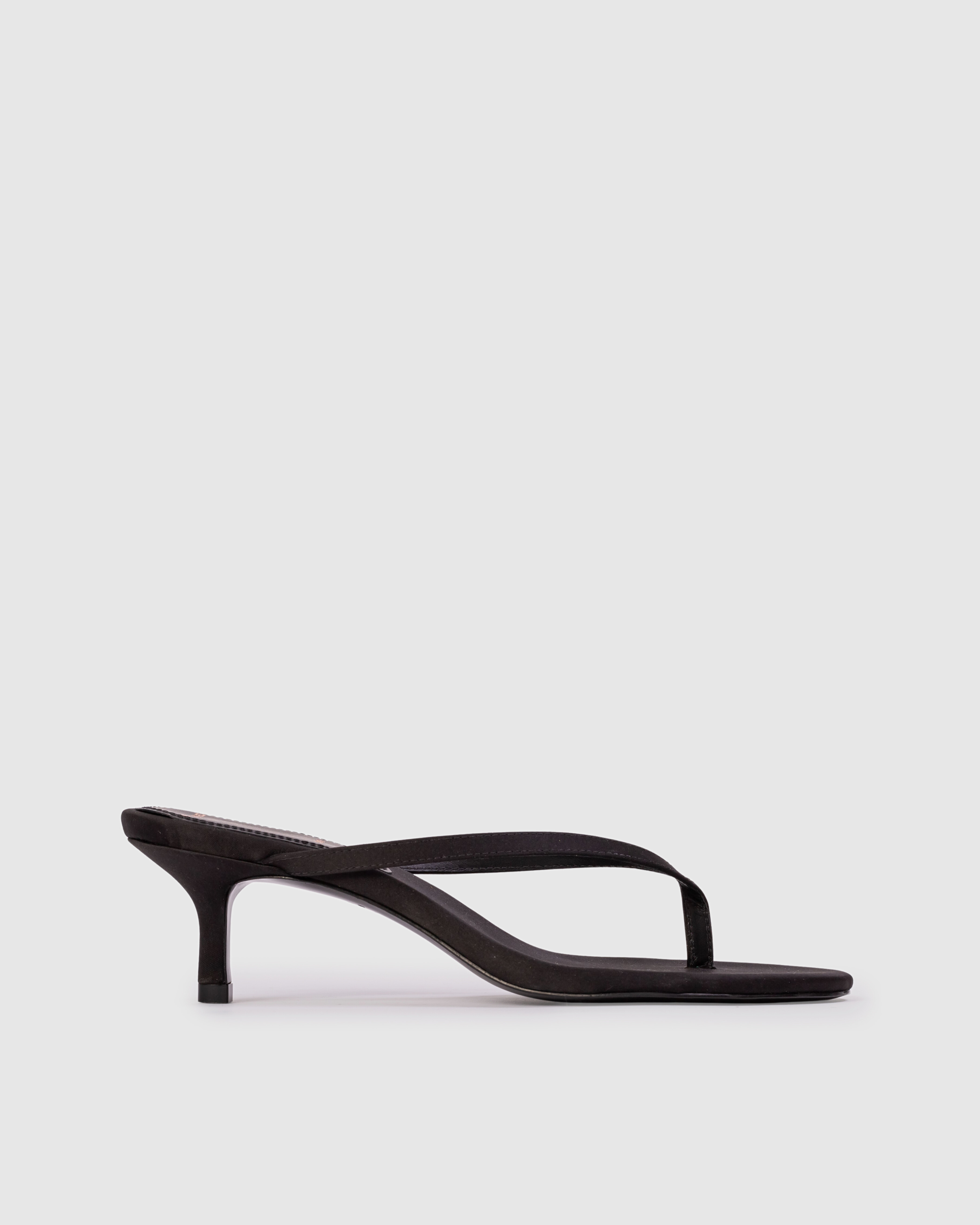 round toe thong slipper mule, set on a curved kitten heel. Made with crepe satin.