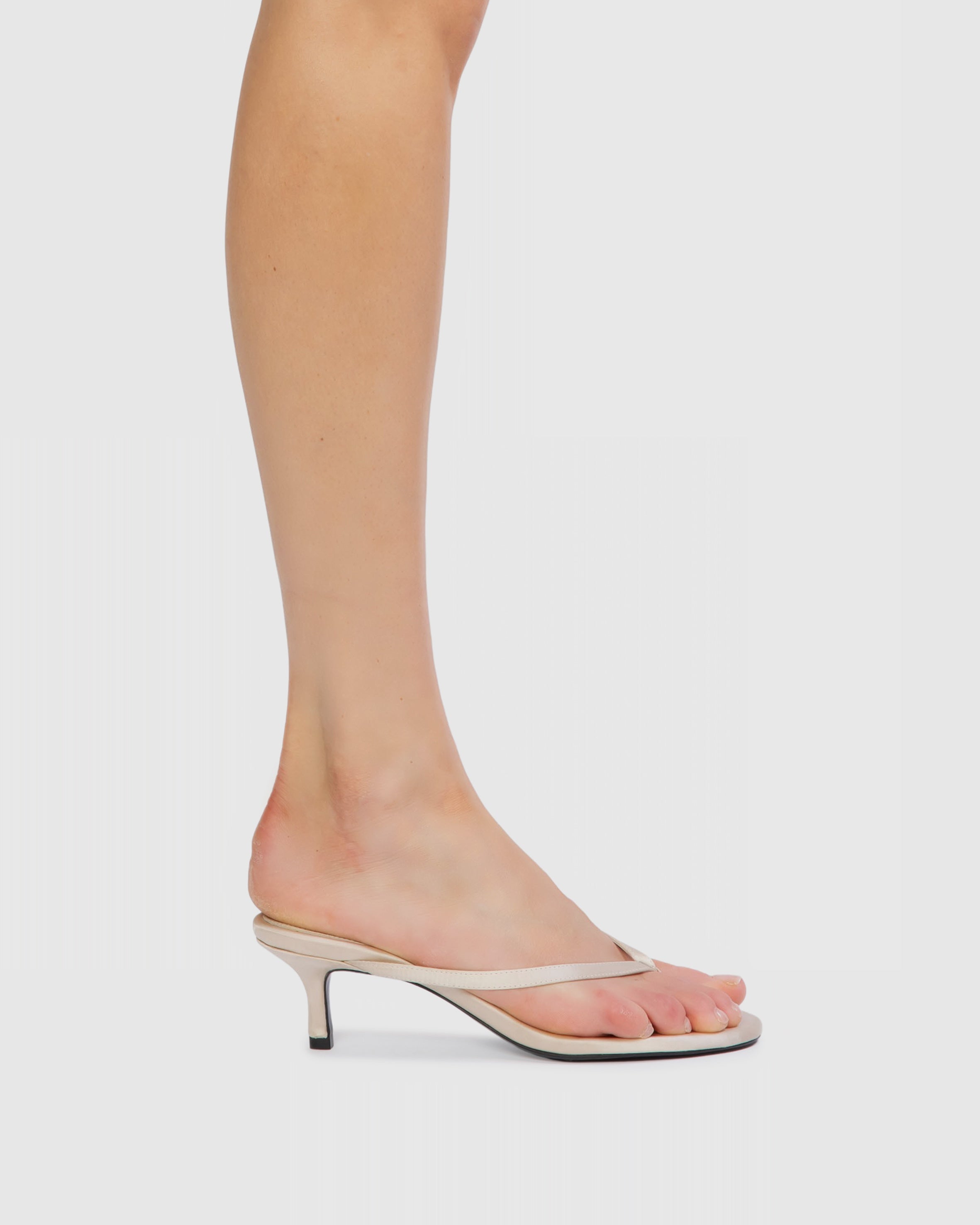 round toe thong slipper mule, set on a curved kitten heel. Made with crepe satin.