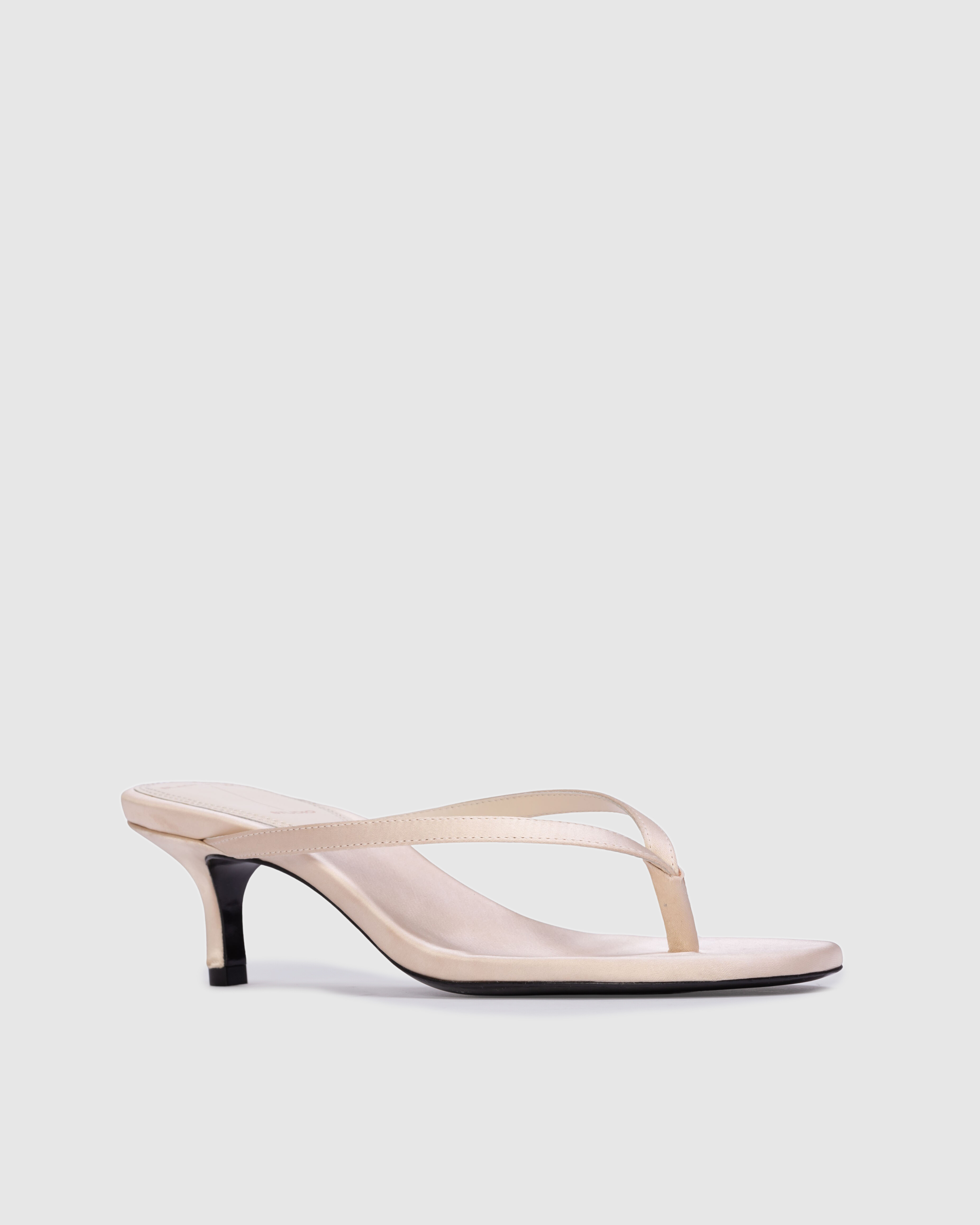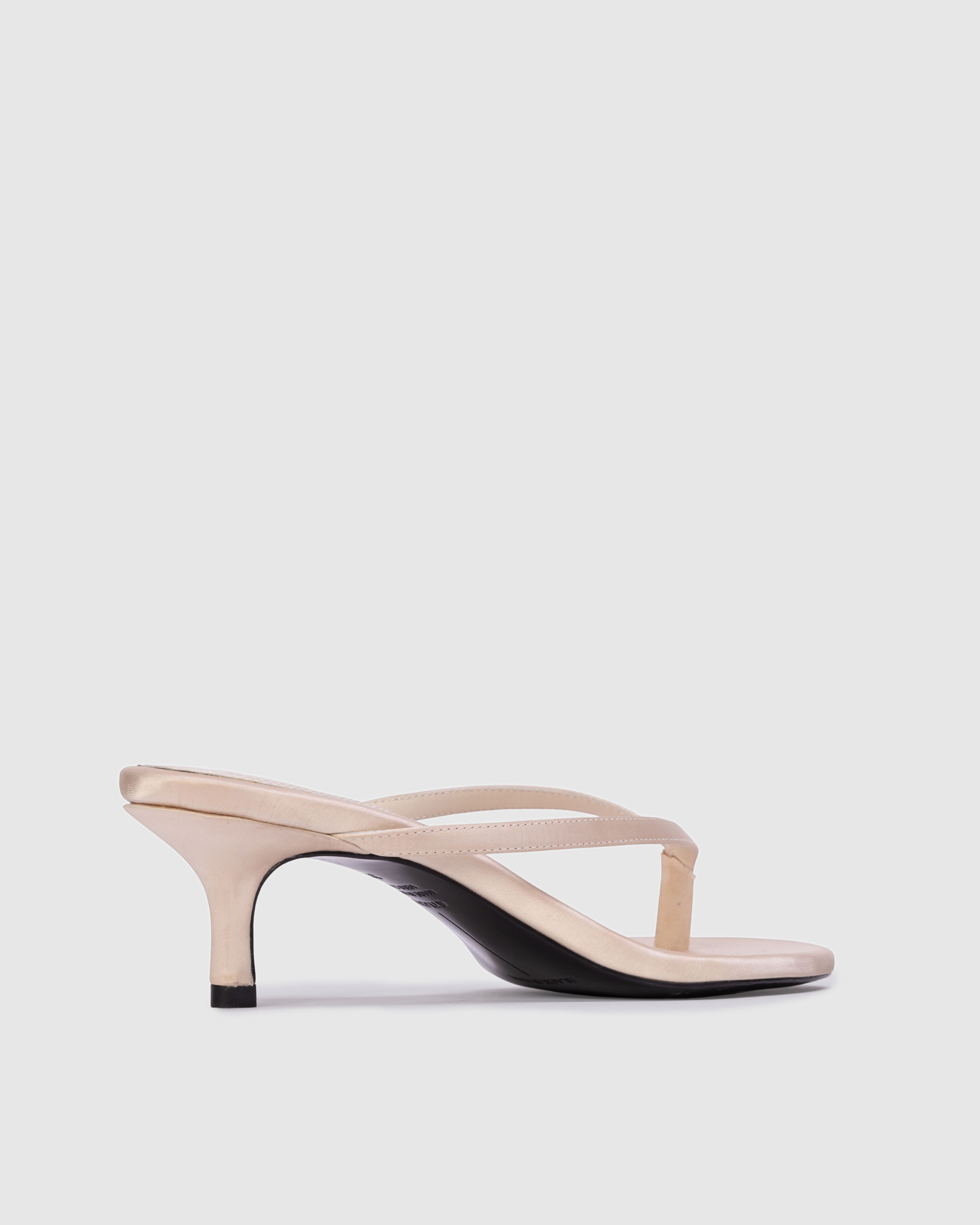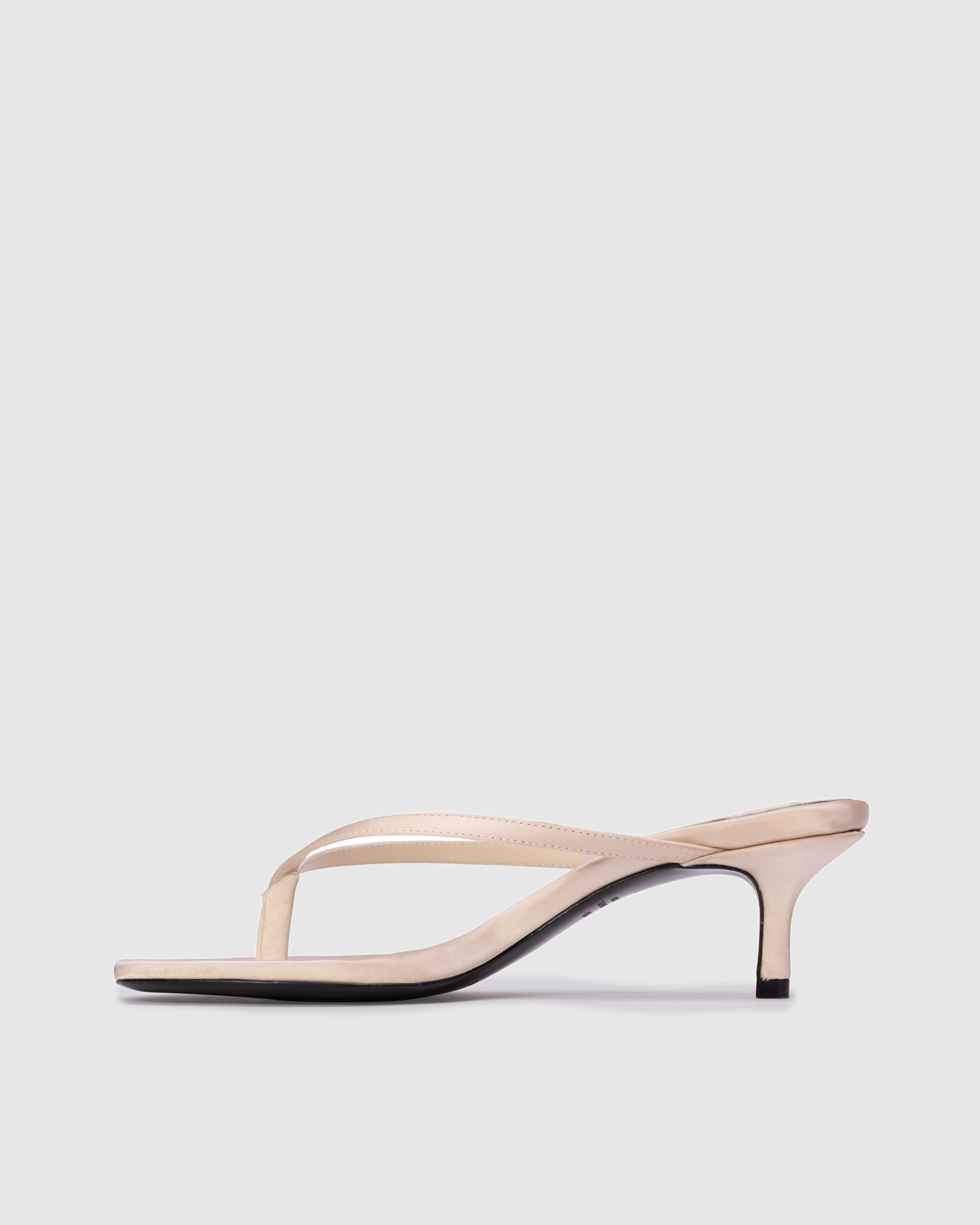 round toe thong slipper mule, set on a curved low thong heels. Made with crepe satin.