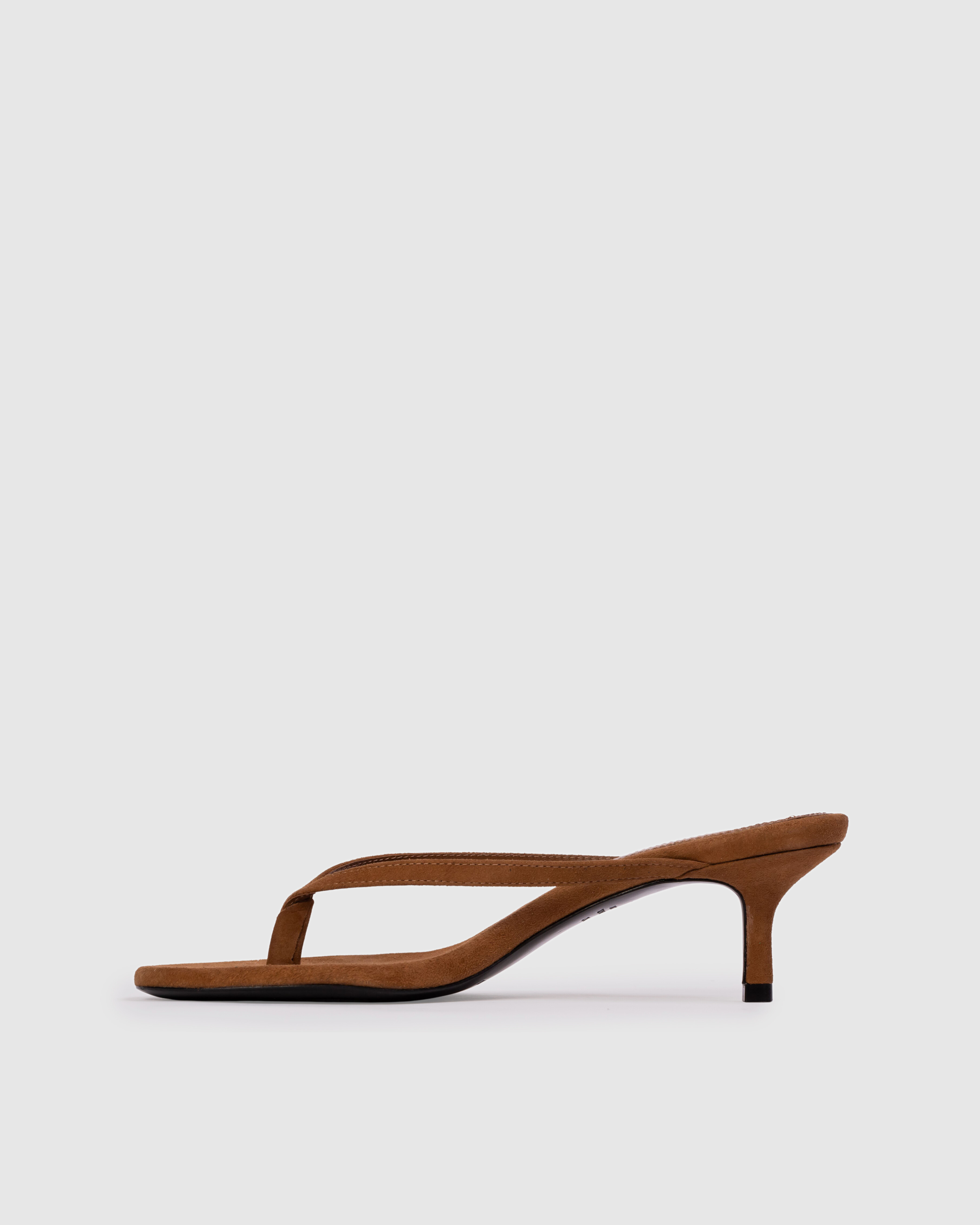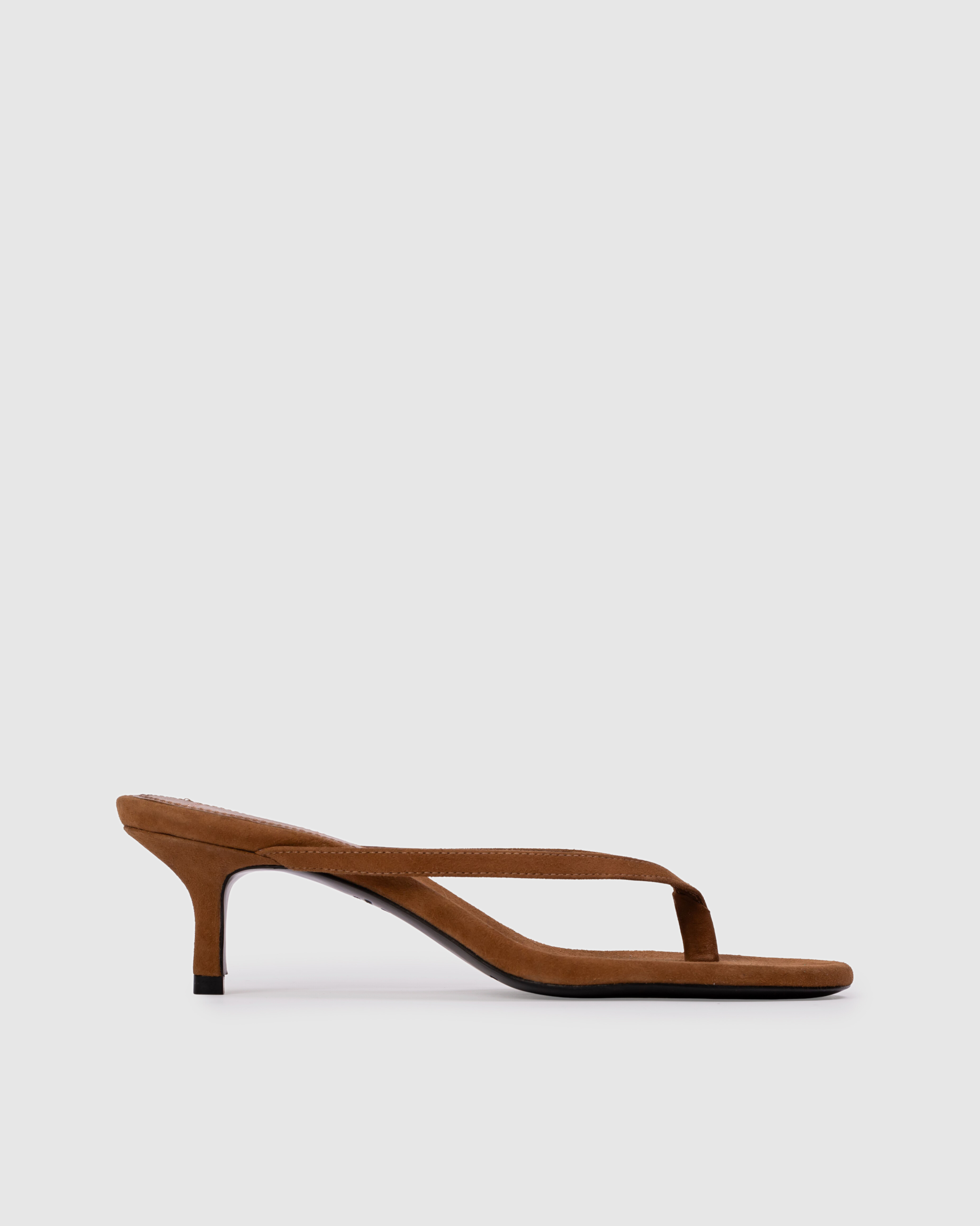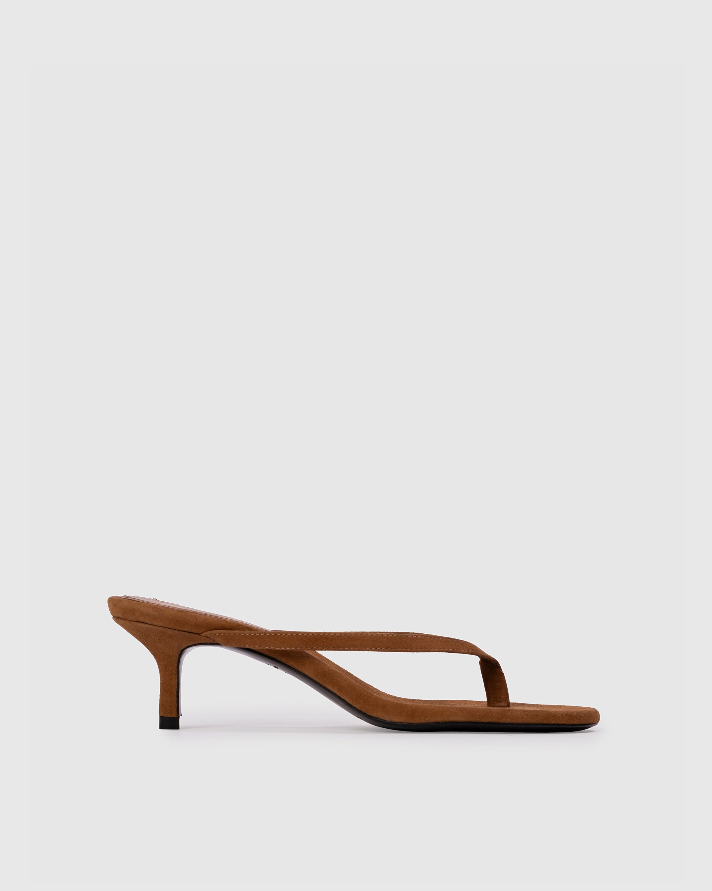 round toe thong slipper mule, set on a curved kitten heel. Made with brushed kid suede.