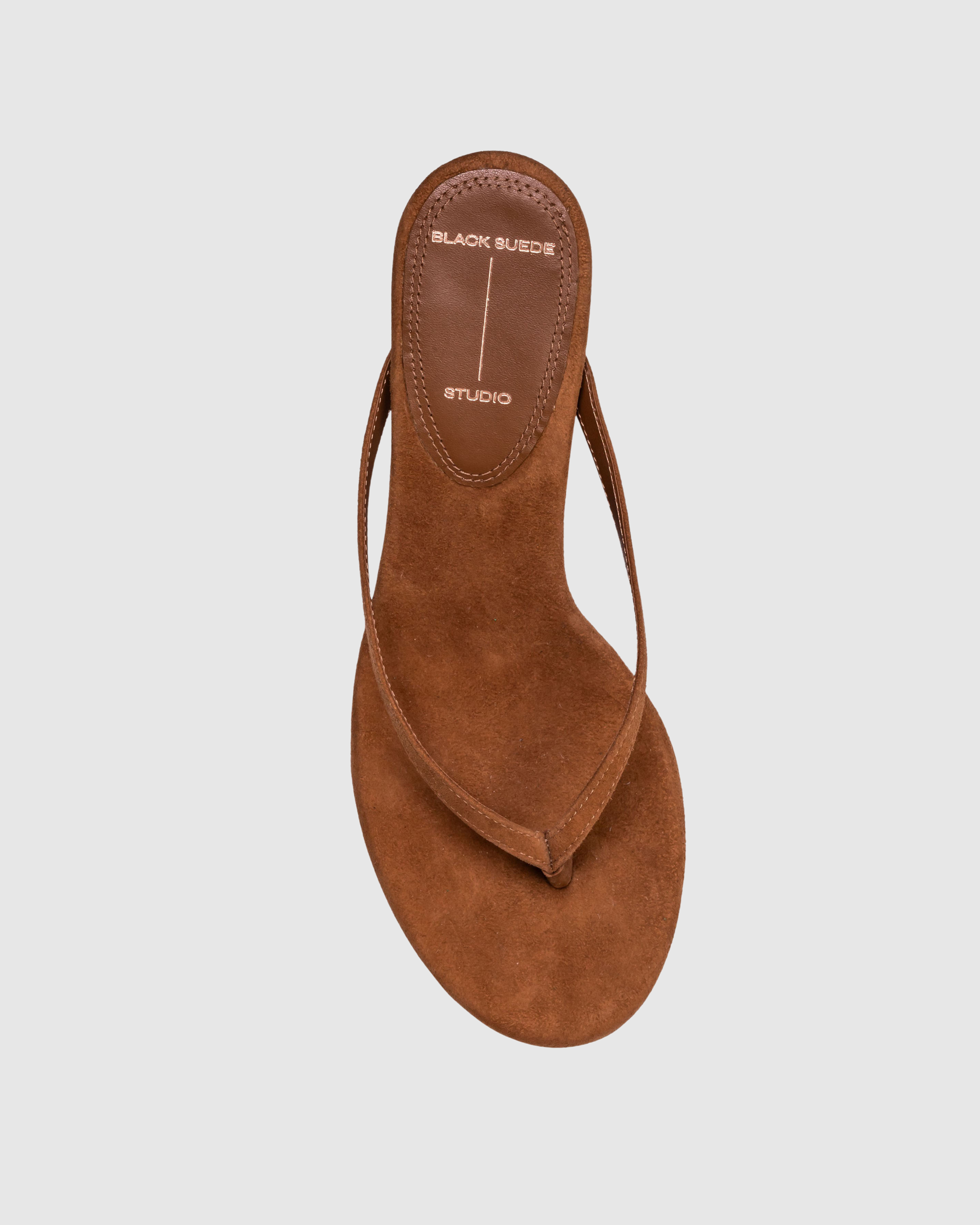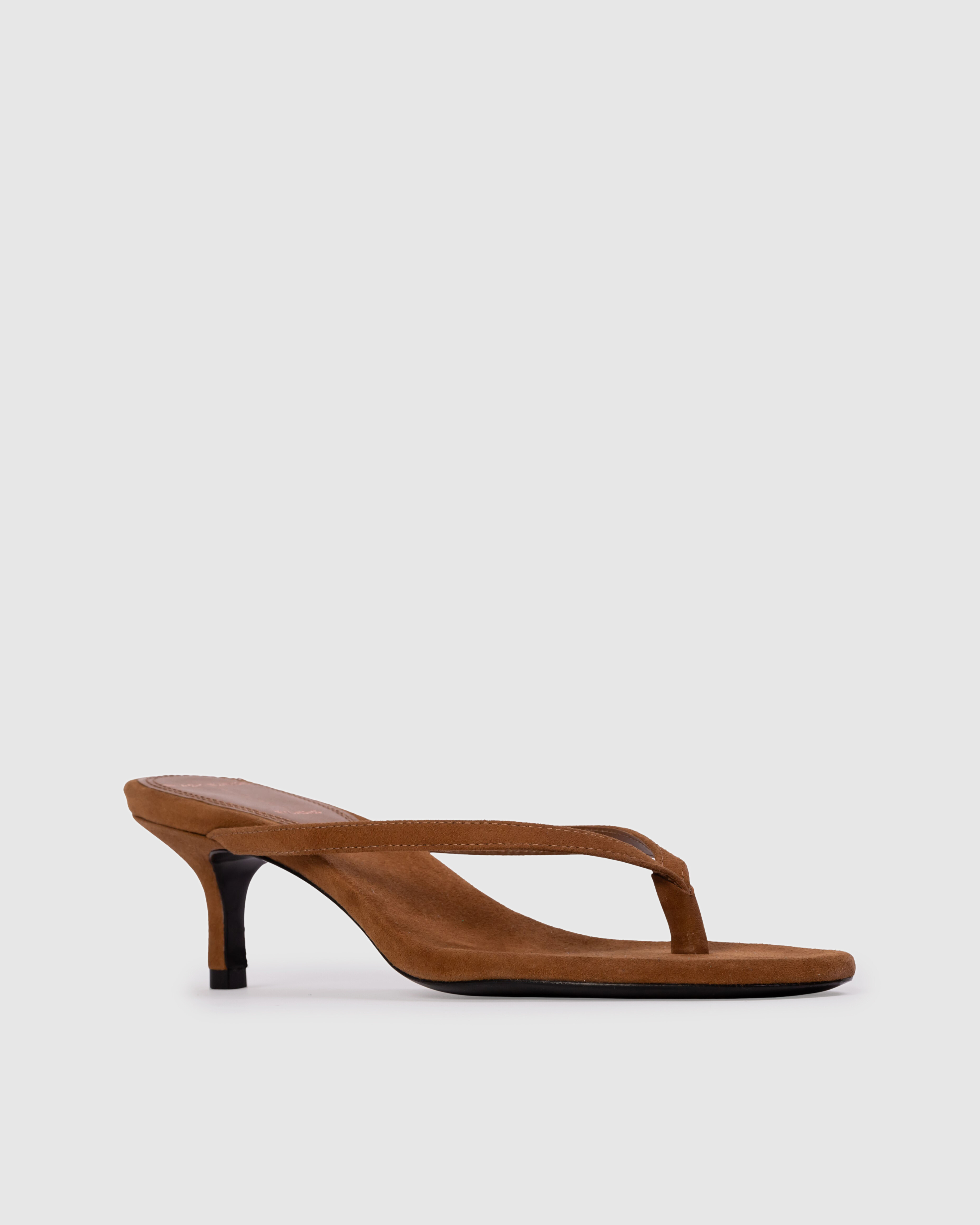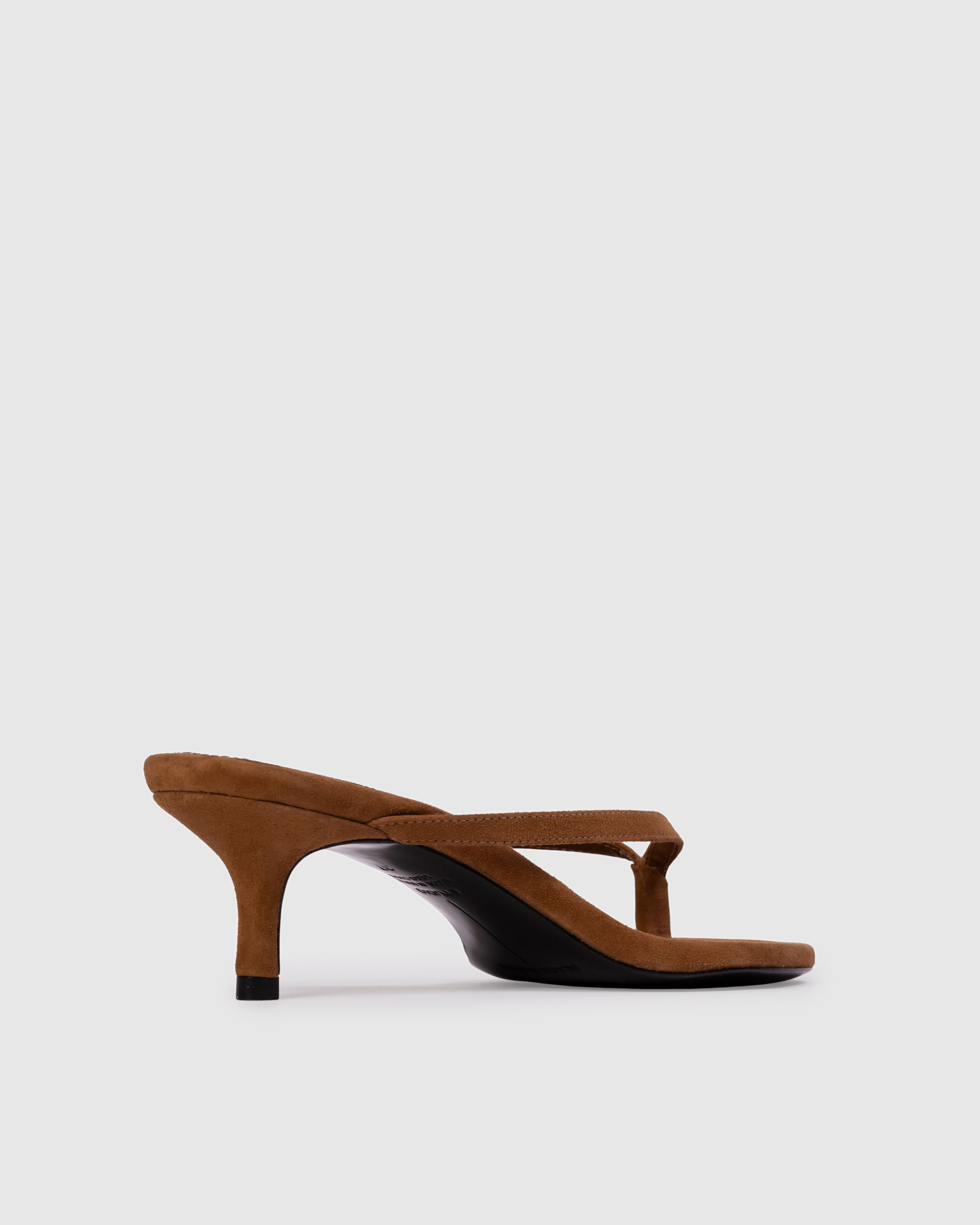 round toe thong slipper mule, set on a curved kitten heel. Made with brushed kid suede.