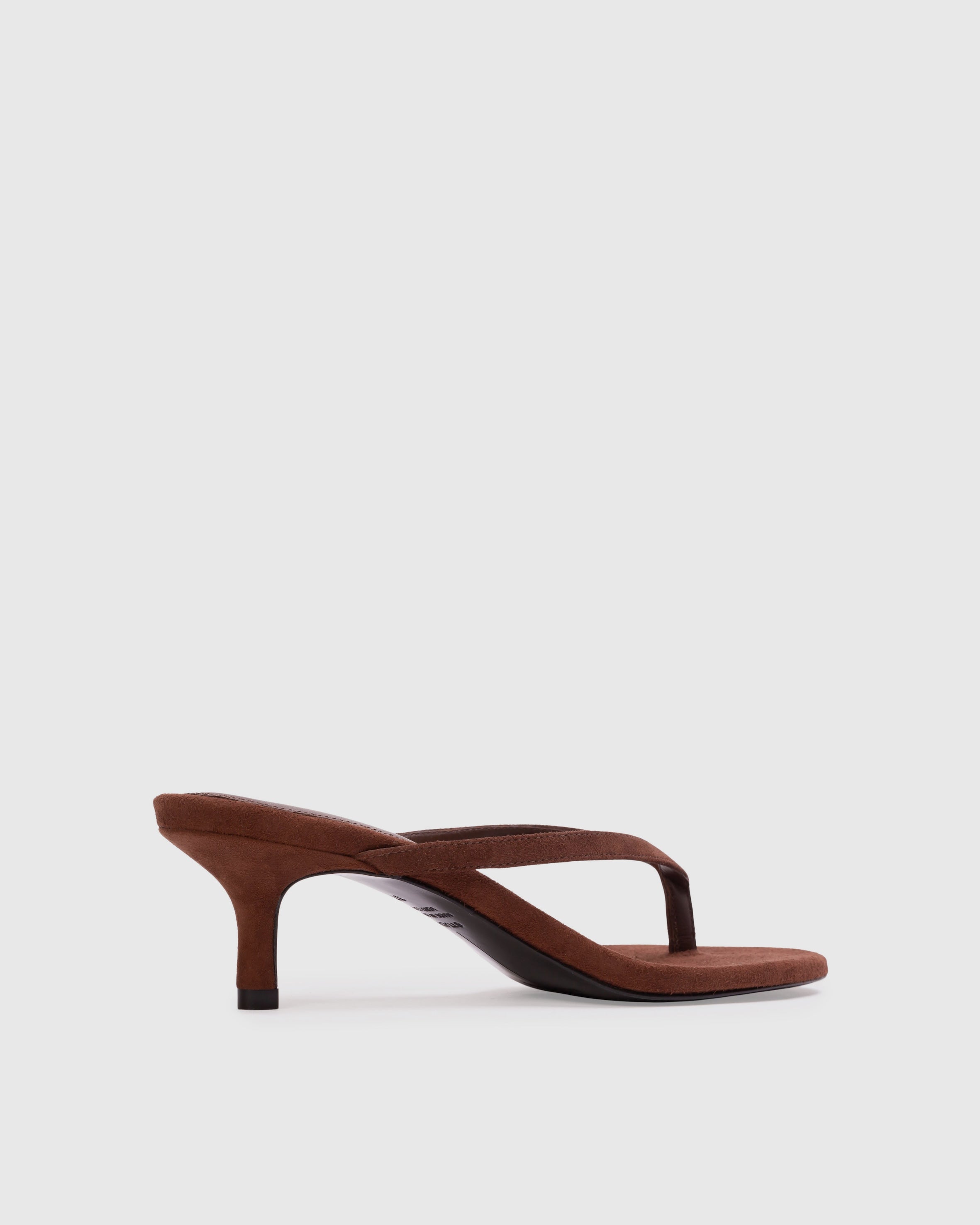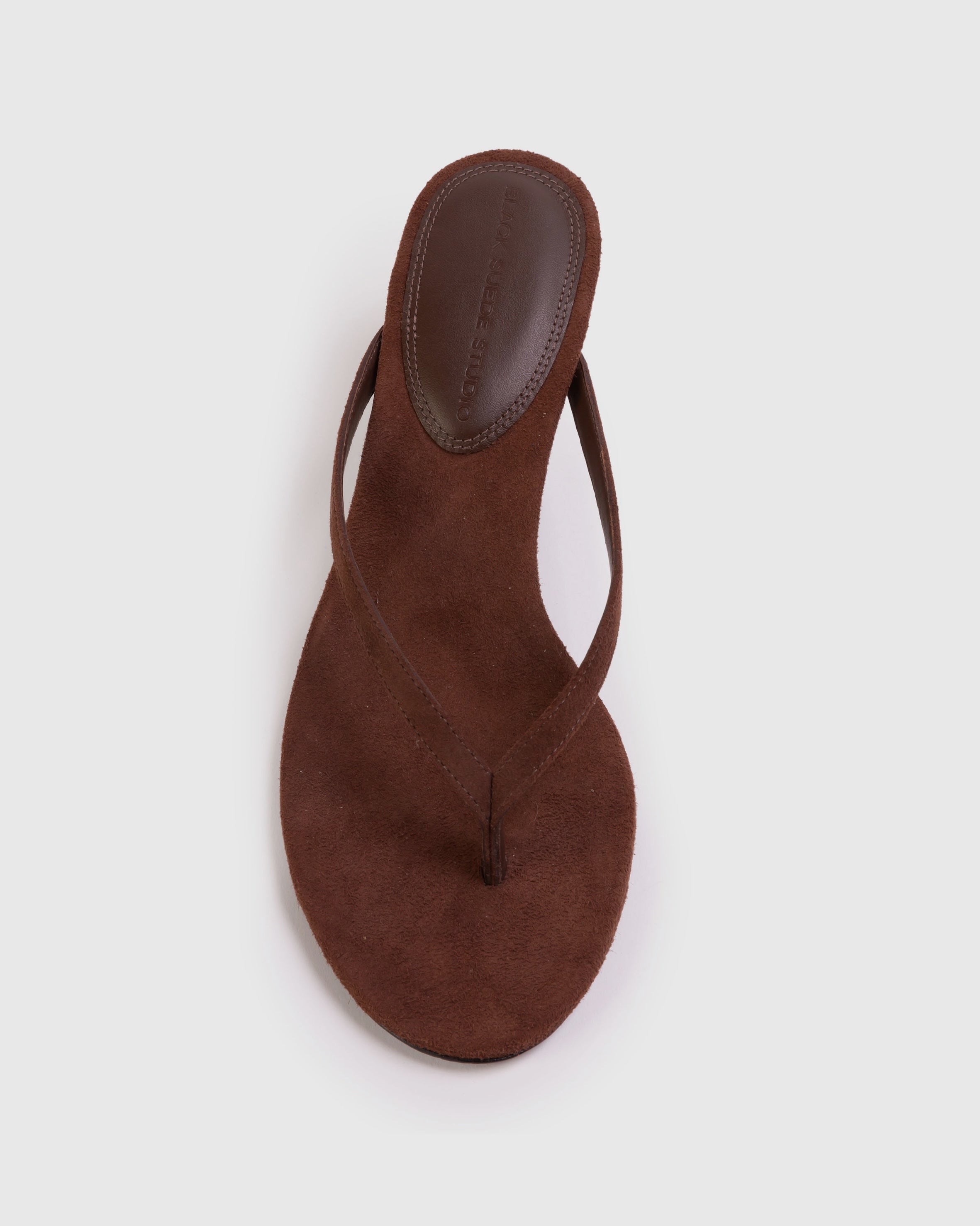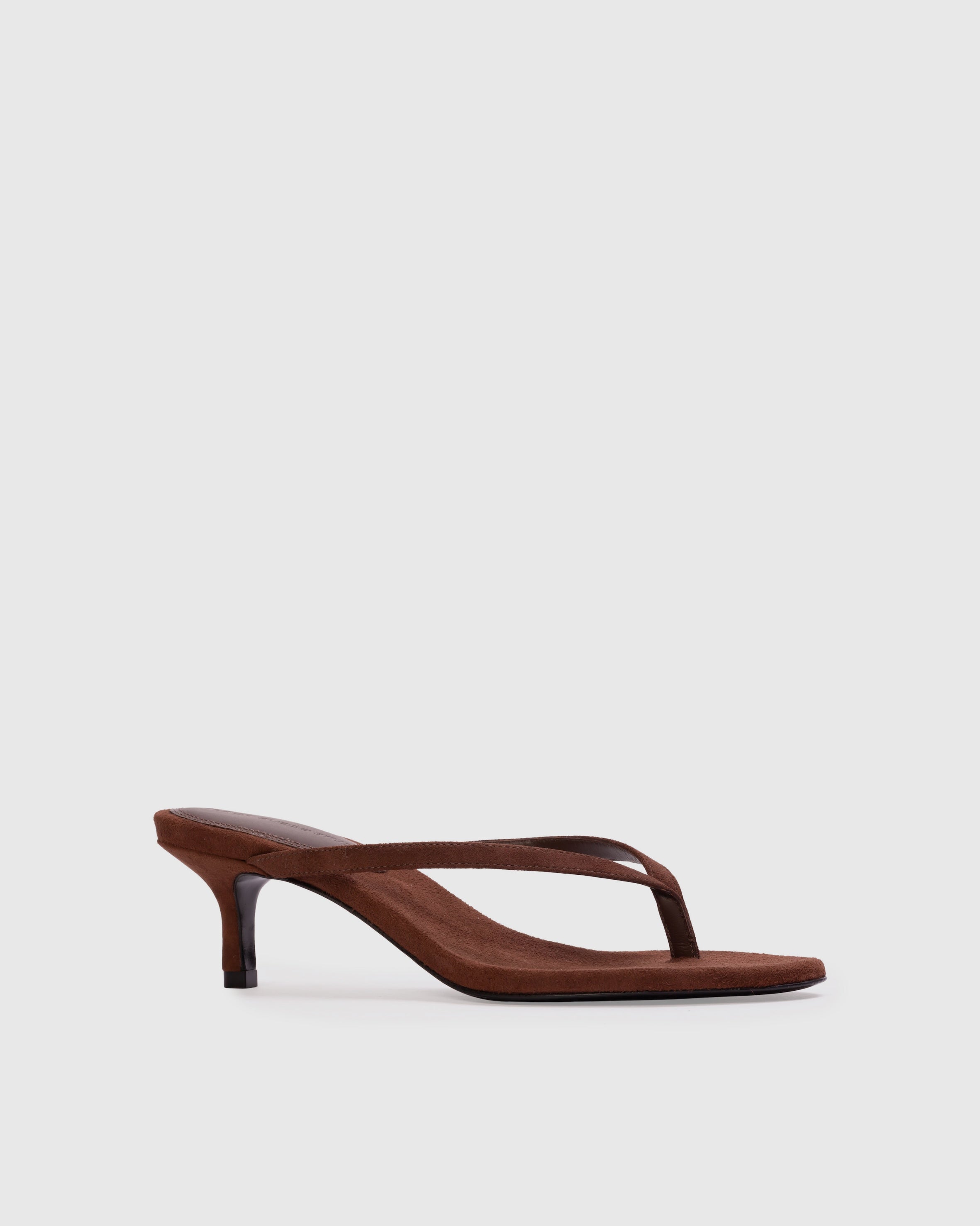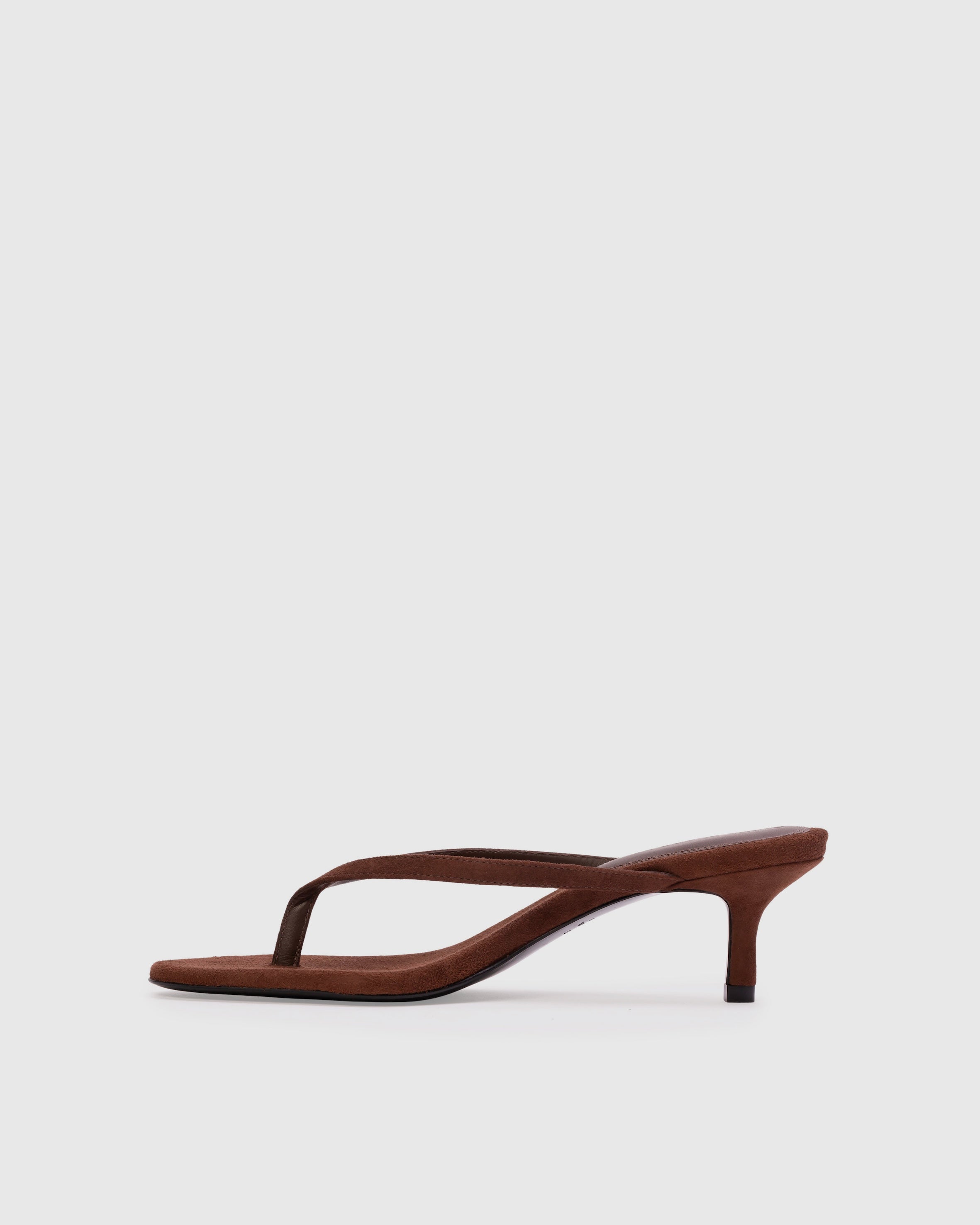round toe thong slipper mule, set on a curved kitten heel. Made with brushed kid suede.