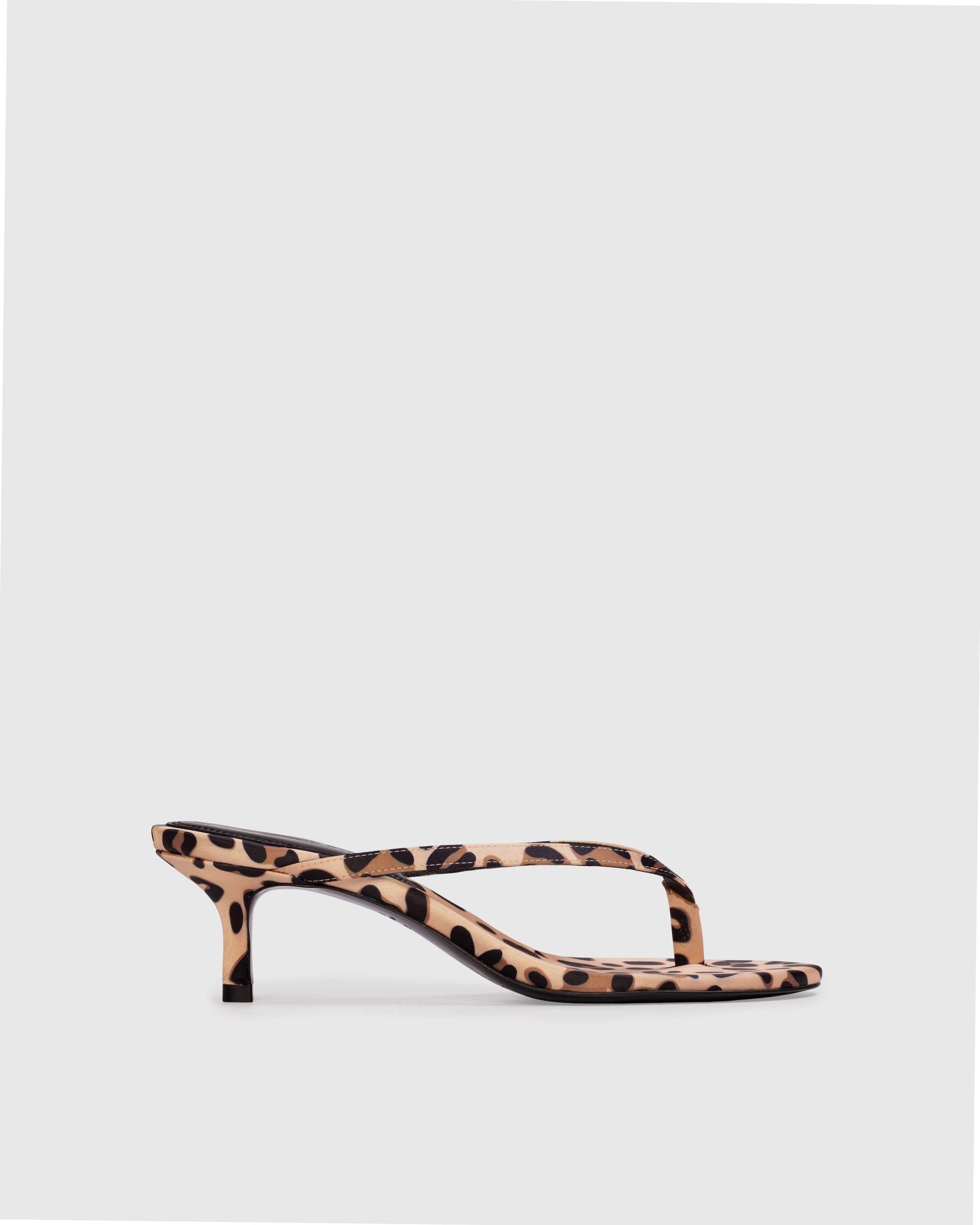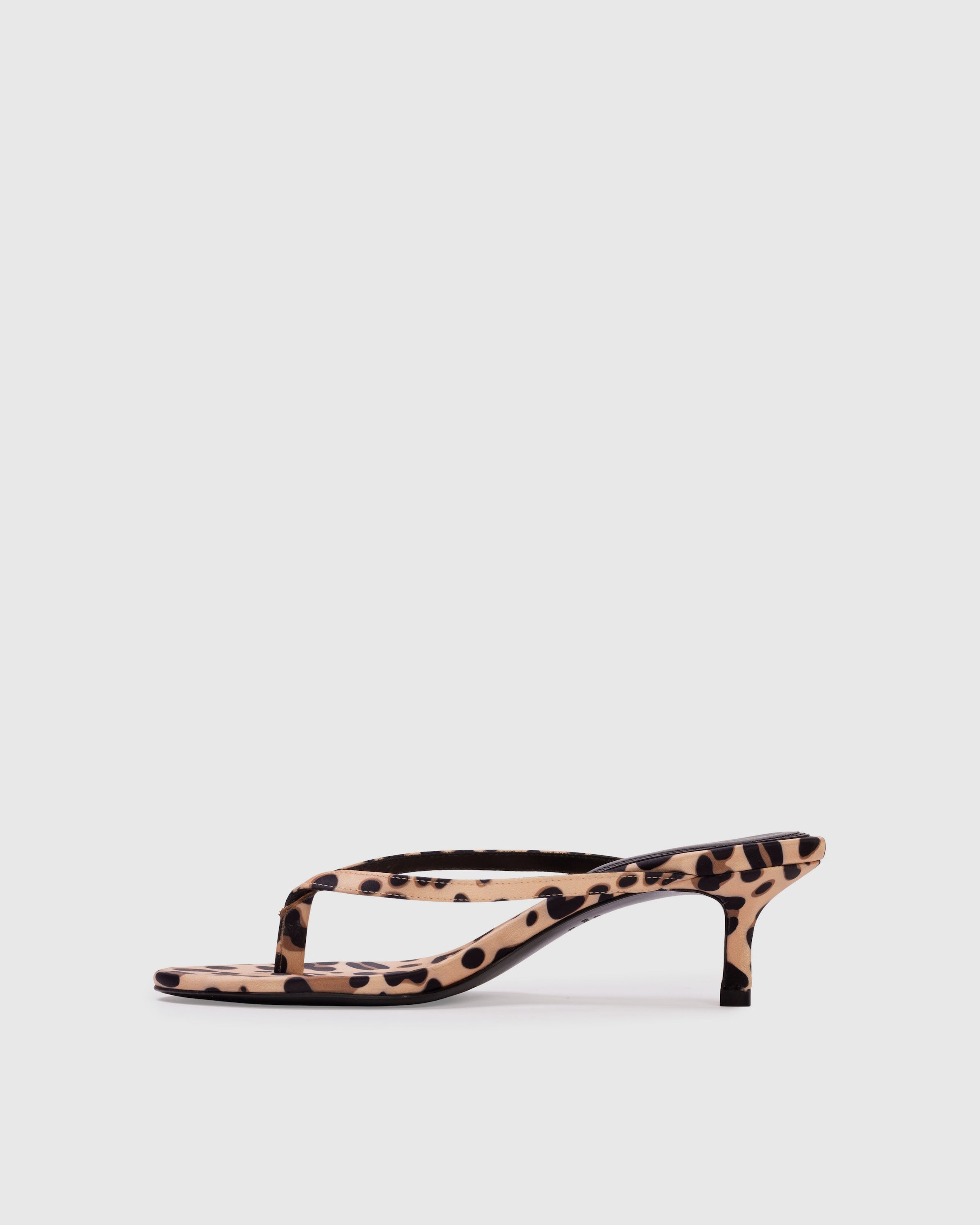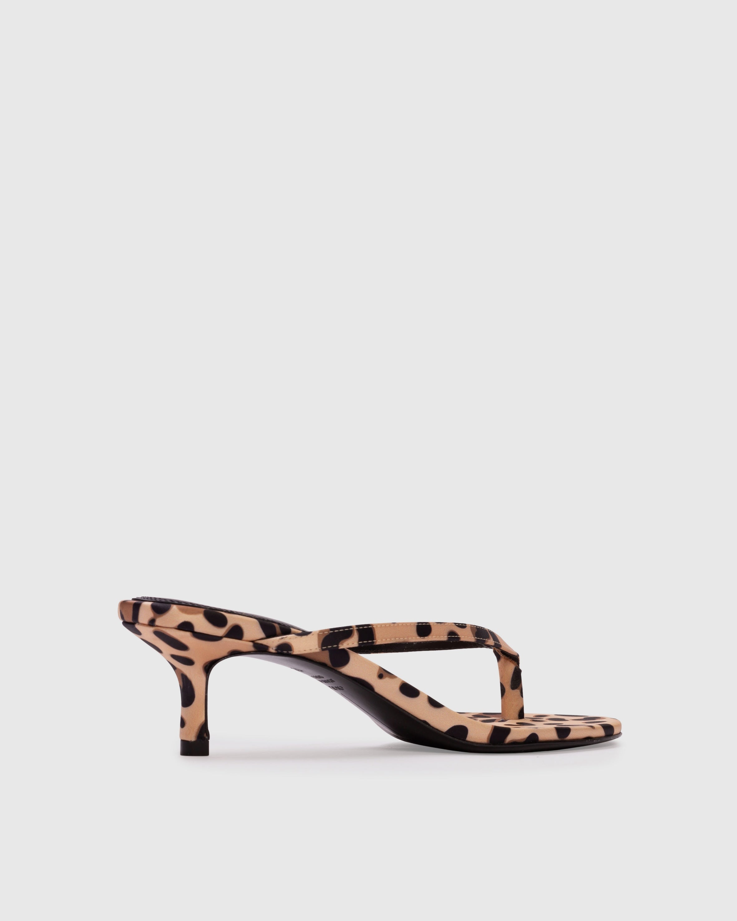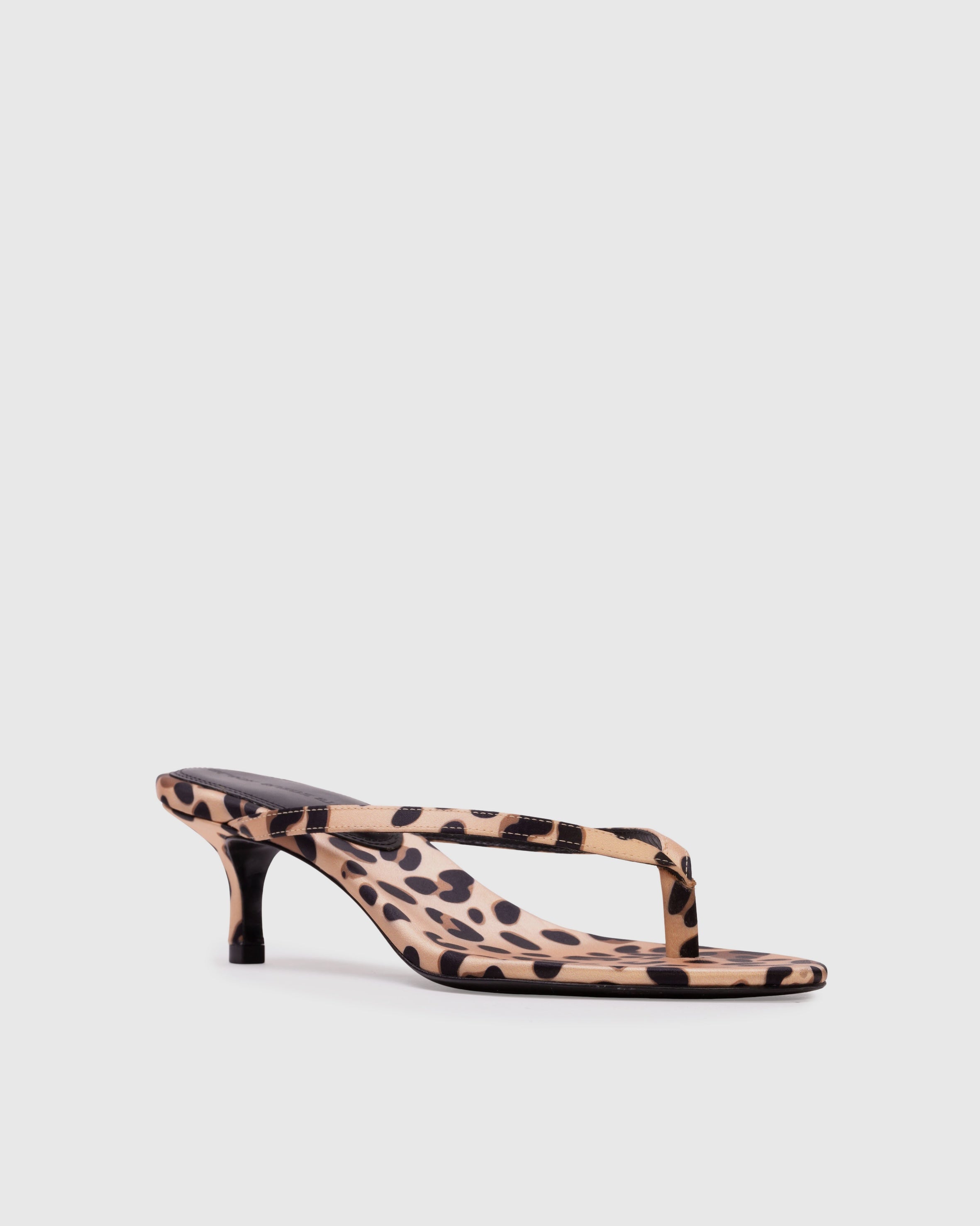 round toe thong slipper mule, set on a curved kitten heel. Made with crepe satin.