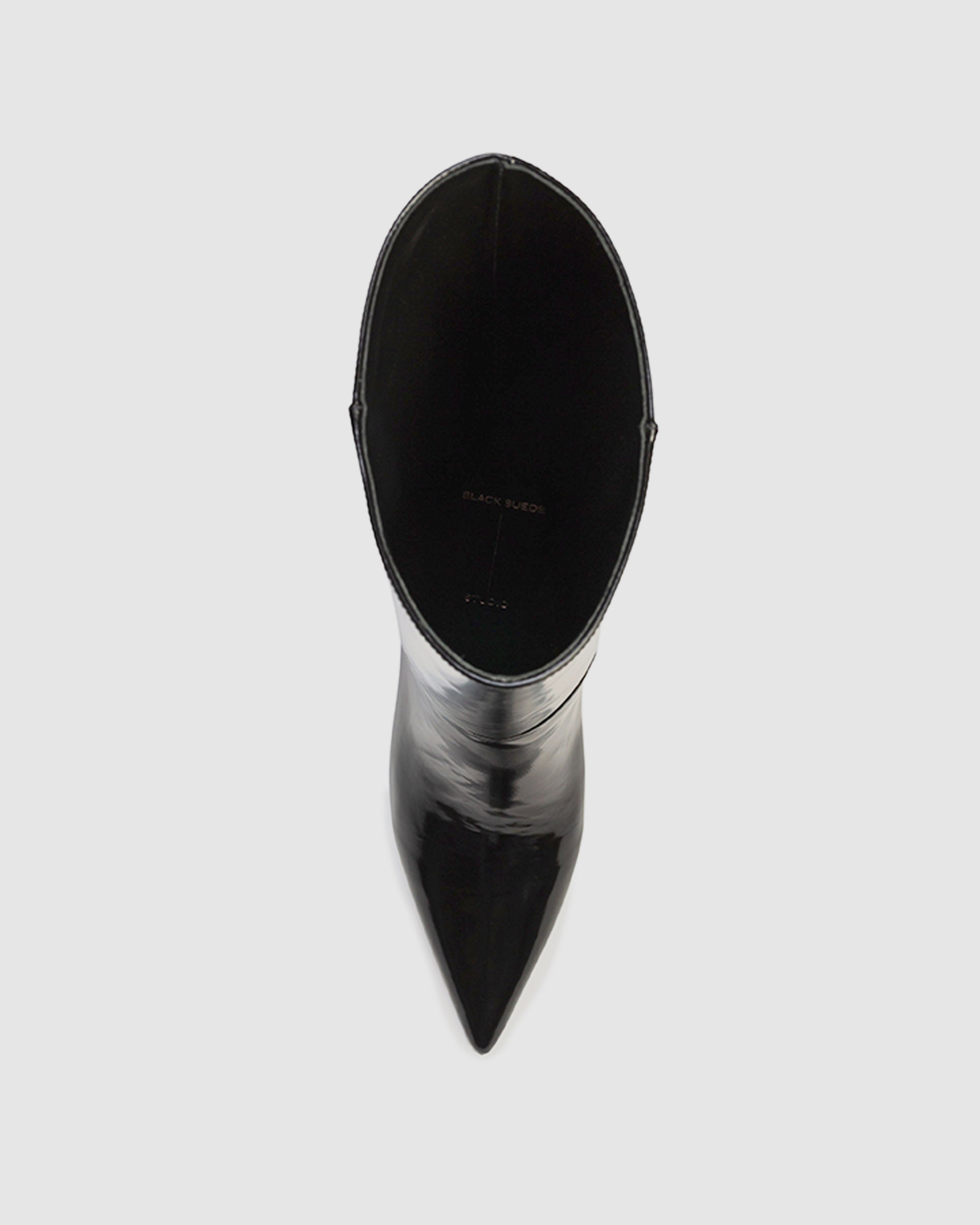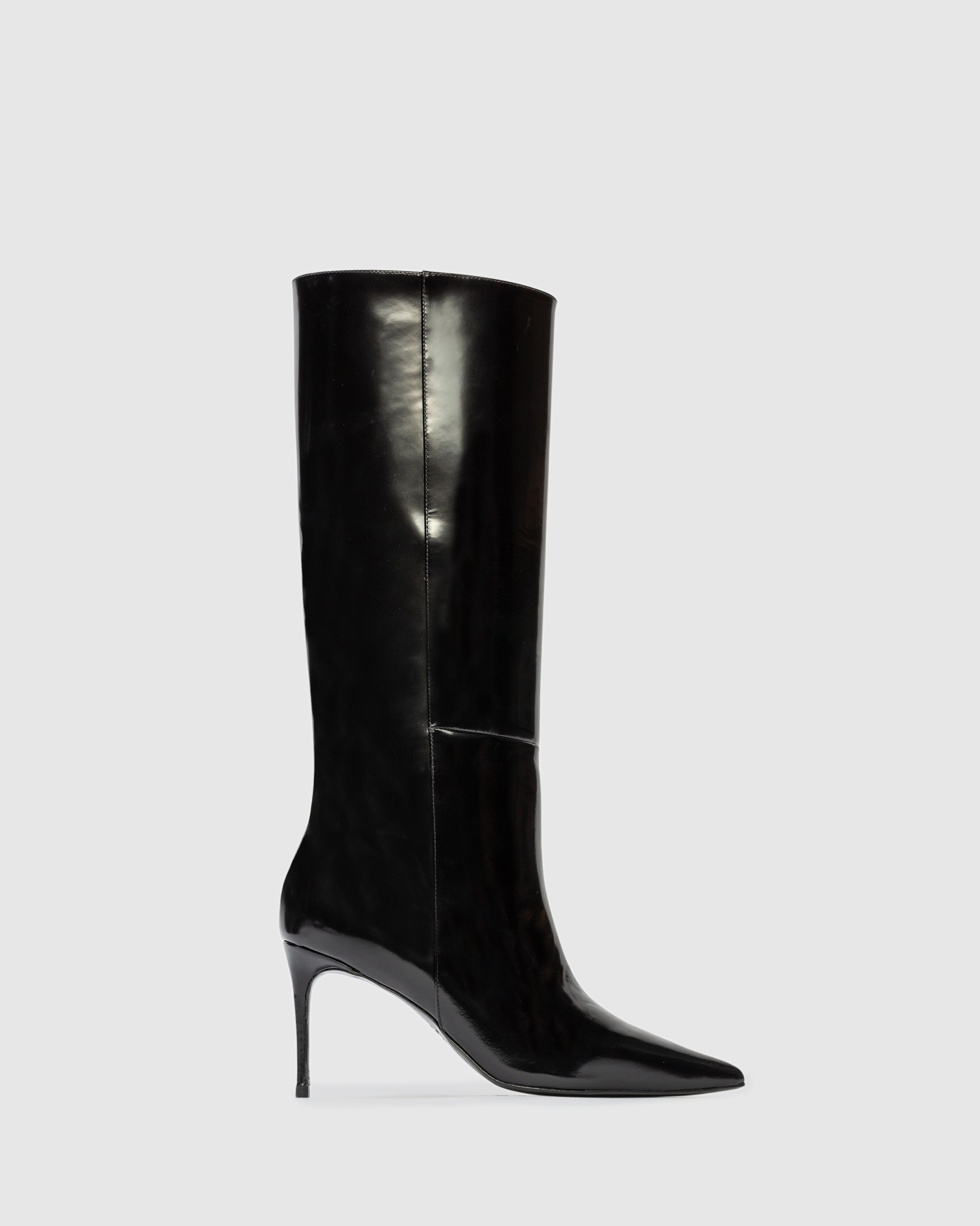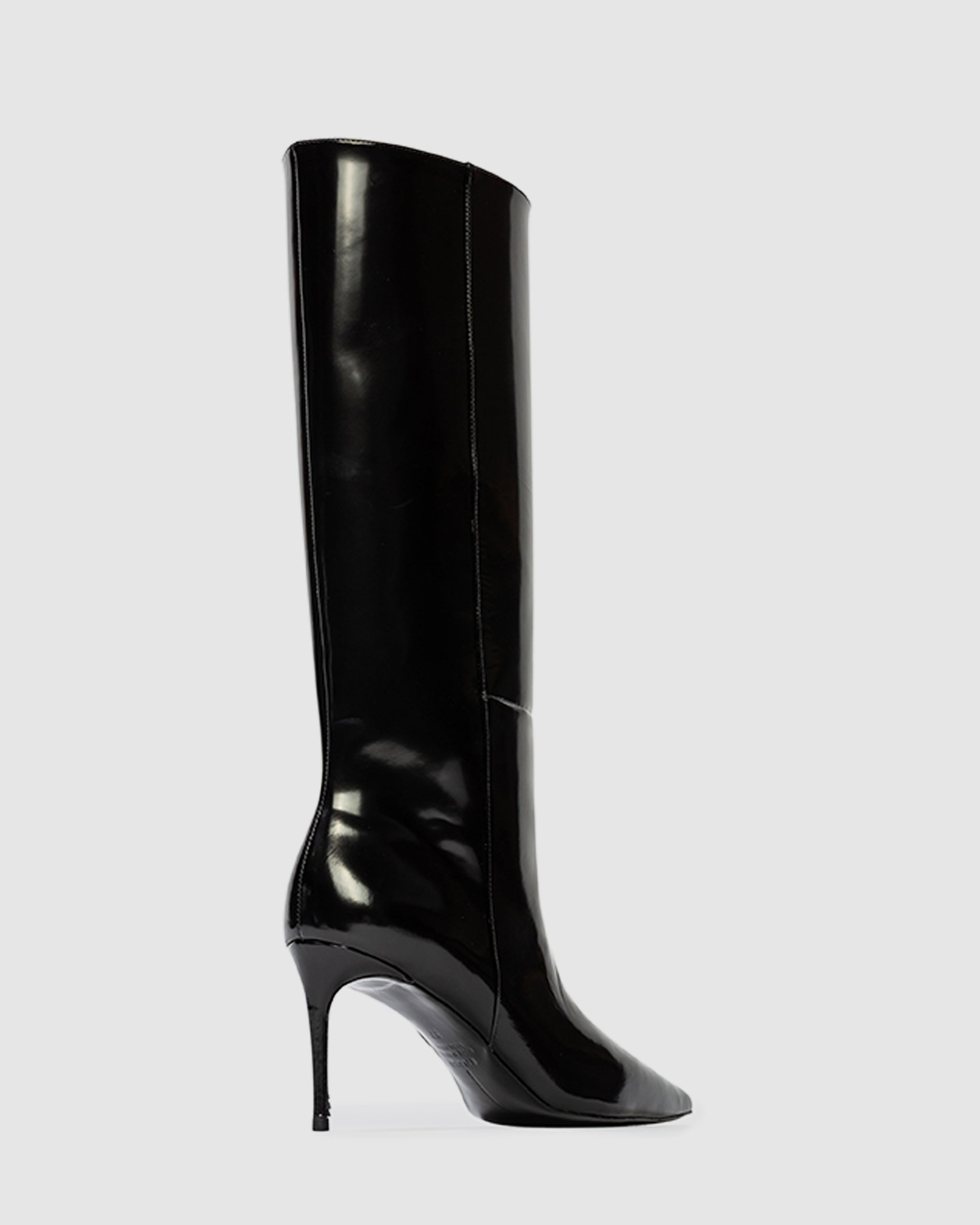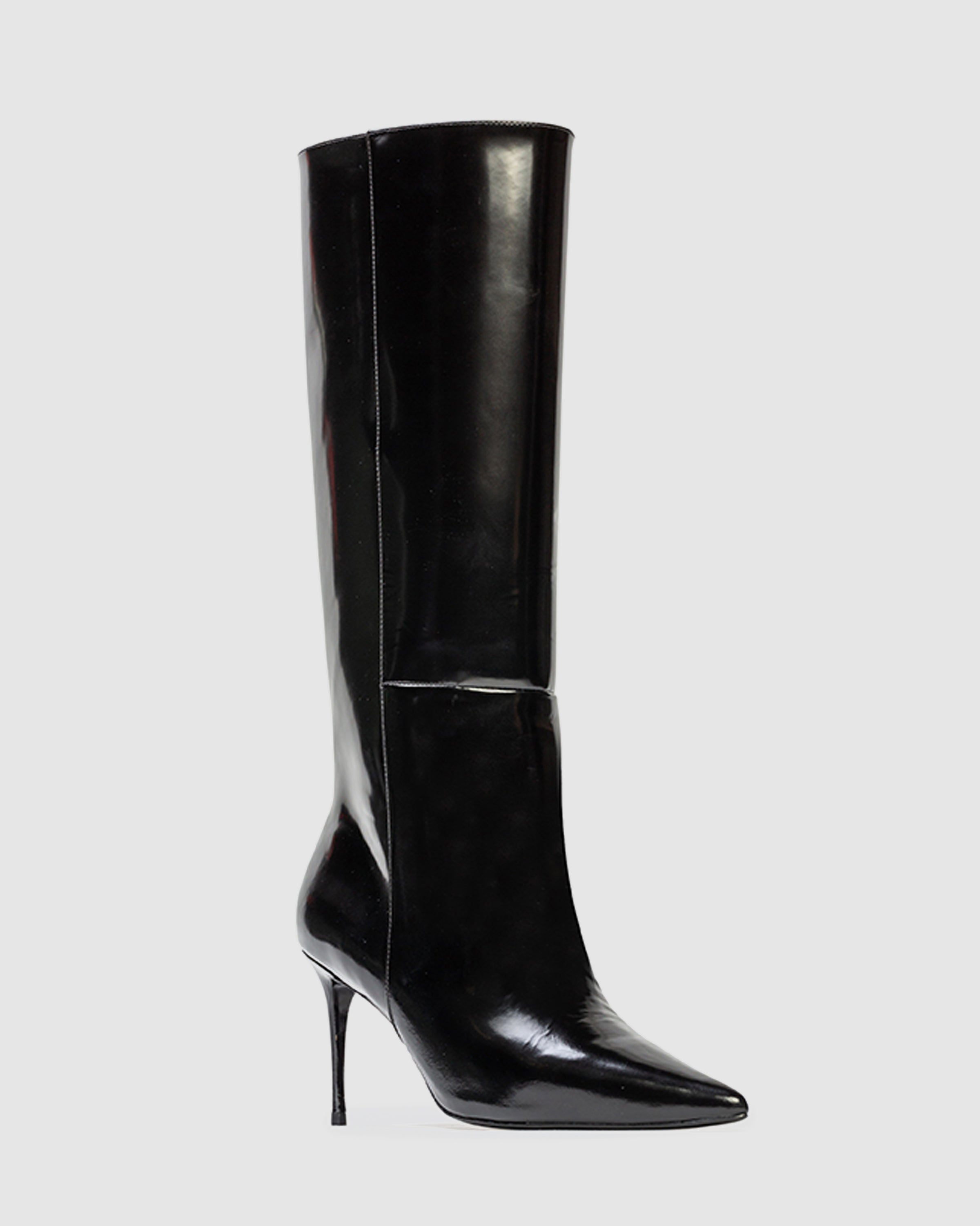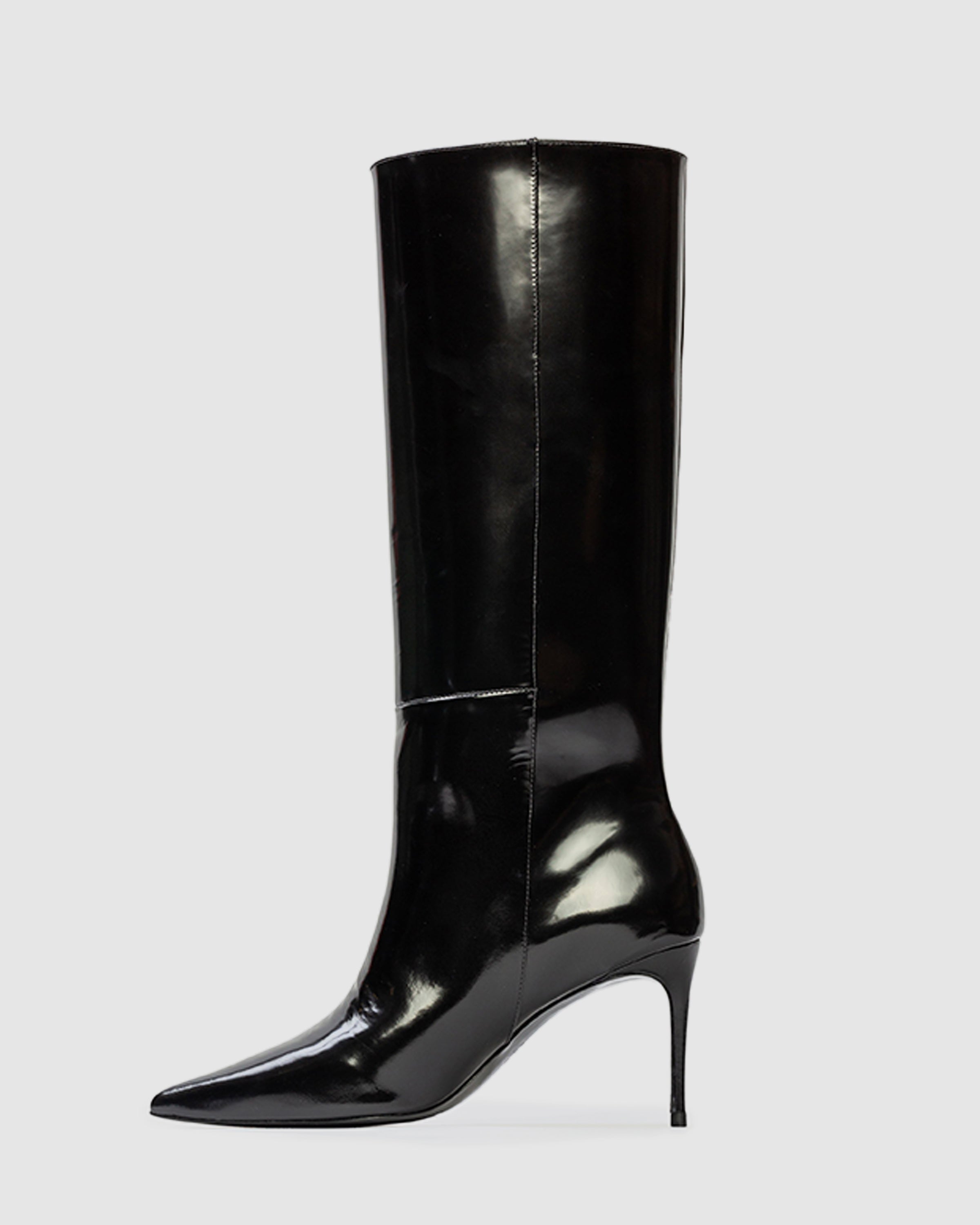 Pointy toe below the knee boot, set on a high pin heel. Made with box leather.